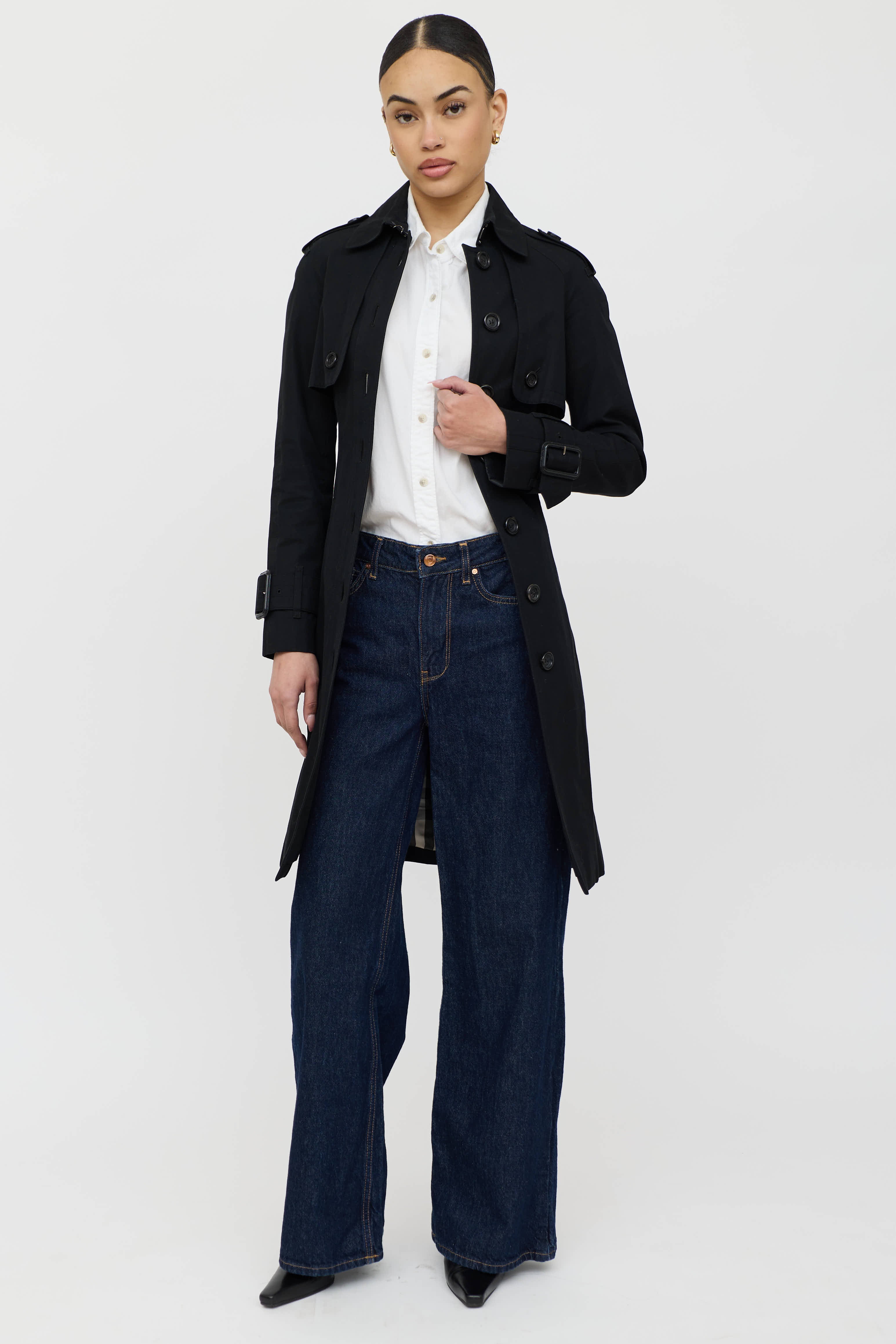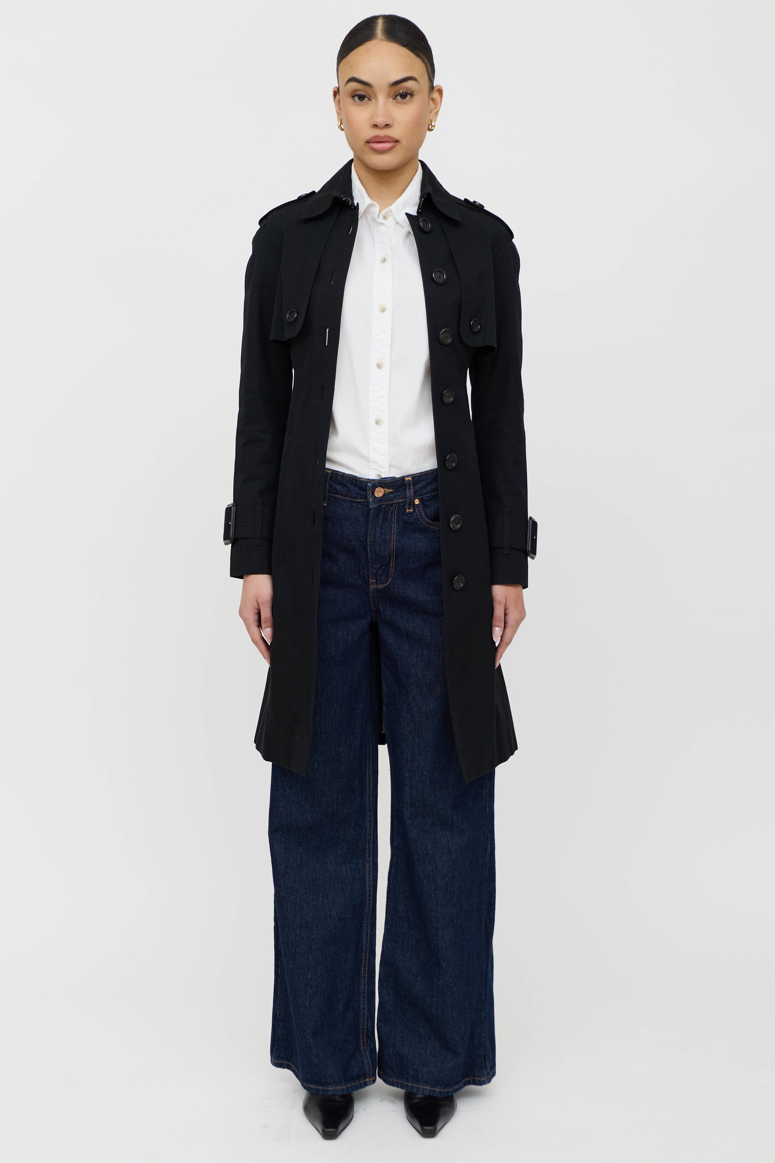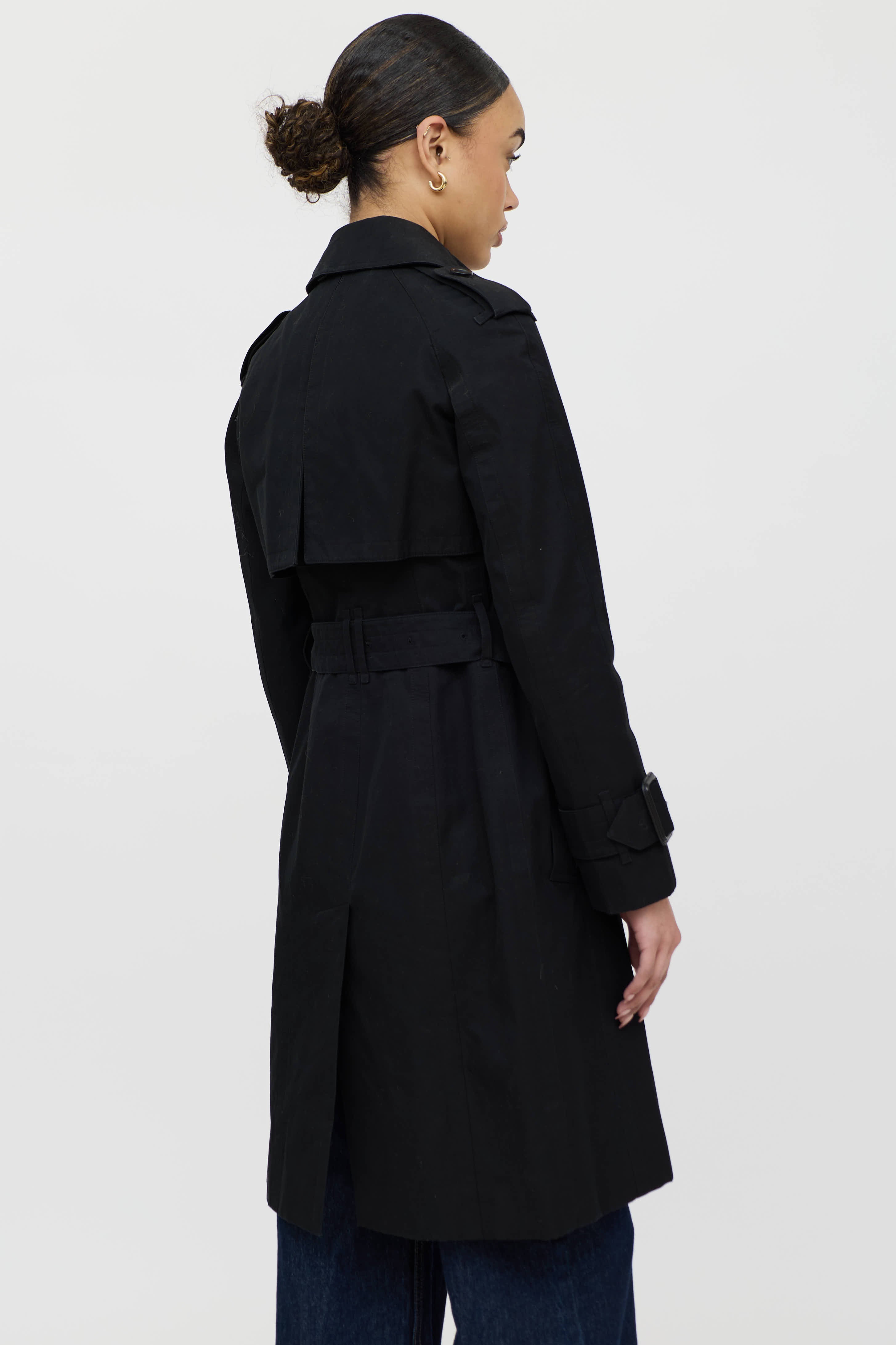 Pre-owned Burberry black trench coat featuring a pointed collar, epaulettes, long raglan sleeves, two slip pockets at hip, adjustable belt at waist, and button up closure. Lined.