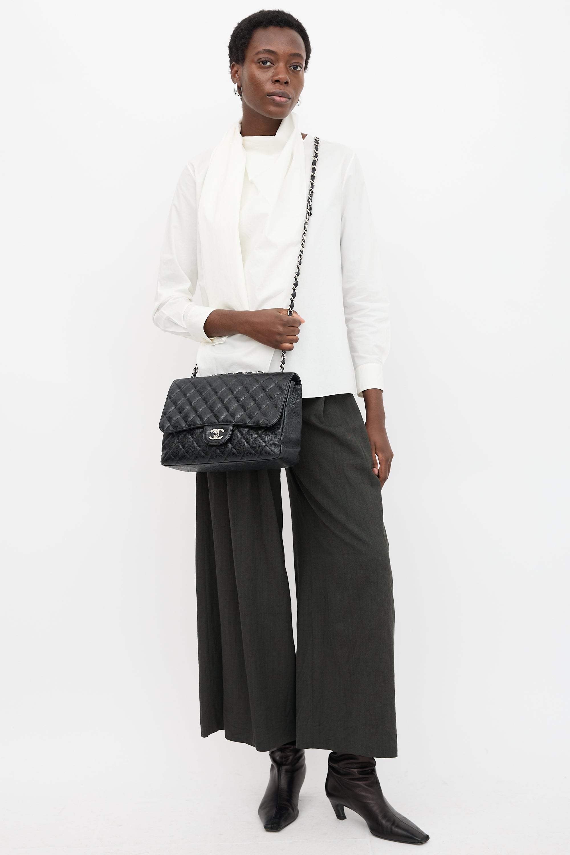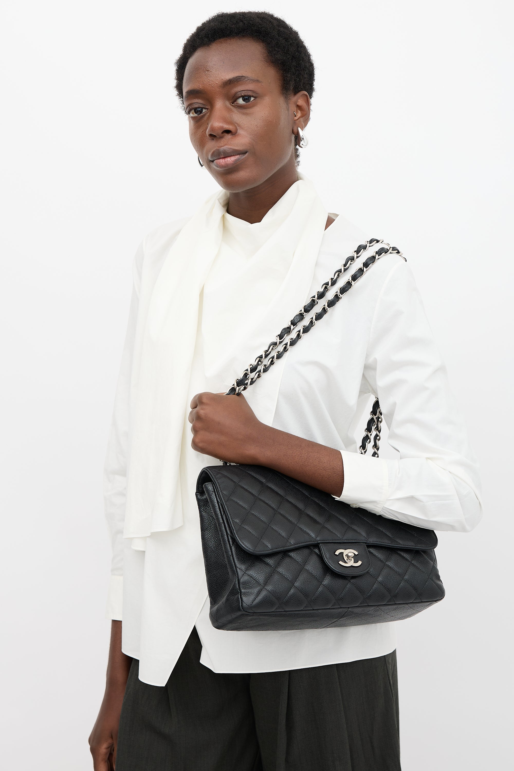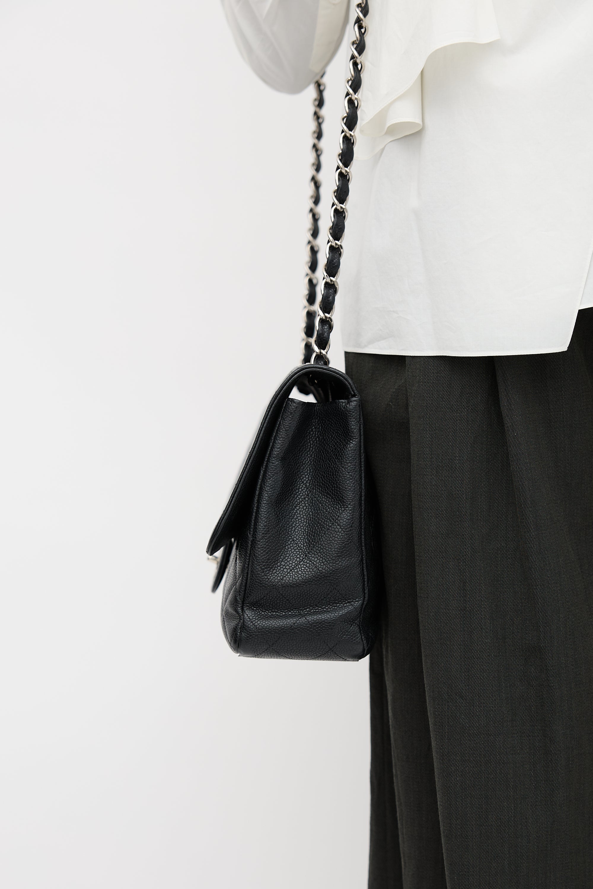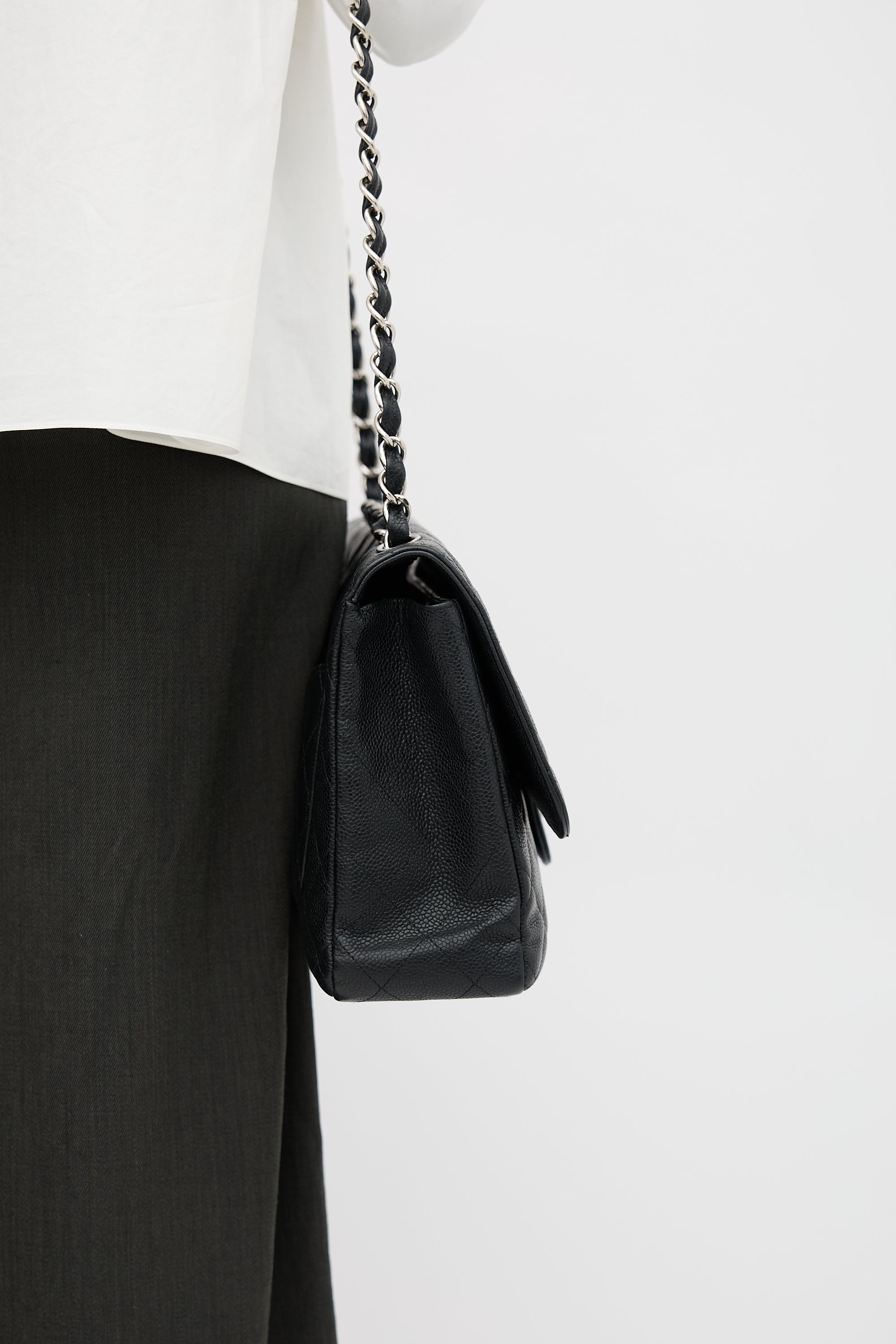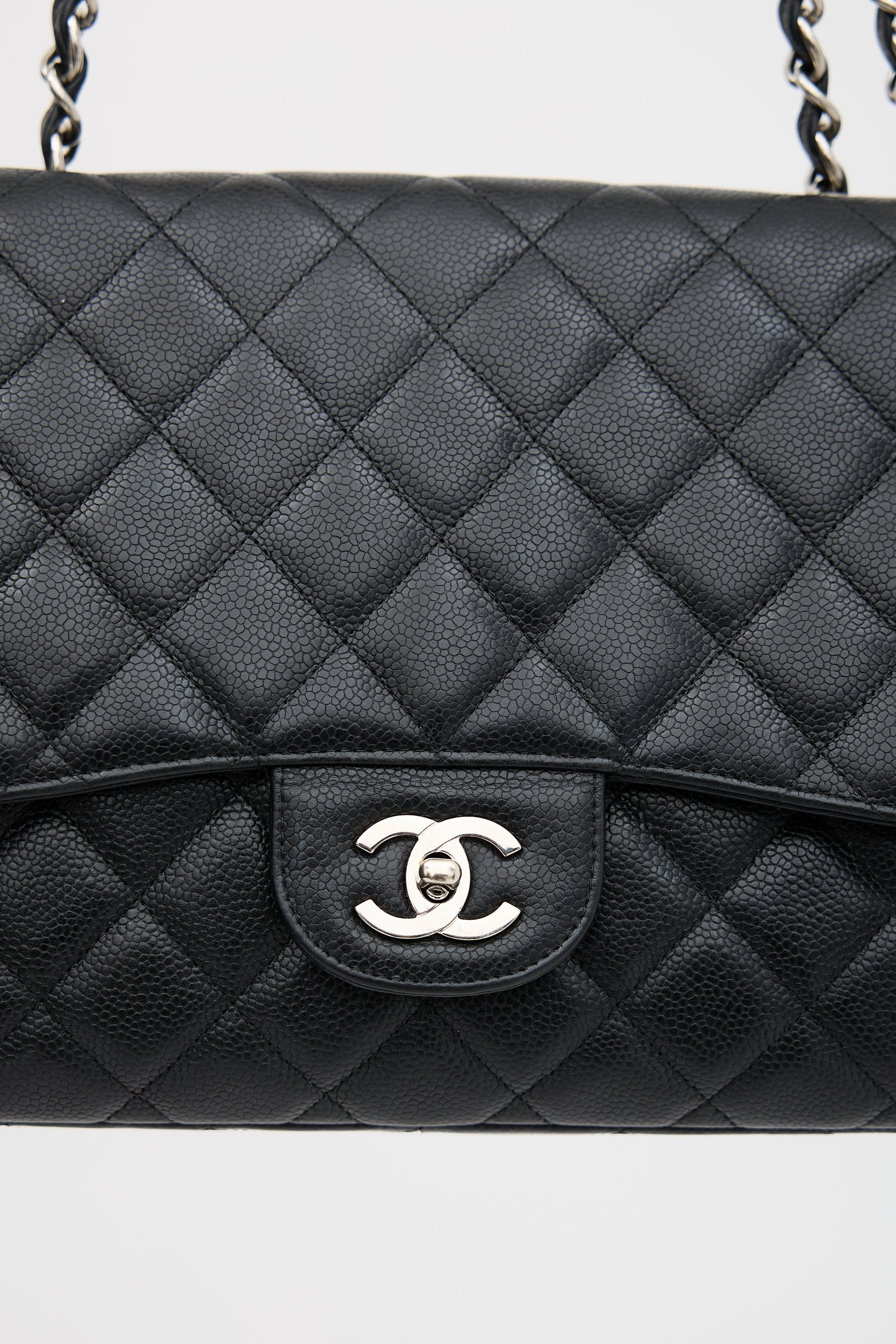 Pre-owned Chanel 2008 black Caviar leather Classic Flap bag featuring diamond quilt stitching, silver tone hardware, dual braided leather and chain top handles, front flap, interlocking CC turn lock closure, and one lined main compartment with one zip pocket and one slip pocket. Comes with original box and dust bag.