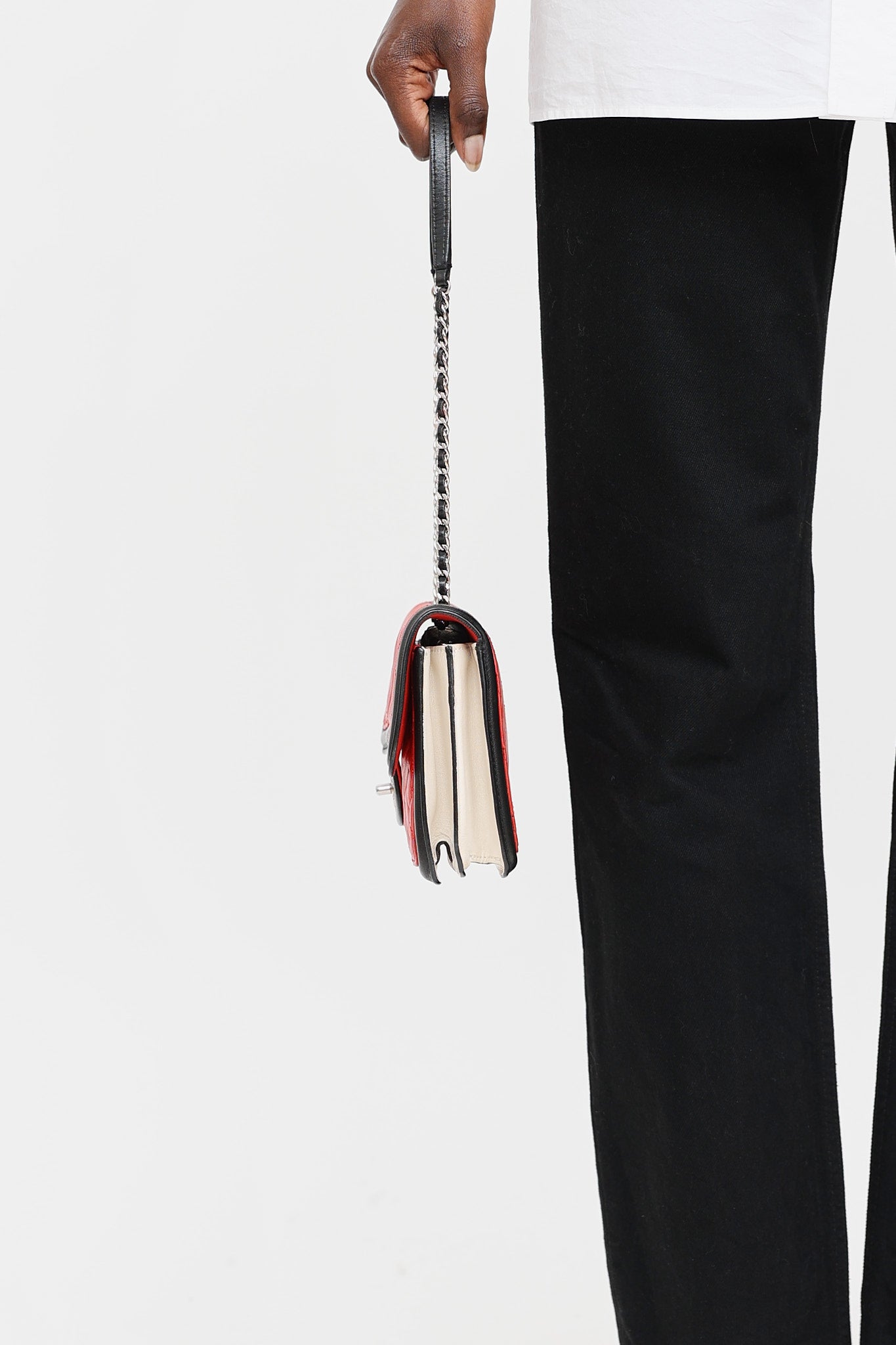 Pre-owned Chanel 17 series red, black, and cream Graphic Flap bag featuring sliding braided leather and chain strap, silver tone, quilted upper, top flap with CC turn lock closure, two main compartments with interior slip pocket, and zip pocket at middle. From the 2012-2013 Collection by Karl Lagerfeld.