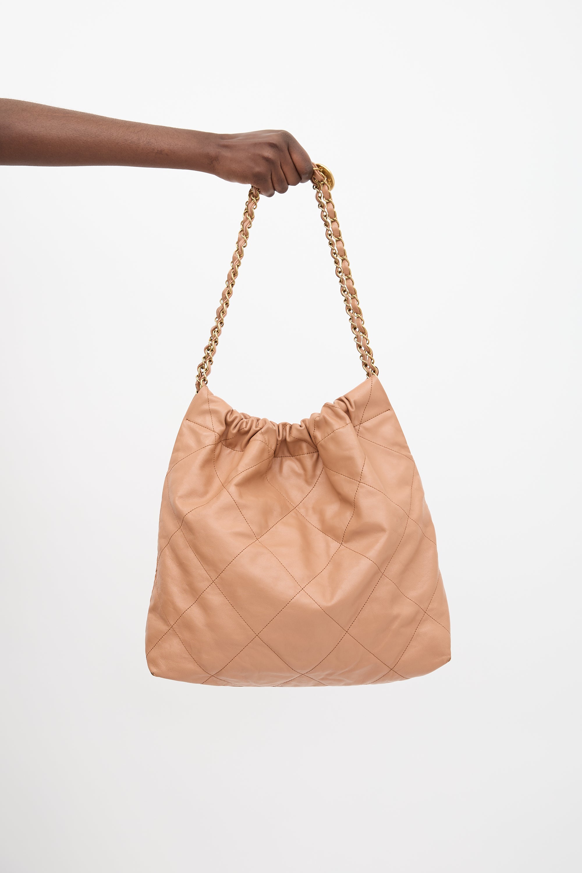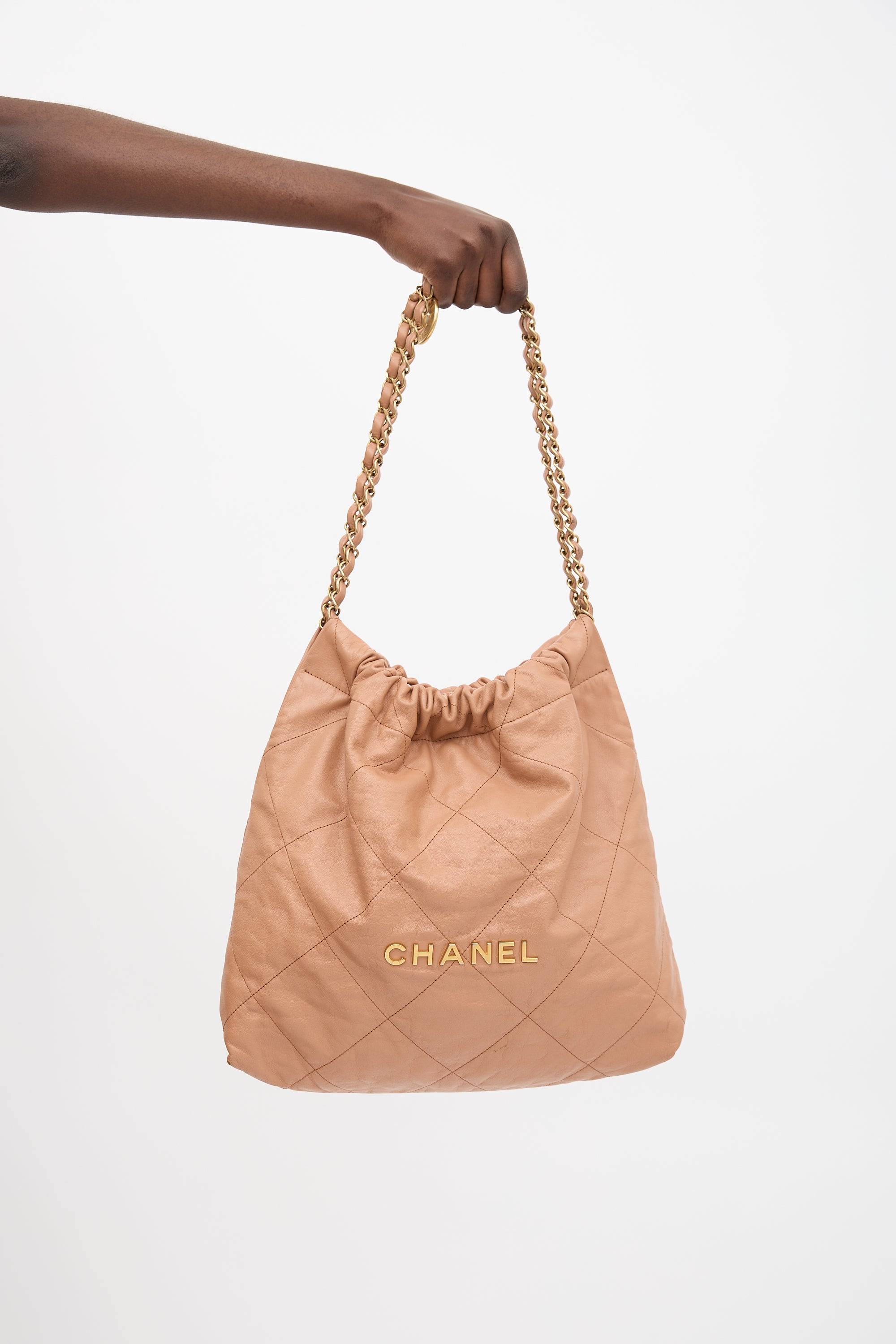 Pre-owned Chanel beige leather 22 shoulder bag featuring diamond quilt stitching, gold tone hardware, front logo embellishment, braided leather and chain top handles with CC coin charm, cinchable topline, magnetic top closure, one lined main compartment with one zip pocket, and detachable zip pouch. Microchipped. Comes with original dust bag.