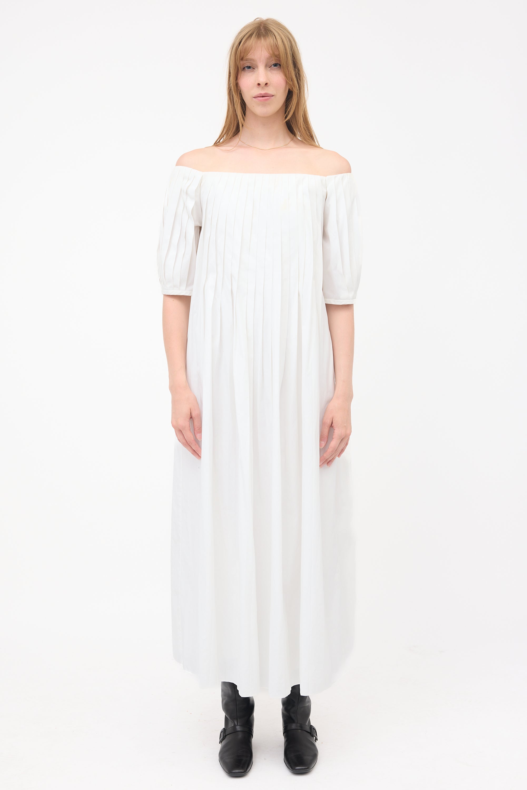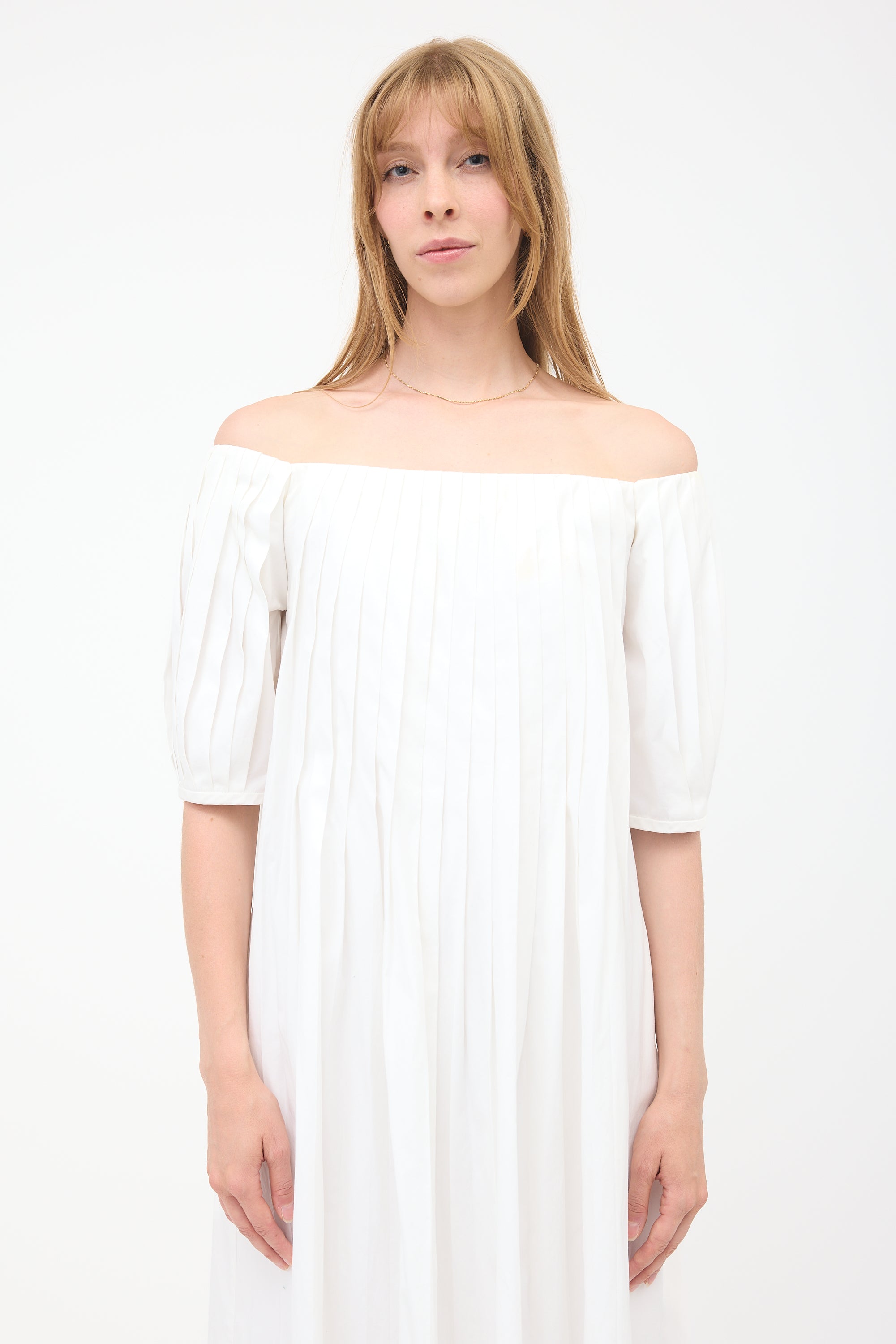 Pre-owned Gabriela Hearst white off shoulder dress featuring pleating throughout, puff sleeves, concealed back zip, and in seam pockets. Lined.