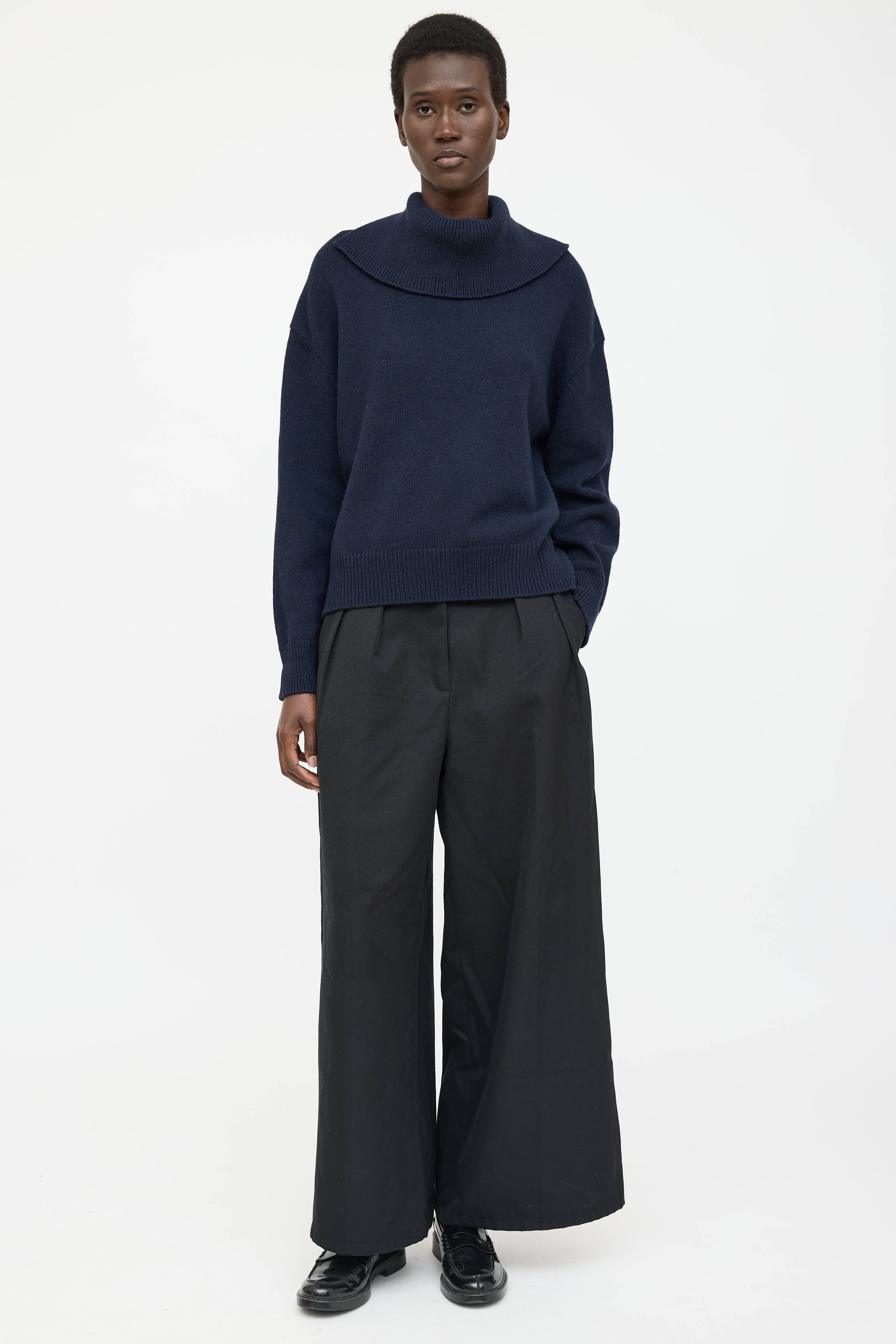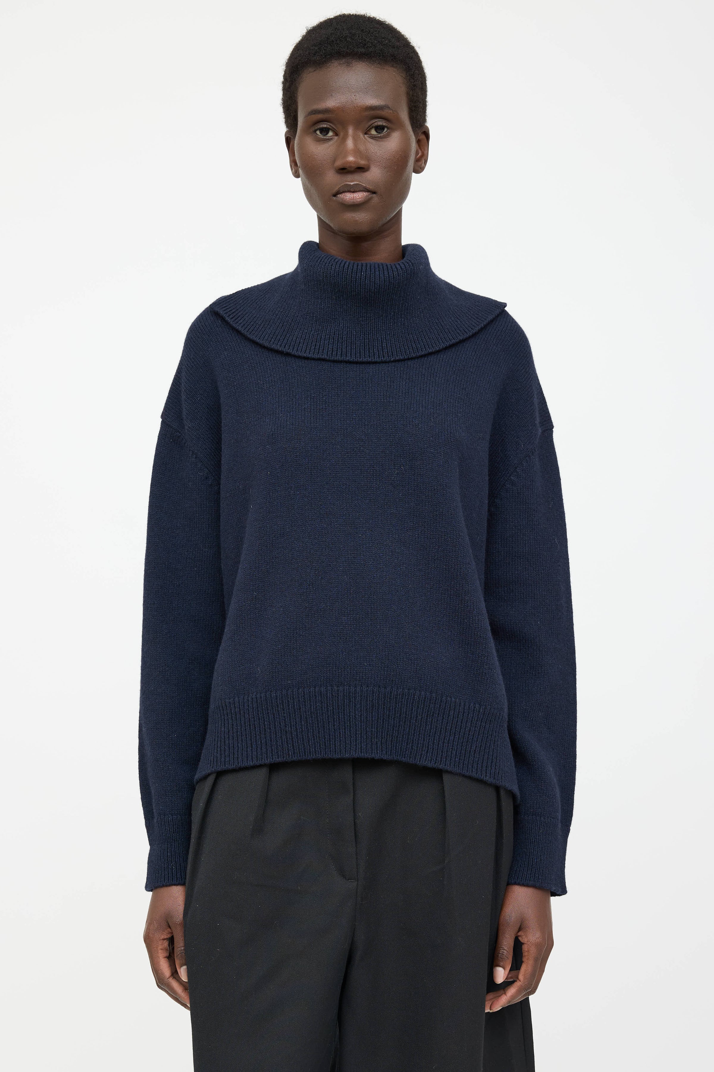 Pre-owned Jil Sander navy wool knit sweater featuring a turtleneck, long sleeves, slits at hem, and high low ribbed hem.