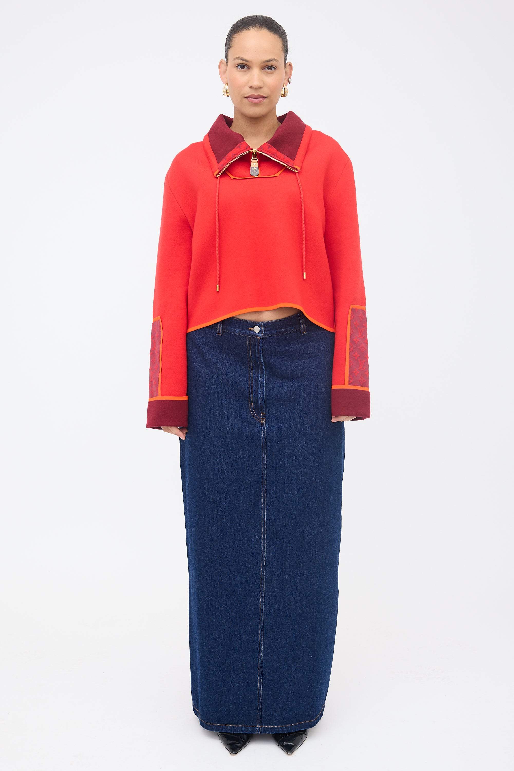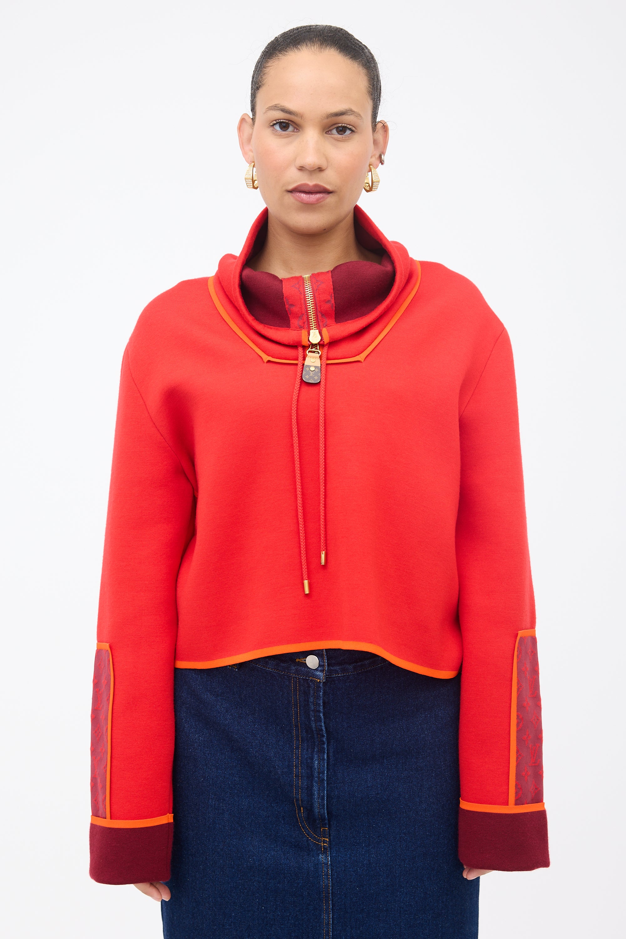 Louis Vuitton red and orange knit pullover sweatshirt featuring a drawcord funnel neck with zip closure, monogram leather zip pull, and burgundy monogram knit patches at back collar and sleeves.