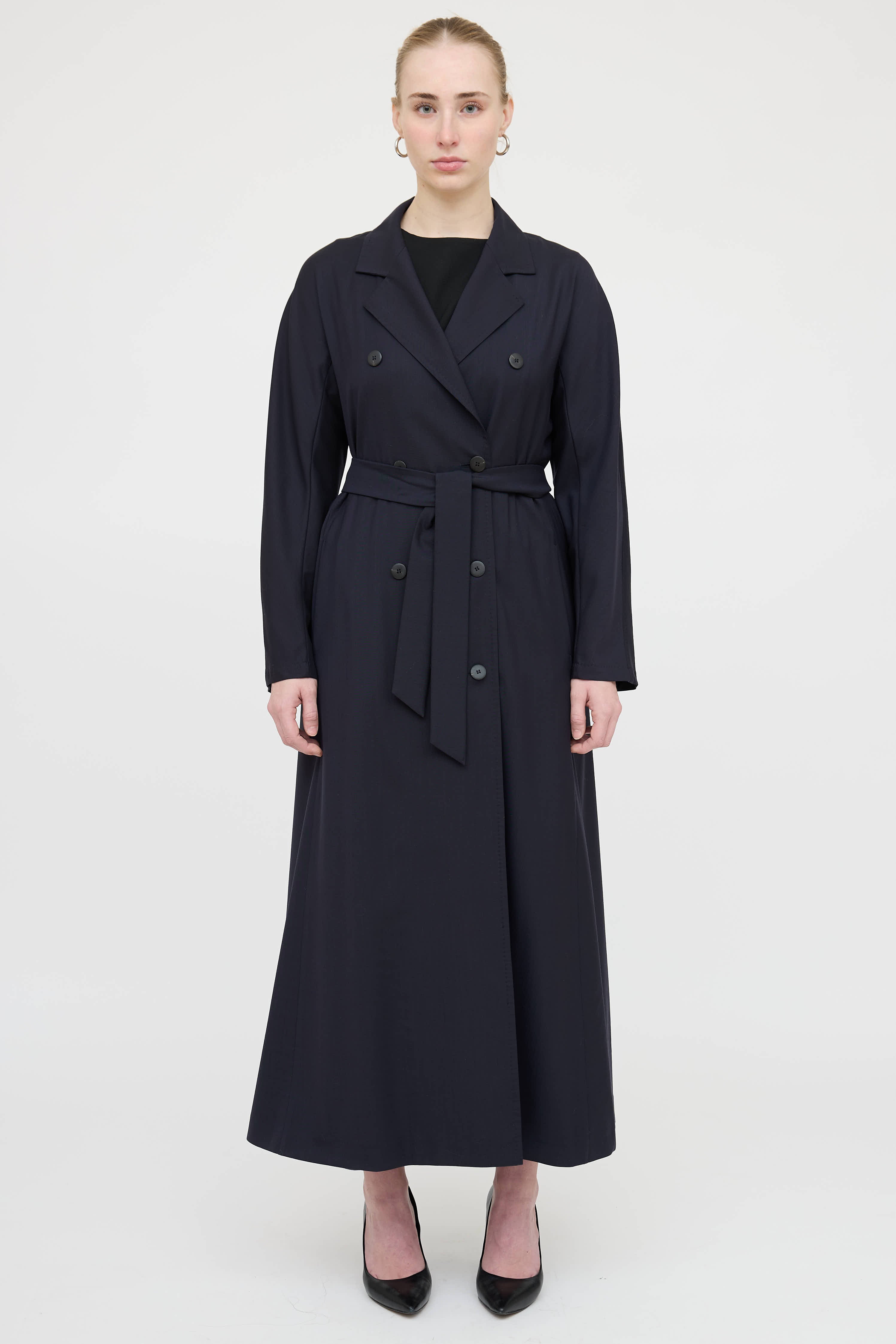 Pre-owned Max Mara navy long sleeve trench coat featuring notched lapel collar, double breasted front, slit pockets at side, and tie at waist.