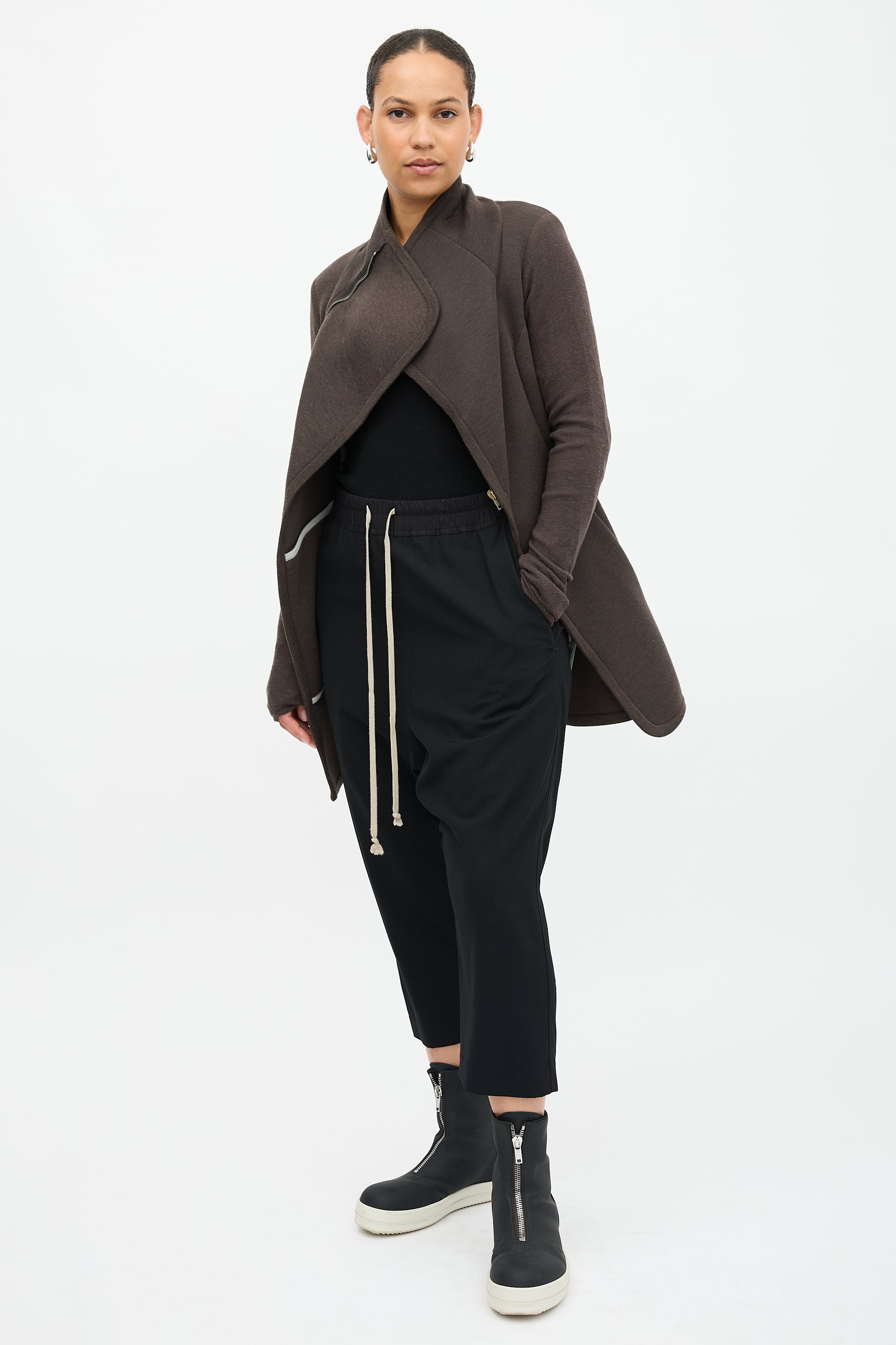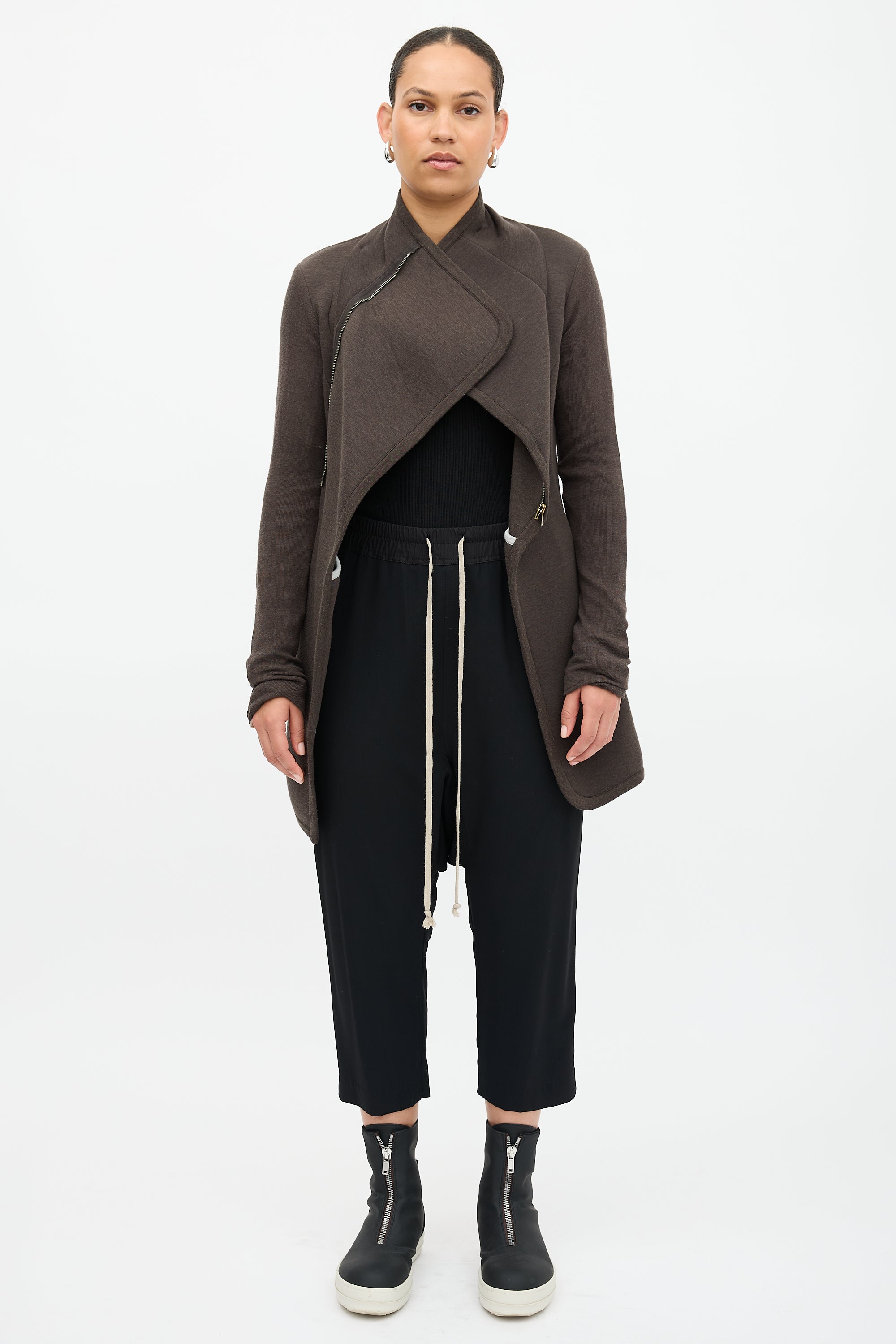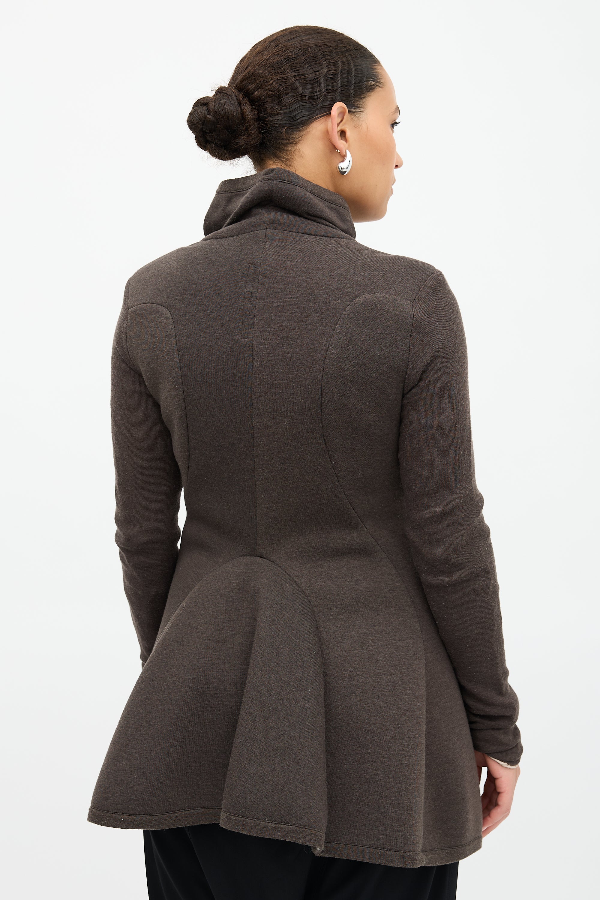 Pre-owned Rick Owens Lilies brown neoprene jacket featuring funnel collar, zip front, ribbed sleeves, two hip pockets, and peplum hem.