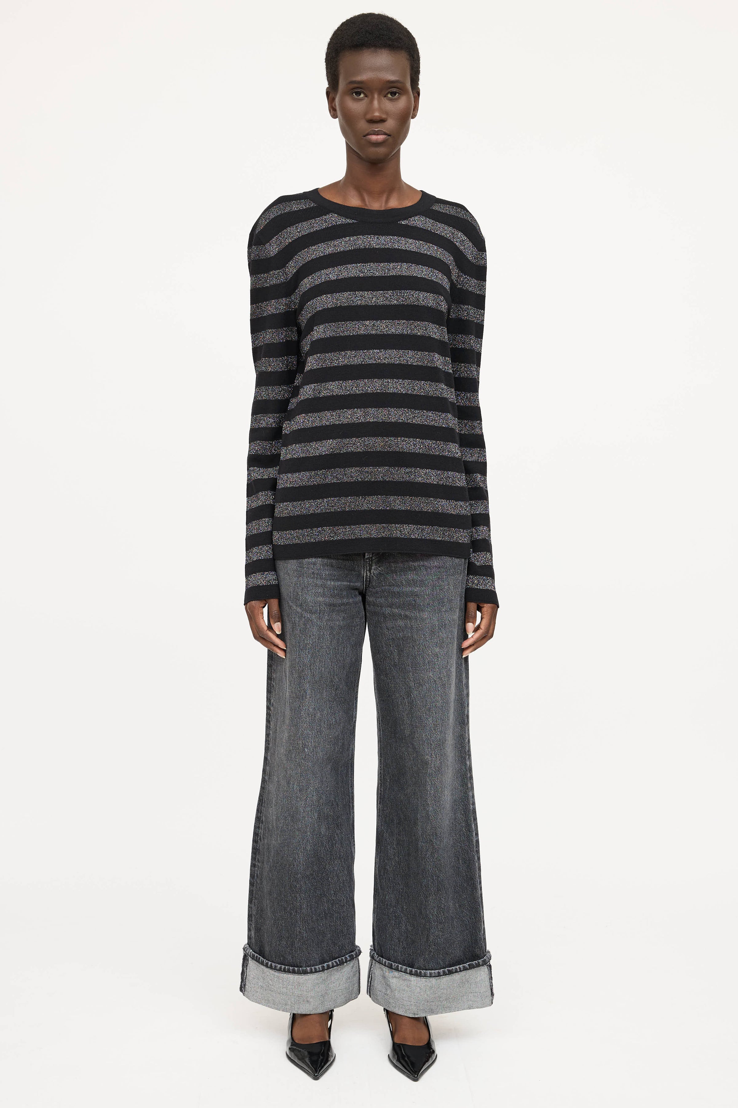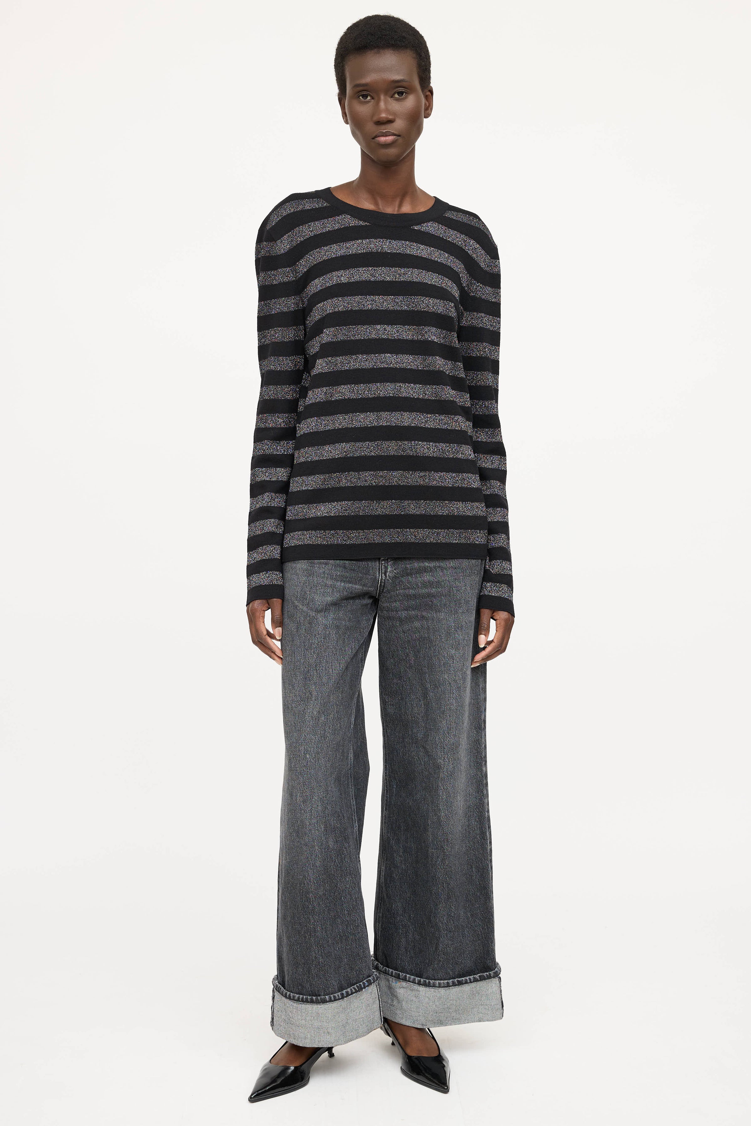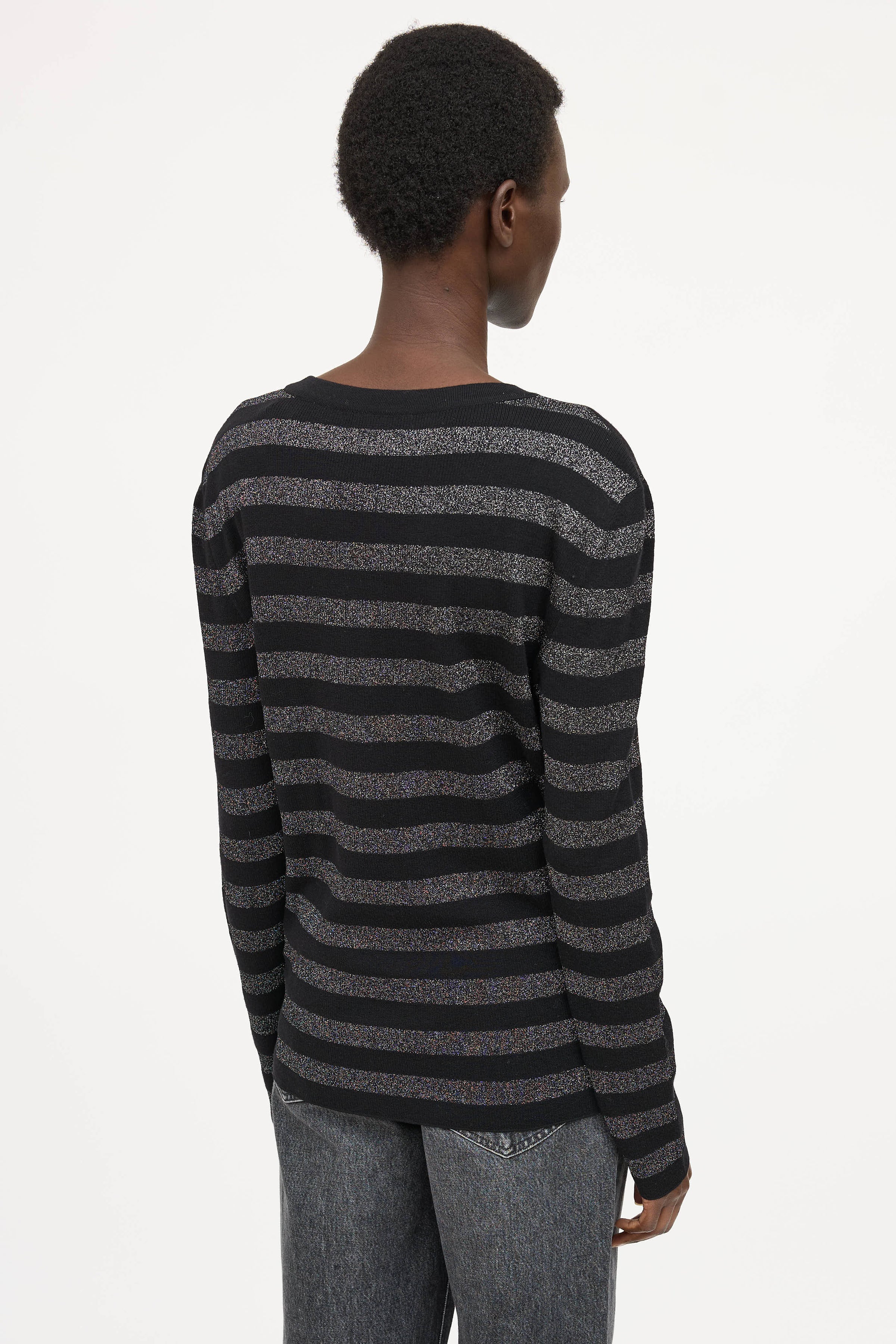 Pre-owned Saint Laurent black and silver long sleeve top featuring round neckline, metallic stripes, and rolled hem.