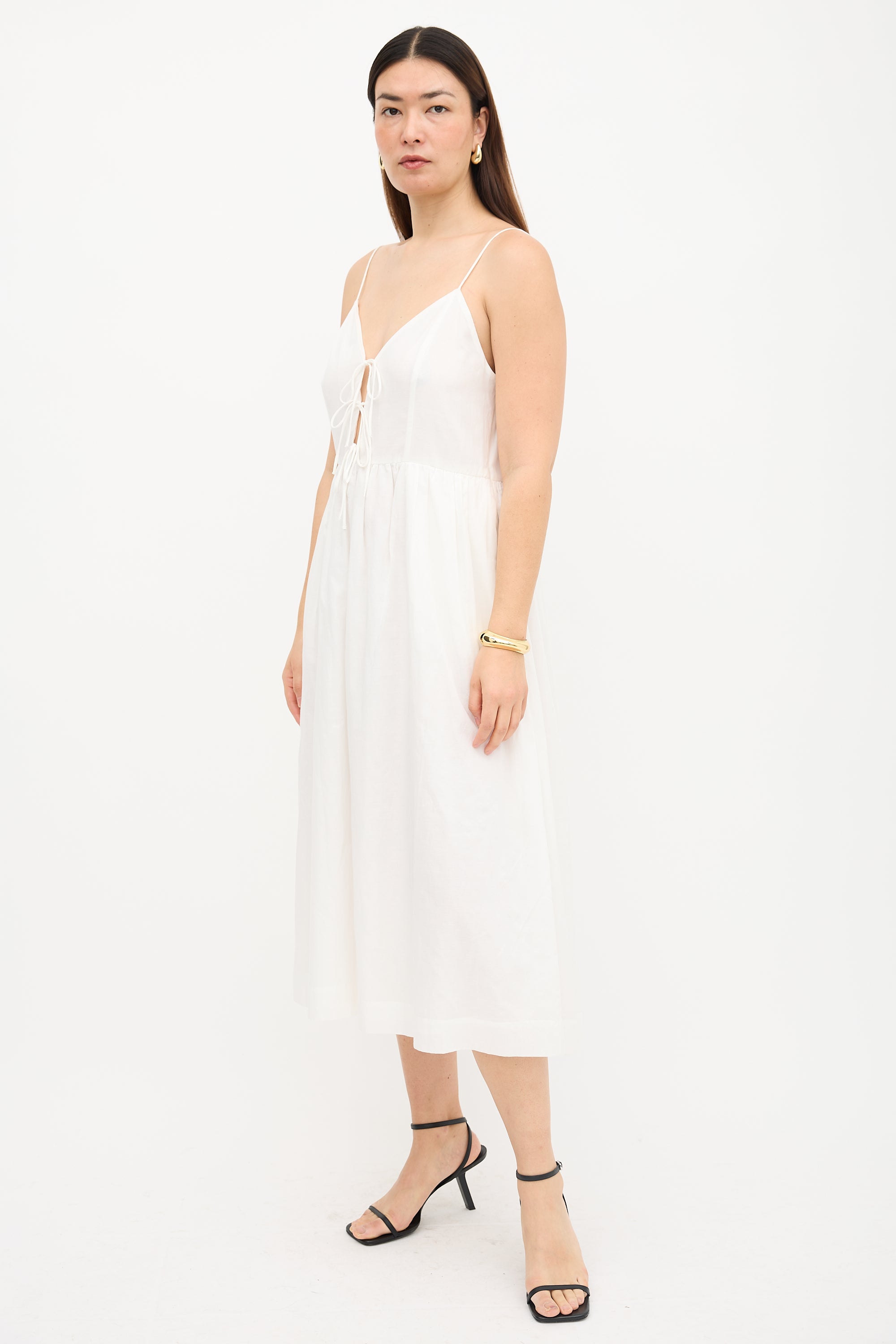 Sea white cotton Zora Tie Tank dress featuring adjustable shoulder straps, V-neckline, three self-ties at chest, side zip closure, gathered skirt, and two inseam pockets at hip. Lined.