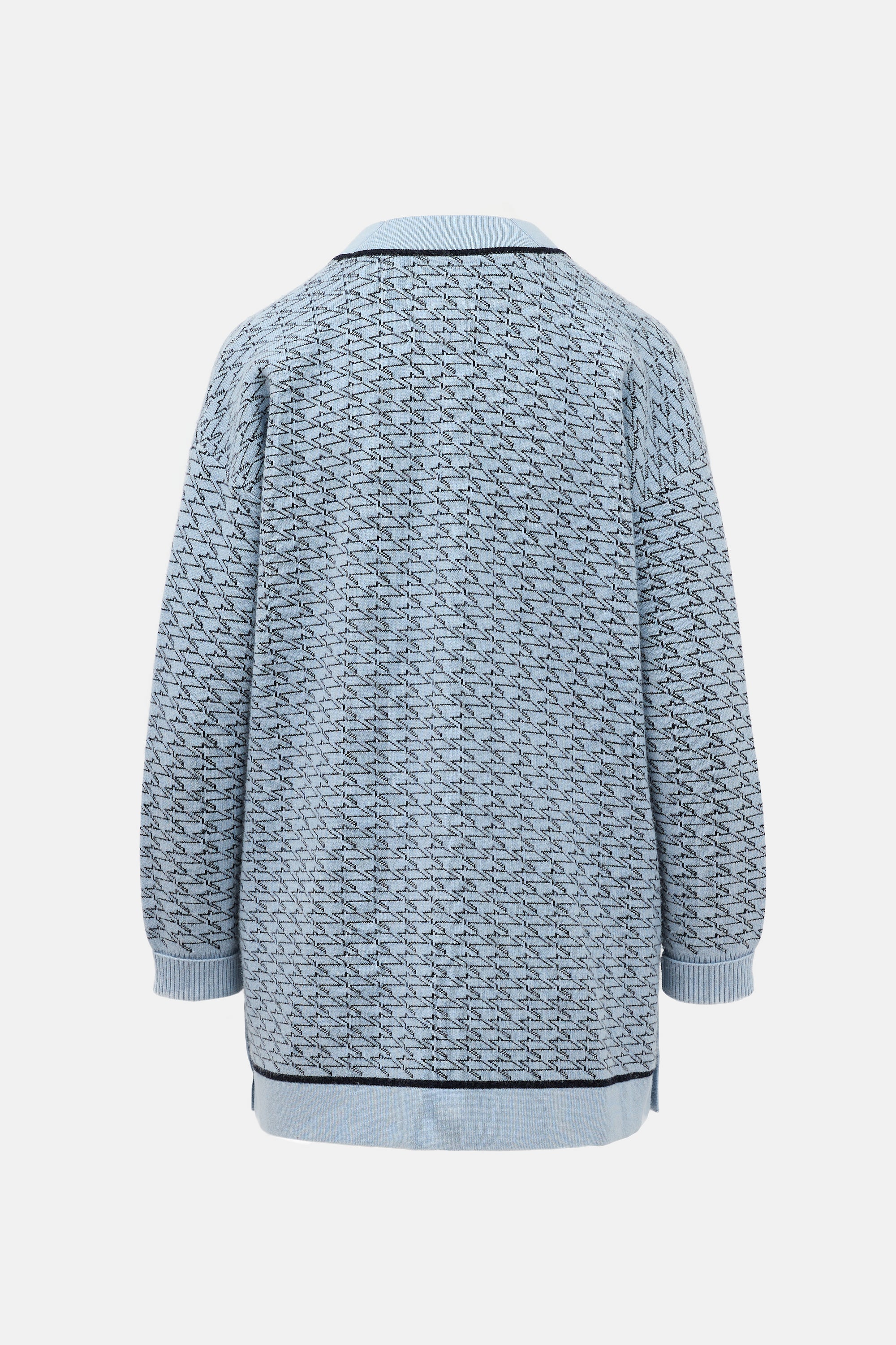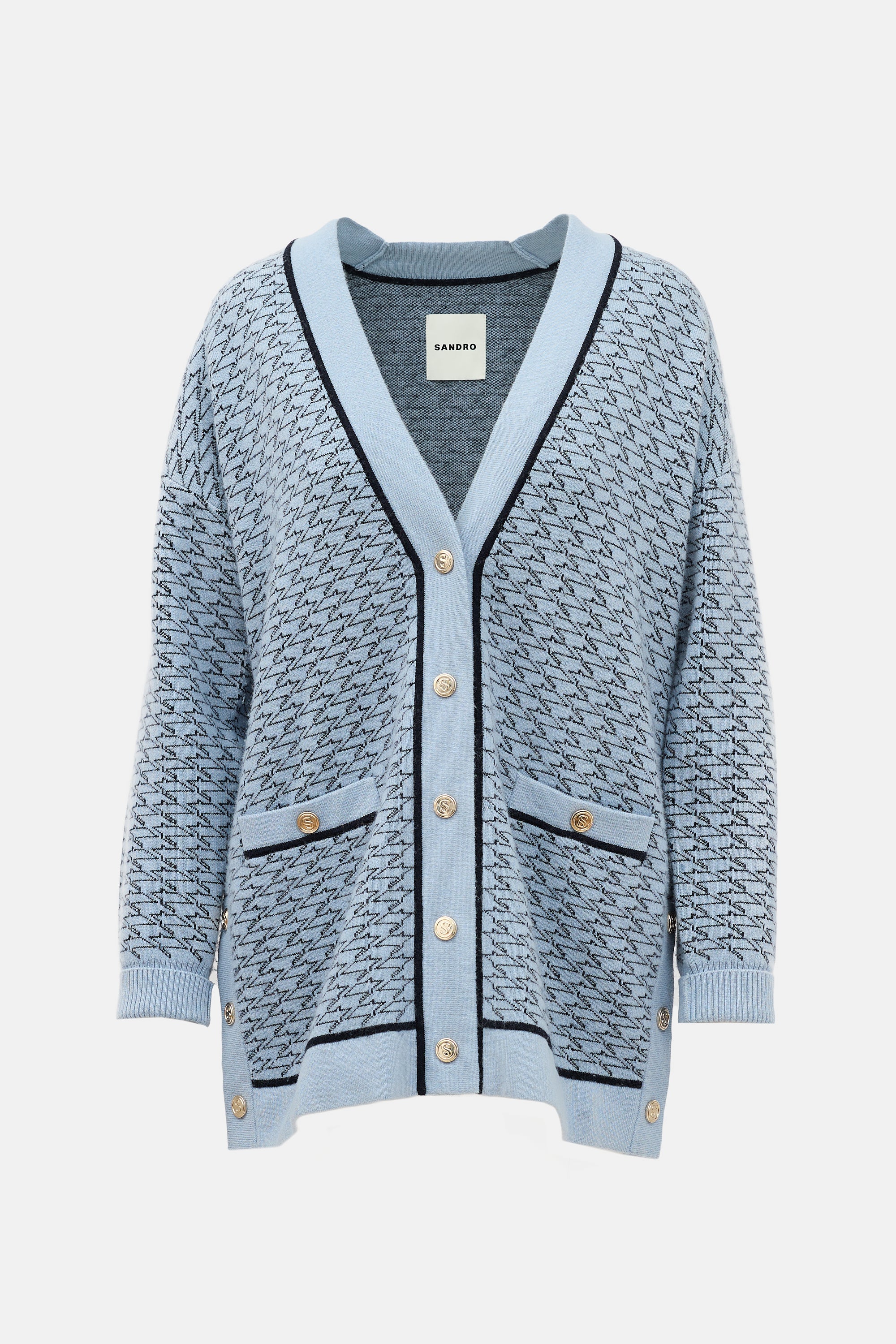 Pre-owned Sandro blue and black oversized Preston cardigan featuring a V-neckline, geometric print throughout, gold tone snap button front, two buttoned welt pockets at hip, snap button vented sides, and ribbed cuffs.