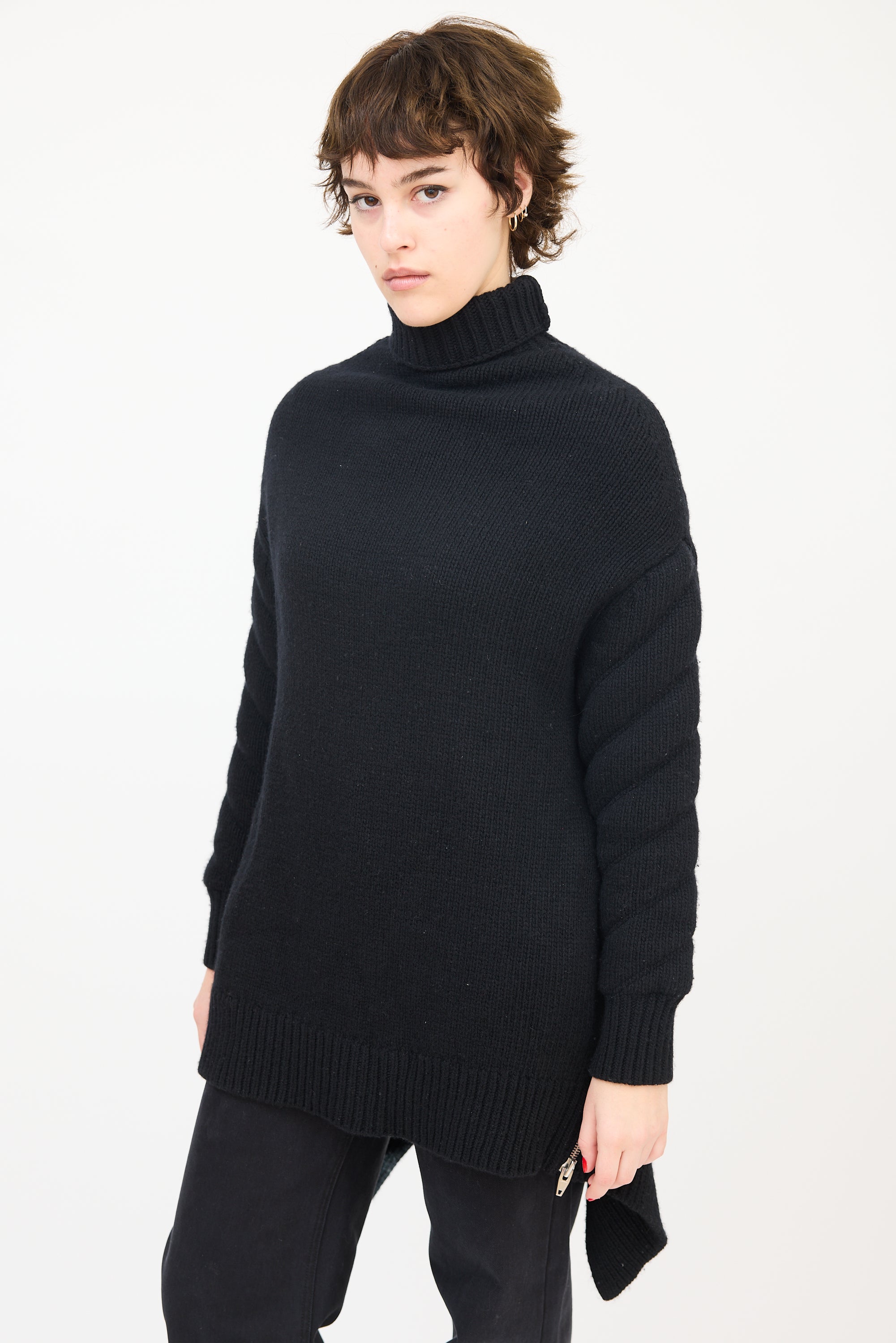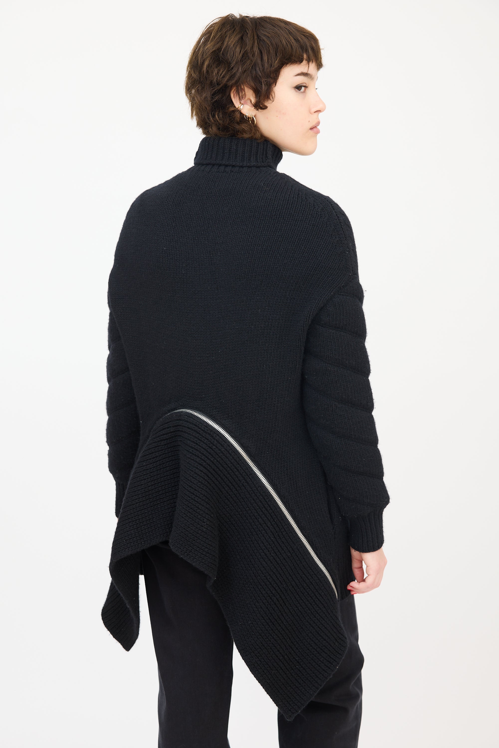 Pre-owned Alexander Wang 10th anniversary limited edition black wool turtleneck sweater featuring two slip pockets at sides, removable double zip up flounce at back hem, dropped shoulders, padded long sleeves with diagonal top stitching, and ribbing at neck, front hem, and cuffs.