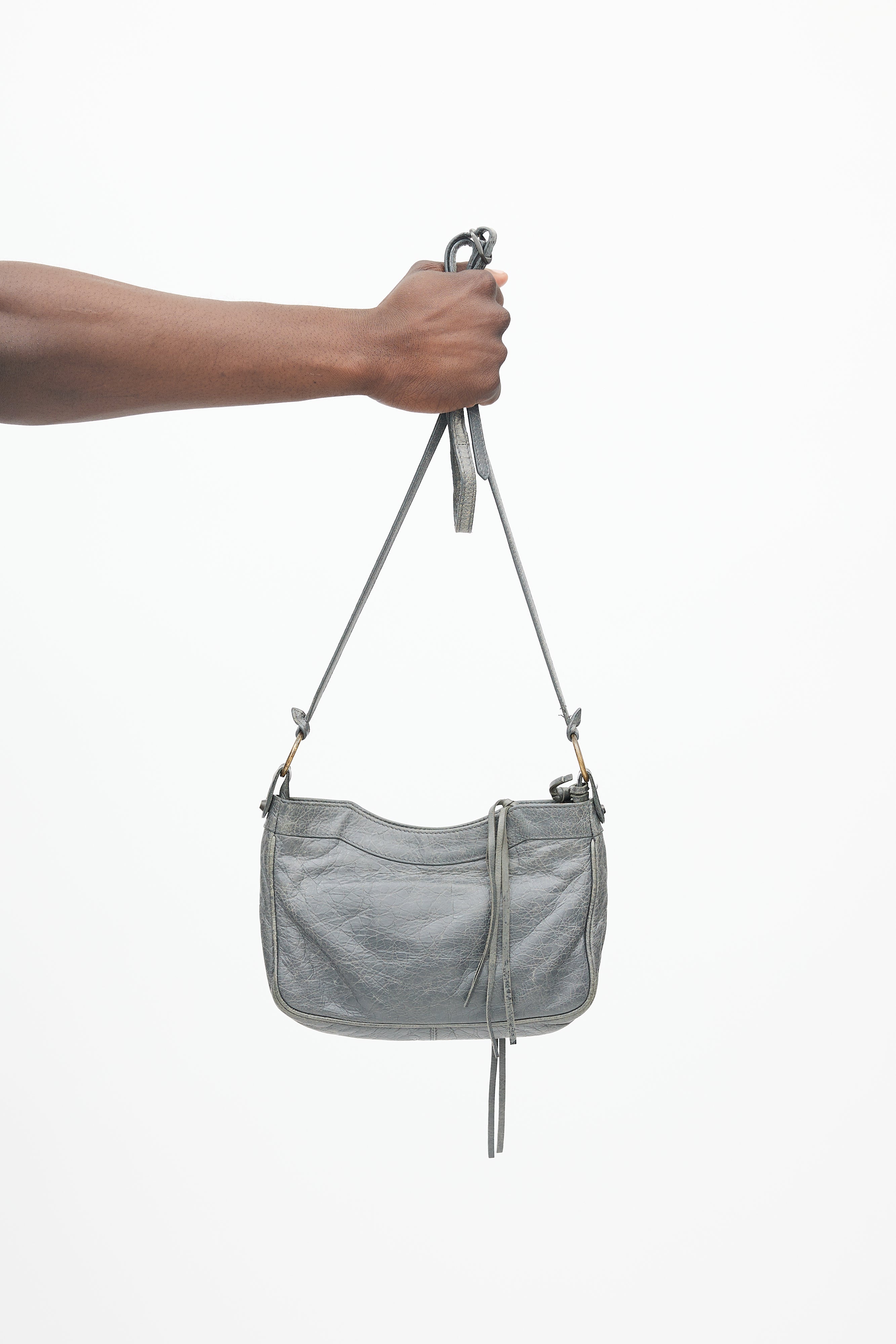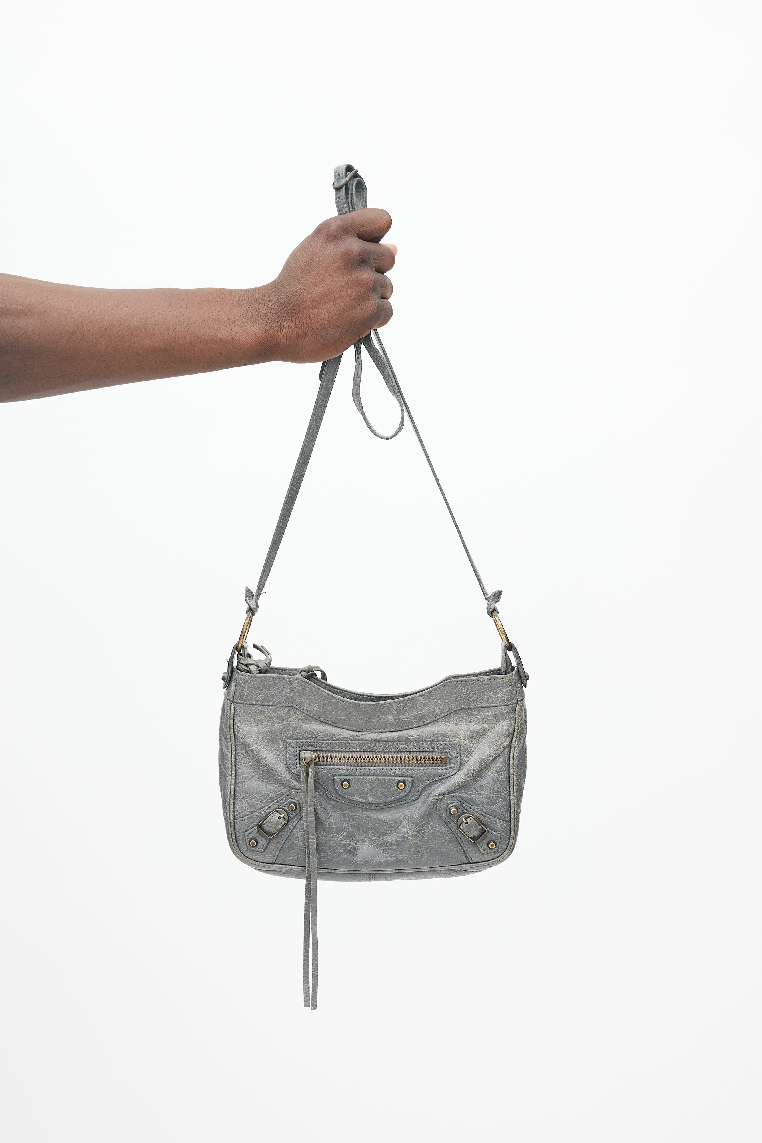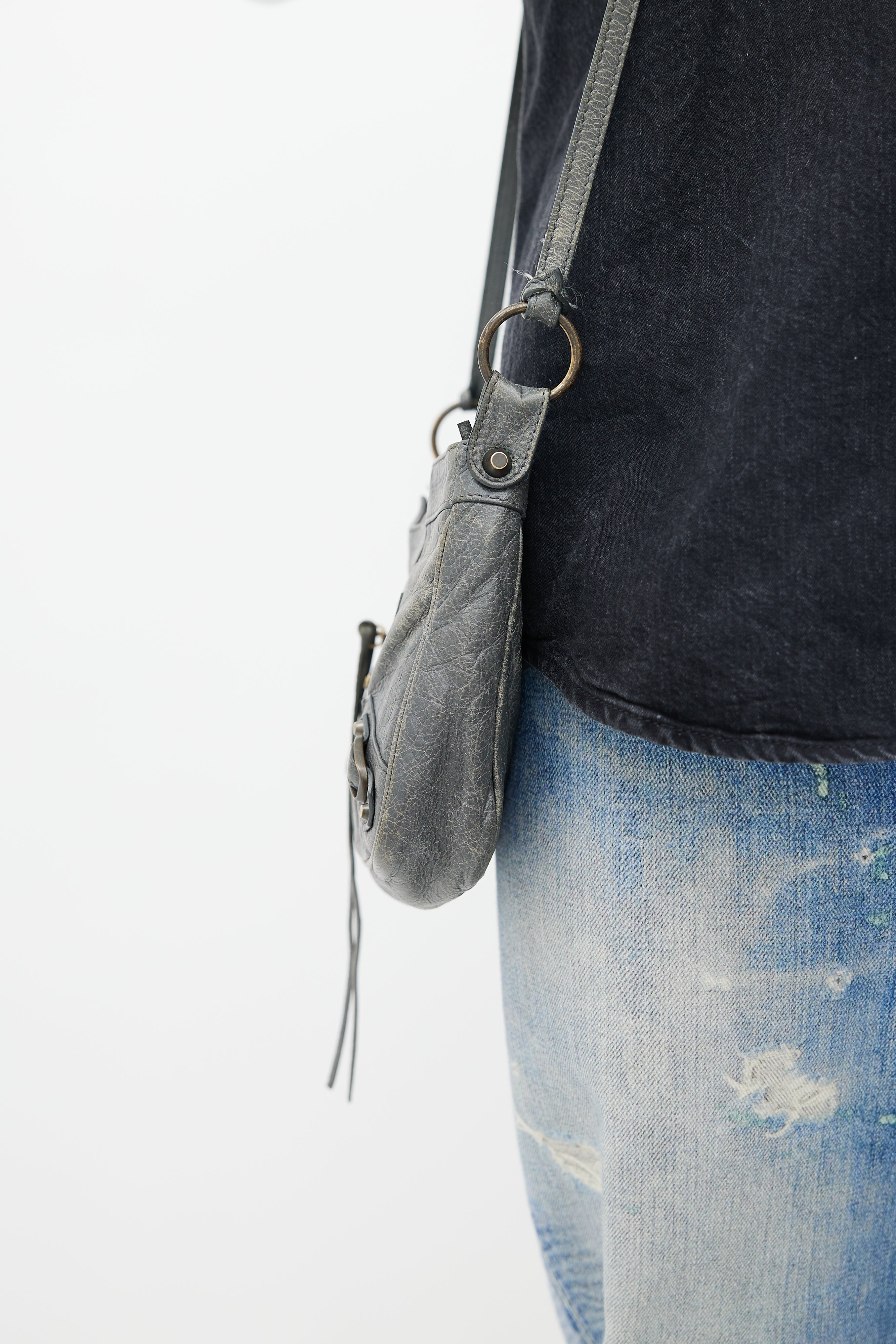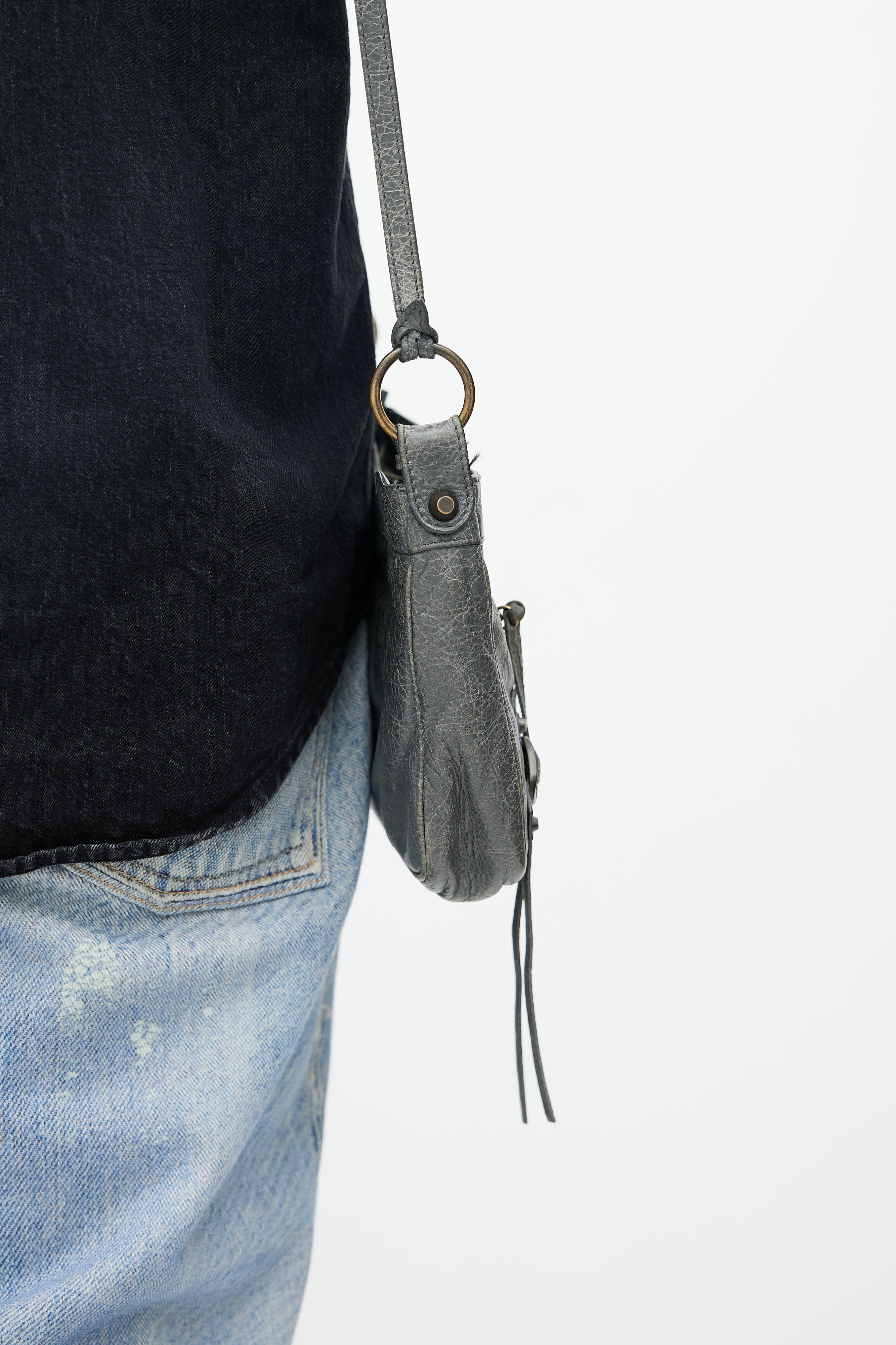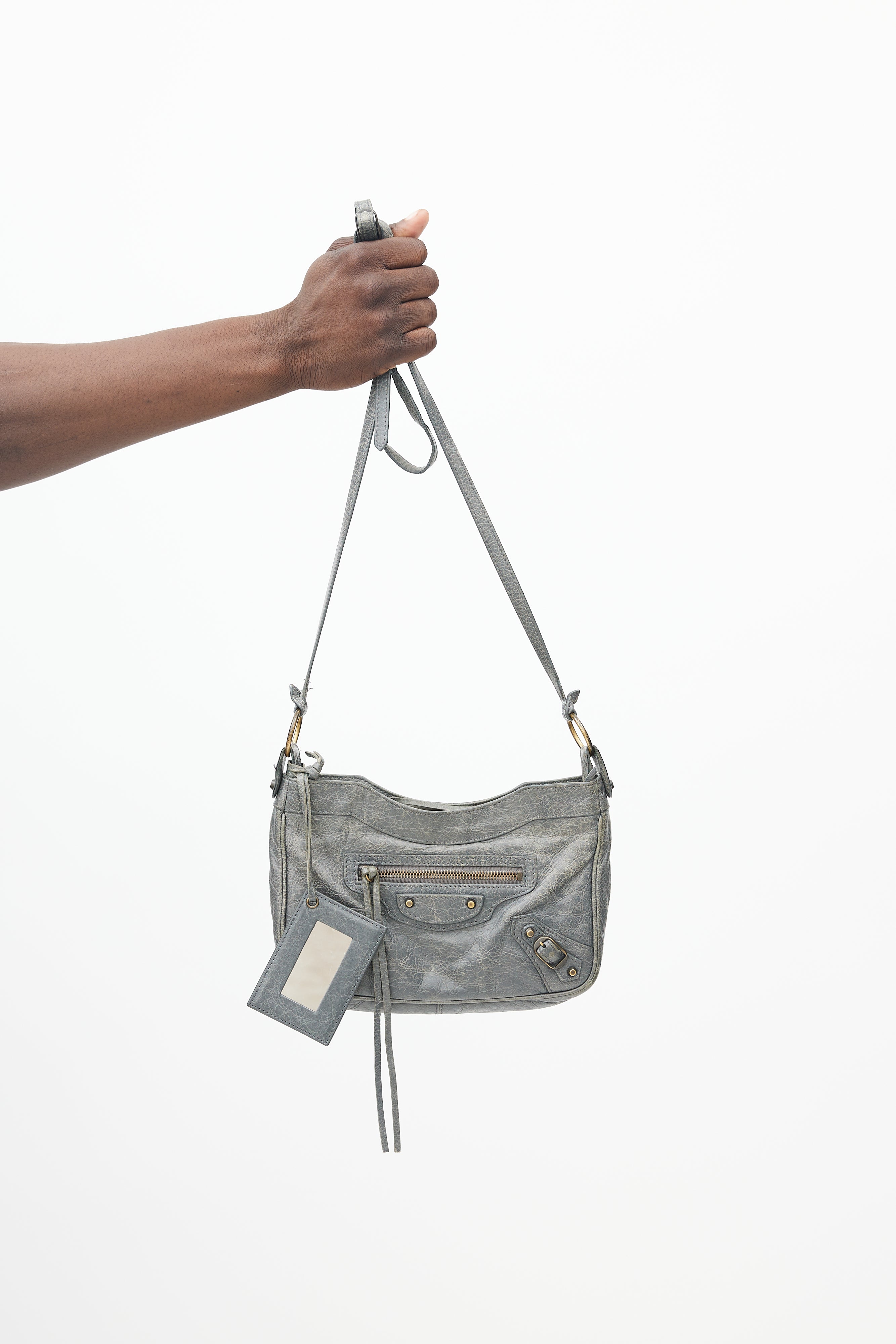 Pre-owned Balenciaga Agneau Motocross hip bag featuring crossbody strap, soft lambskin outer, exposed zipper at top with long leather tassel, outer pocket at side with exposed zip and leather tassel, woven interior lining, long interior zip pocket, small interior woven pocket and attached mirror at strap.