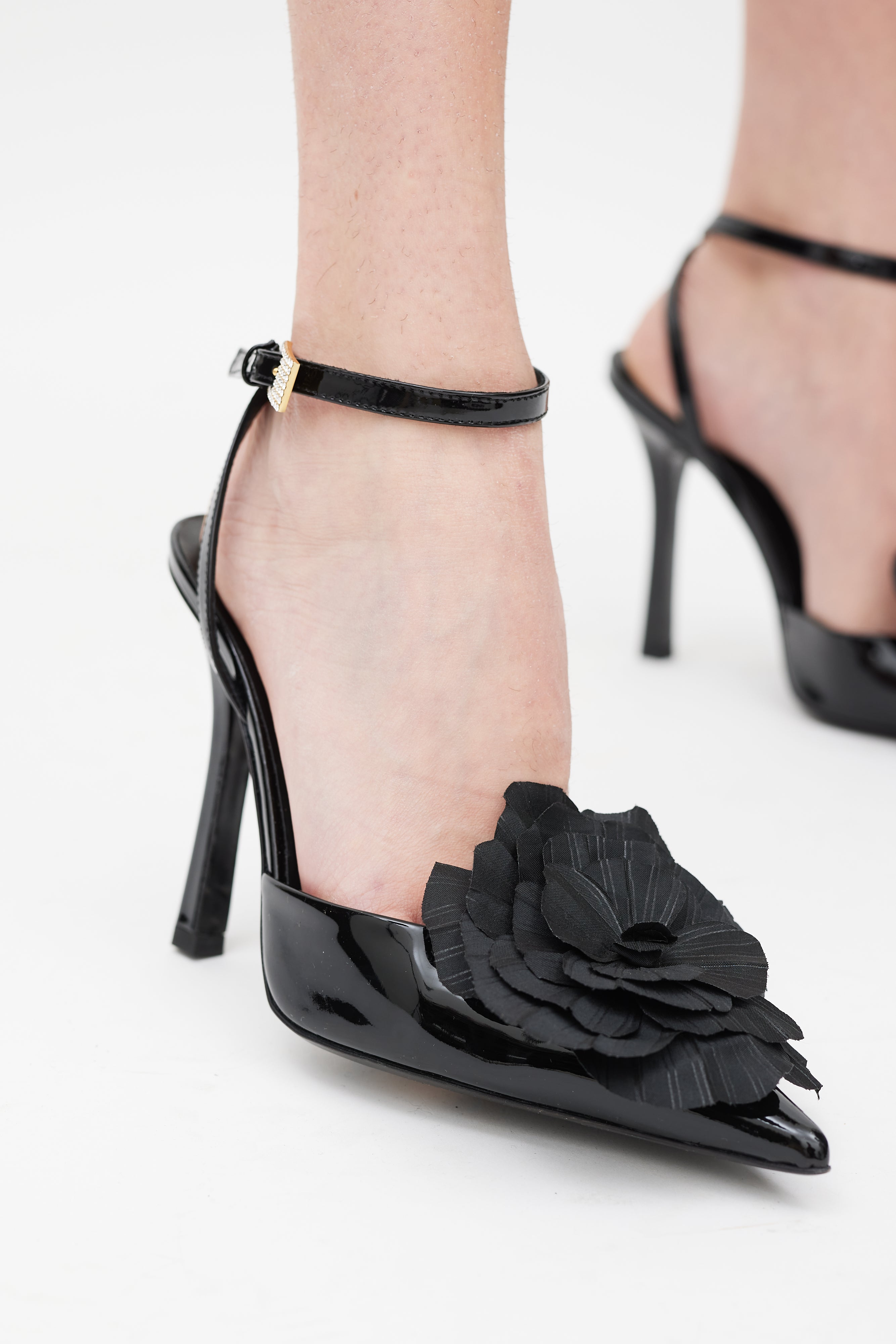 Pre-owned Blumarine black Decollete heels featuring patent leather upper, pointed toe, large taffeta flower embellishment at vamp, wrap around ankle strap with gold tone diamante buckle, and covered stiletto heel.