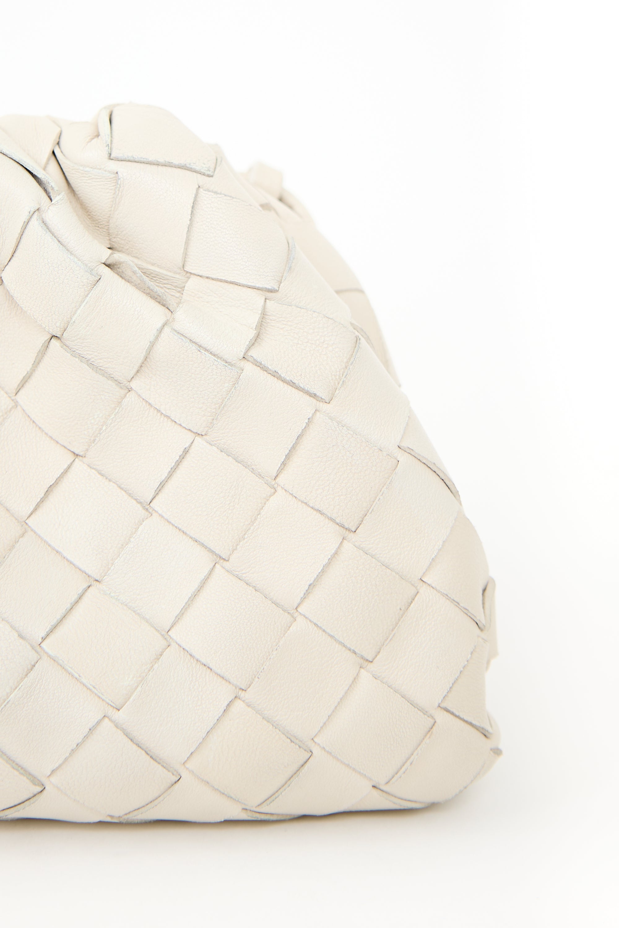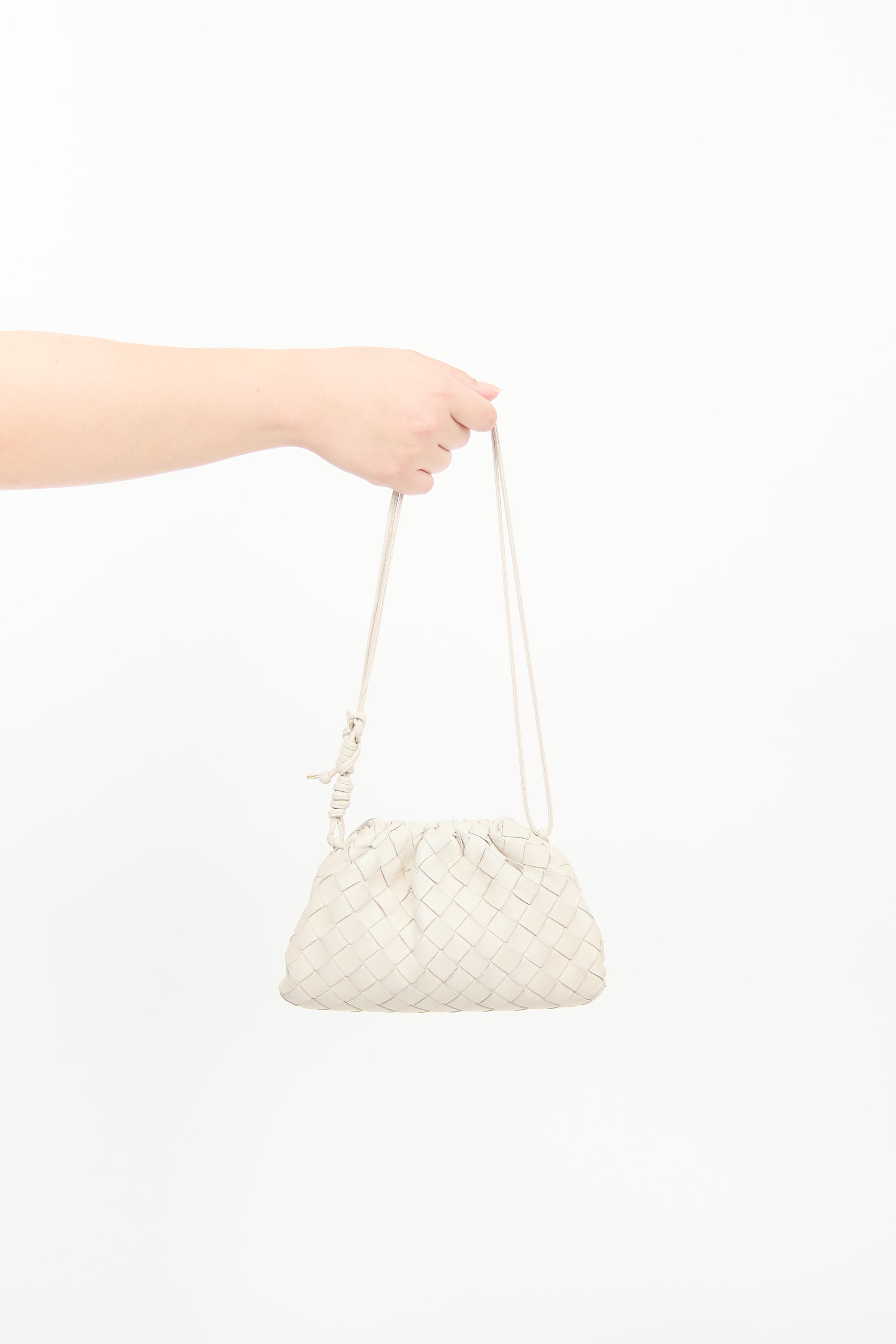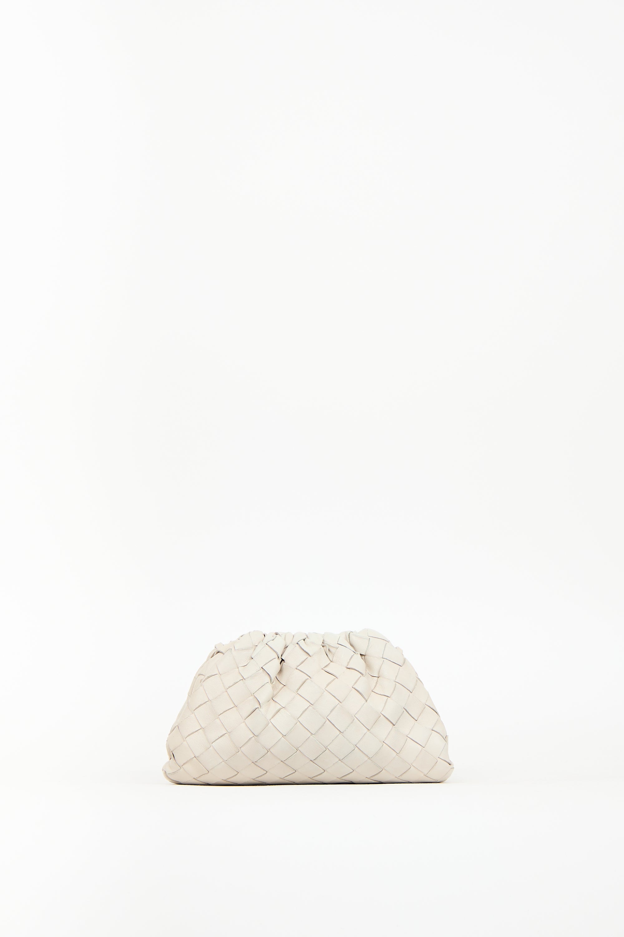 Pre-owned Bottega Veneta beige mini Pouch crossbody bag featuring Intrecciato woven leather body, adjustable knotted shoulder strap, magnetic frame closure, and one lined main compartment with stamped logo.