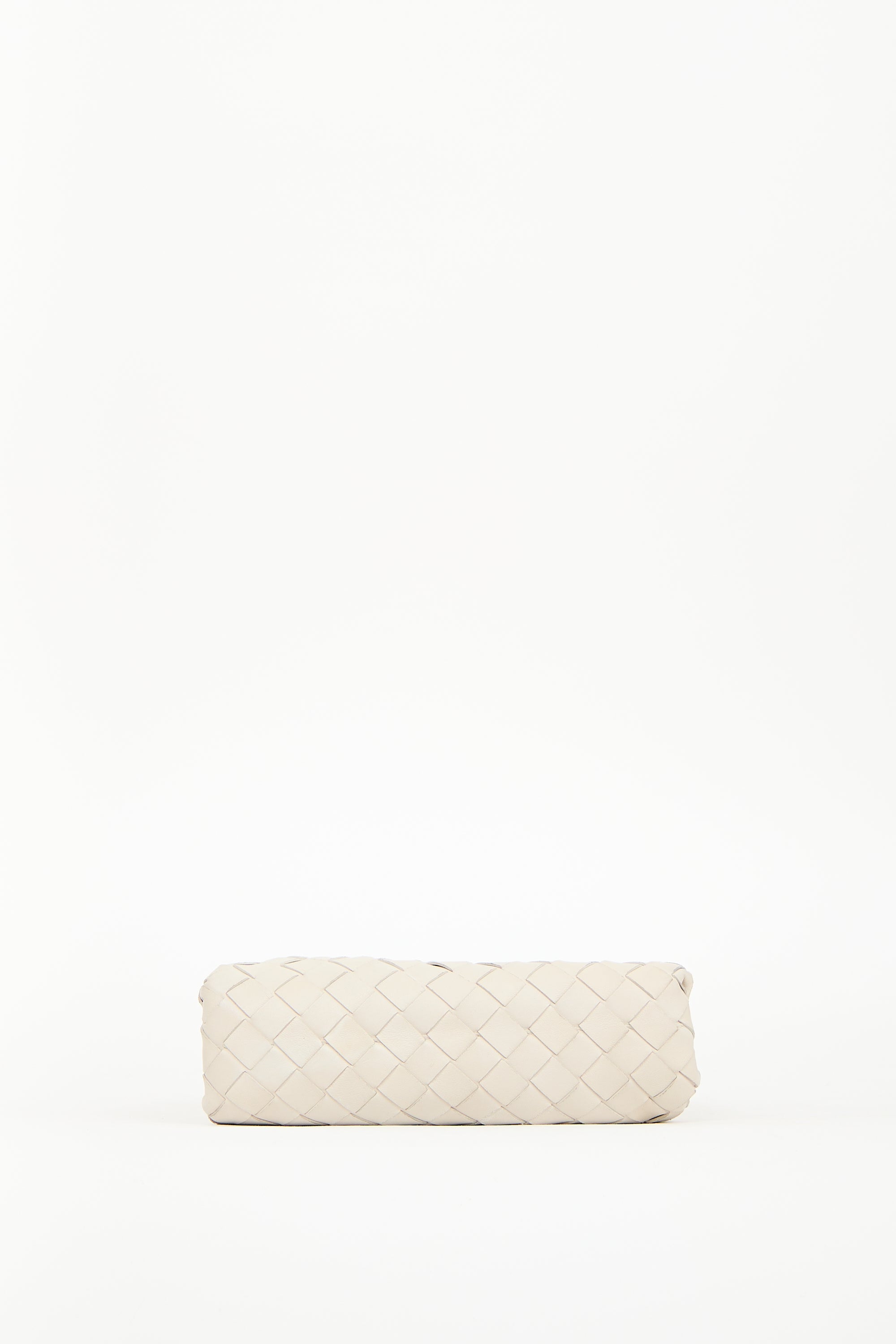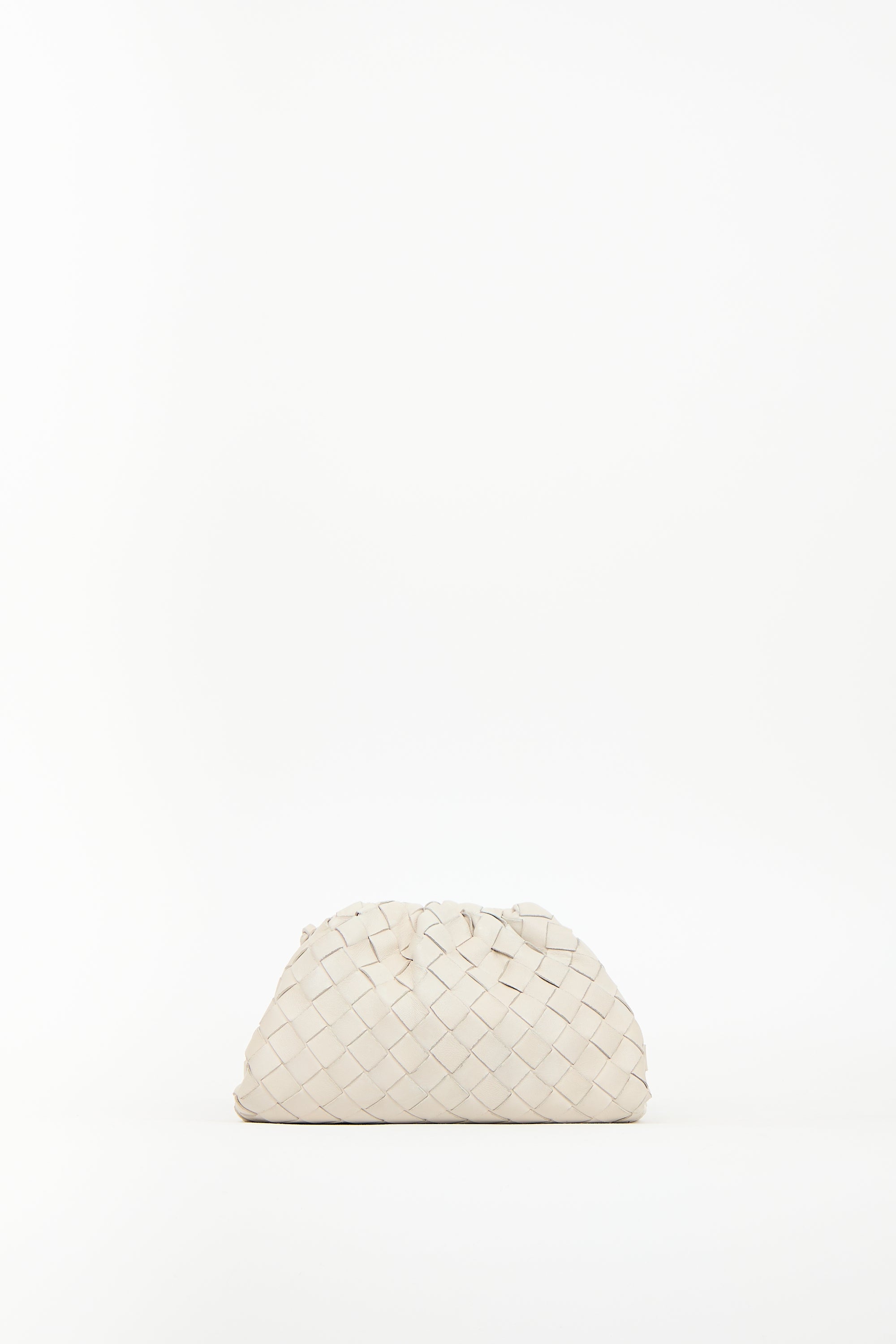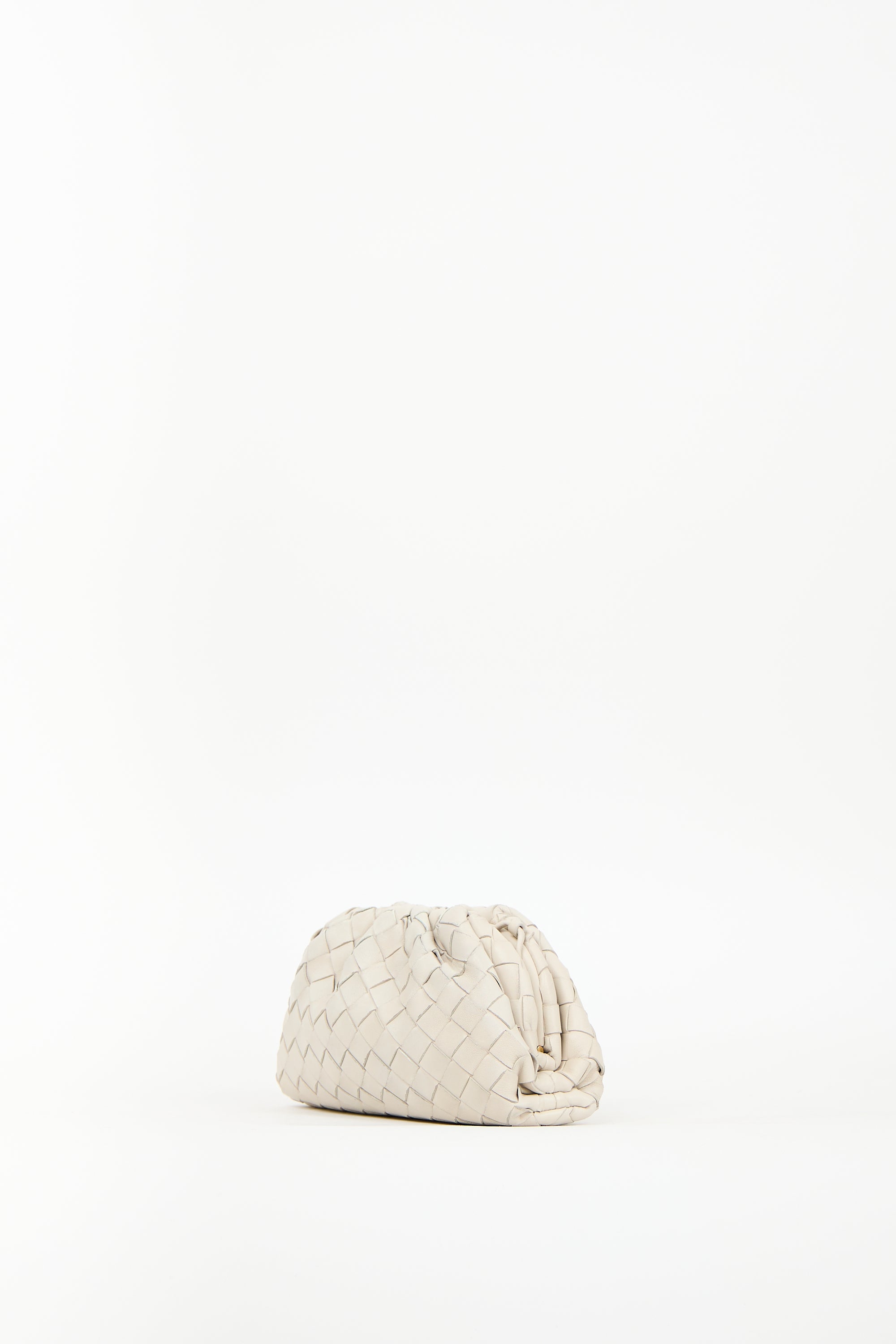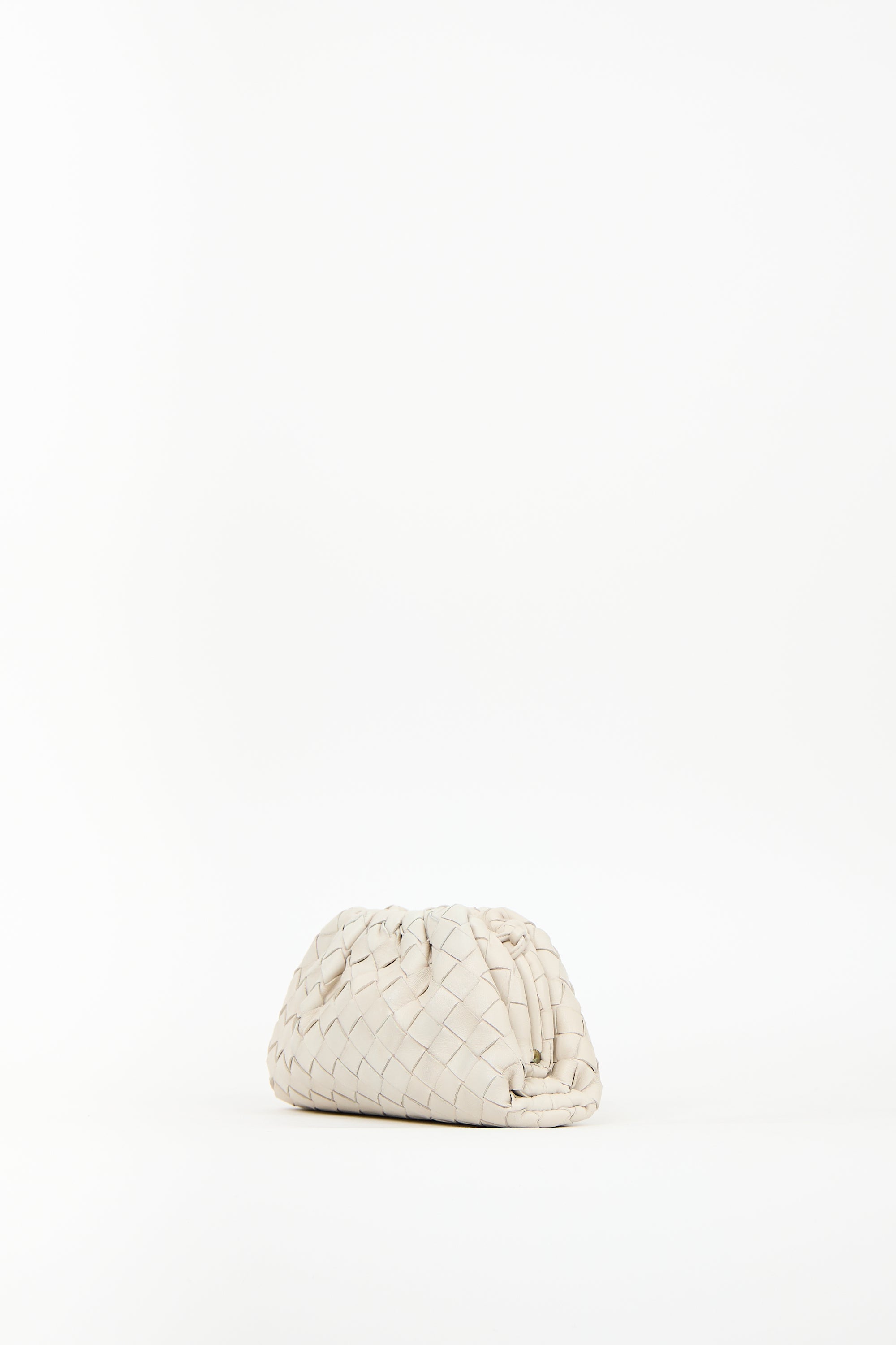 Pre-owned Bottega Veneta beige mini Pouch crossbody bag featuring Intrecciato woven leather body, adjustable knotted shoulder strap, magnetic frame closure, and one lined main compartment with stamped logo.
