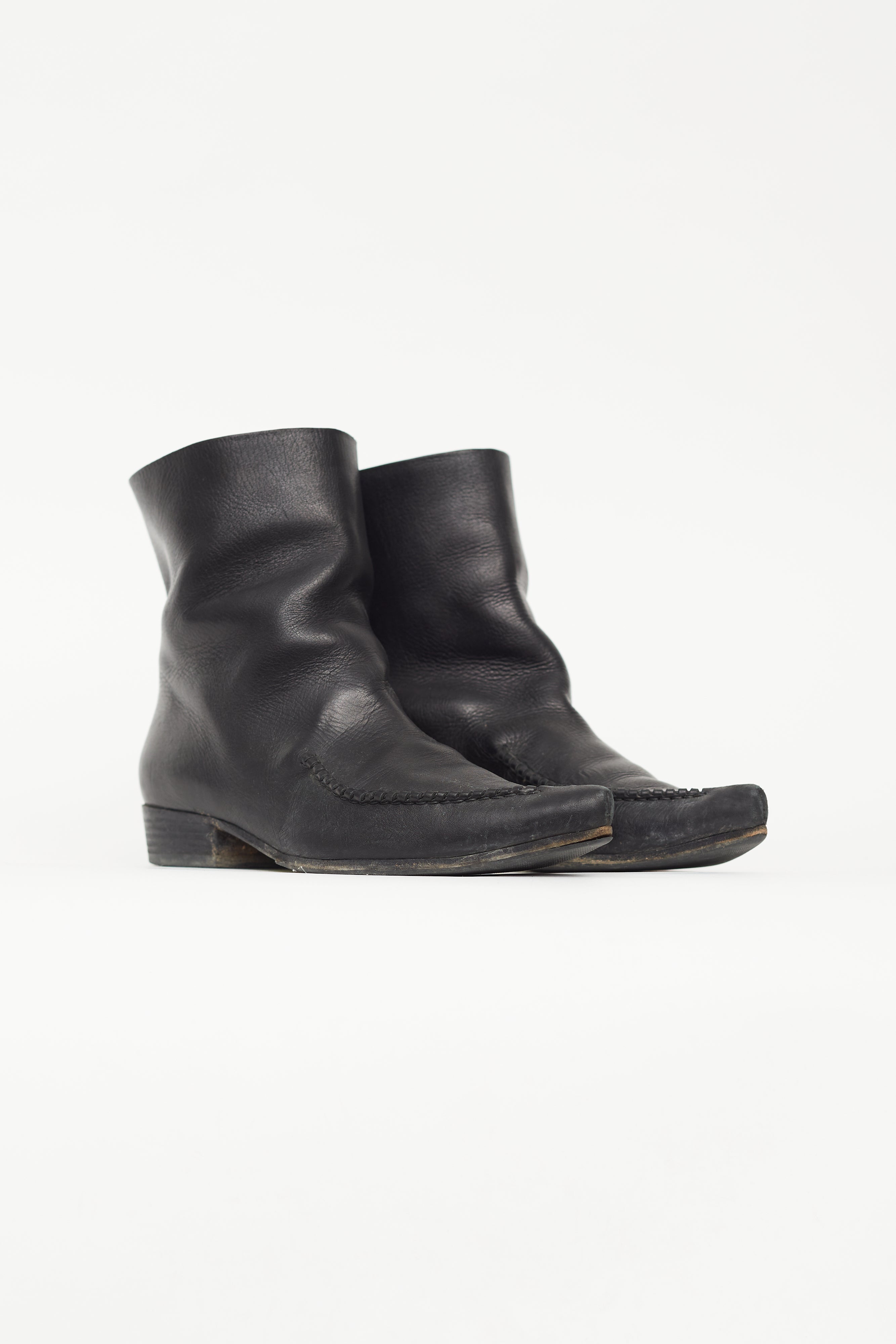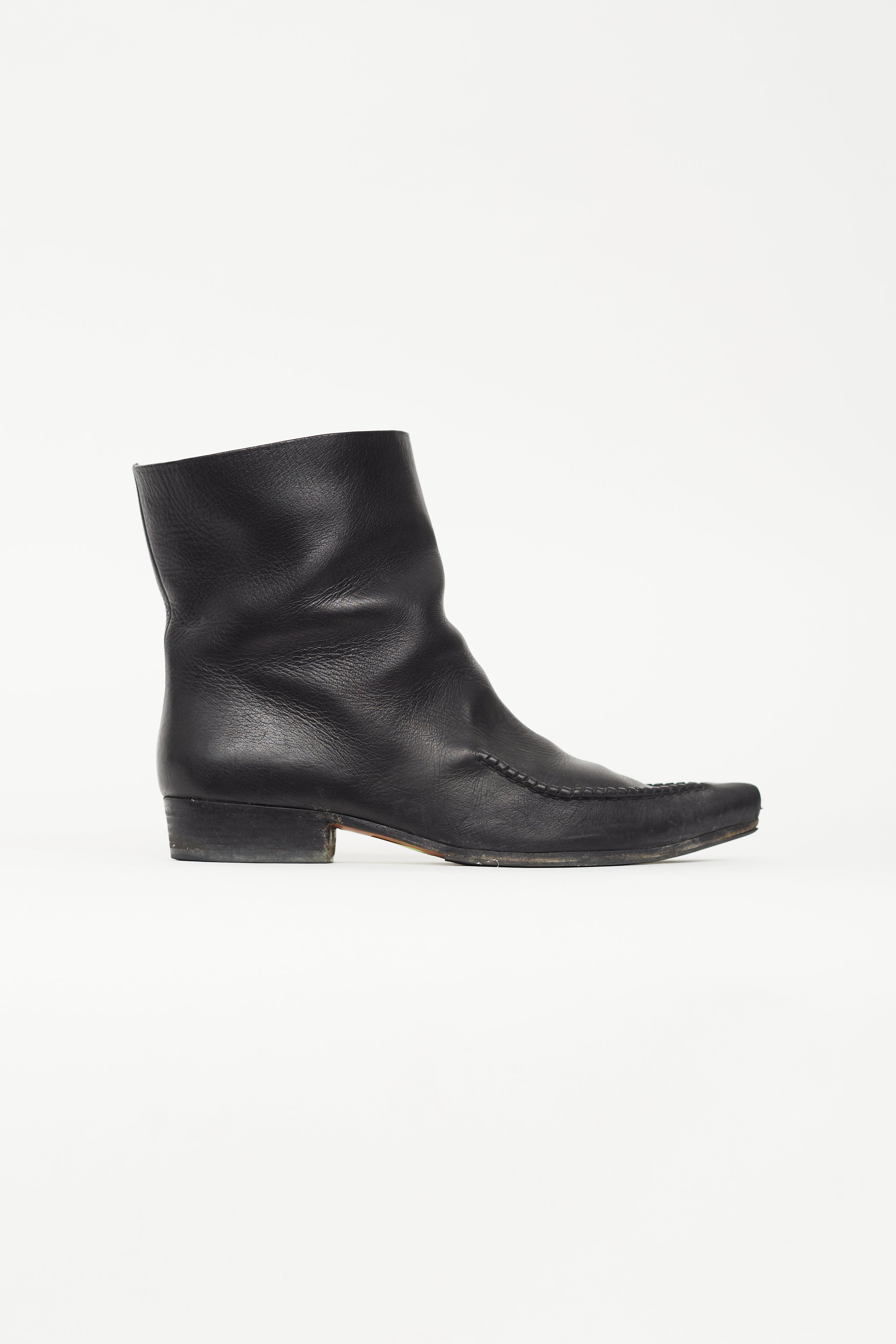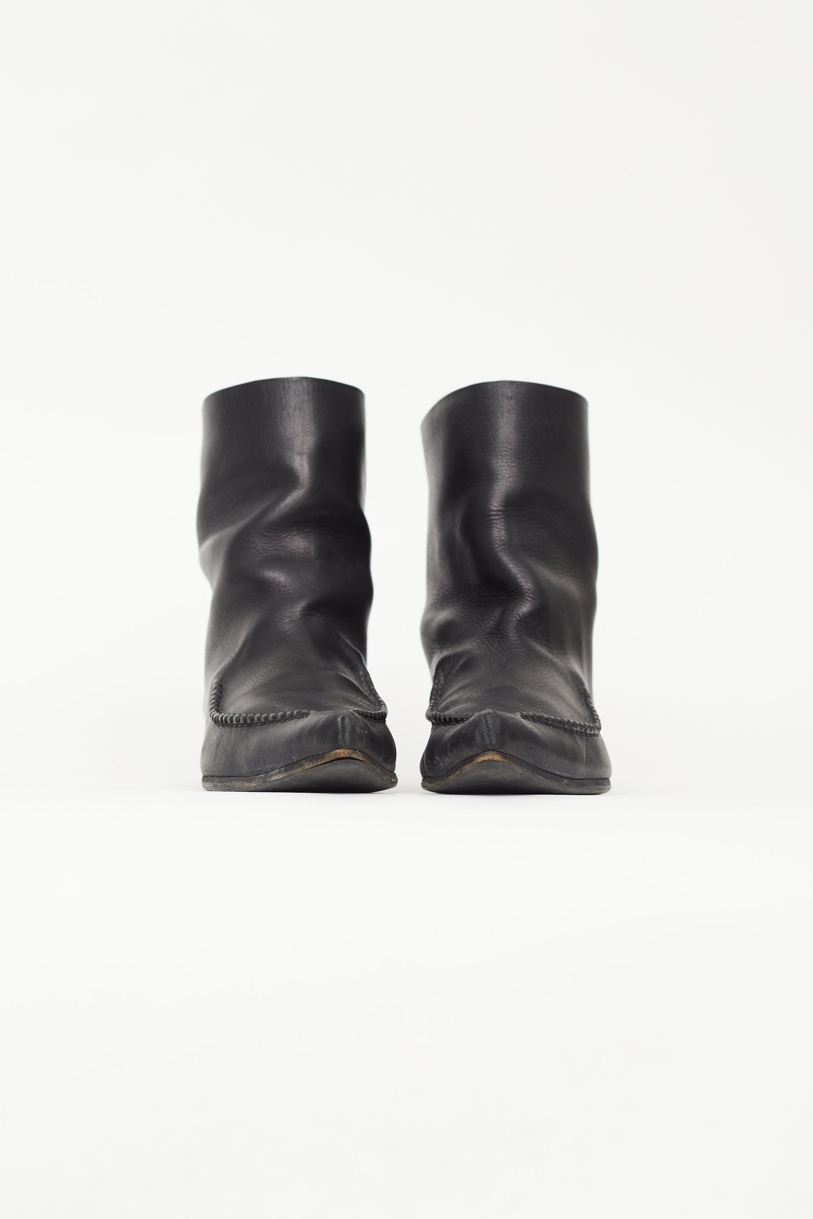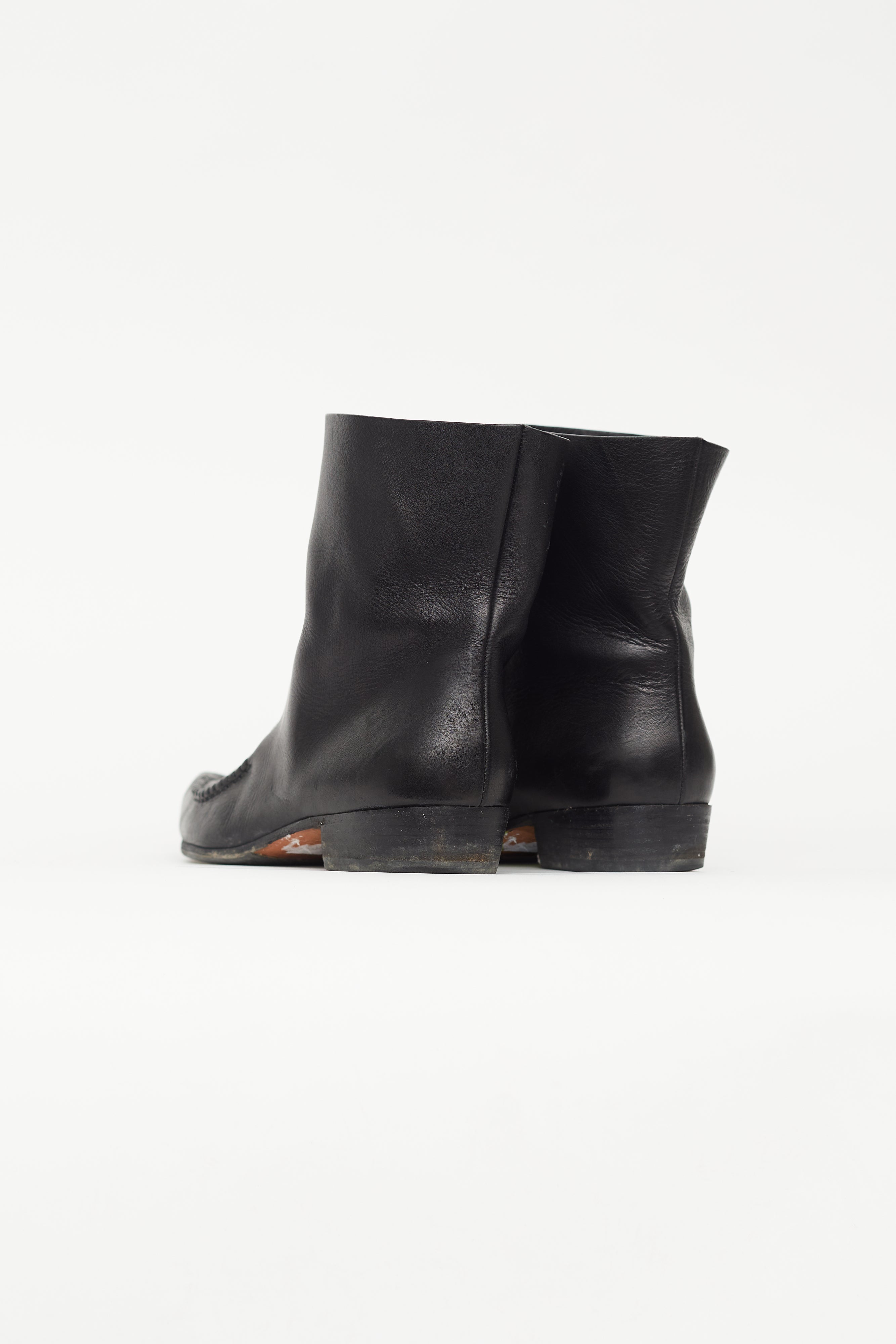 Pre-owned Celine leather ankle boot featuring stacked heel, pointed toe, wide collar, leather insole and combined leather and rubber outsole.