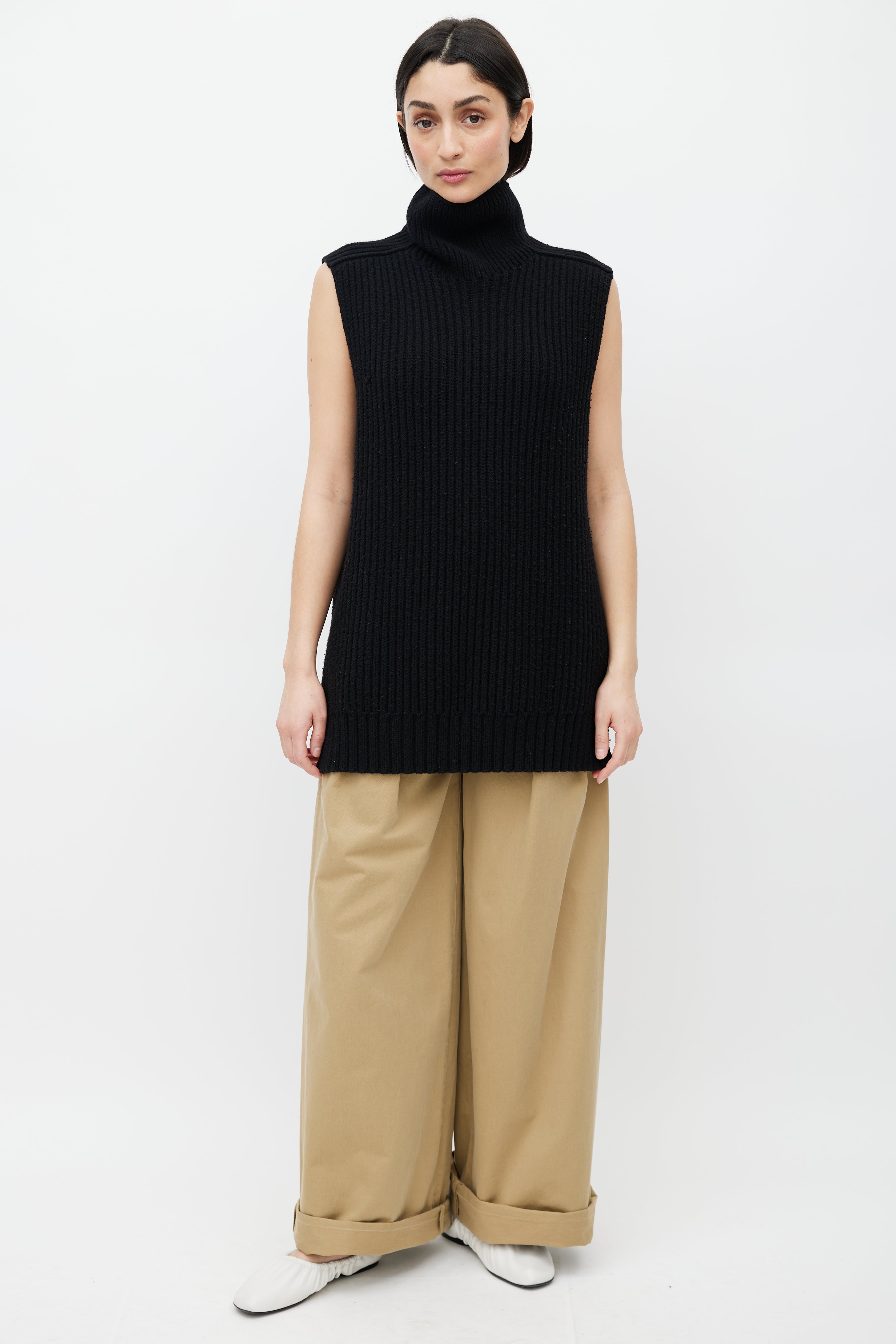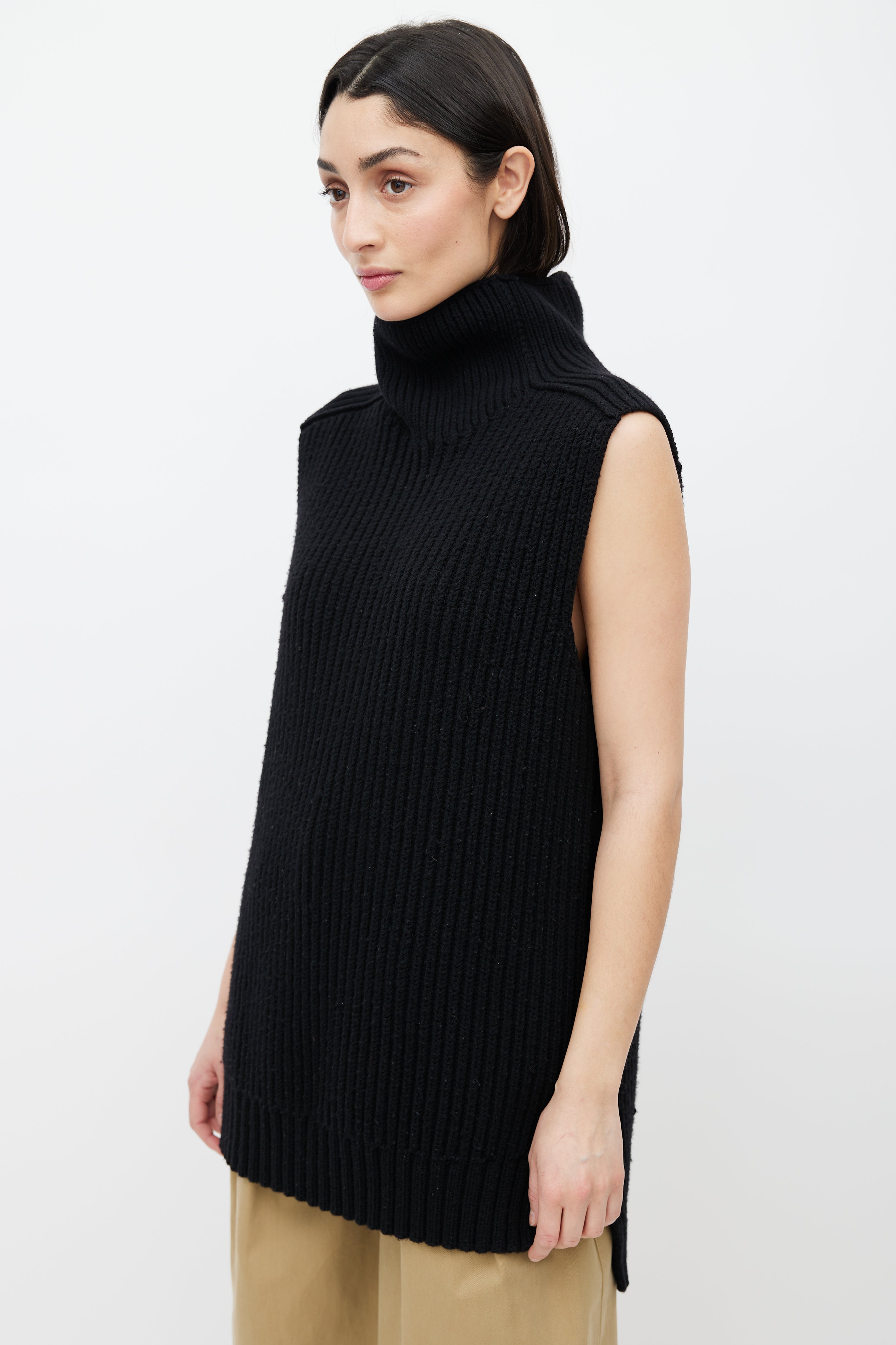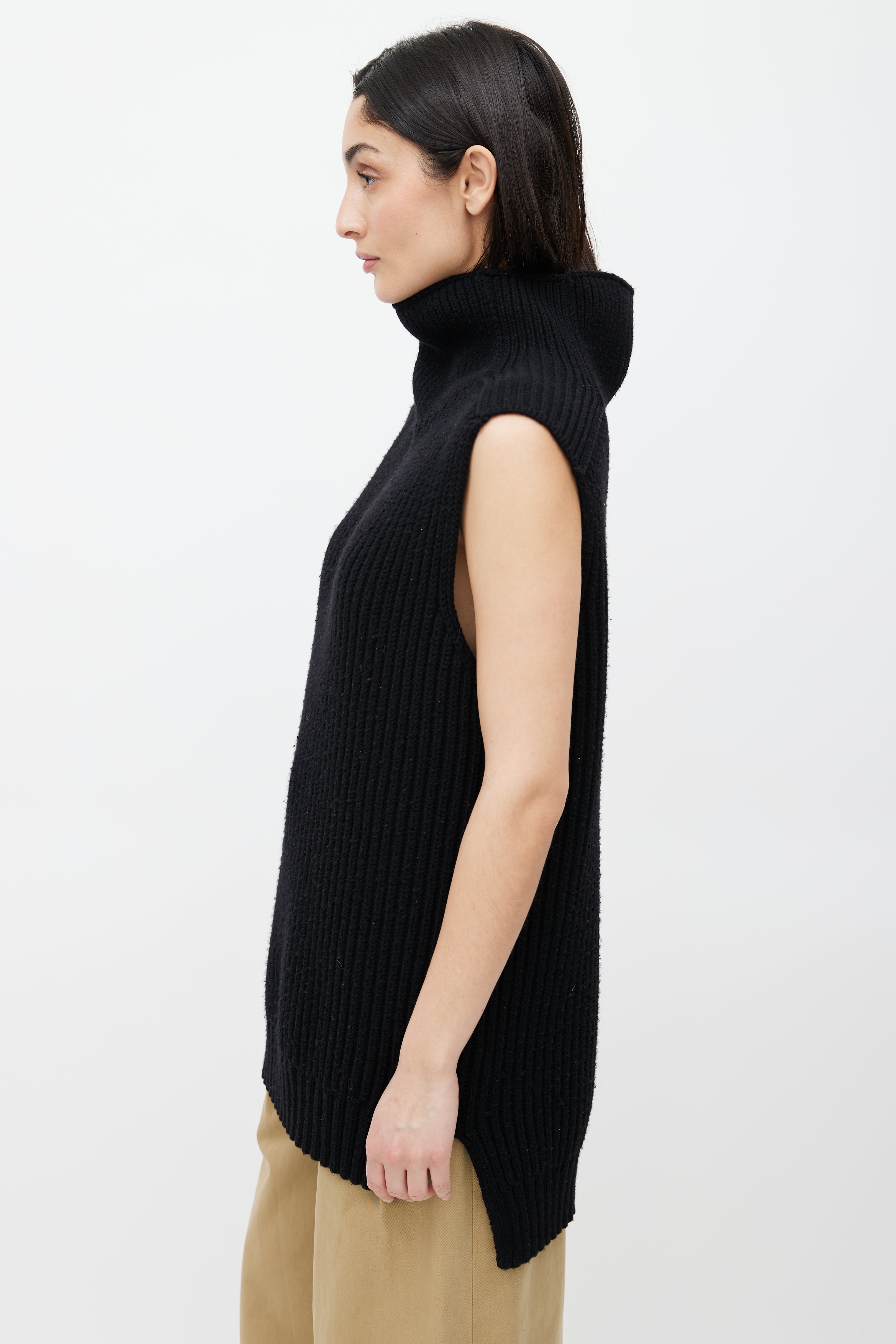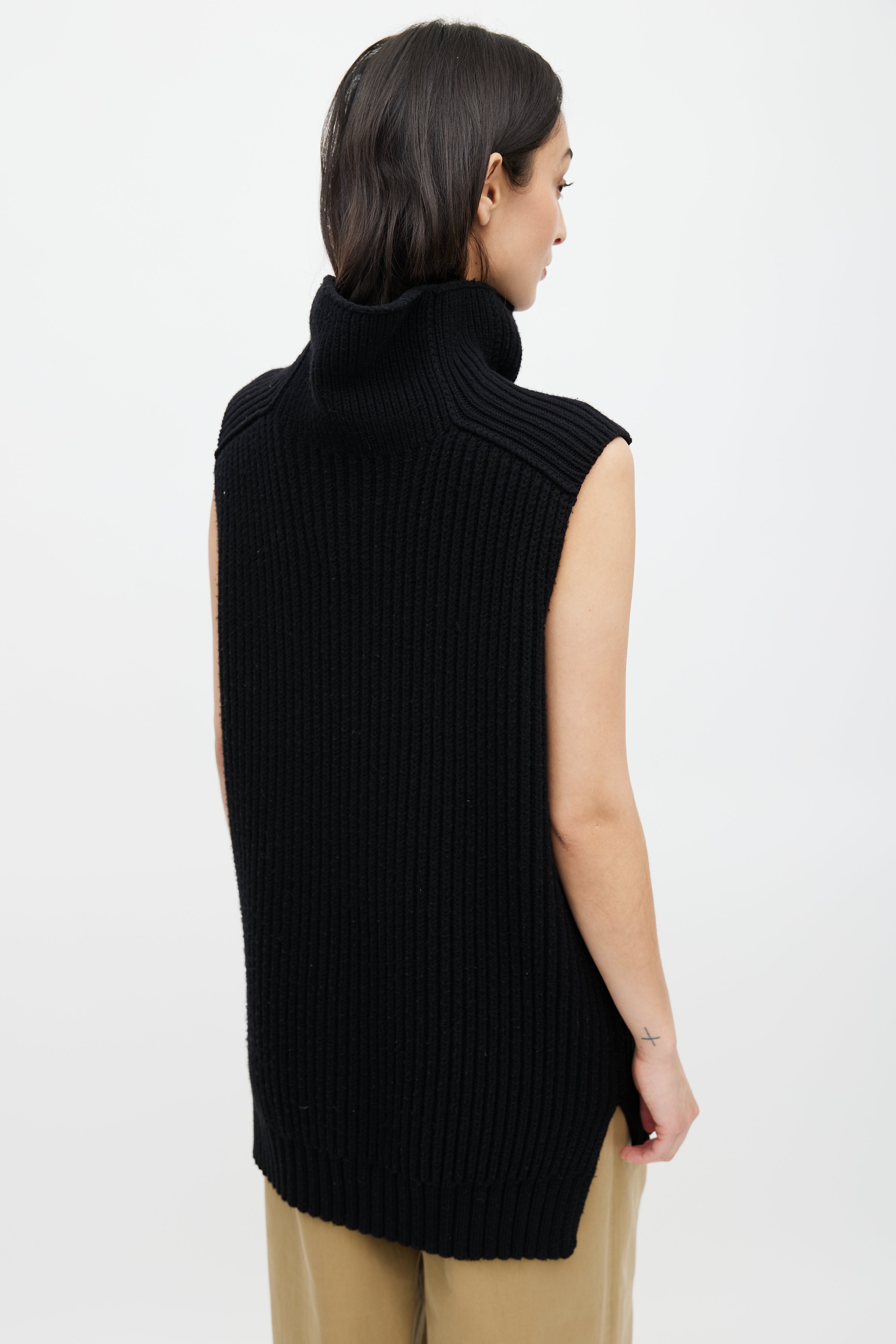 Pre-owned Celine black wool blend knit vest featuring turtleneck, ribbed knit, and high low hem.