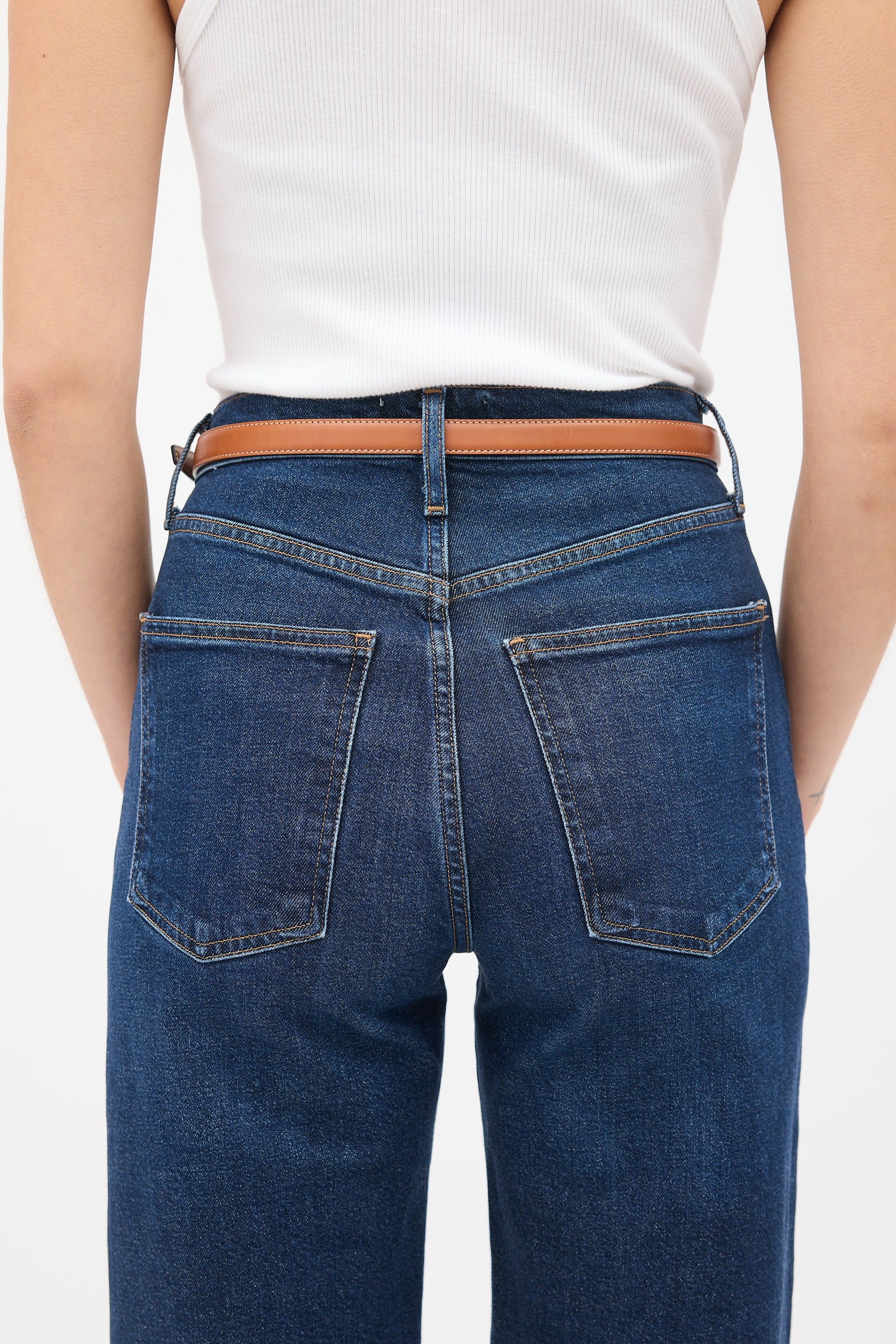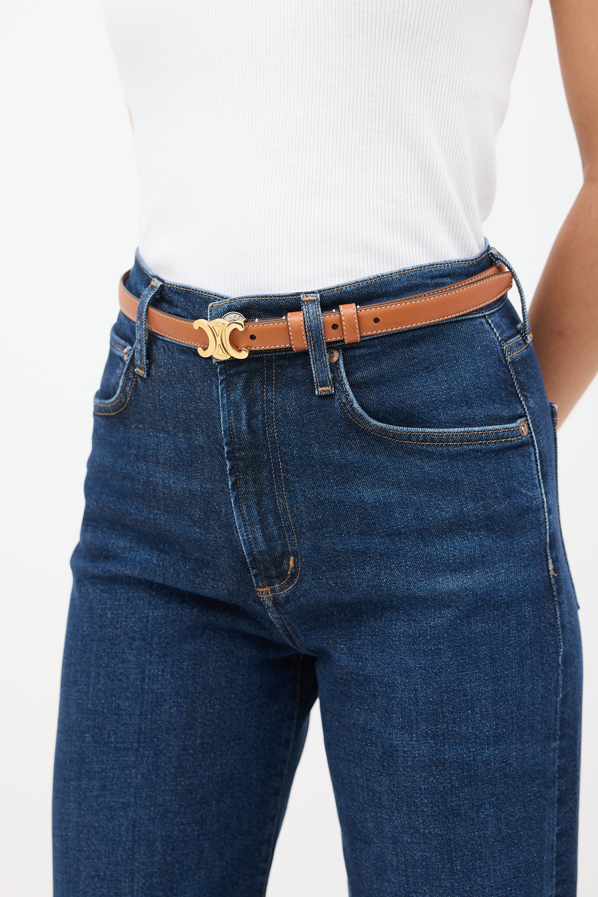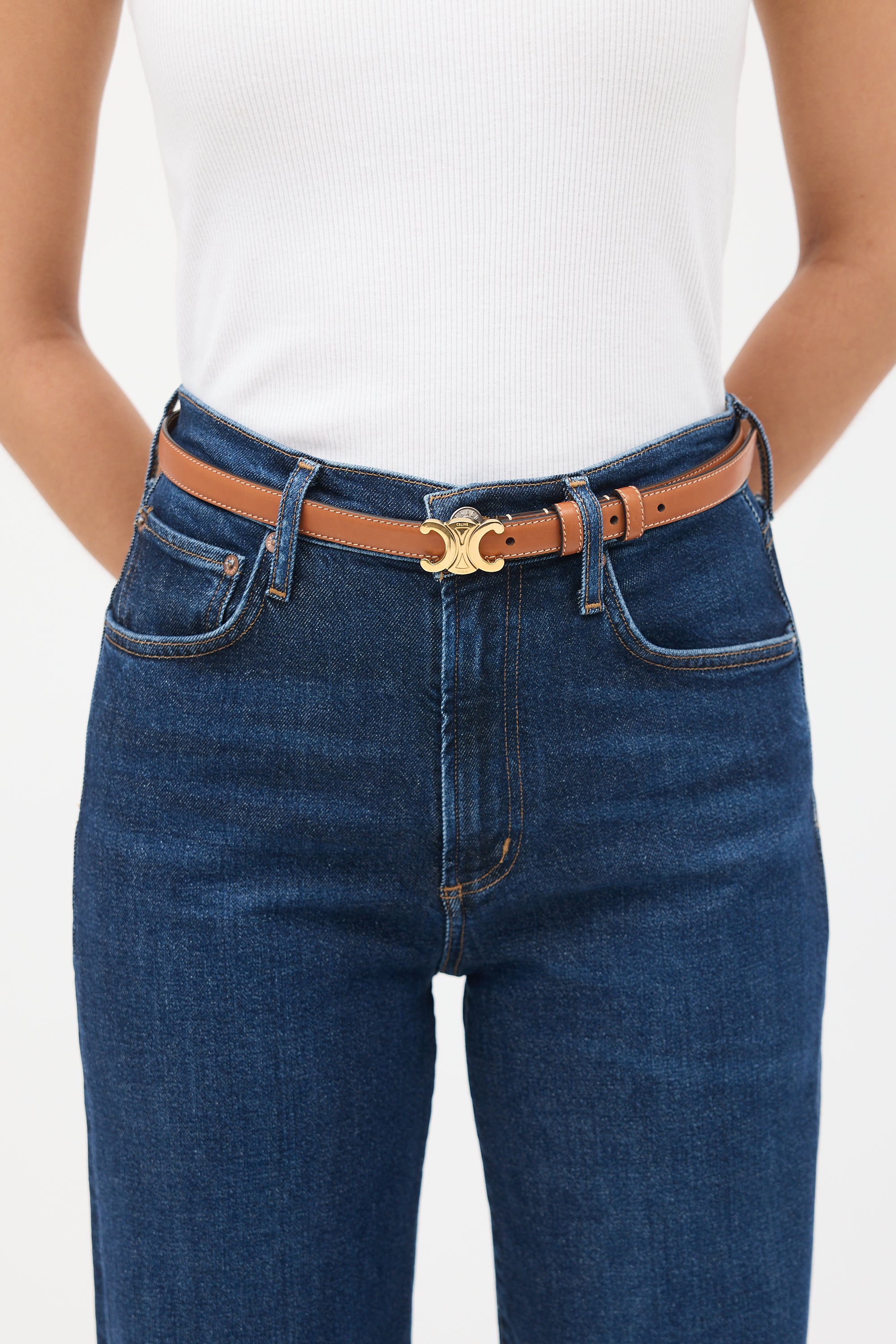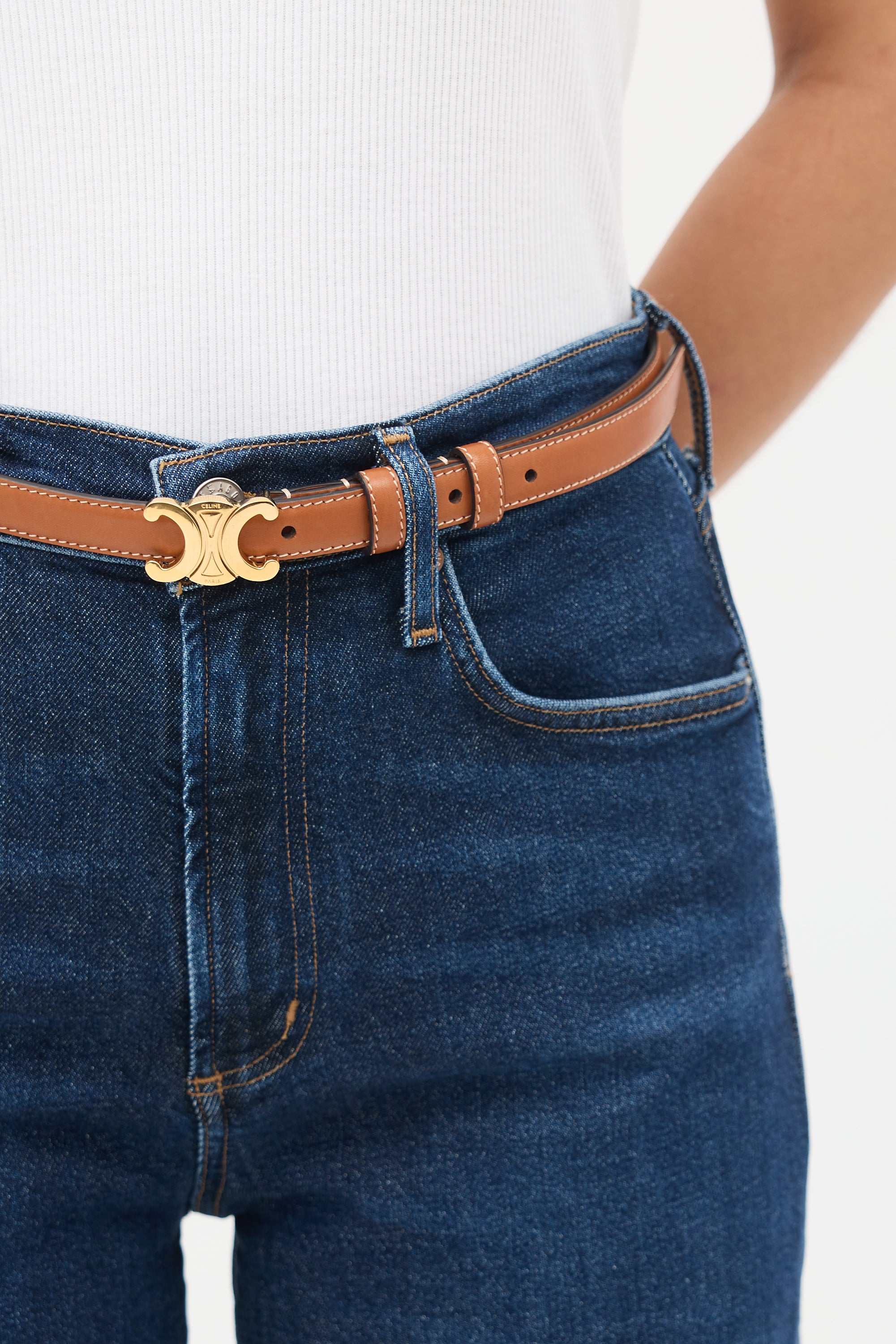 Pre-owned Celine brown leather belt featuring white contrast stitching, five hole adjustment, and gold tone Triomphe motif push buckle. Comes with original box and dust bag.