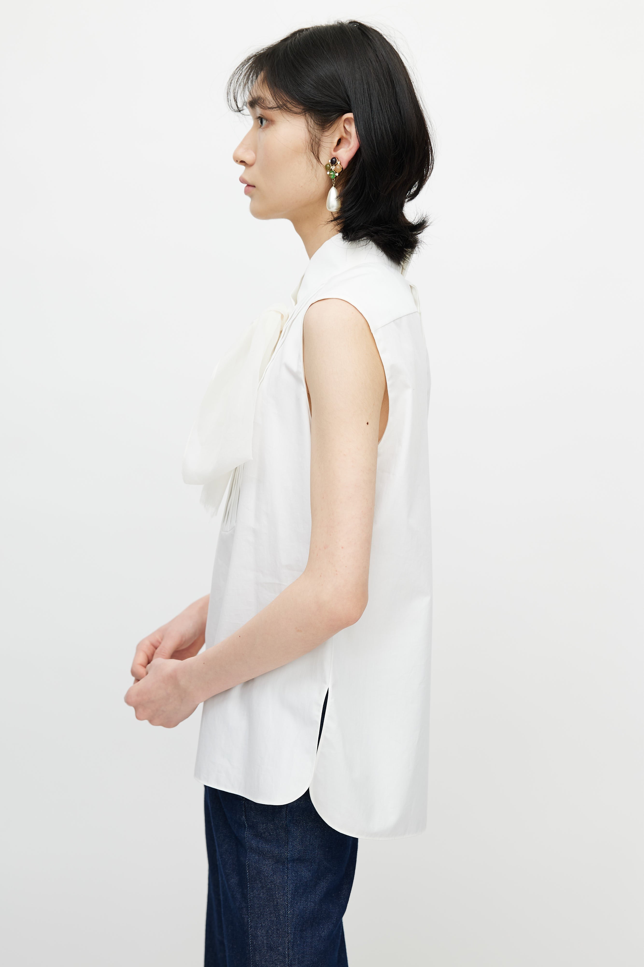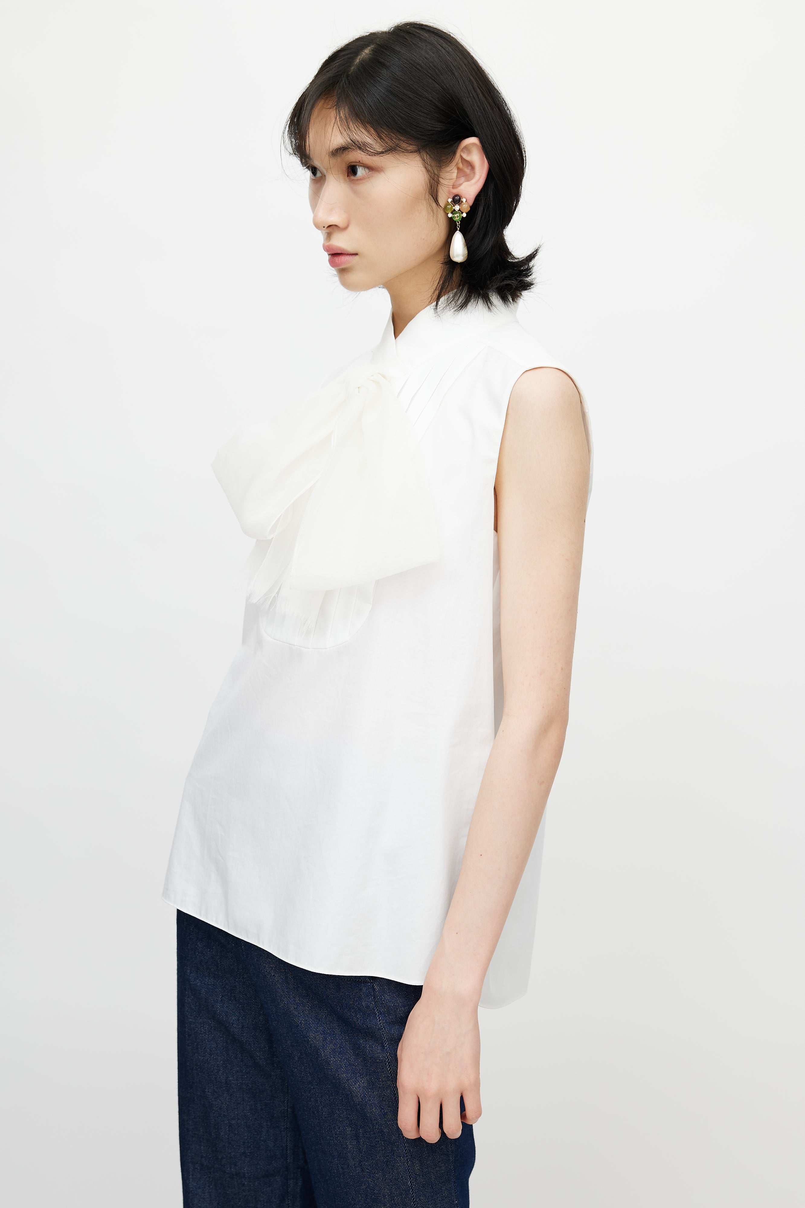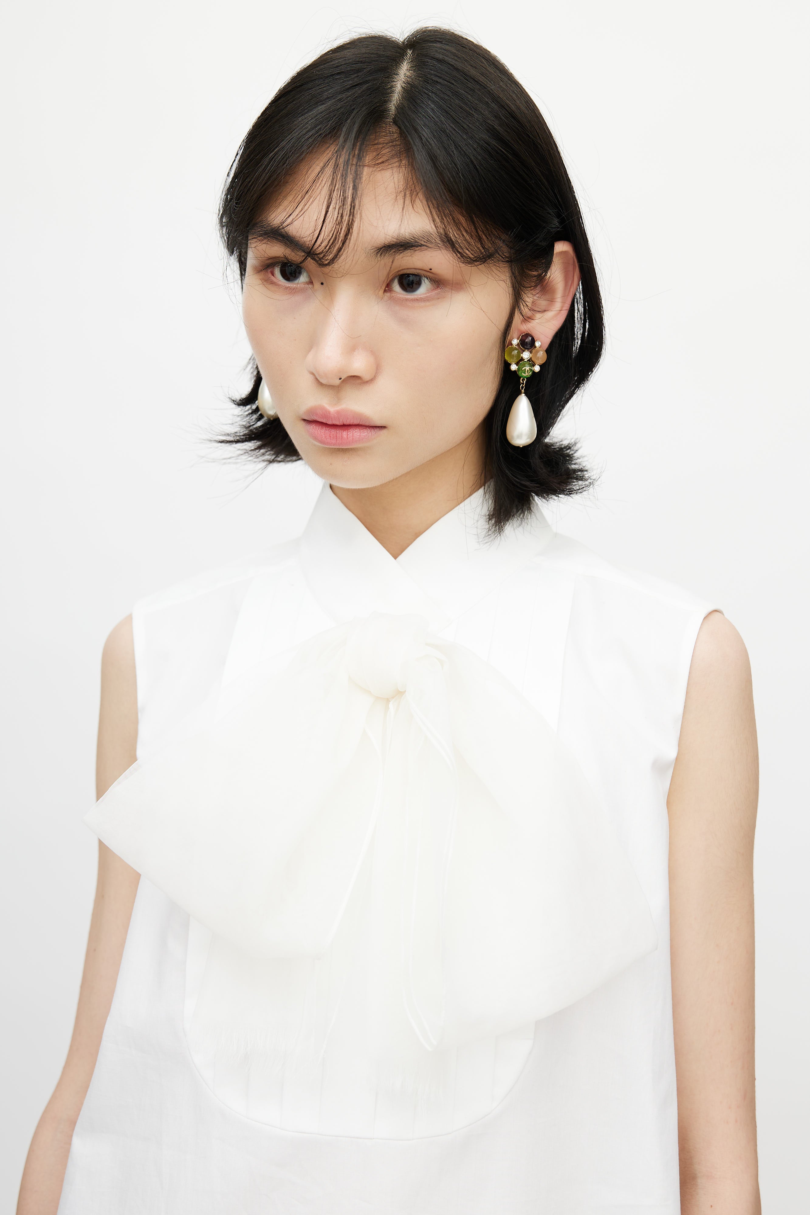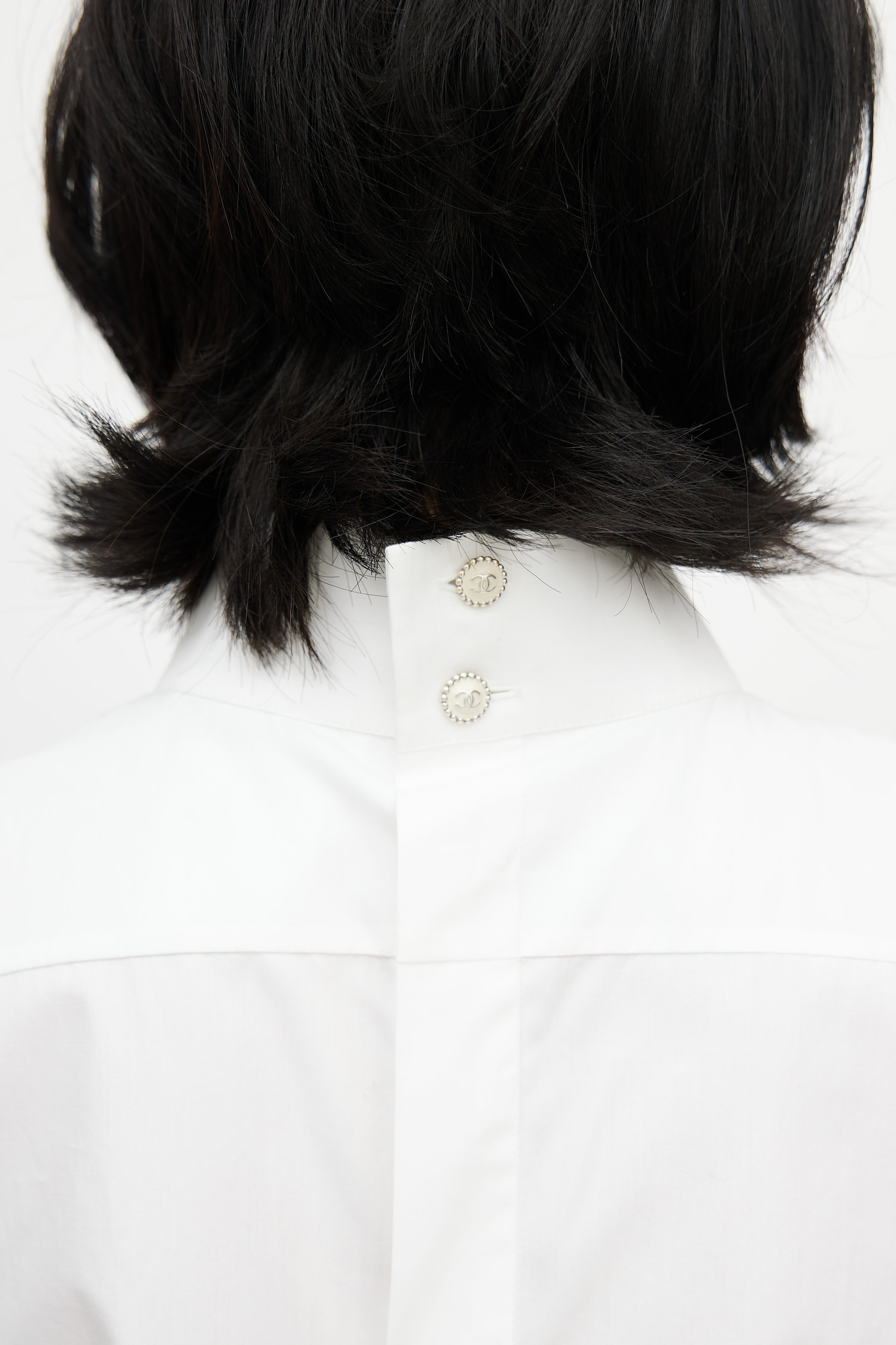 Pre-owned Spring 2007 Chanel white blouse featuring V-shaped collar, pleated at front, button closure at back, two embellished buttons at collar with CC logo, side slits, and tonal silk neck tie.