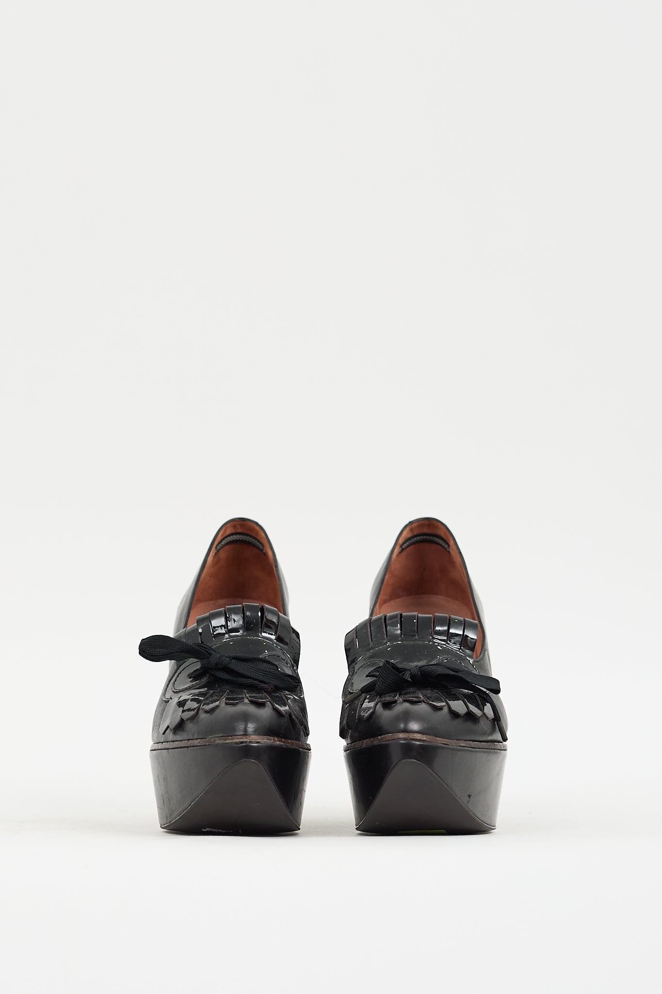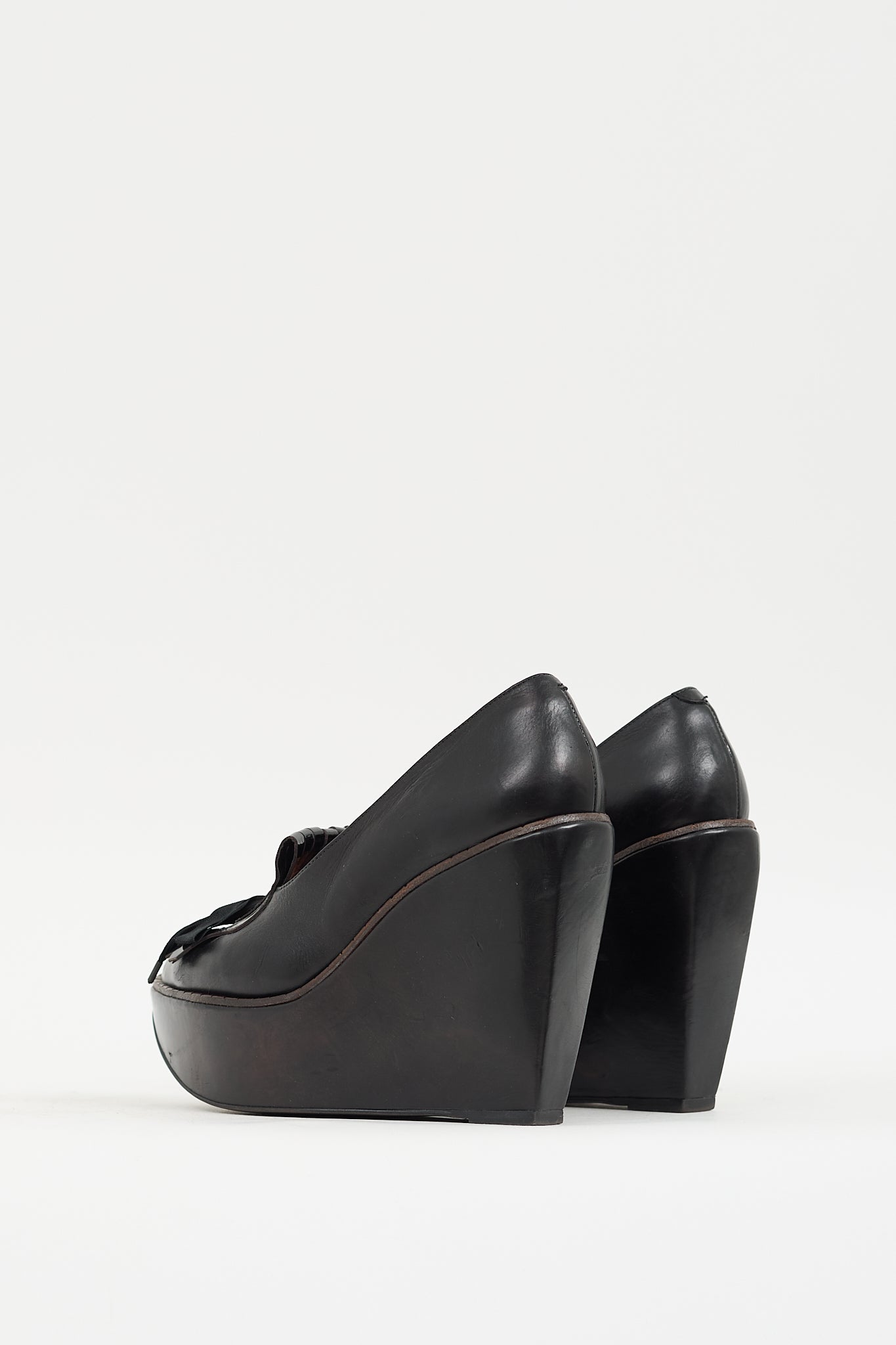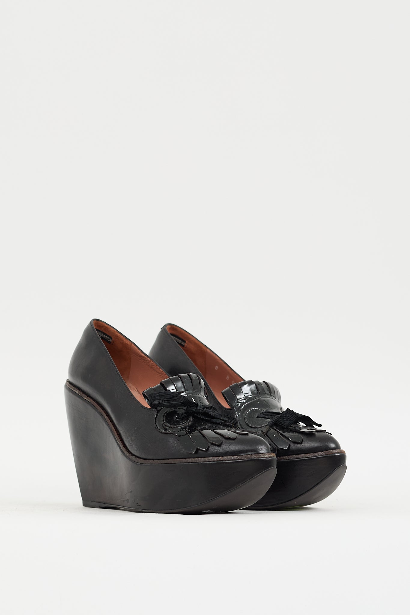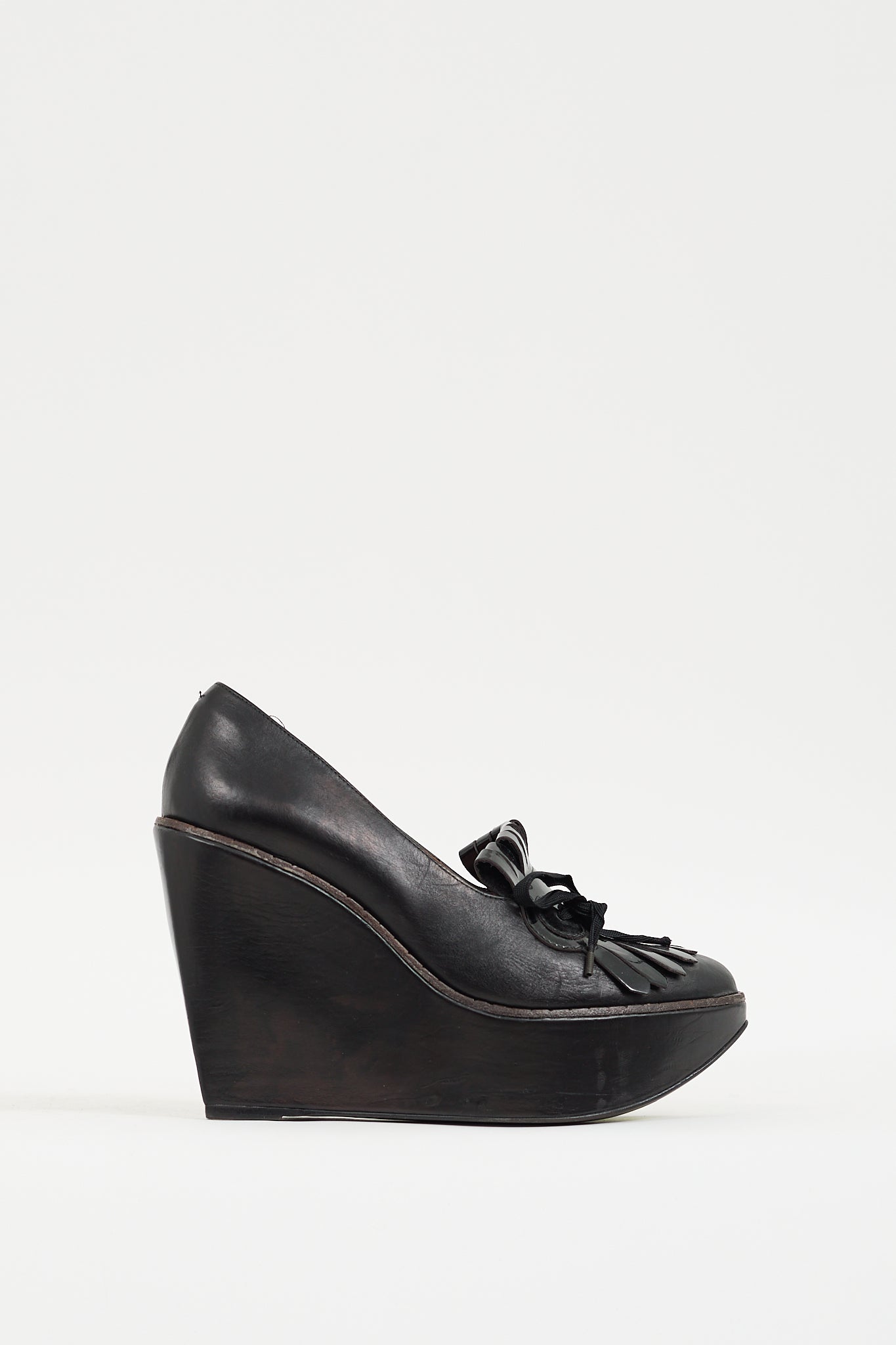 Pre-owned Clergerie black heels featuring an almond toe, leather upper, notched topline, patent leather kiltie fringe with tie detail at vamp, and covered platform wedge.