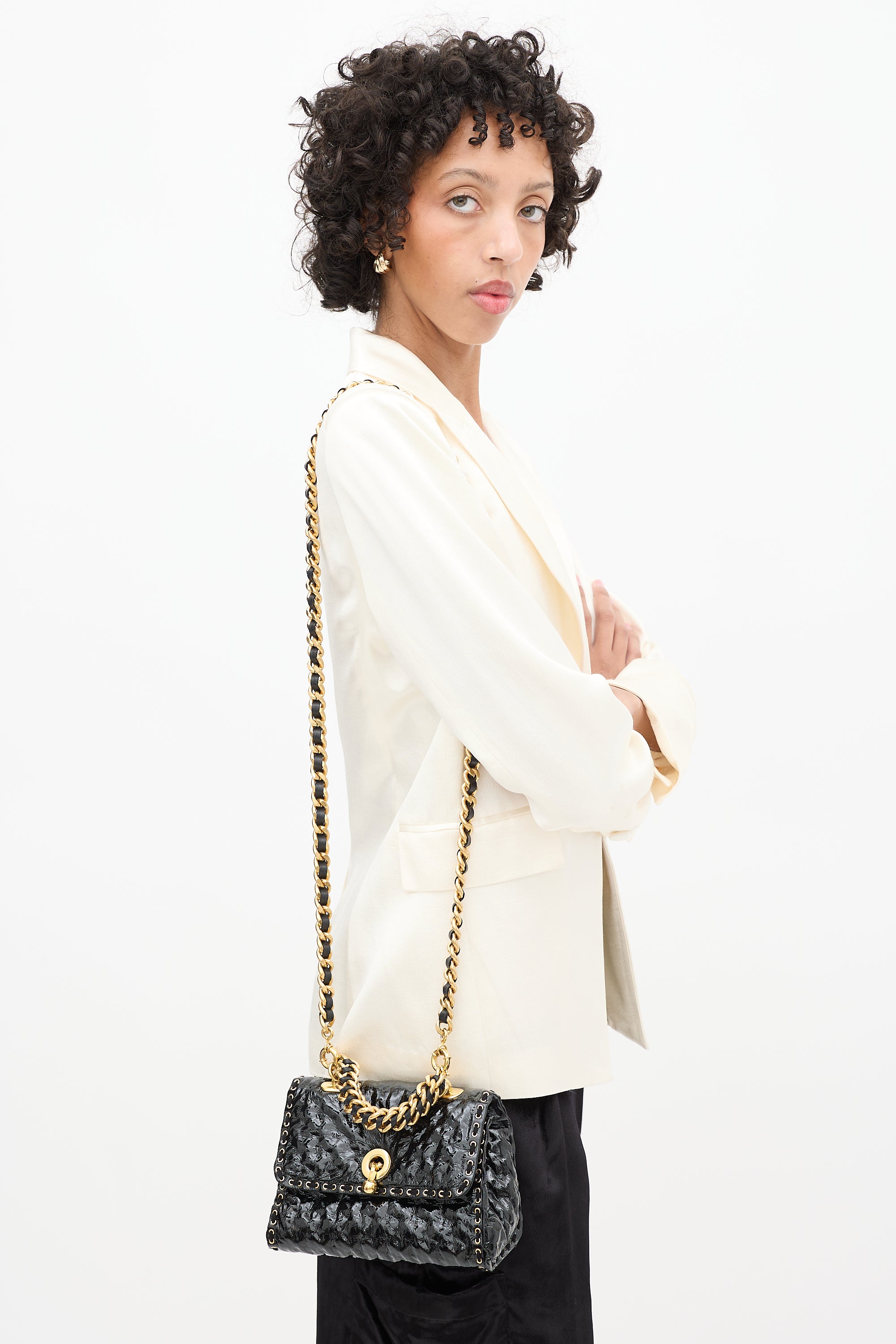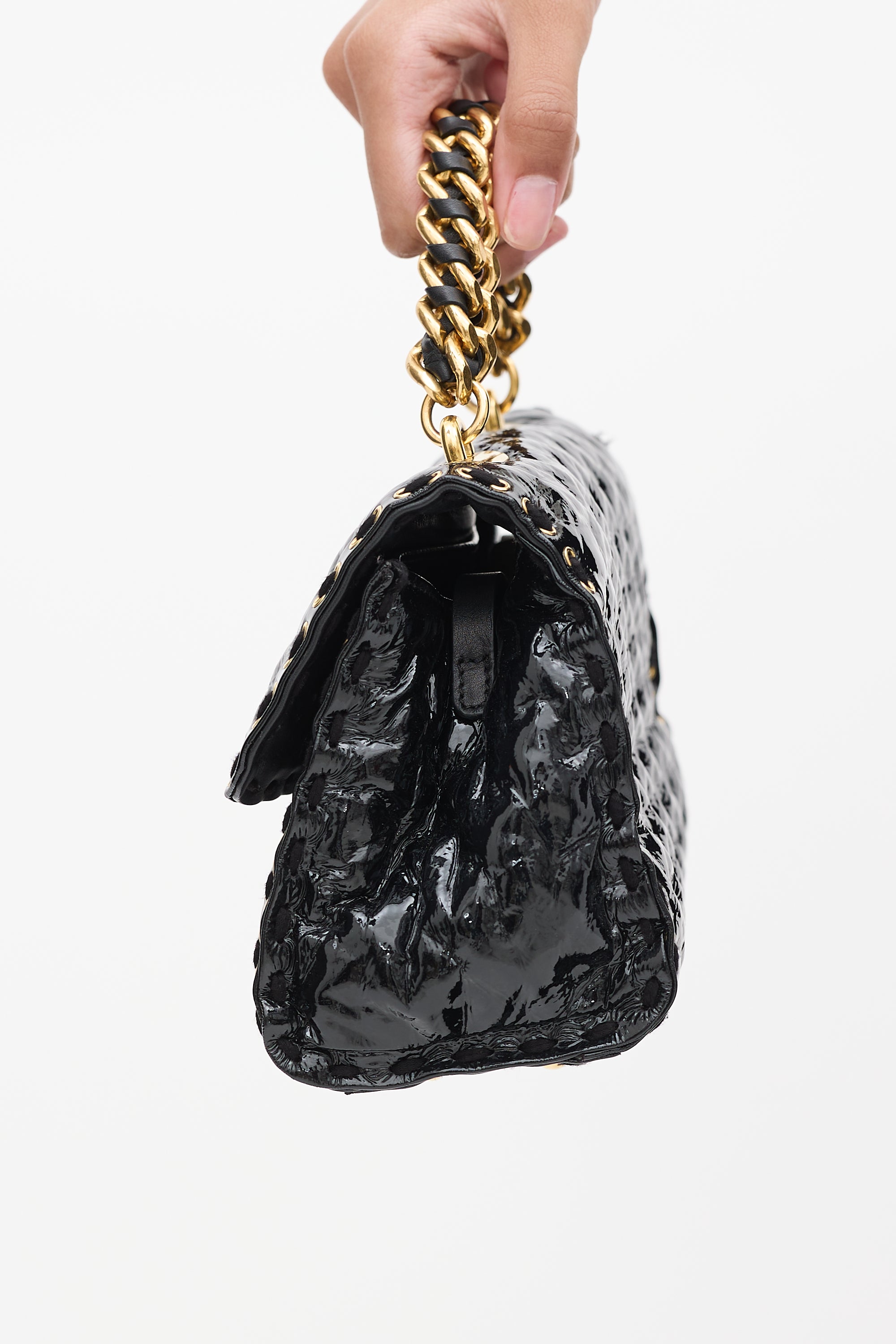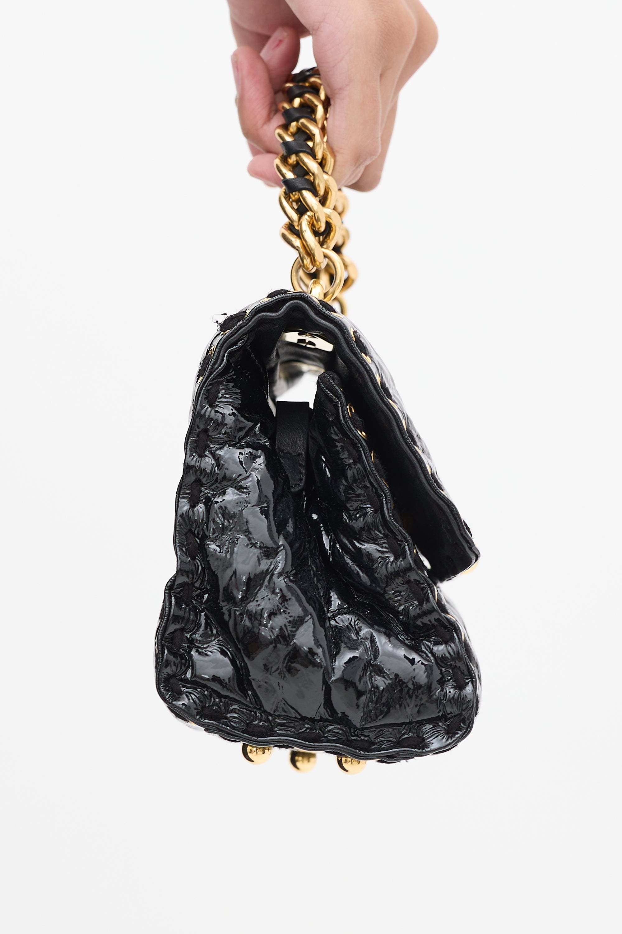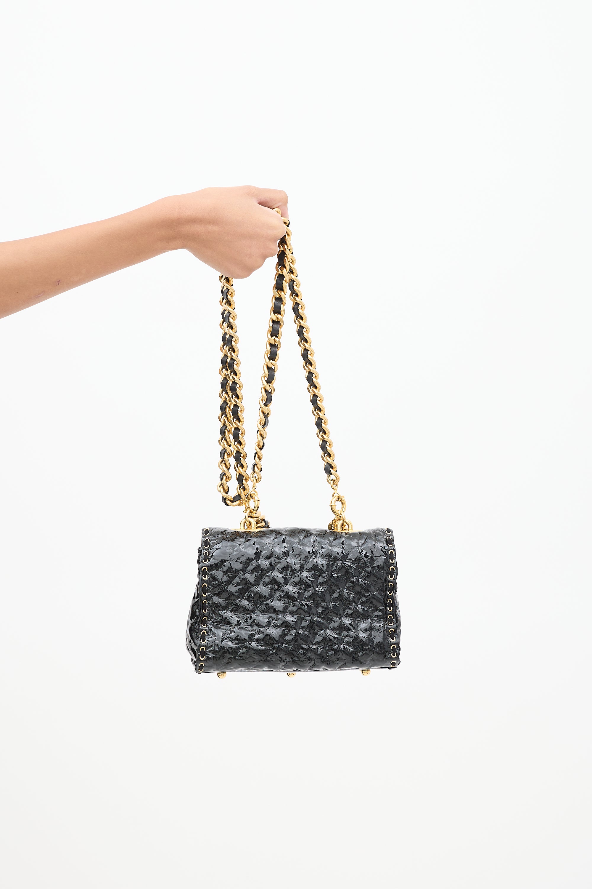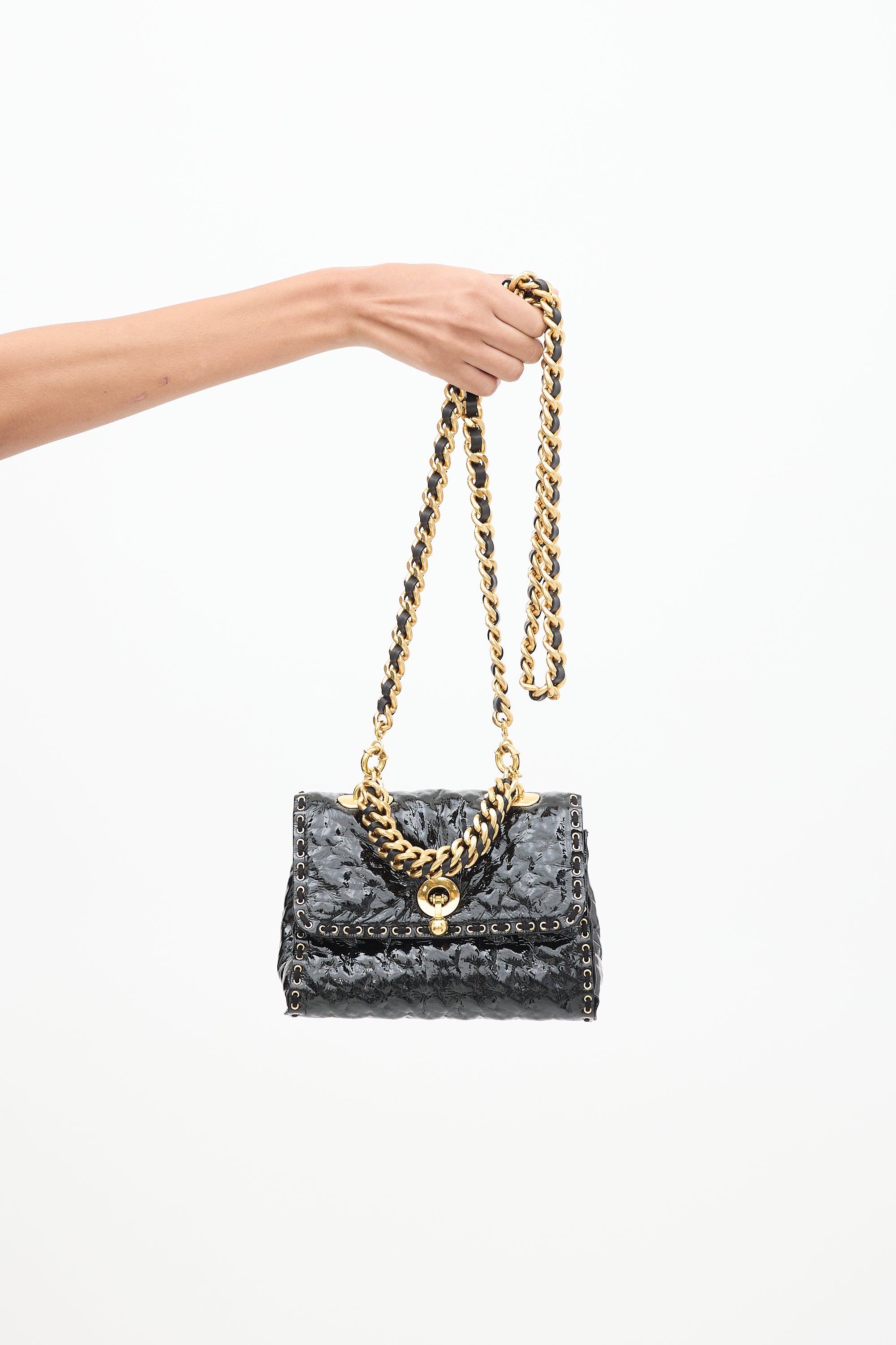 Pre-owned Ermanno Scervino black patent leather small Faubourg bag featuring tonal stitching, gold tone hardware, five protective feet at base, laced trim throughout body, braided leather and chain top handle and removable shoulder strap, front flap with hinged fastening, top buckled strap detail at interior, and one lined main compartment with one slip pocket. Comes with original dust bag.