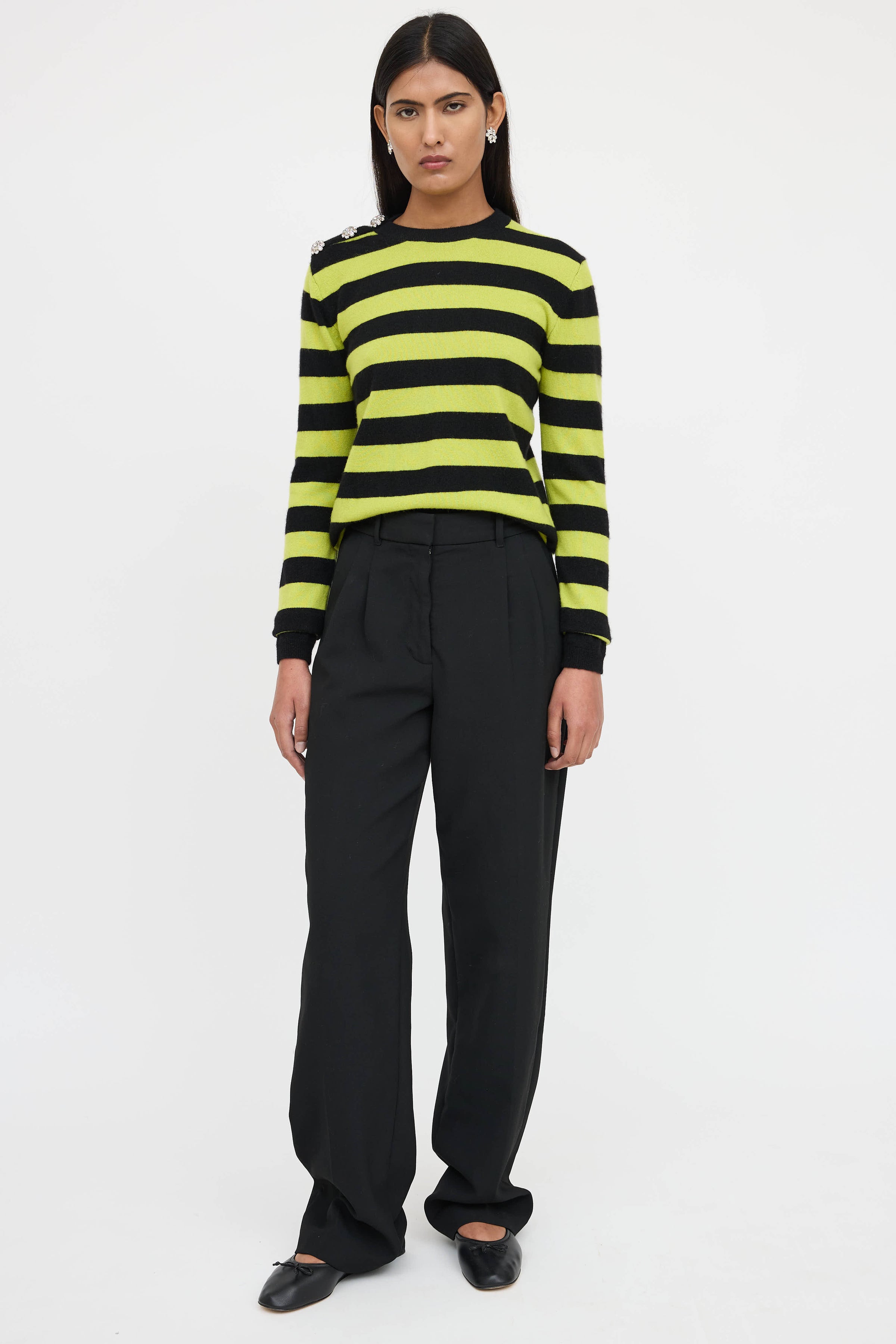 Pre-owned Ganni black cashmere knit sweater featuring a green striped pattern throughout, crew neckline, long sleeves, snap button detailing at shoulder with jewel embellishment, and ribbed hem.
