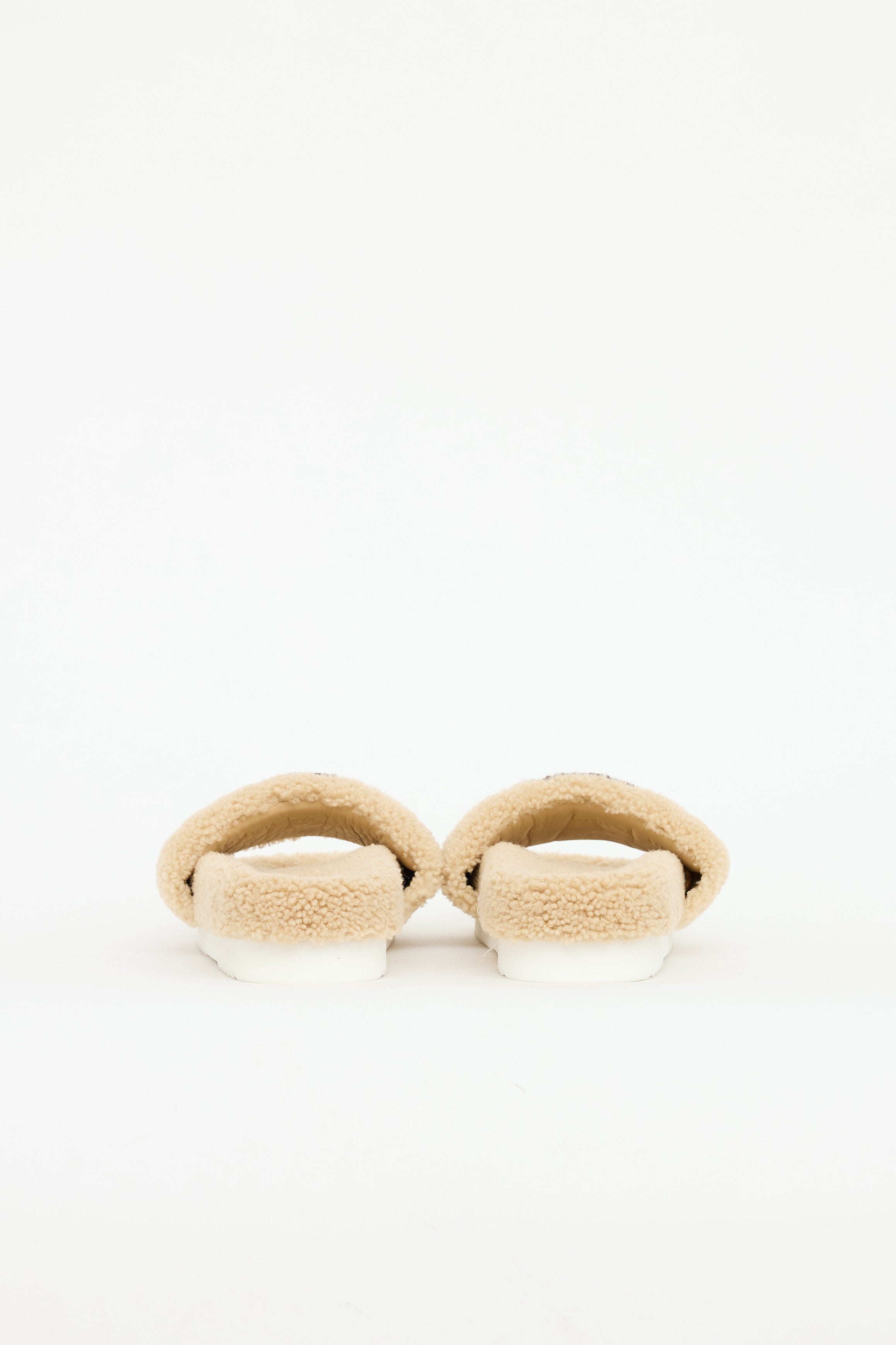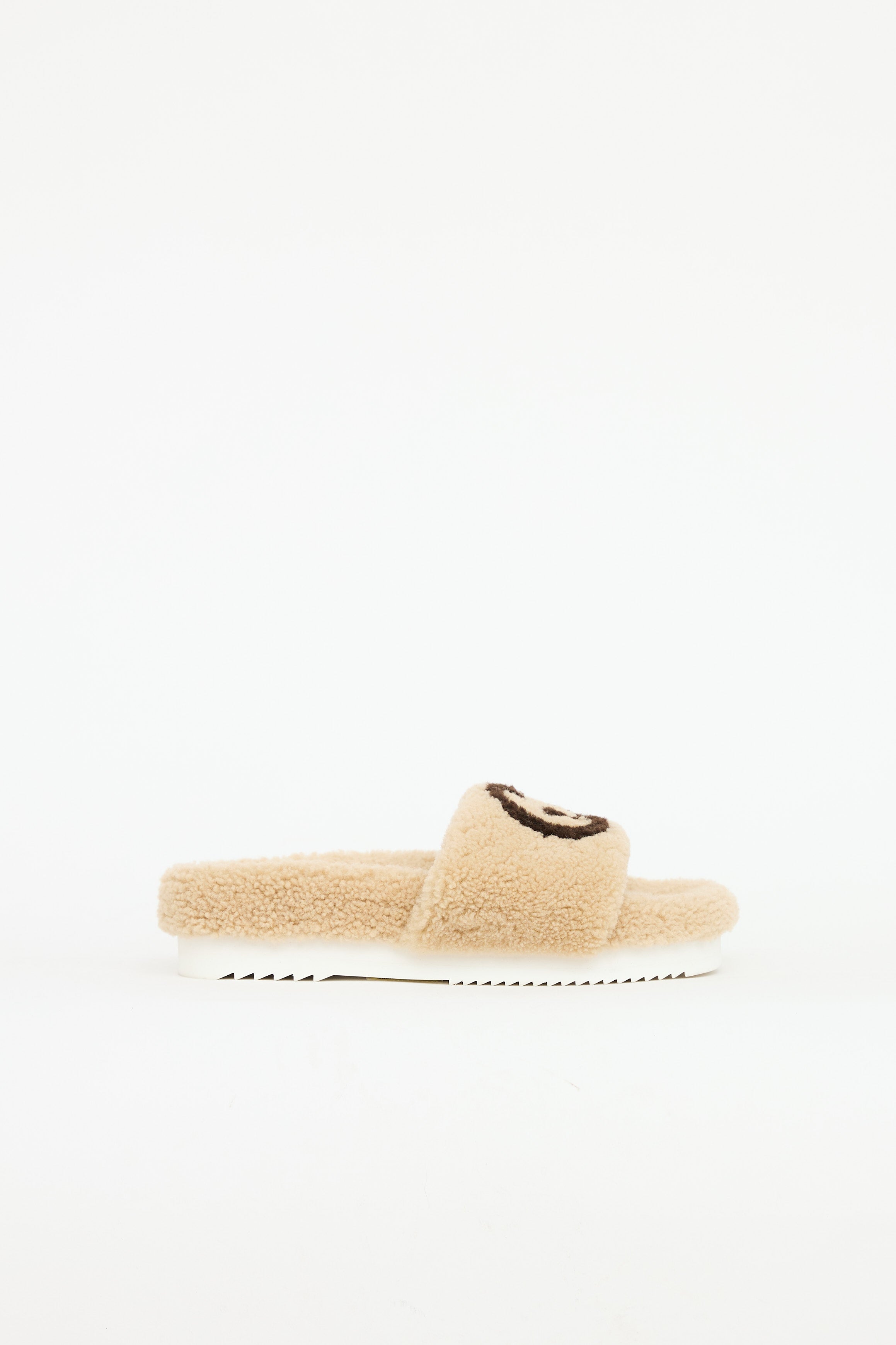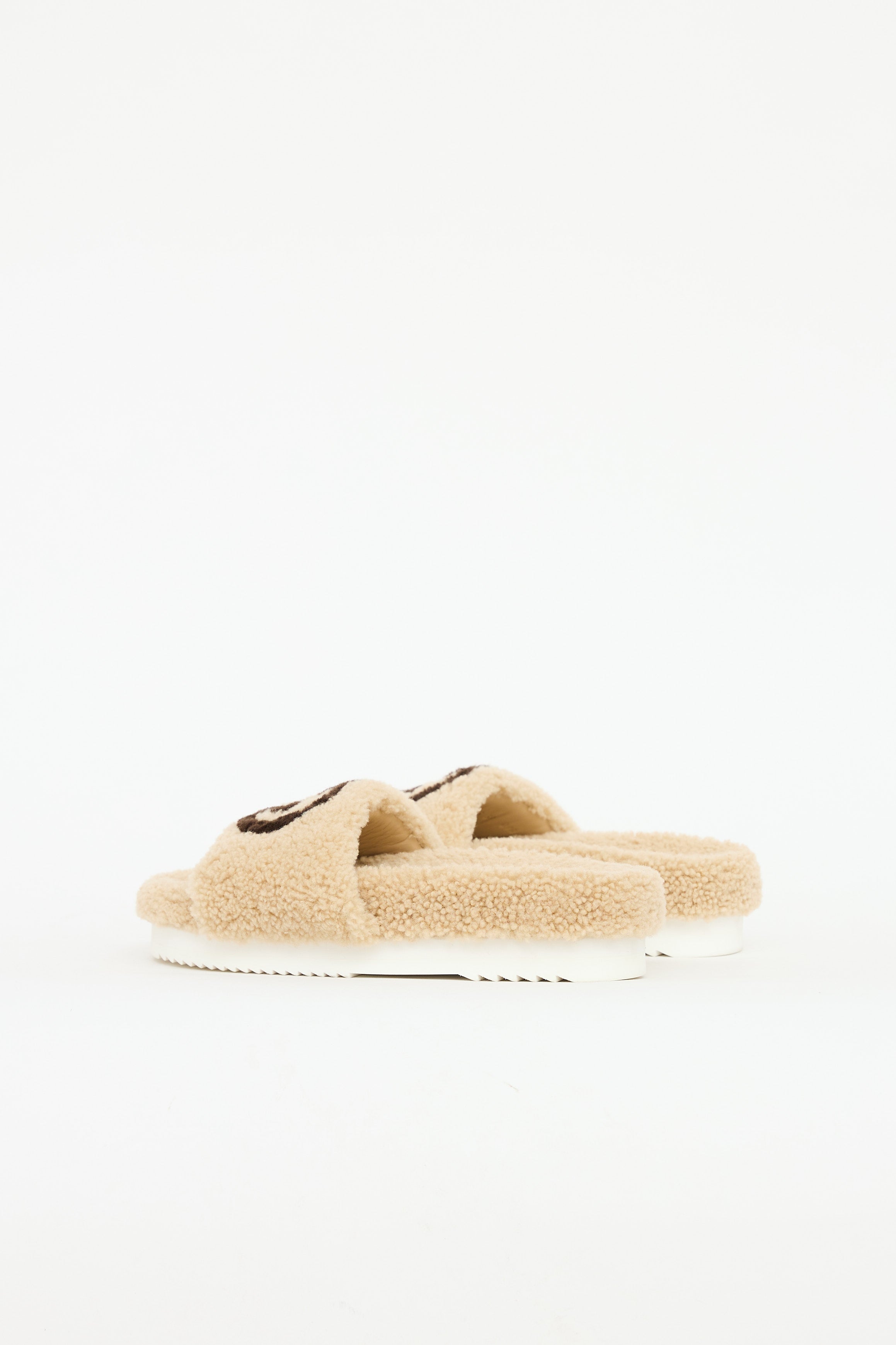 Pre-owned Gucci beige and brown shearling slides featuring tufted logo on strap, round open toe and white rubber sole.