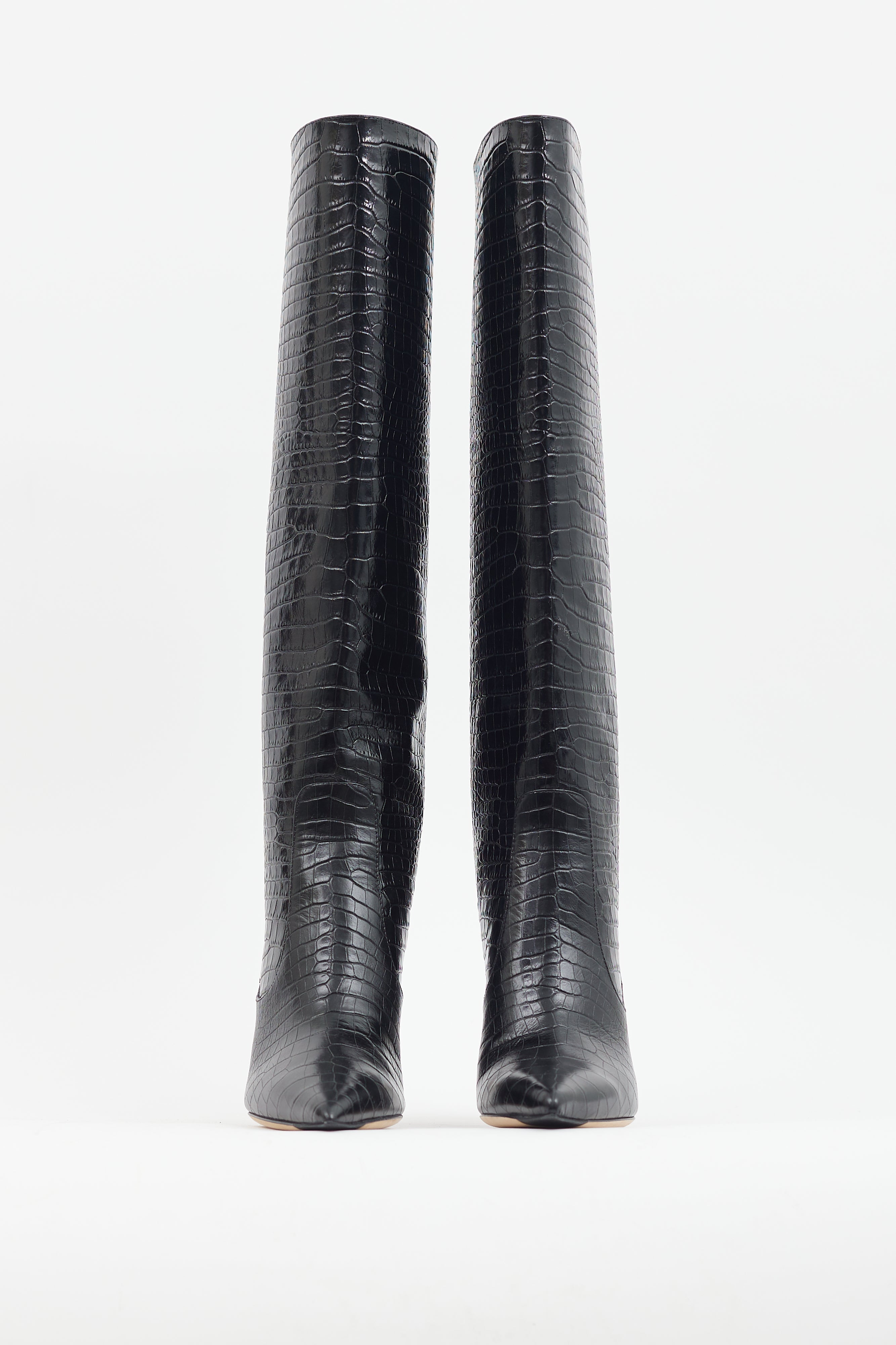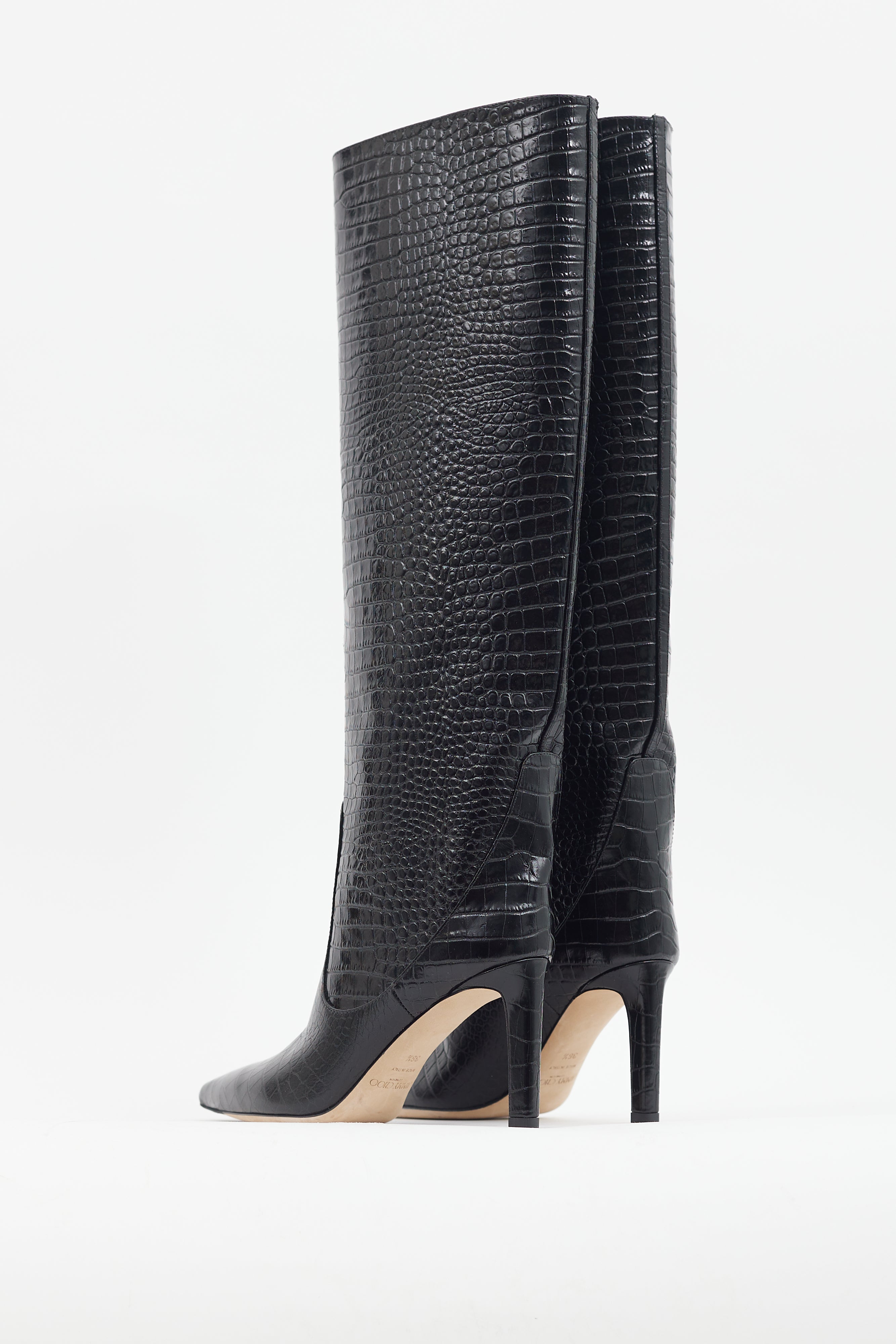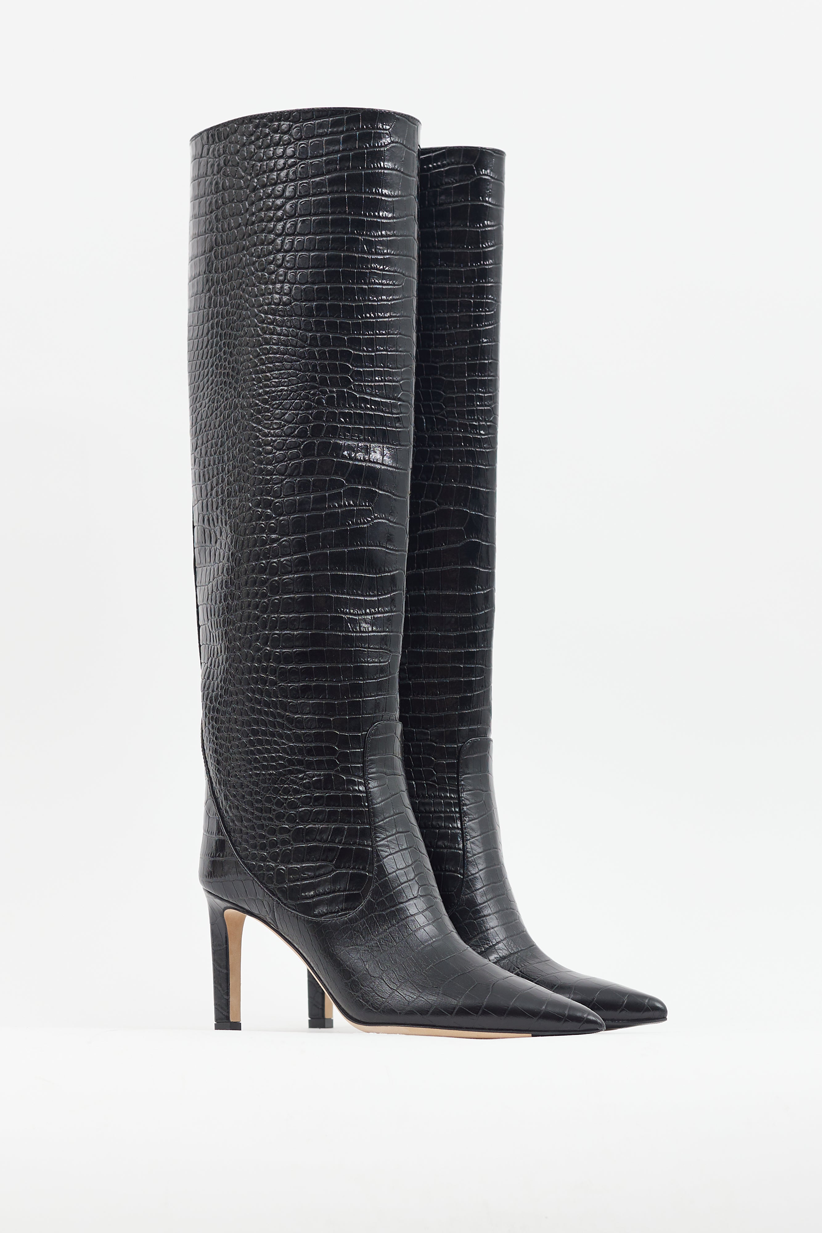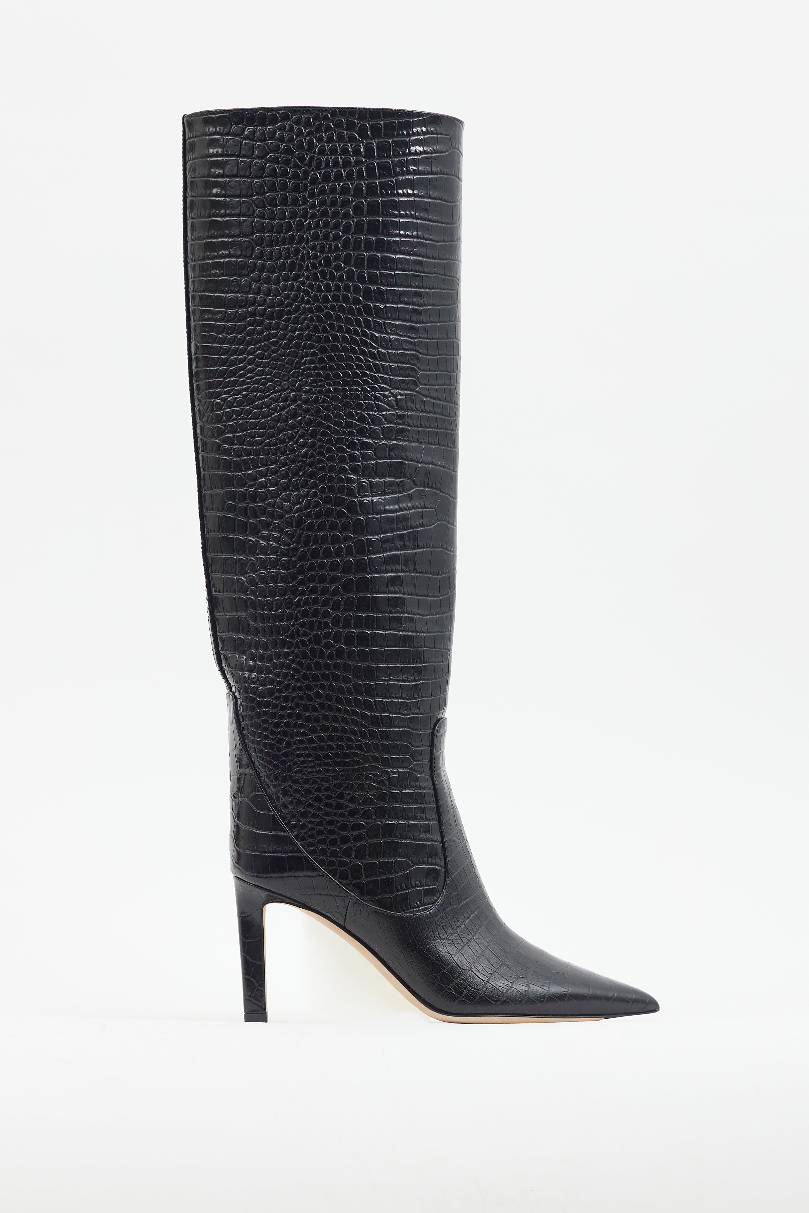Pre-owned Jimmy Choo Mavis 100 knee high boots in black embossed leather featuring a pointed toe, notched topline, stiletto heel, and slip on entry.