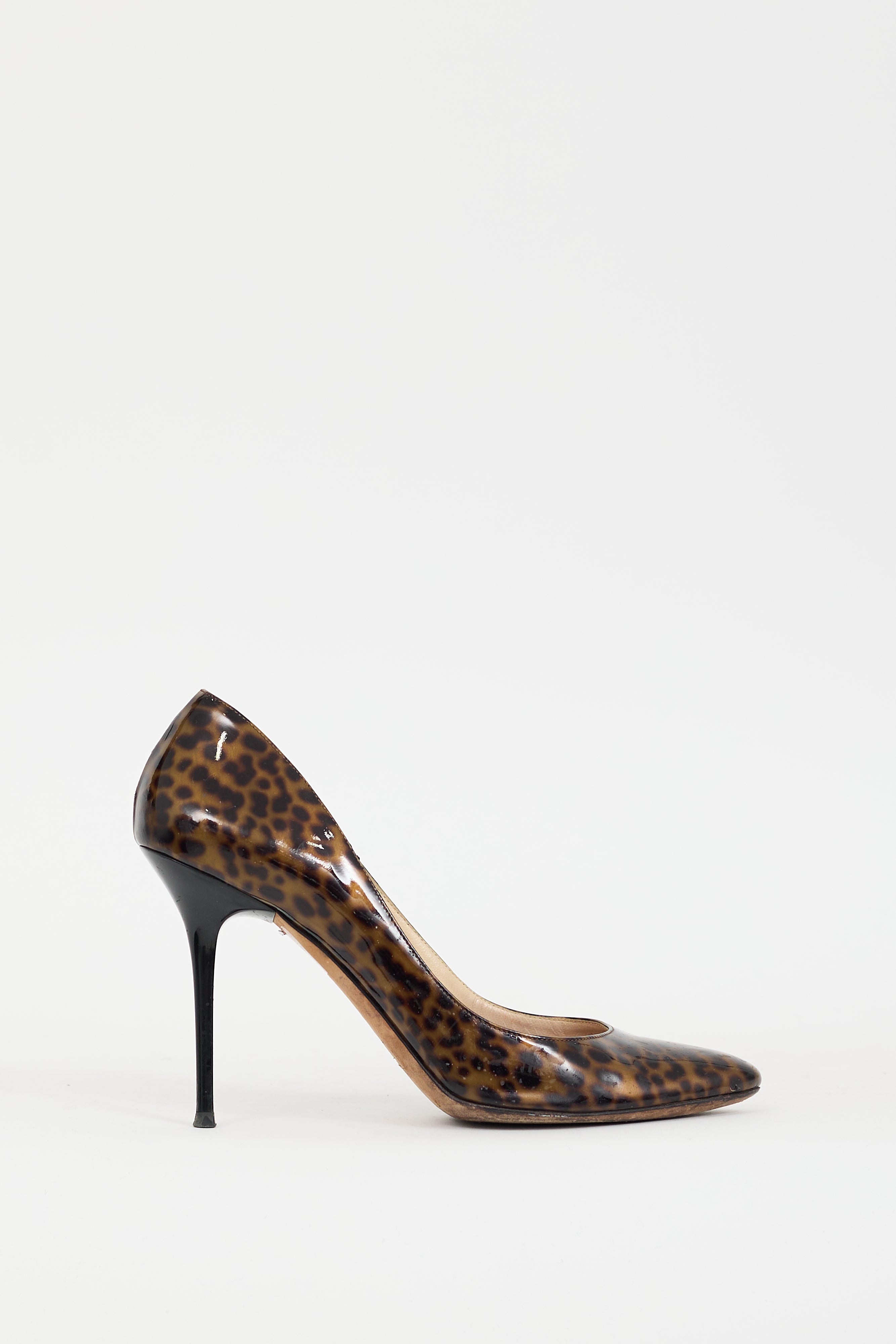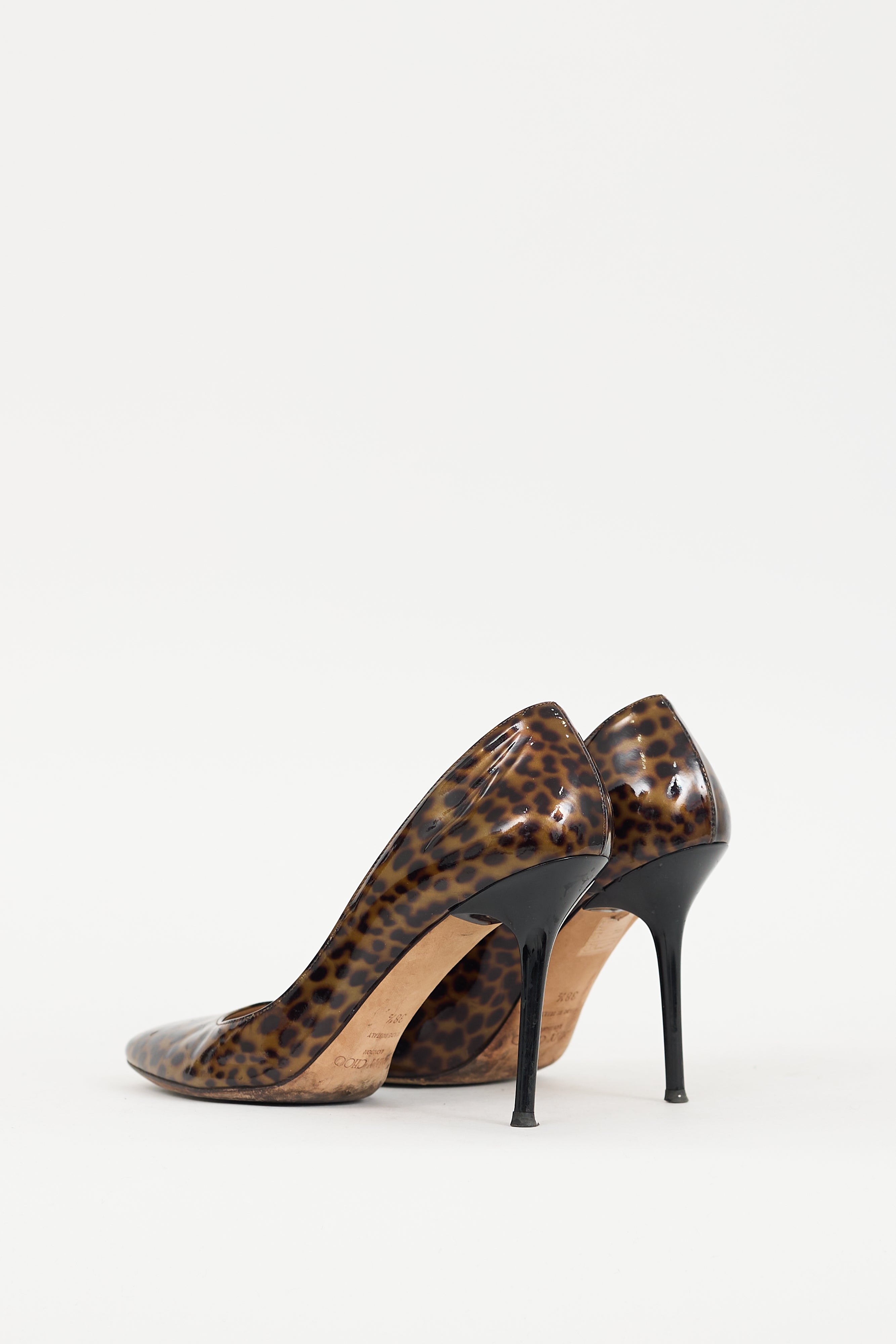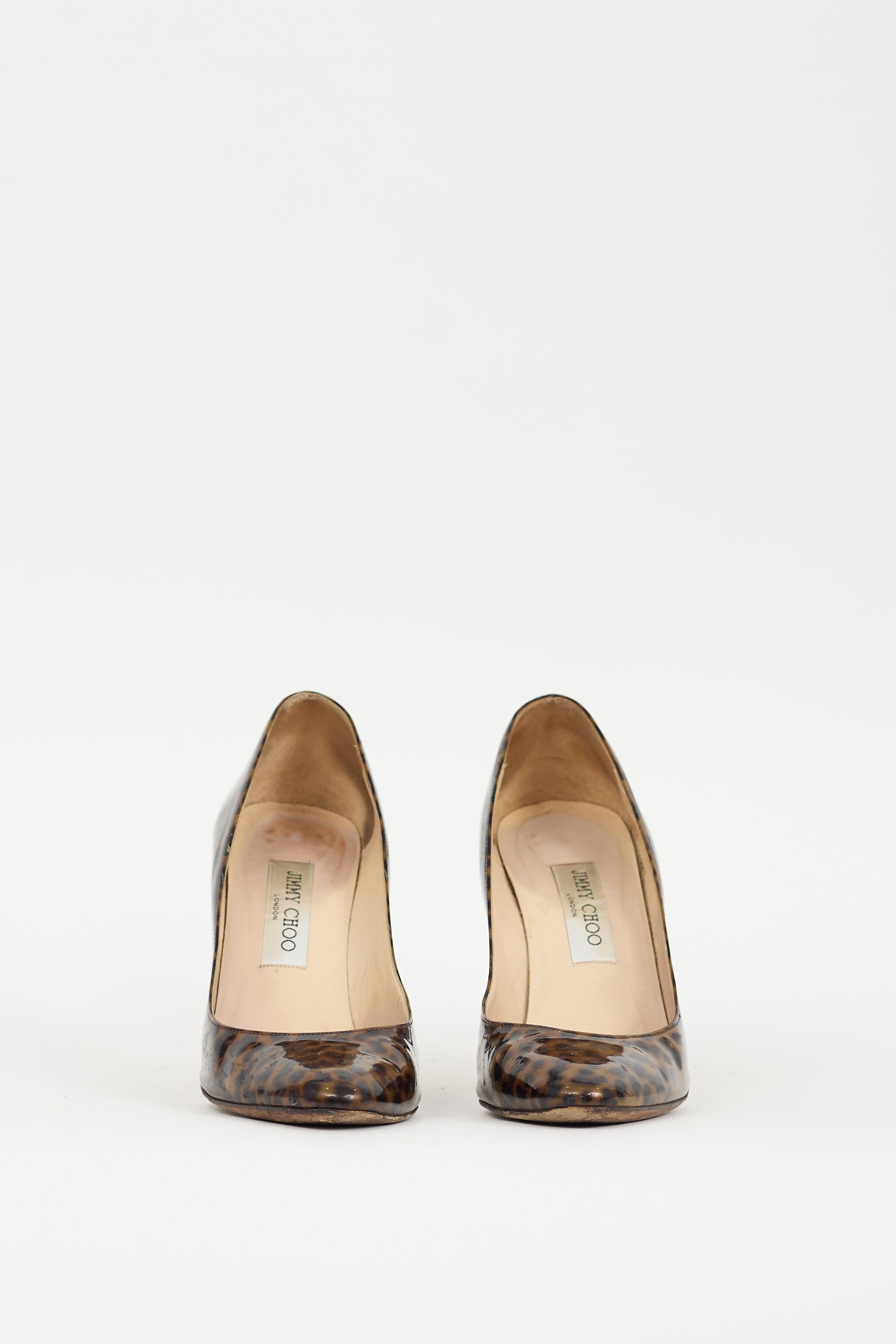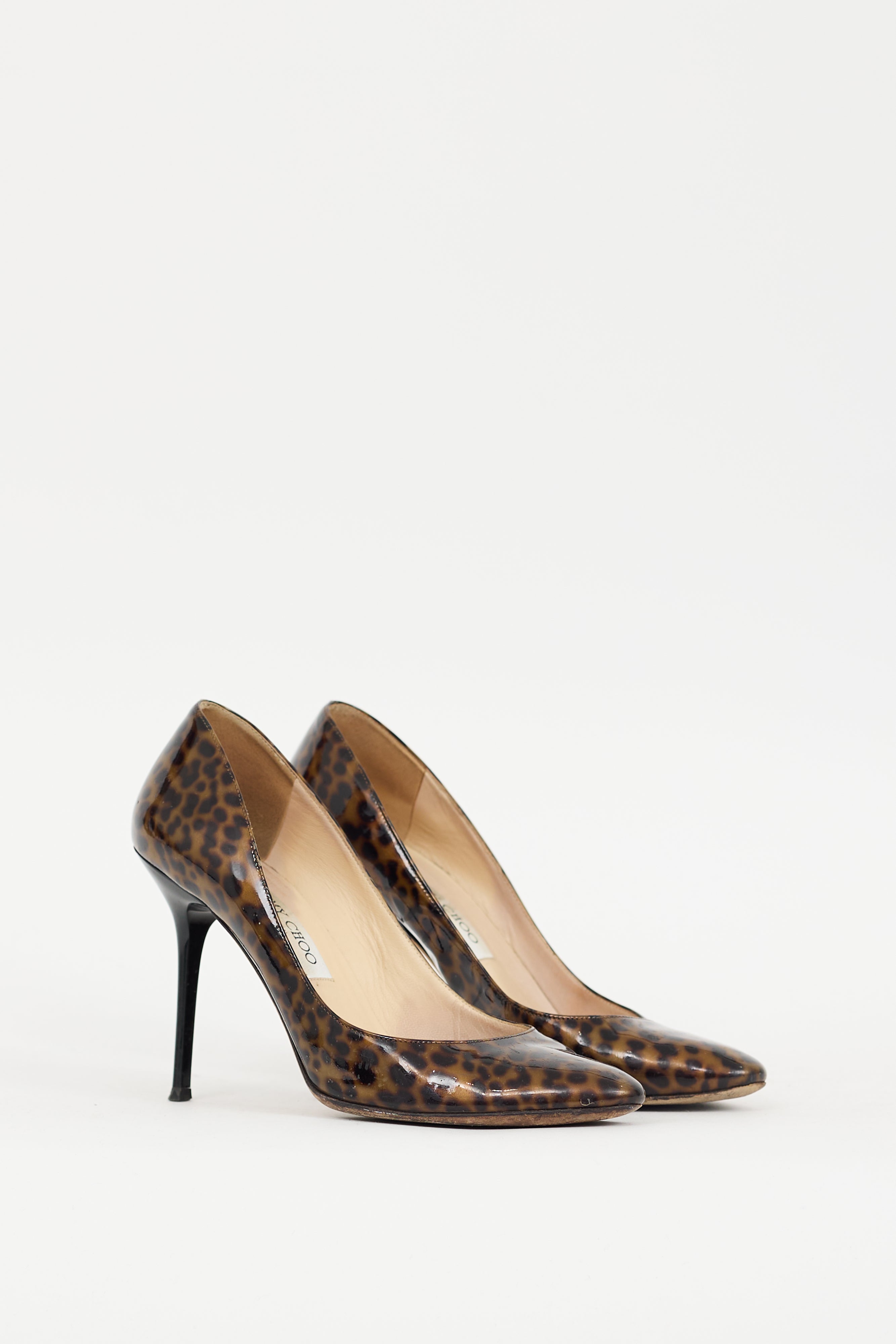 Pre-owned Jimmy Choo brown and black patent leather sparkly Gilbert heels featuring pointed toe, cheetah print throughout, and covered stiletto heel.