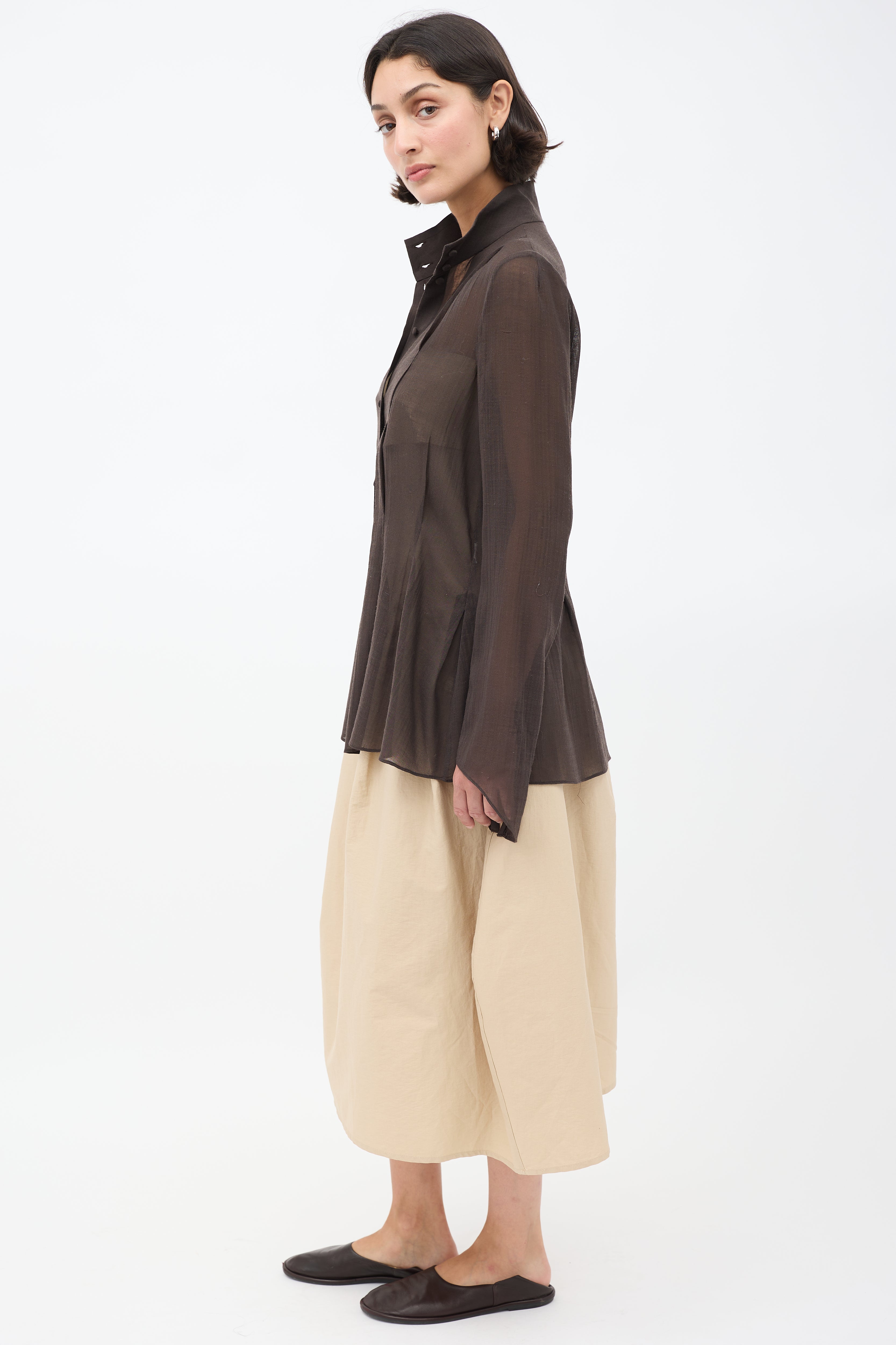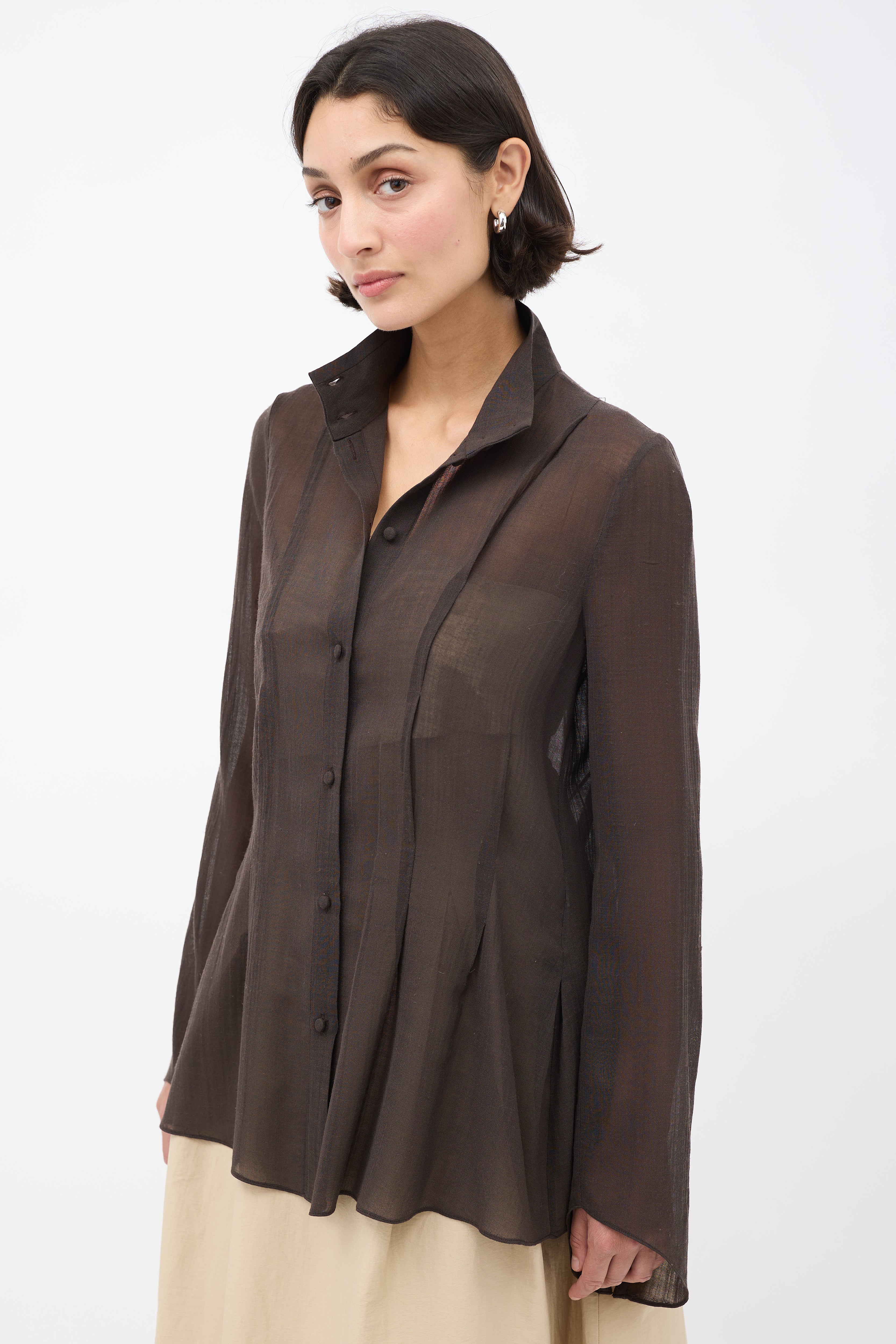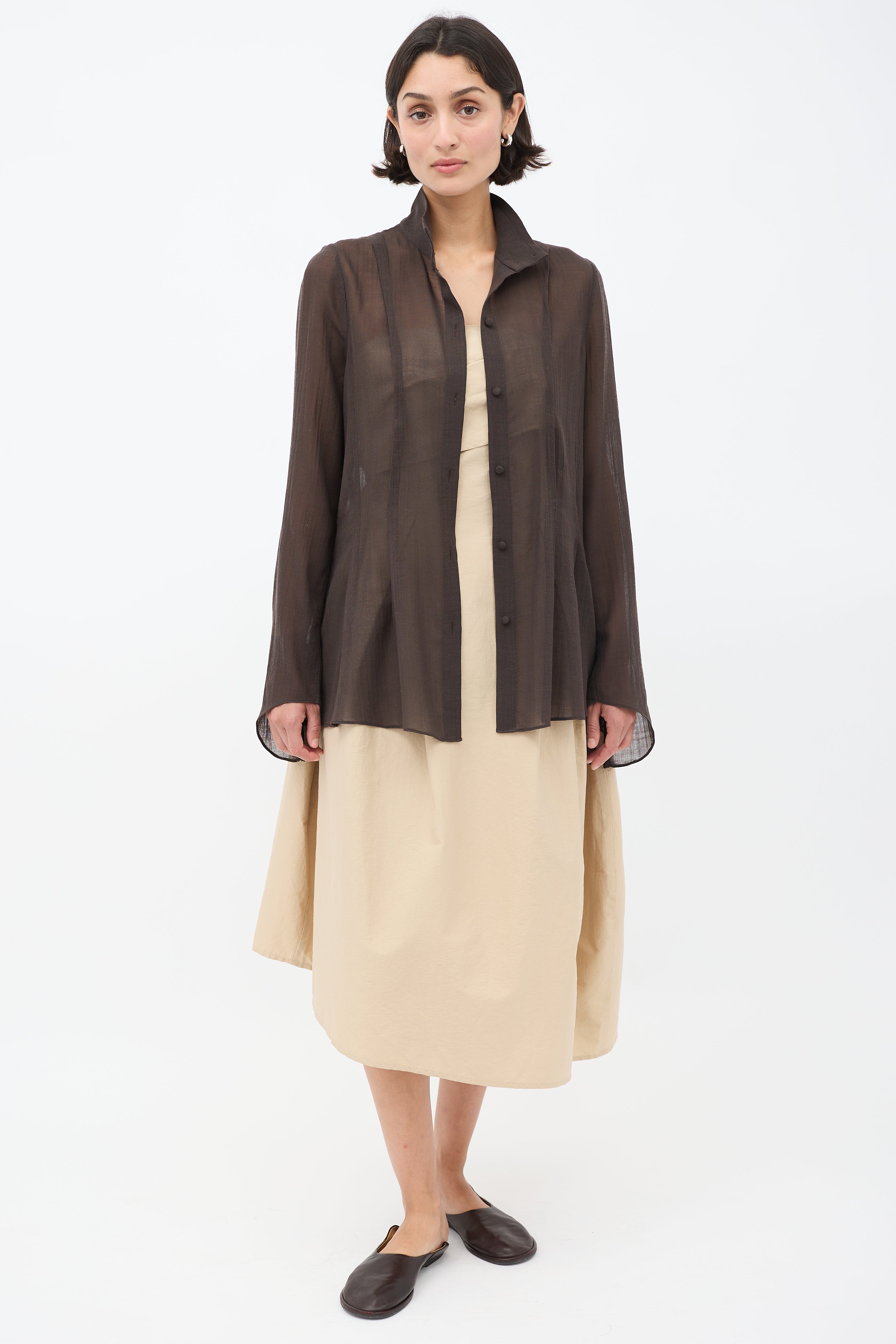 Pre-owned Khaite brown linen shirt featuring a stand collar, button up front, tucks at front shoulder and waist, and long sleeves with buttoned asymmetrical cuffs.