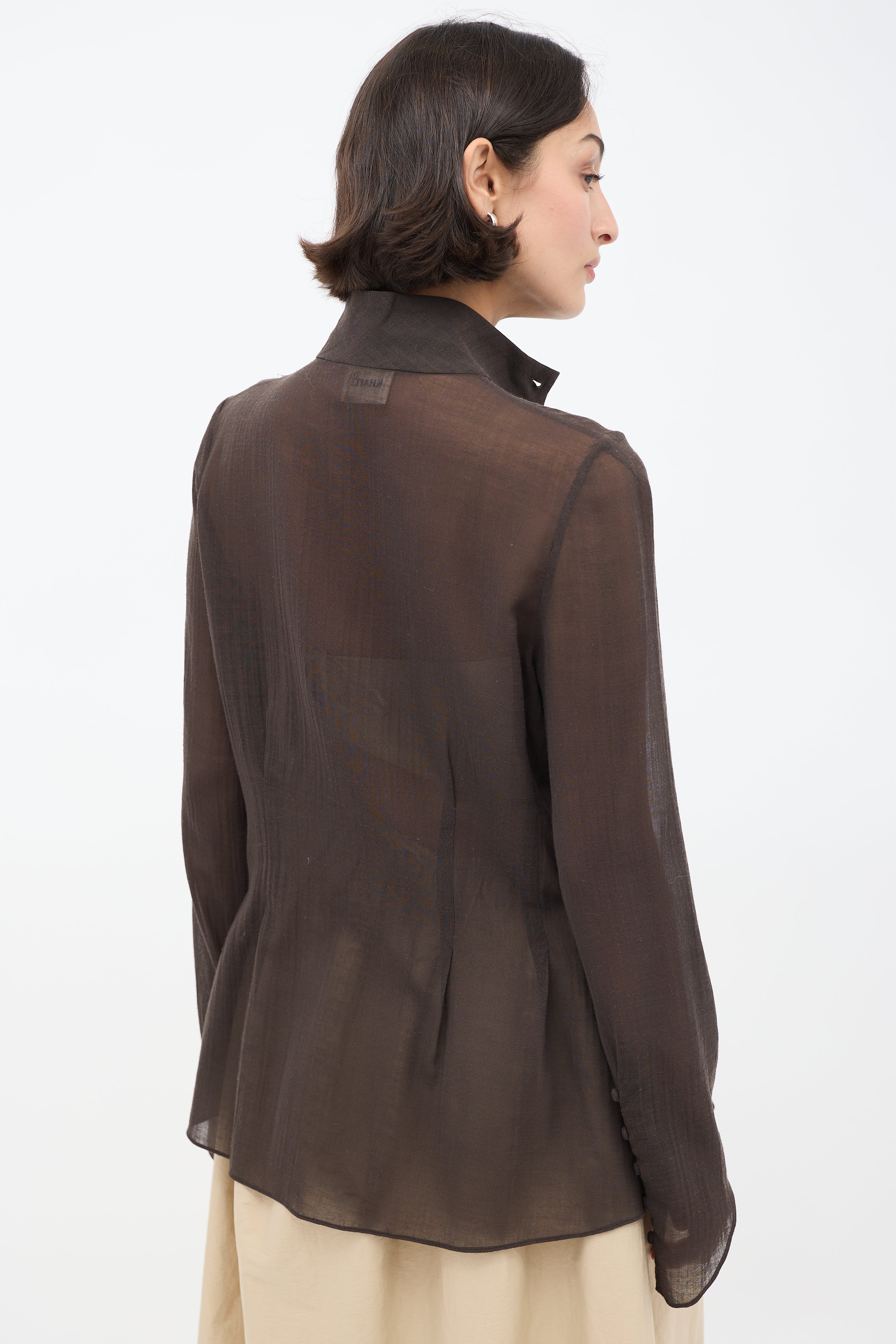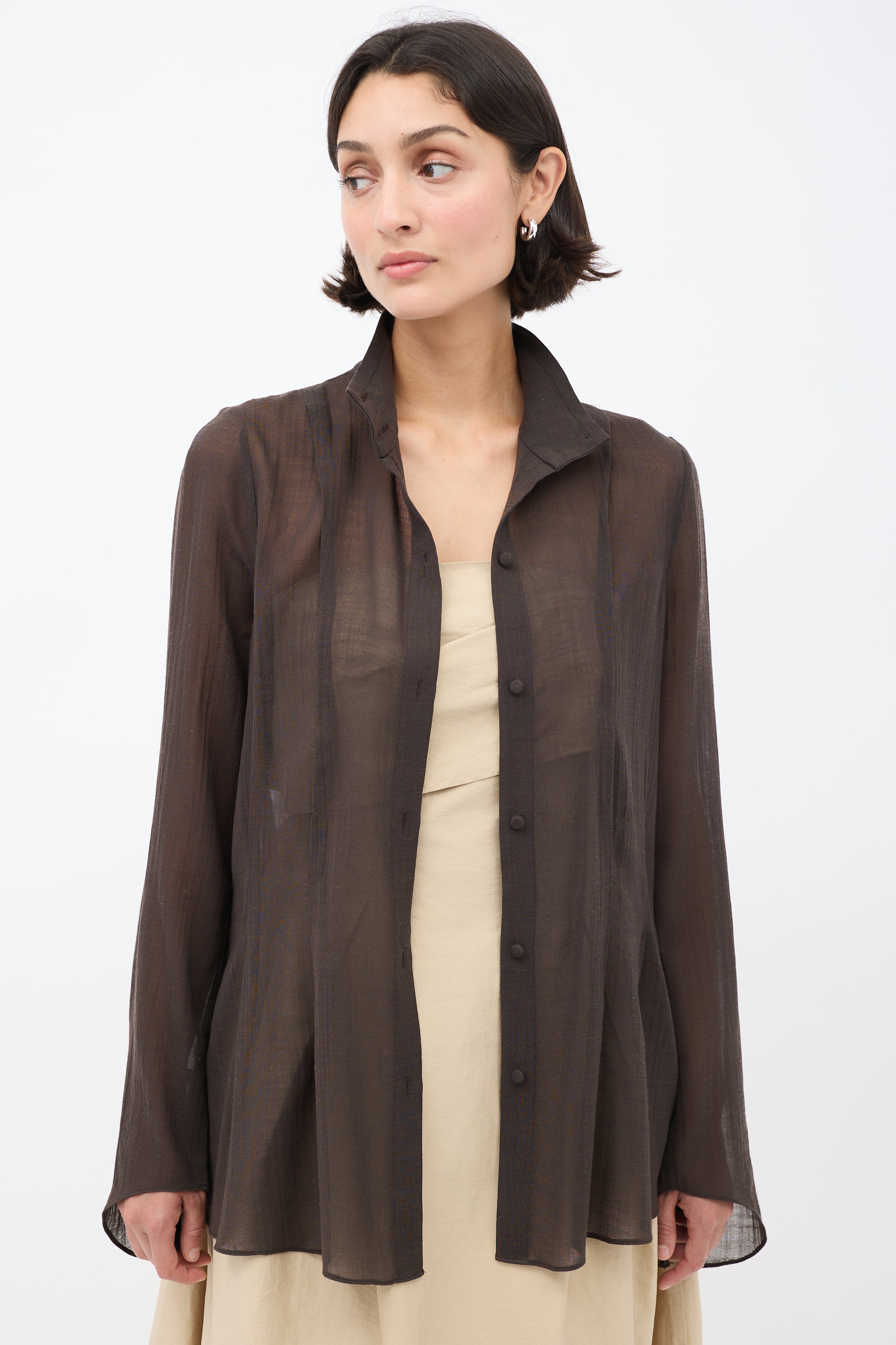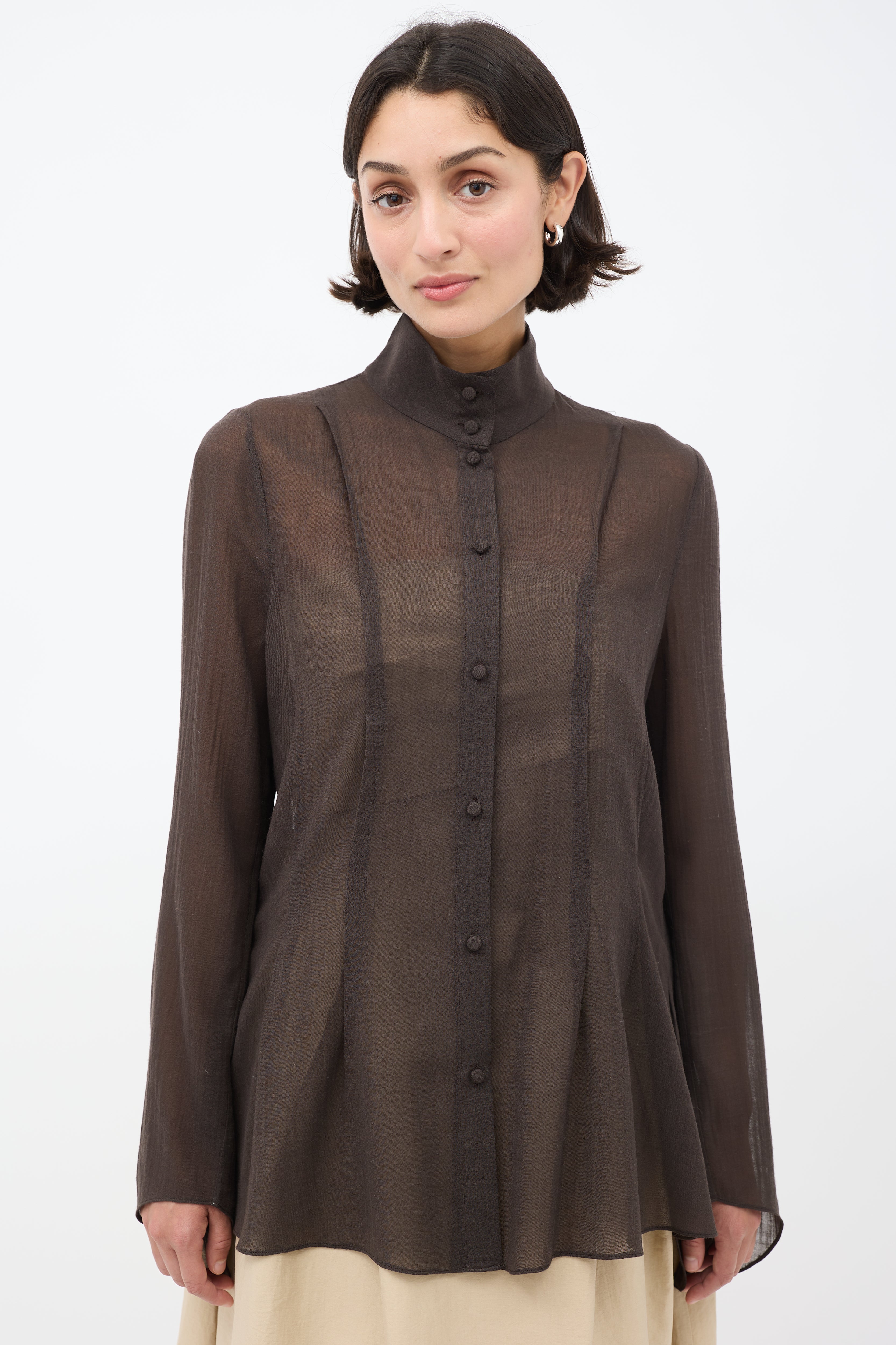 Pre-owned Khaite brown linen shirt featuring a stand collar, button up front, tucks at front shoulder and waist, and long sleeves with buttoned asymmetrical cuffs.