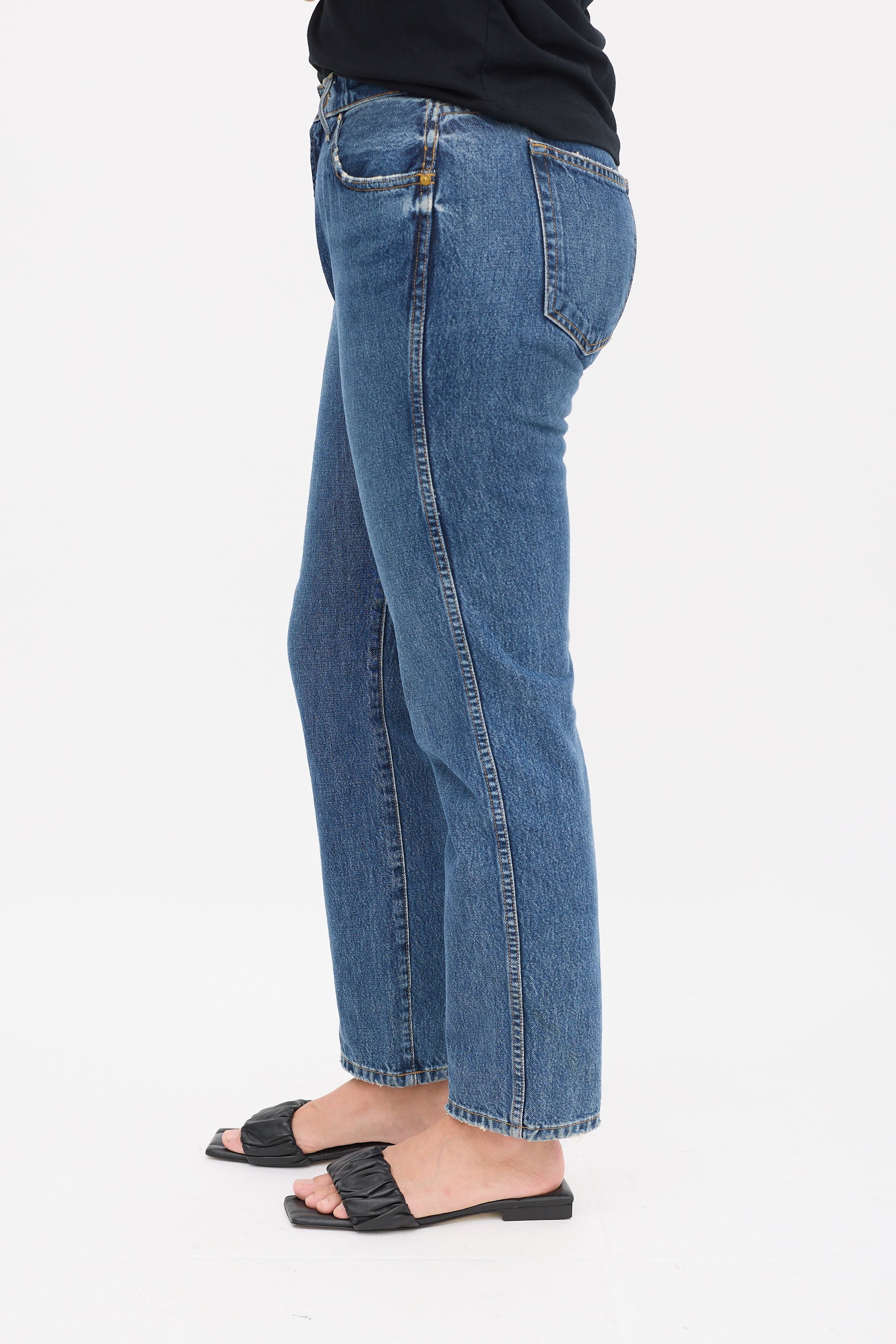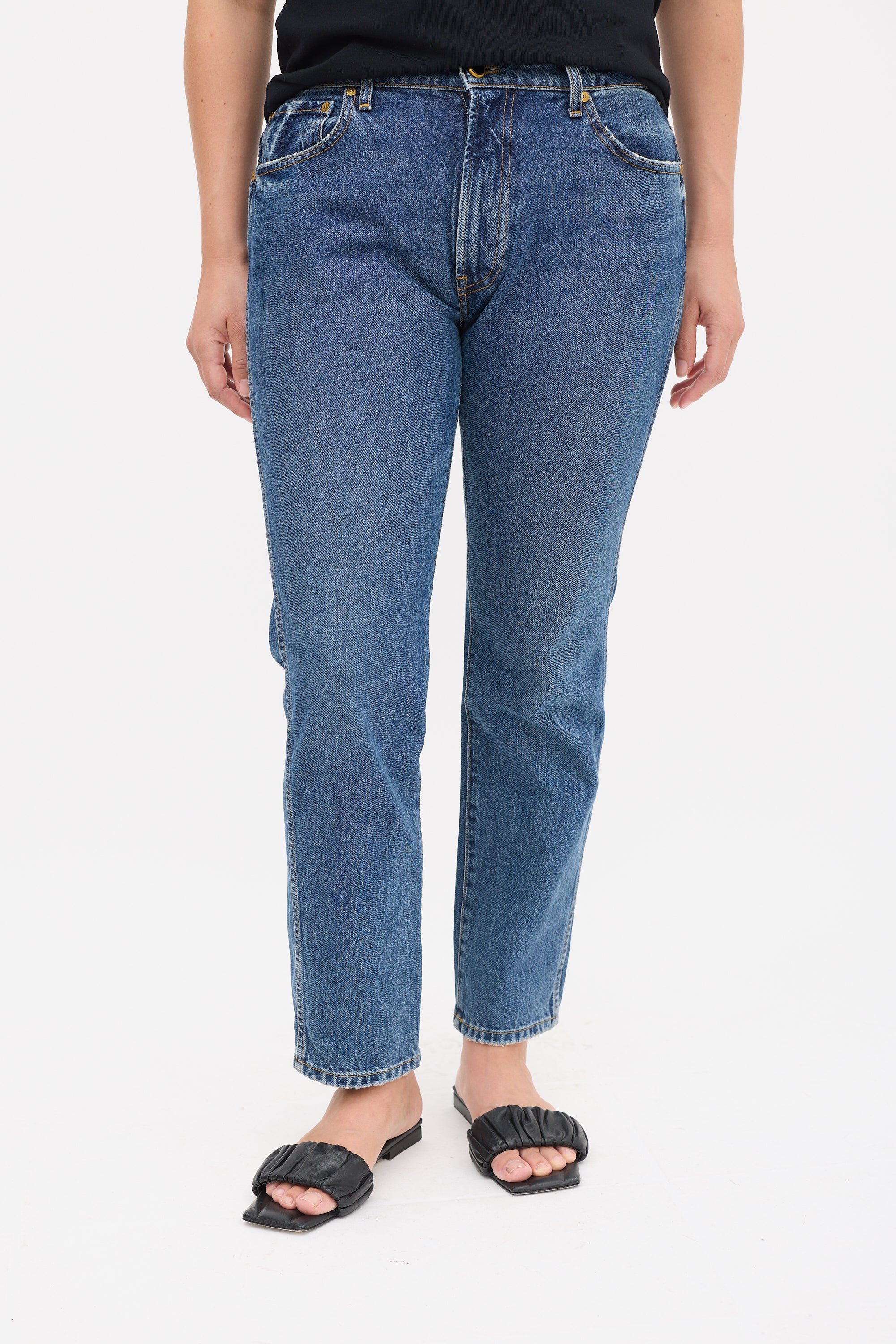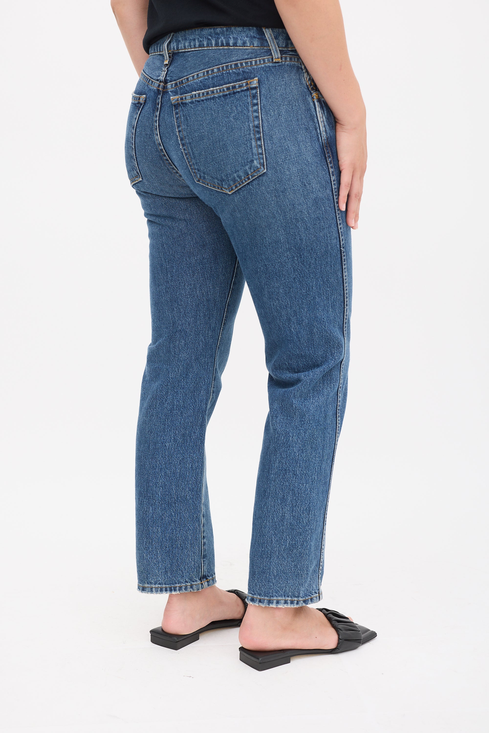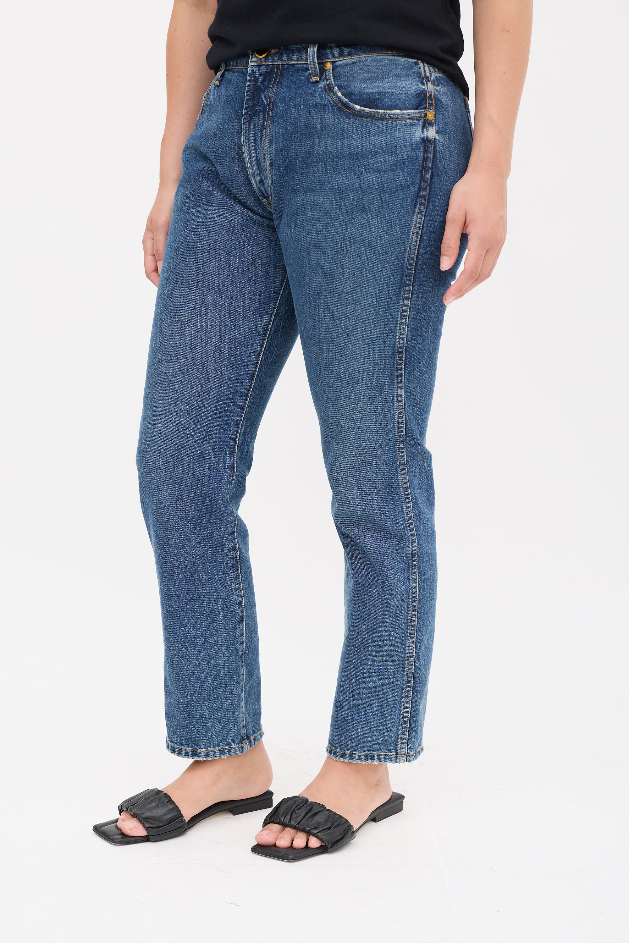 Pre-owned Khaite dark wash Kyle jeans featuring brown contrast stitching, gold tone hardware, five pocket styling, tapered leg, light intentional distressing throughout, and zip fly.