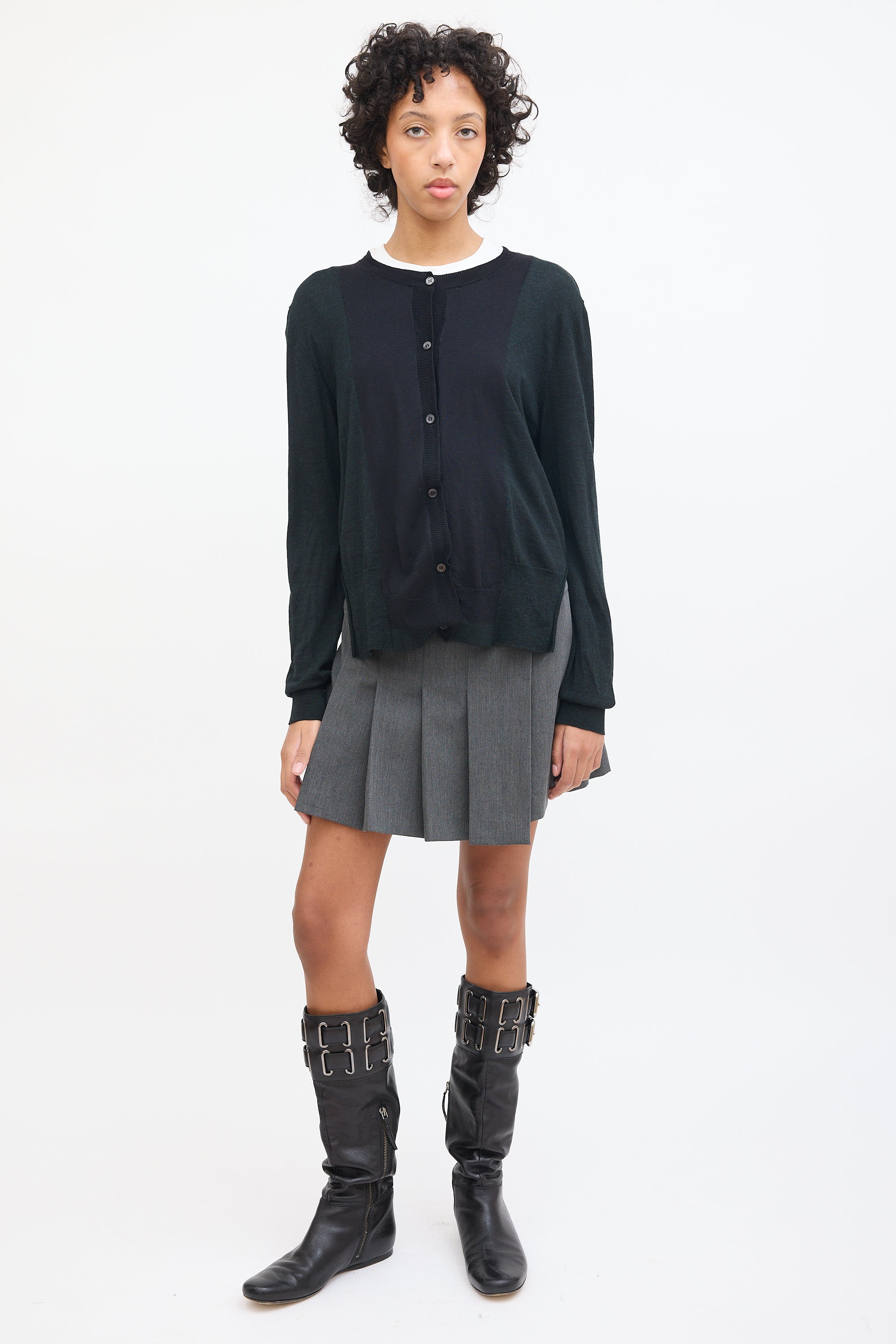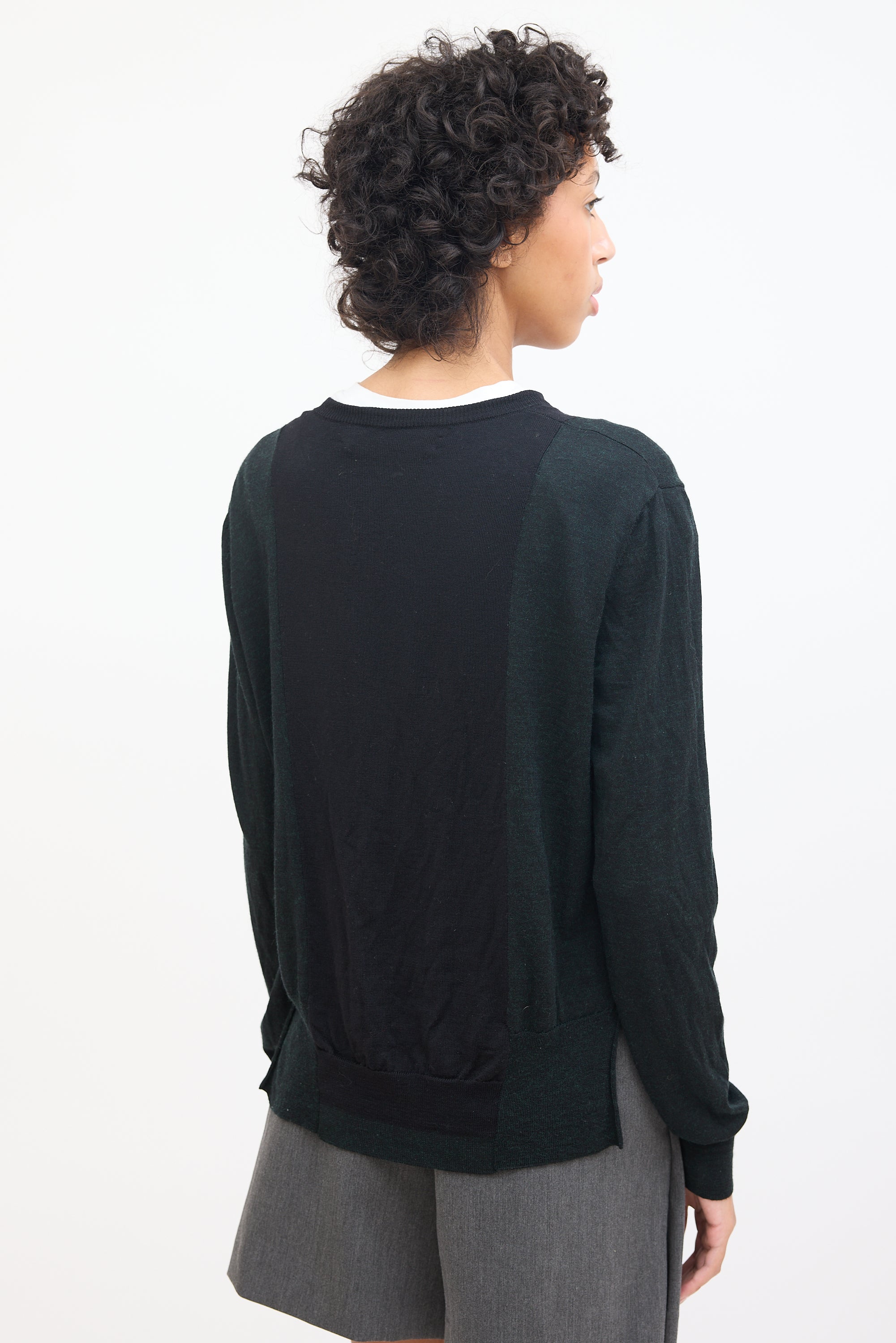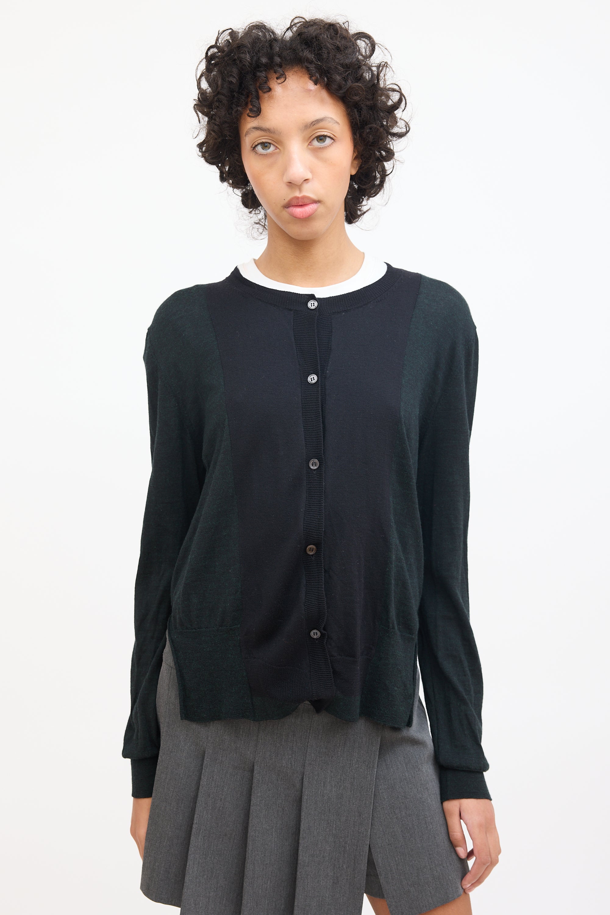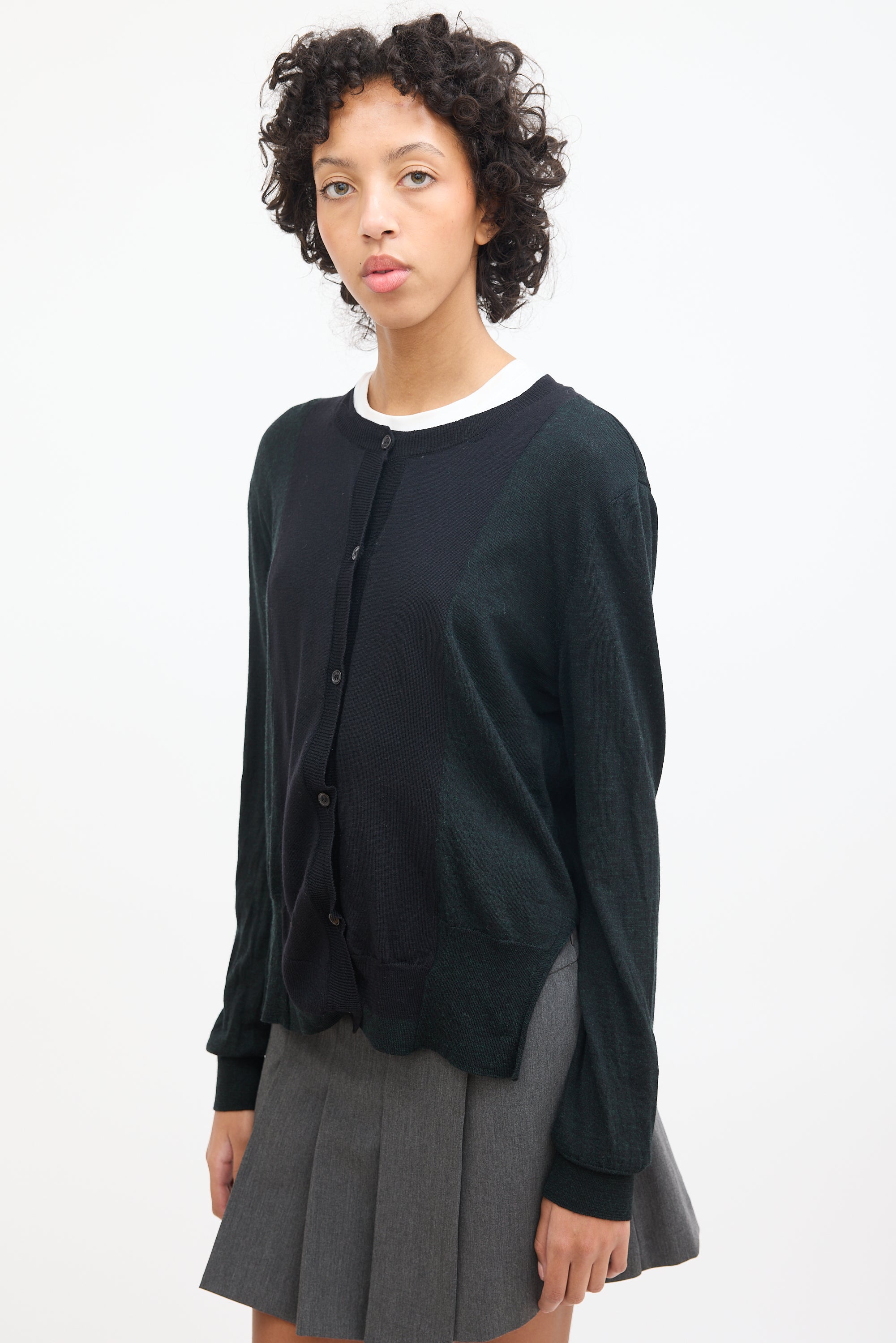 Pre-owned Marni dark green and black wool and silk blend cardigan featuring a round neckline, button up front closure, panelled construction, side vents, long sleeves, and ribbed neck, placket, hem, and cuffs.