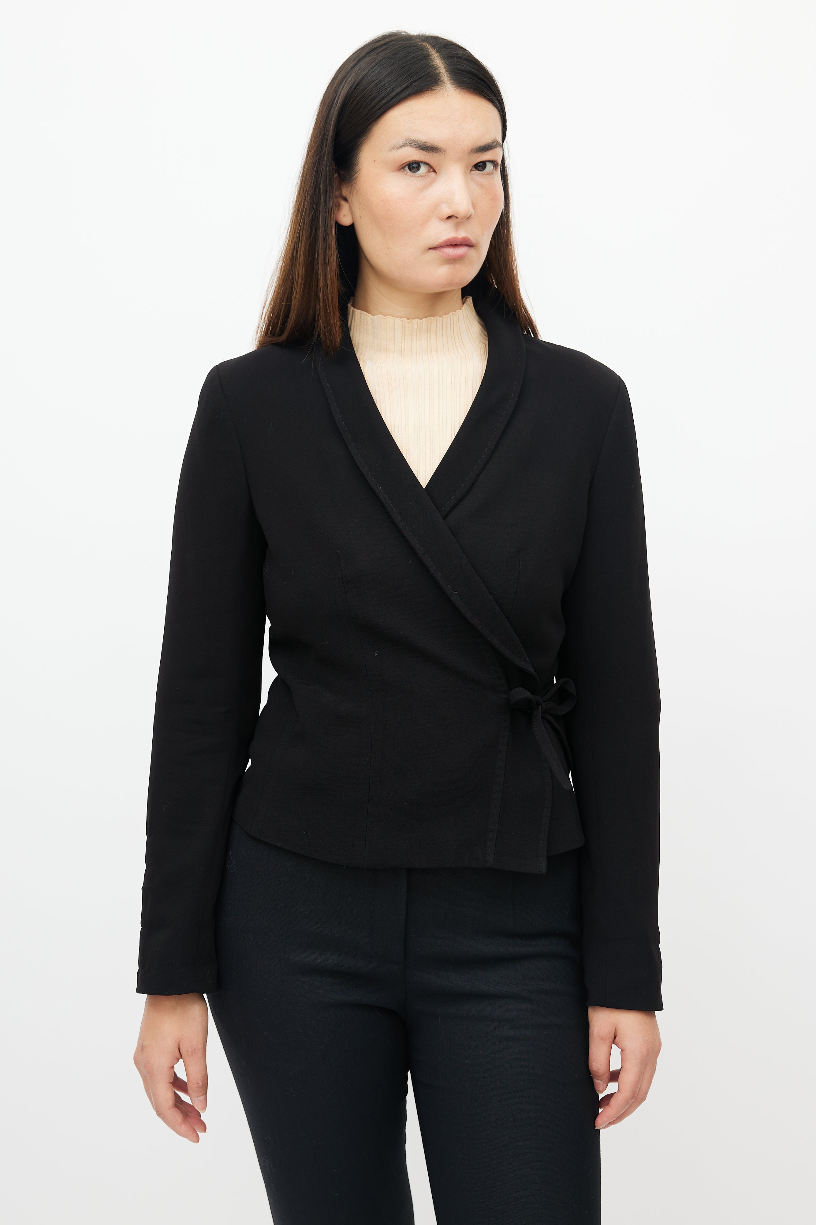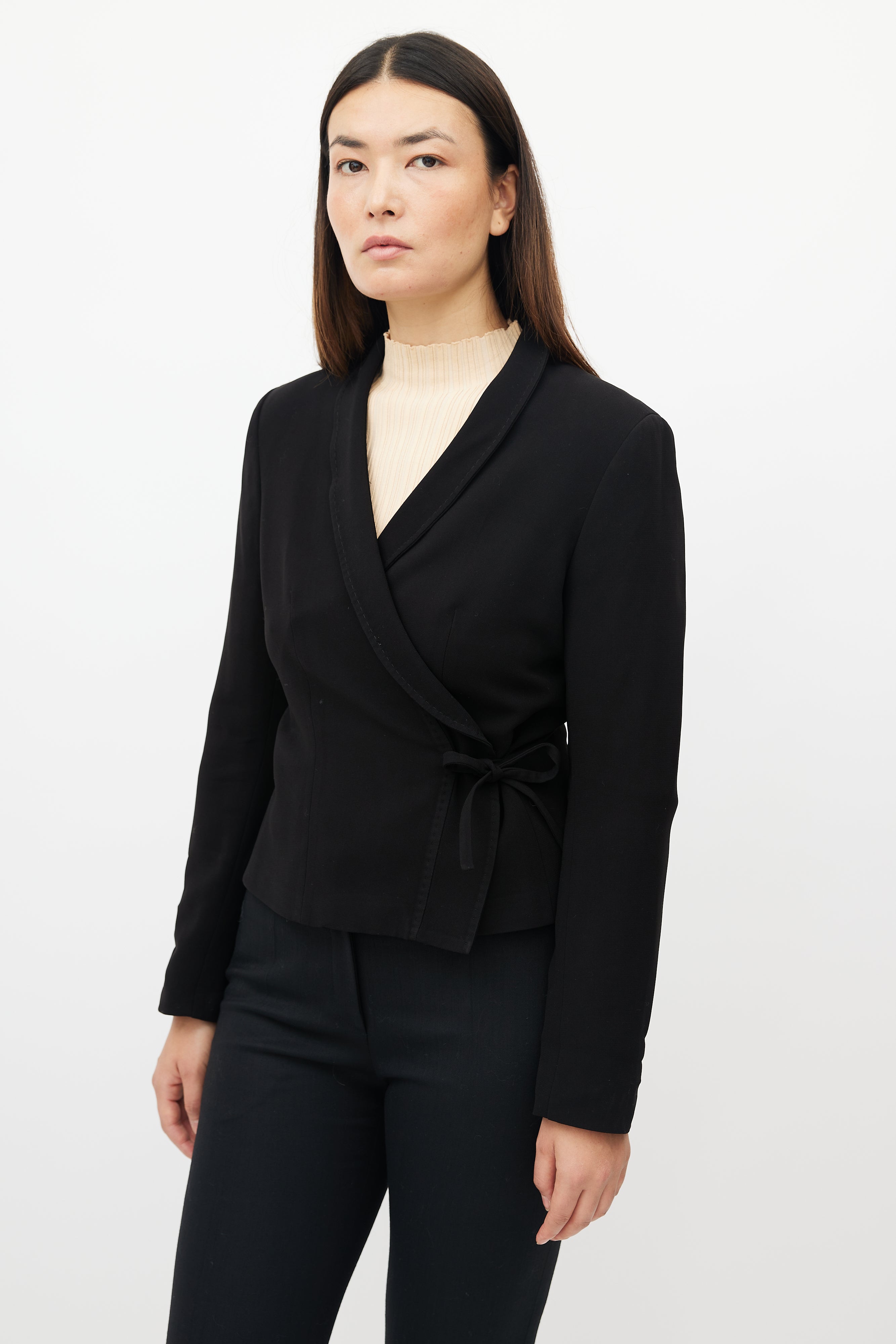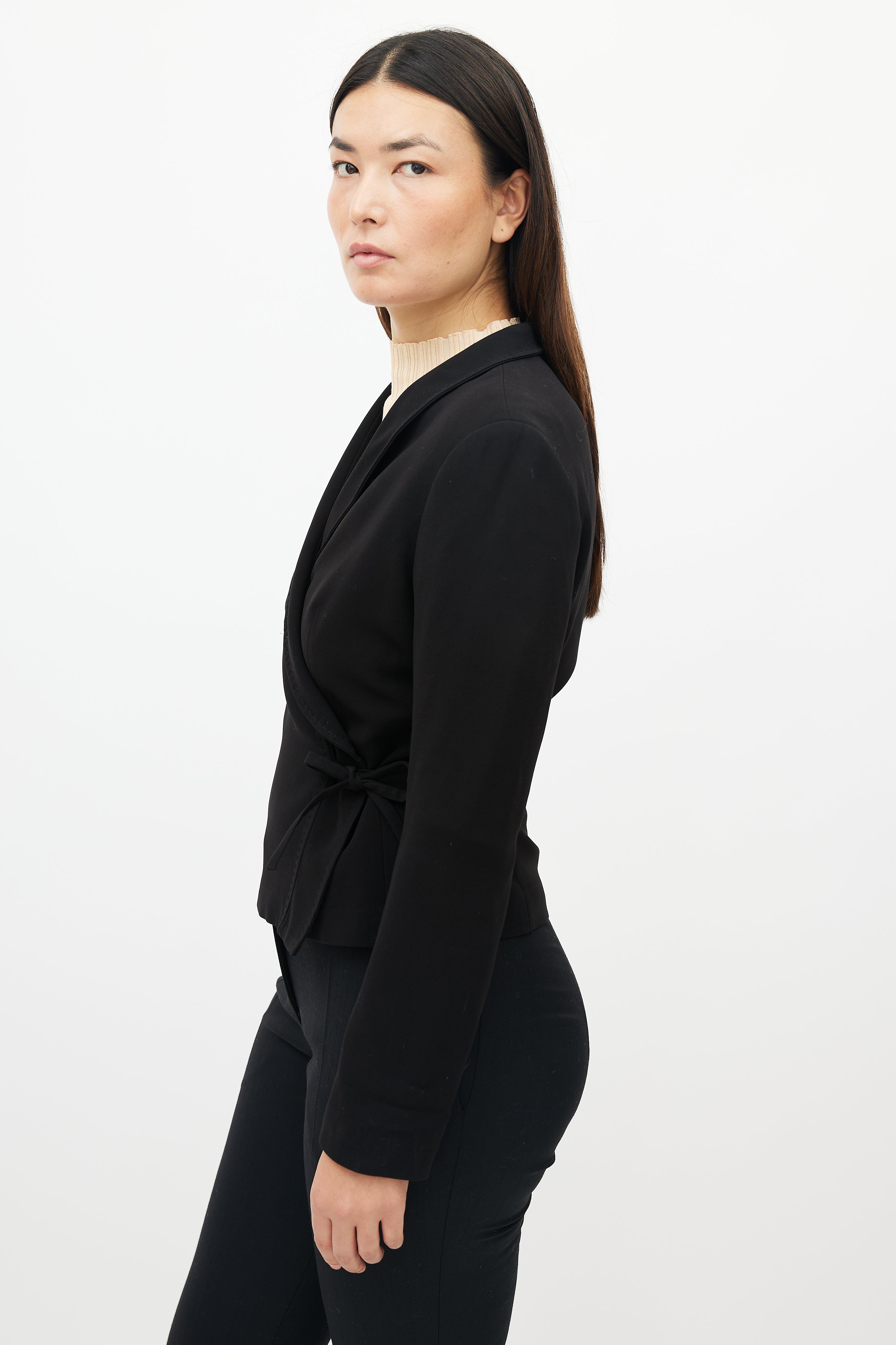 Pre-owned Max Mara black blazer featuring a shawl collar, long sleeves, and tie wrap closure. Lined.