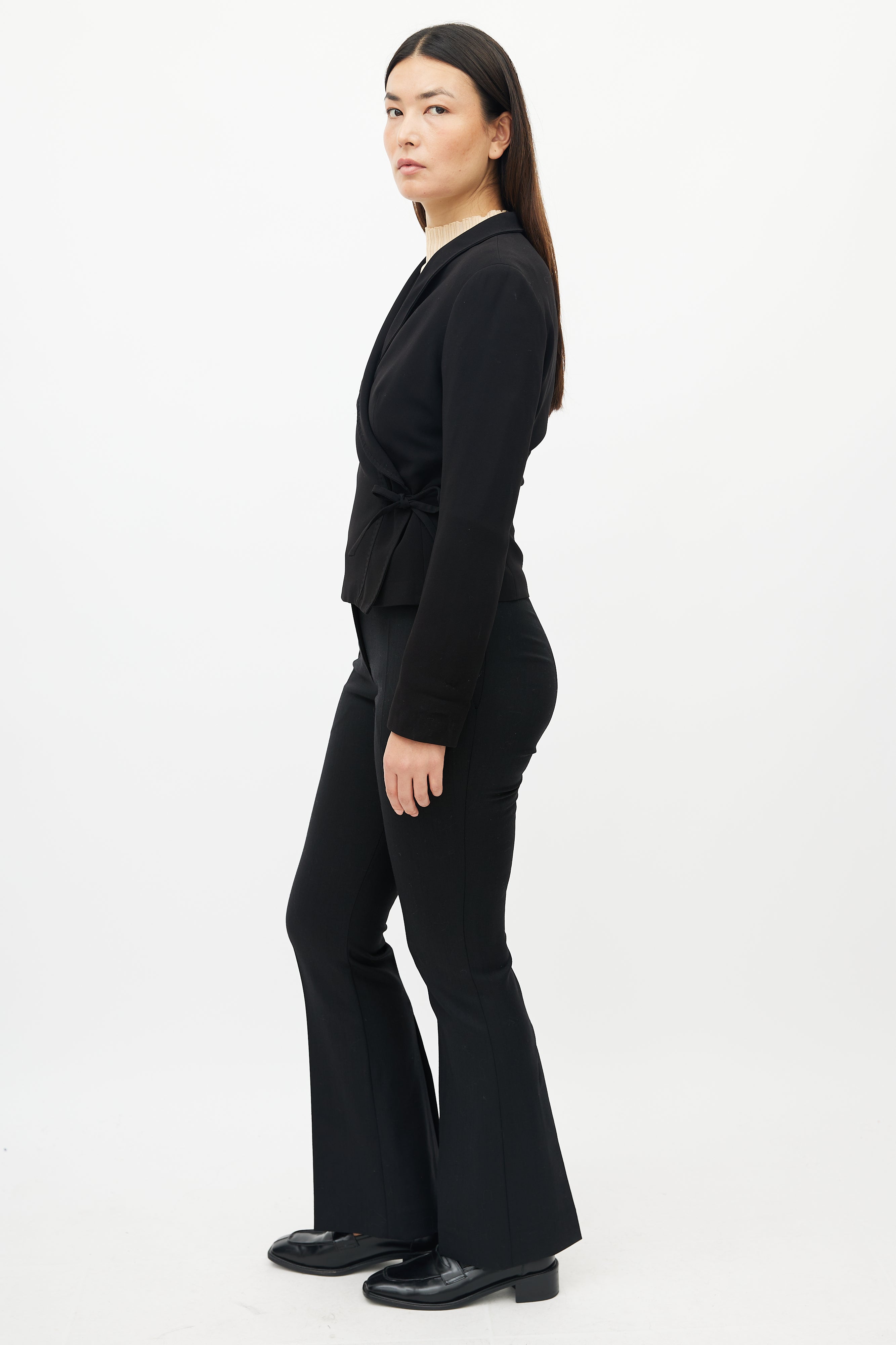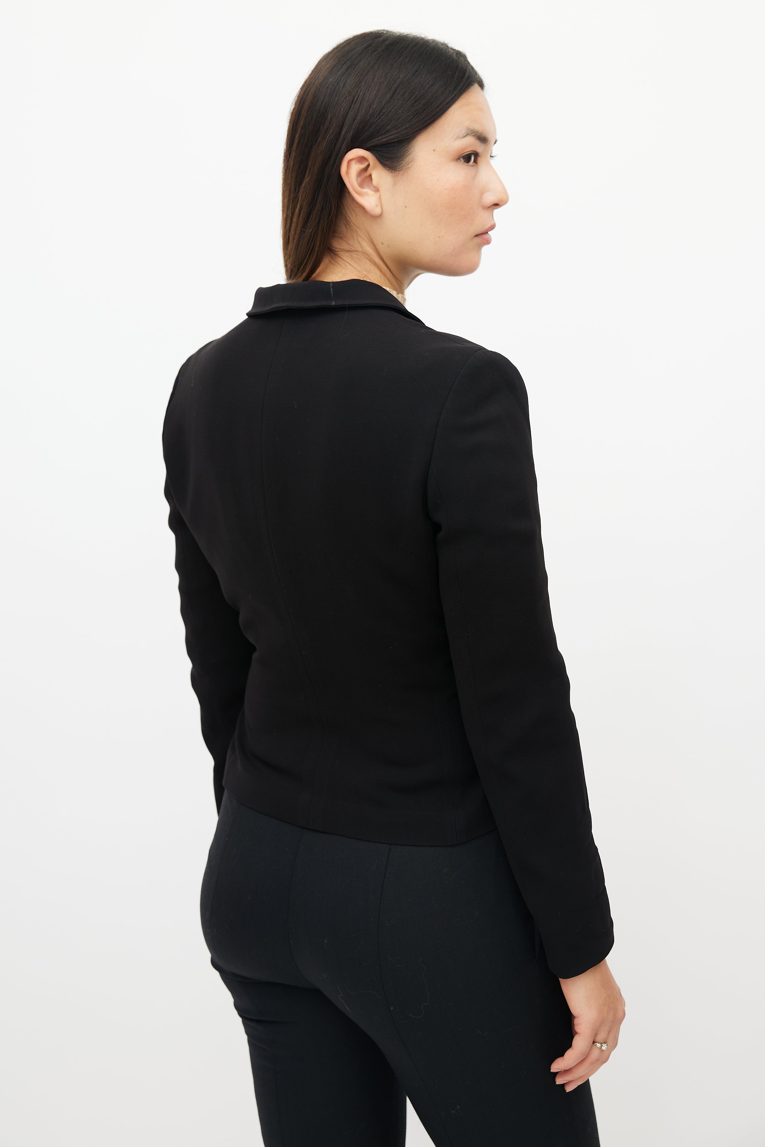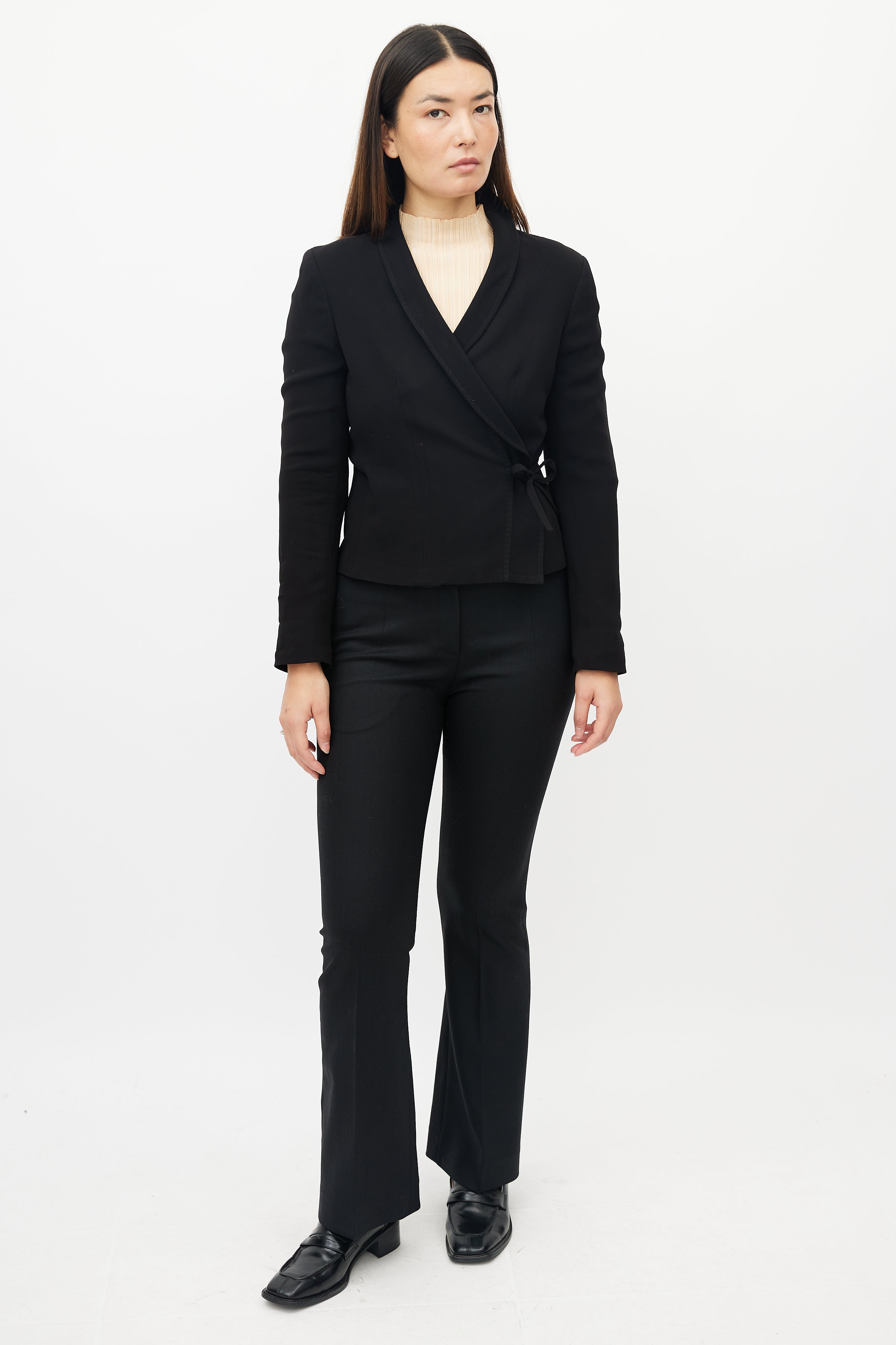 Pre-owned Max Mara black blazer featuring a shawl collar, long sleeves, and tie wrap closure. Lined.