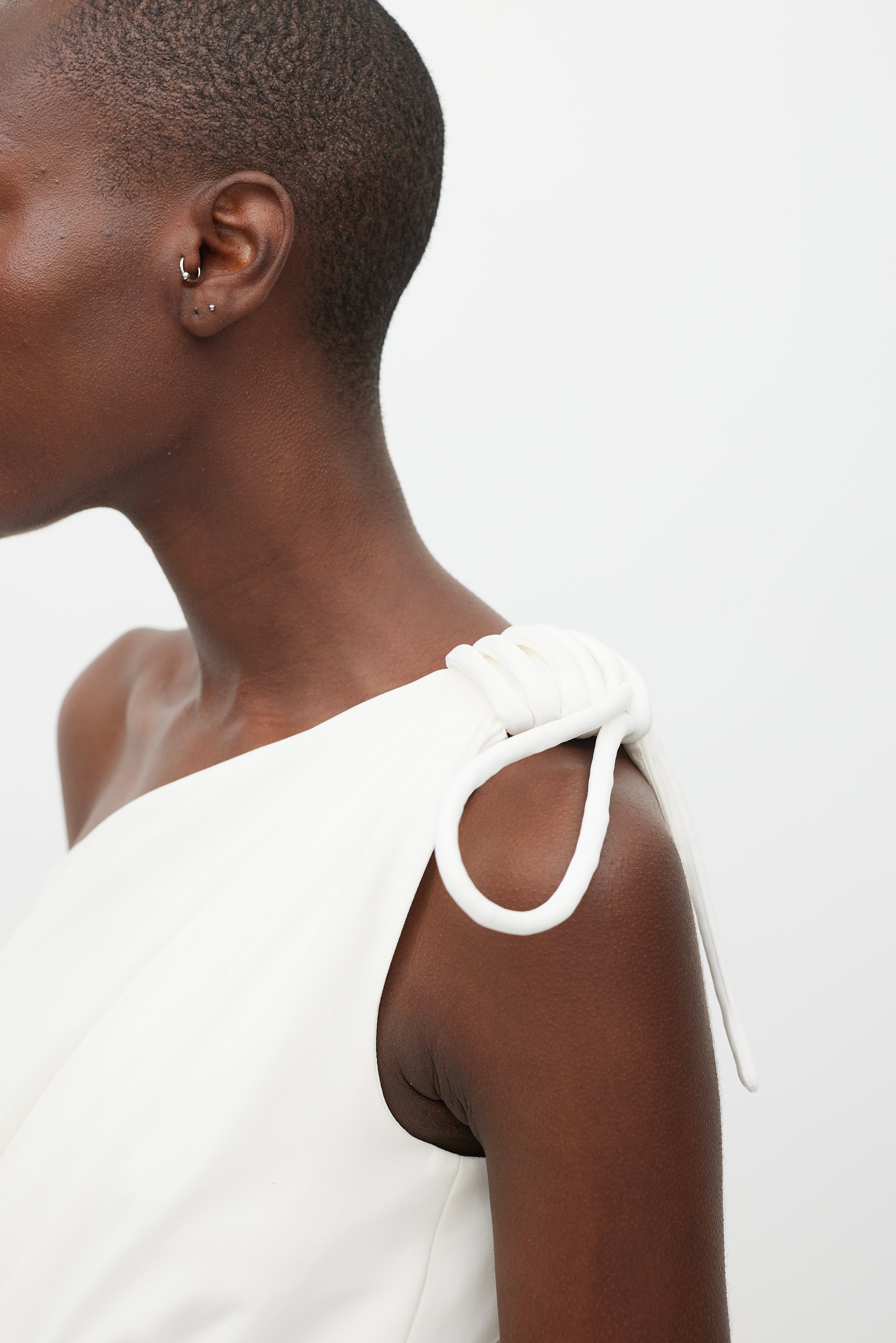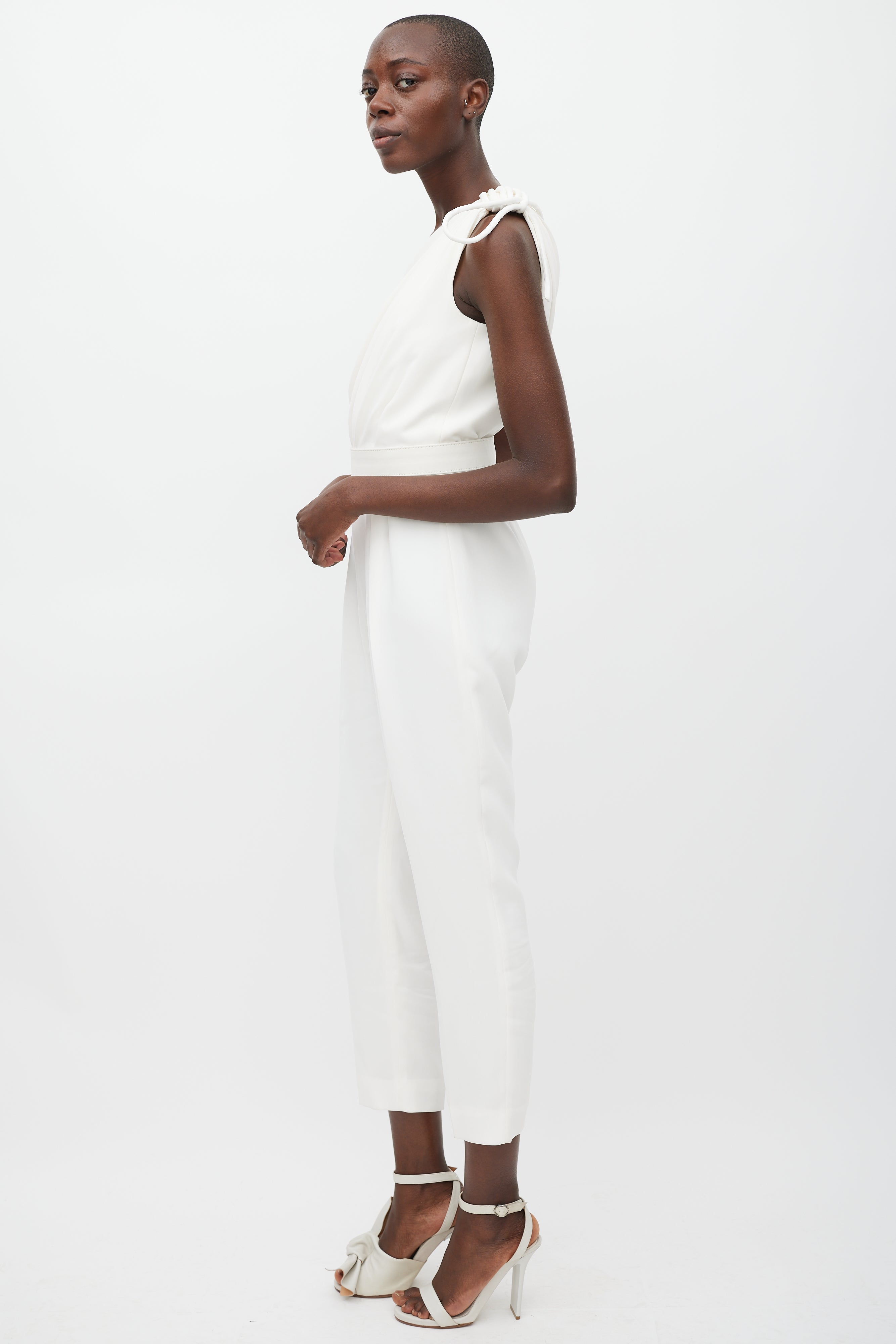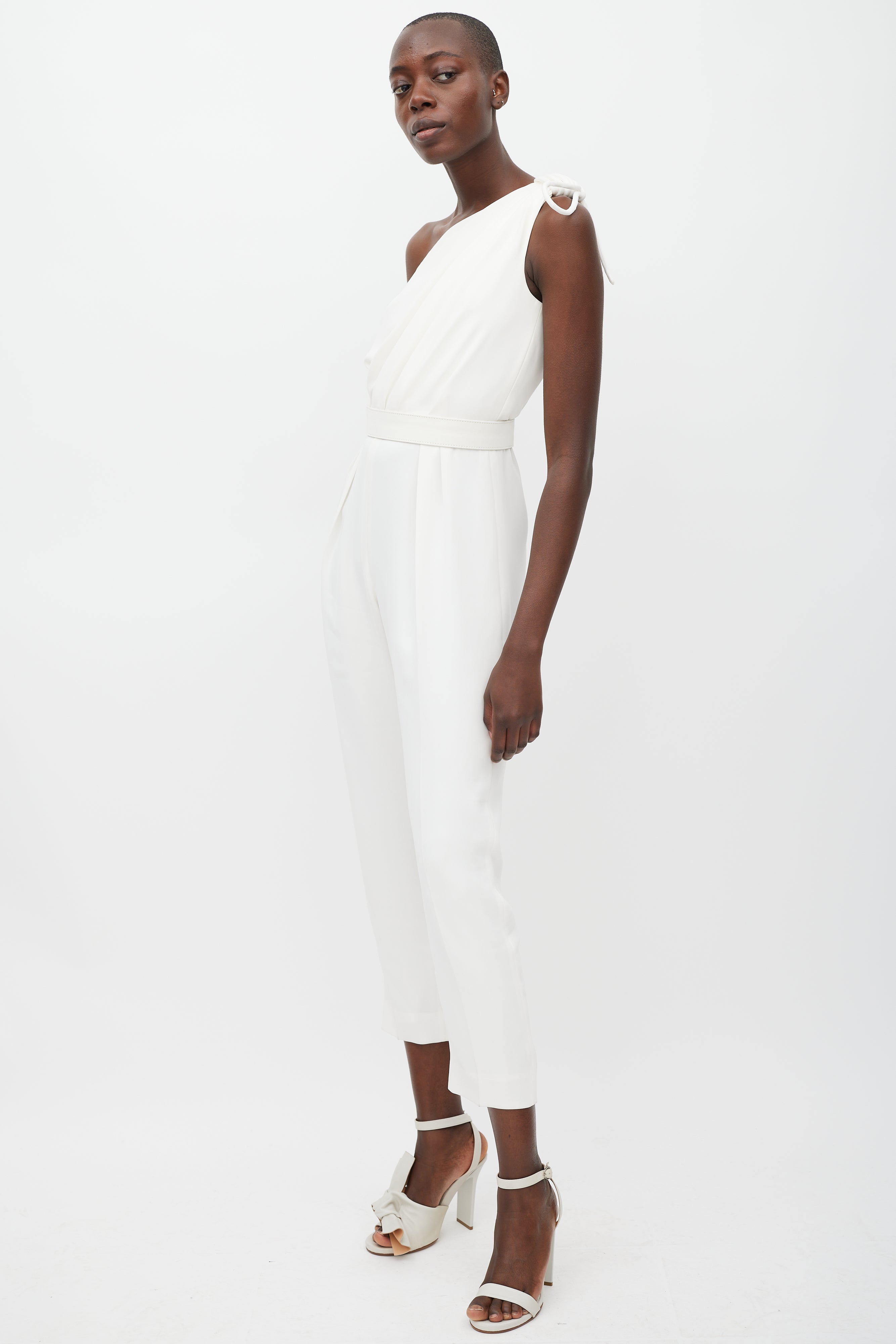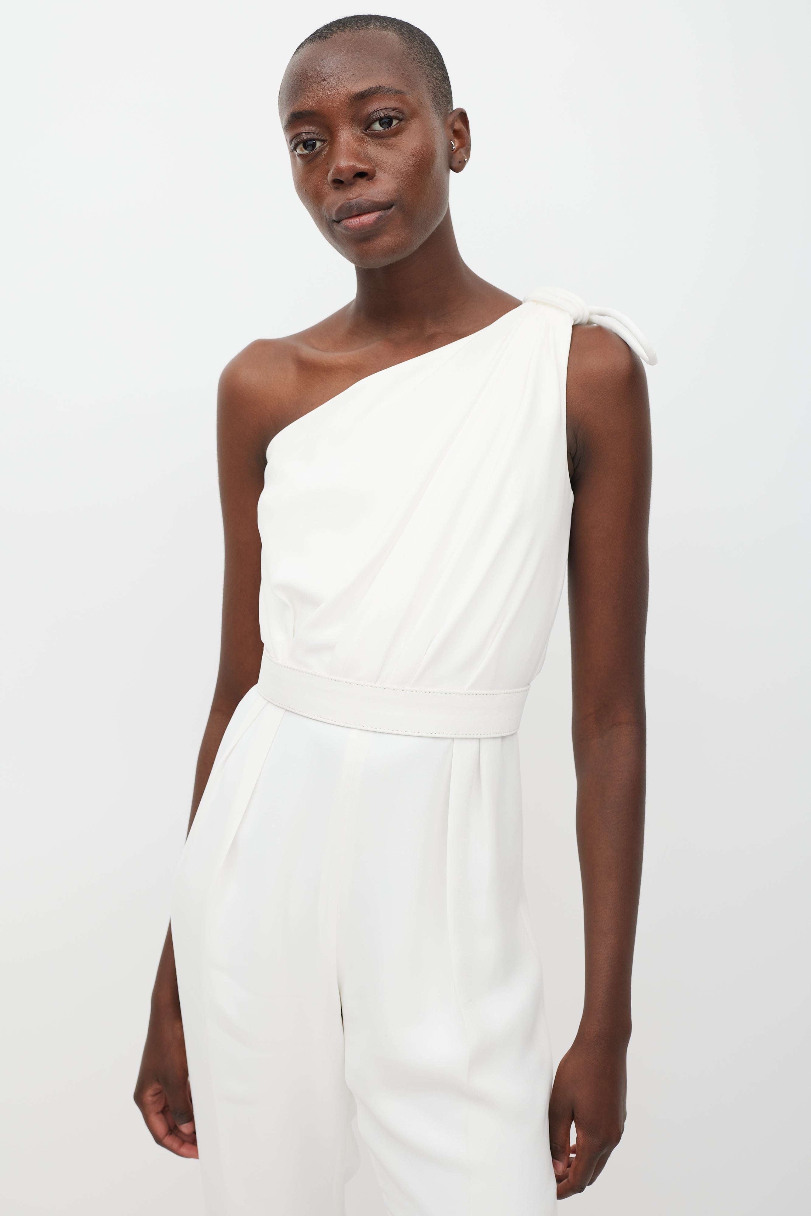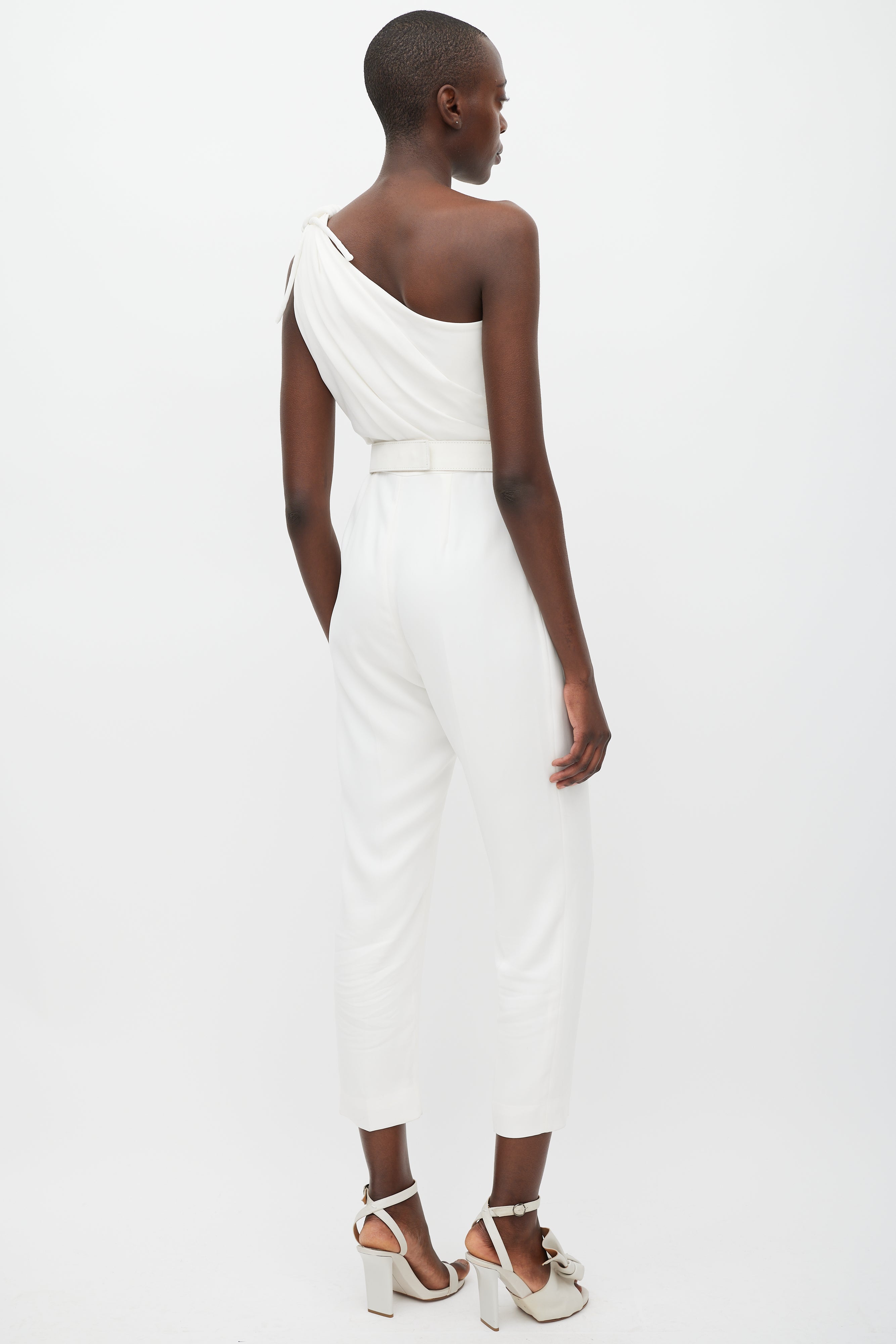 Pre-owned Max Mara white one shoulder jumpsuit featuring a gathered shoulder strap with tie detail, pleating at waist, detachable belt, tapered leg, and concealed side zip closure. Lined.