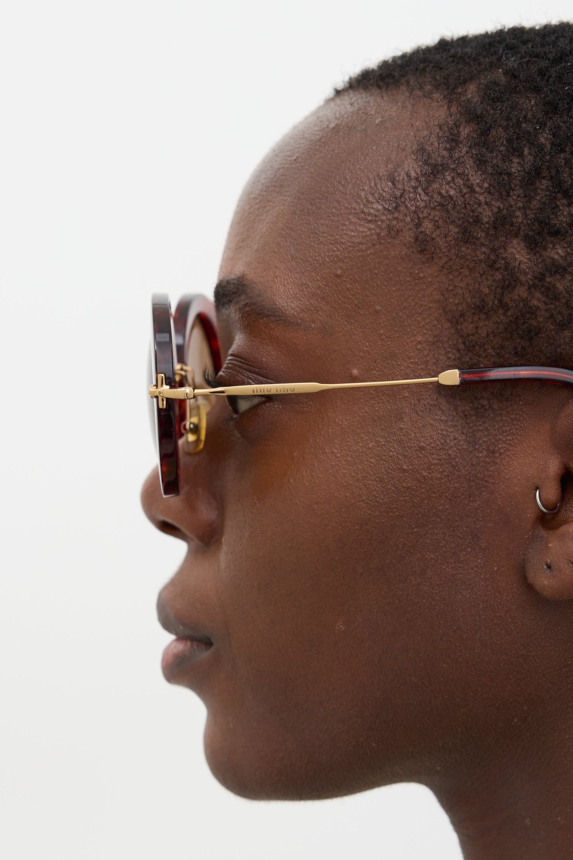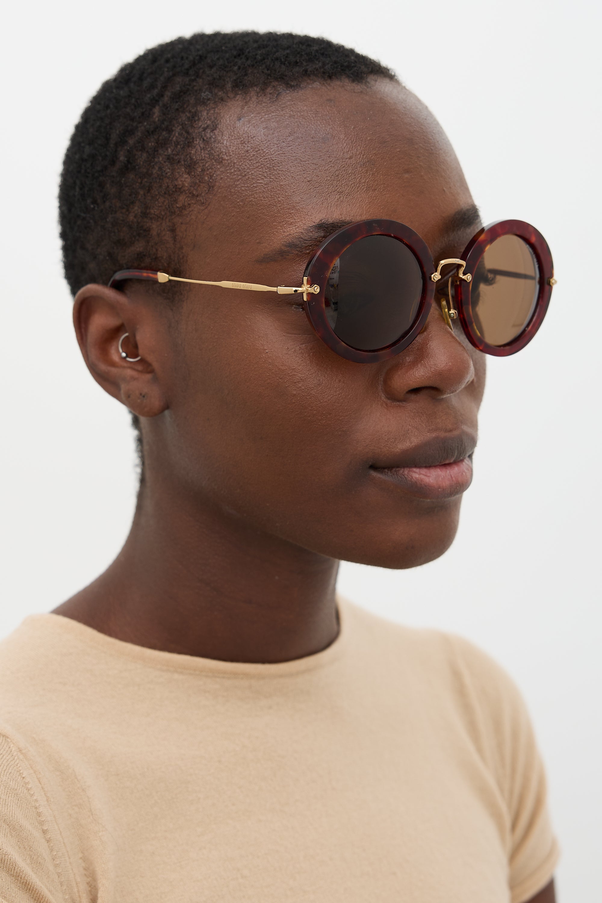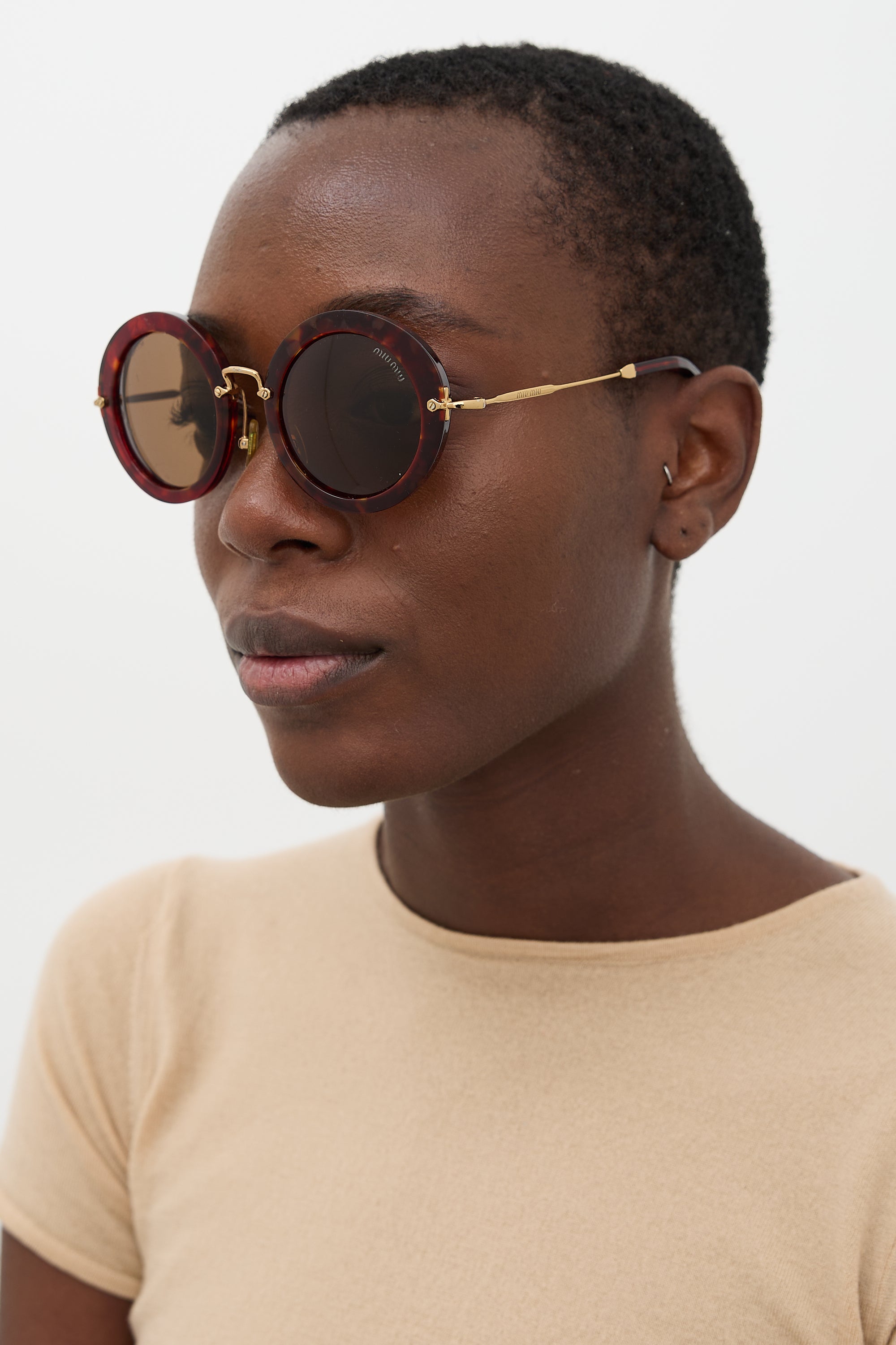 Pre-owned Miu Miu SMU 13N sunglasses featuring a round brown tortoiseshell frame, brown tinted lenses, nose pads, and gold tone metal arms with logo engraving at temples. Includes original pouch and case.