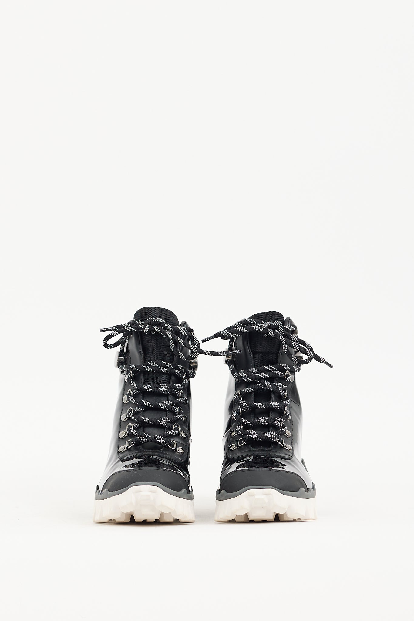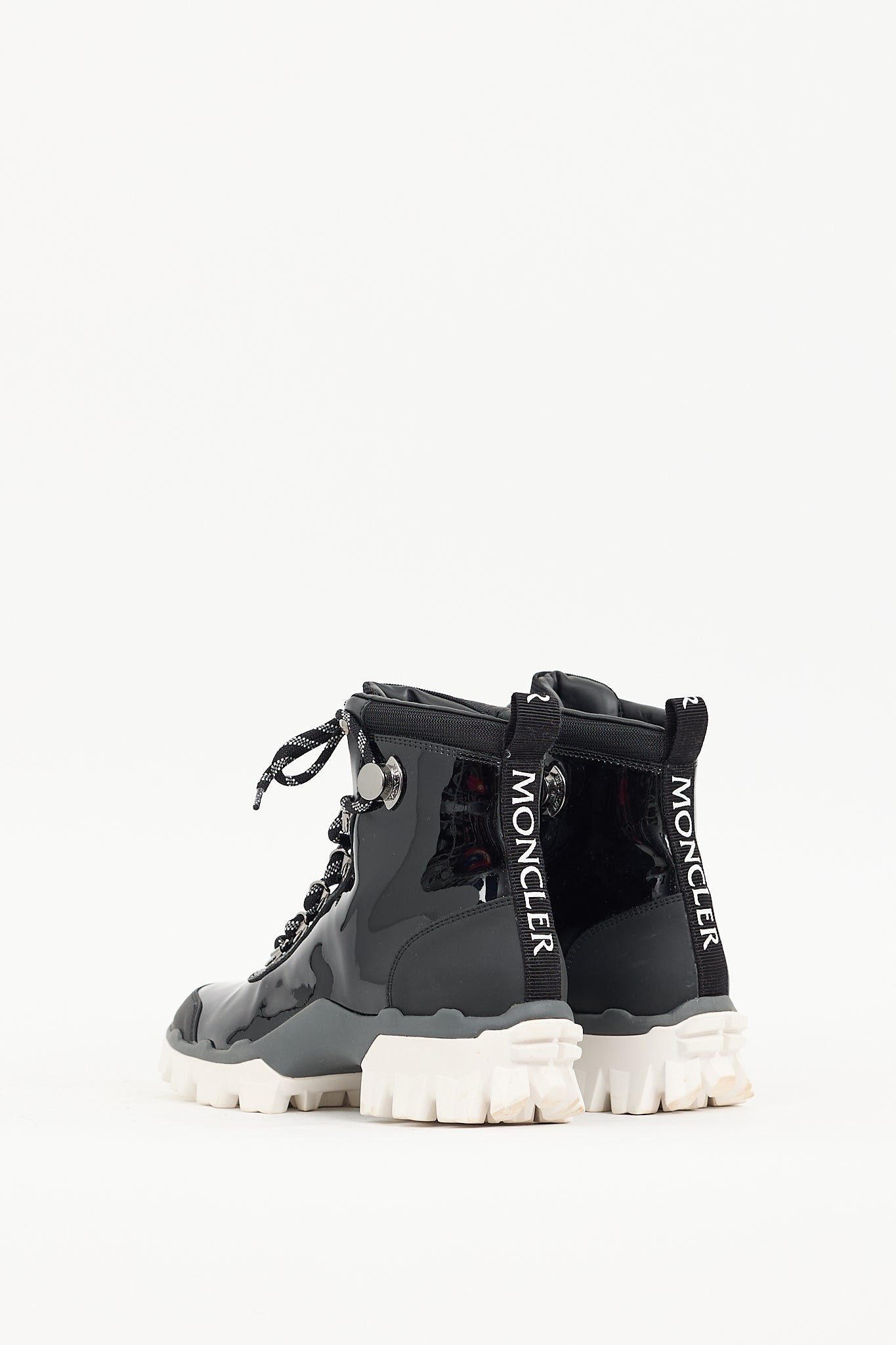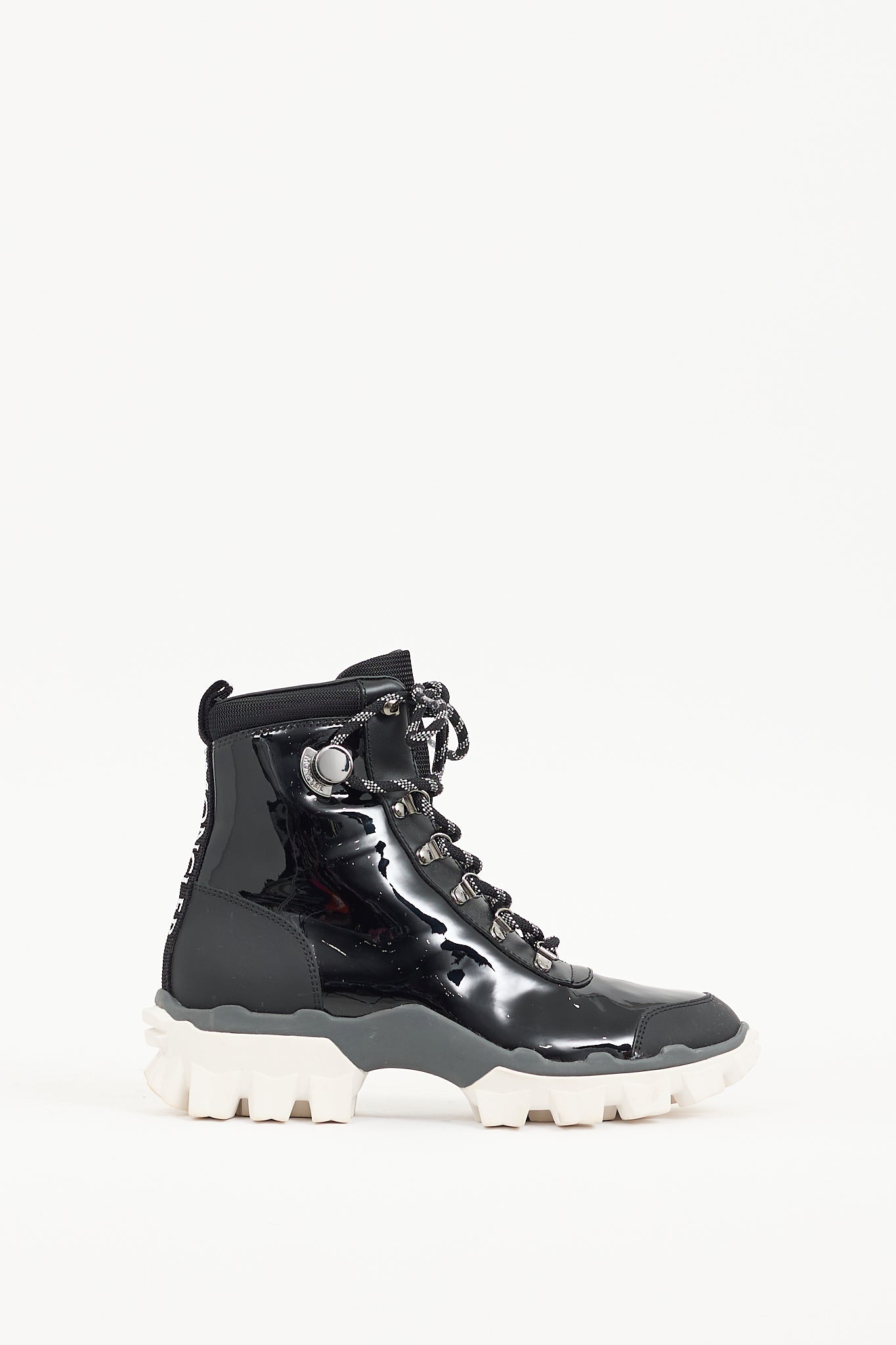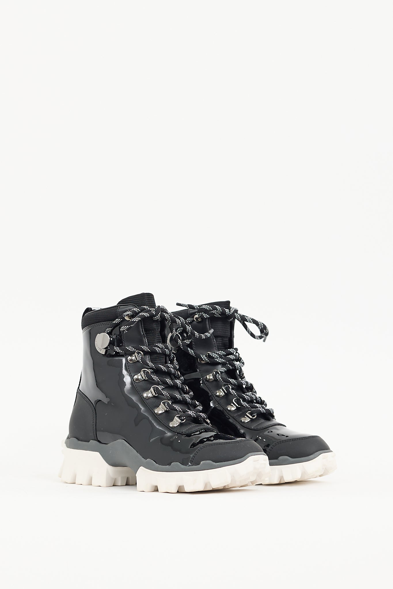 Pre-owned Moncler black patent leather Helis boots featuring a rounded toe, rubber panelling at toe and heel, lace up front, pull tab at counter, white printed logo throughout back stay, and white and grey lug sole. Comes with original dust bags.
