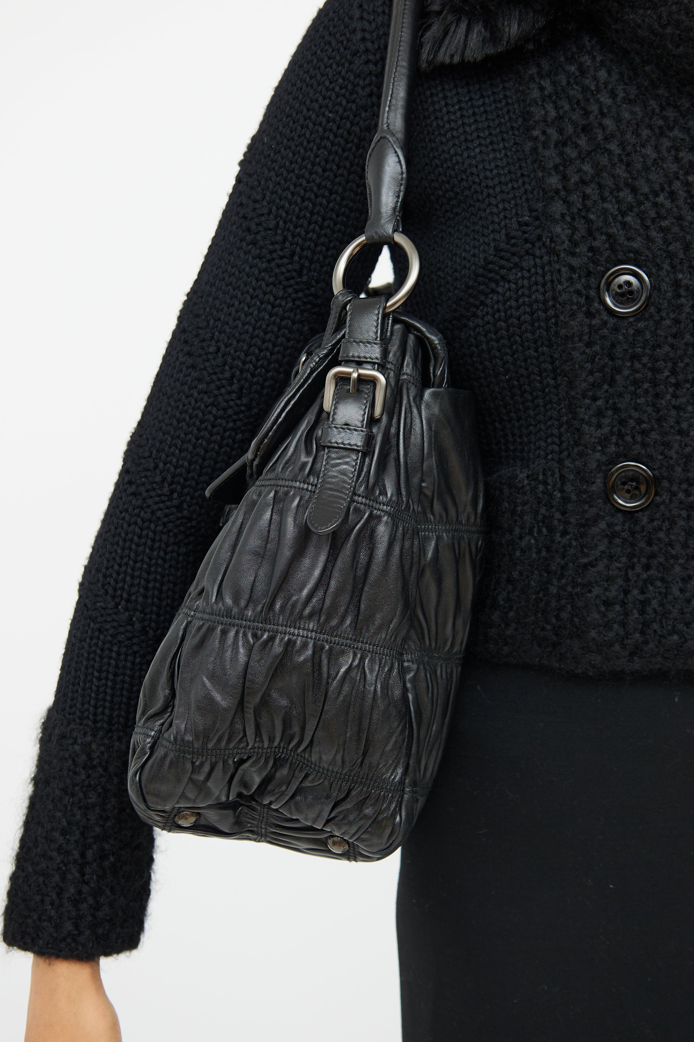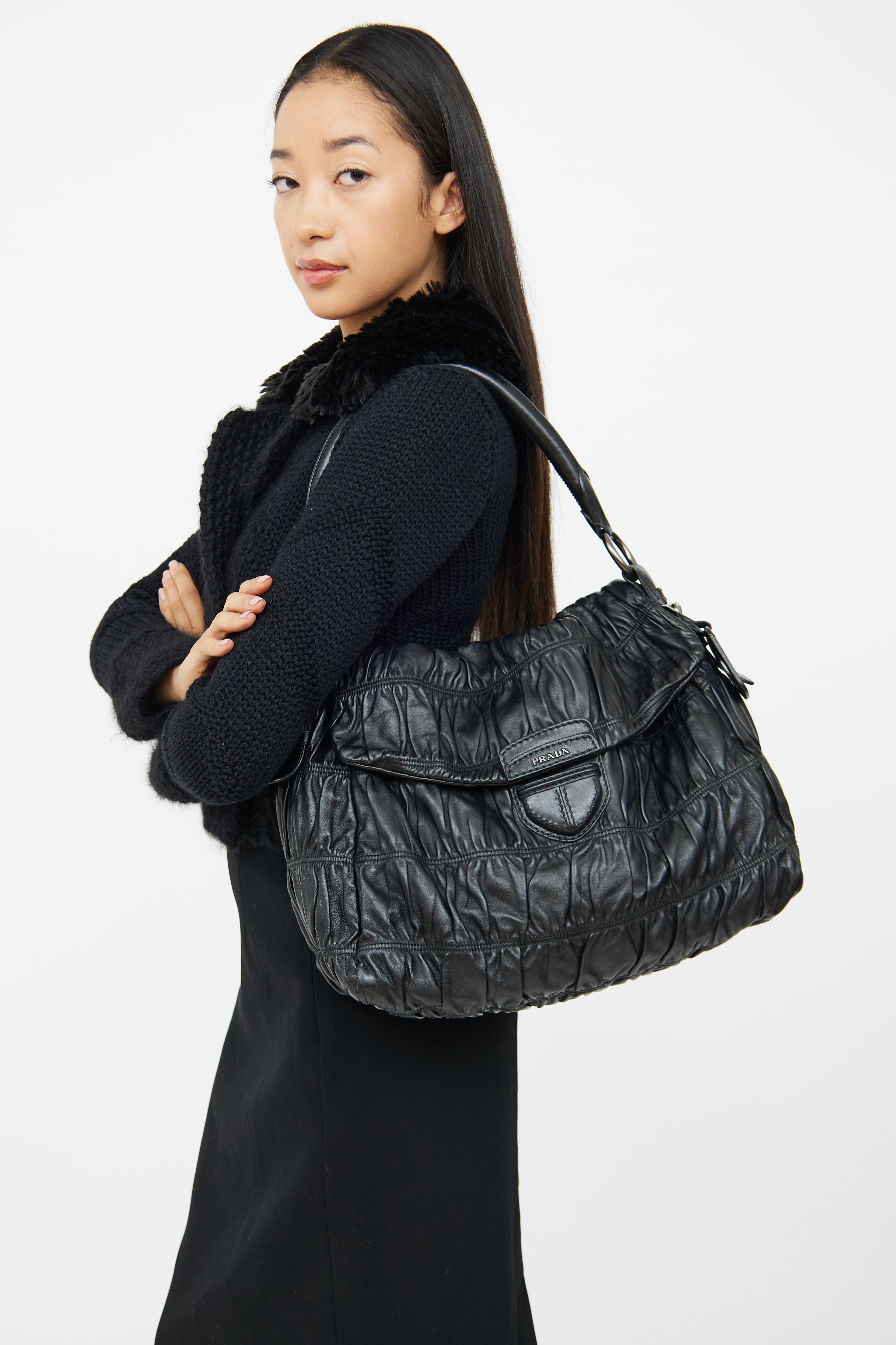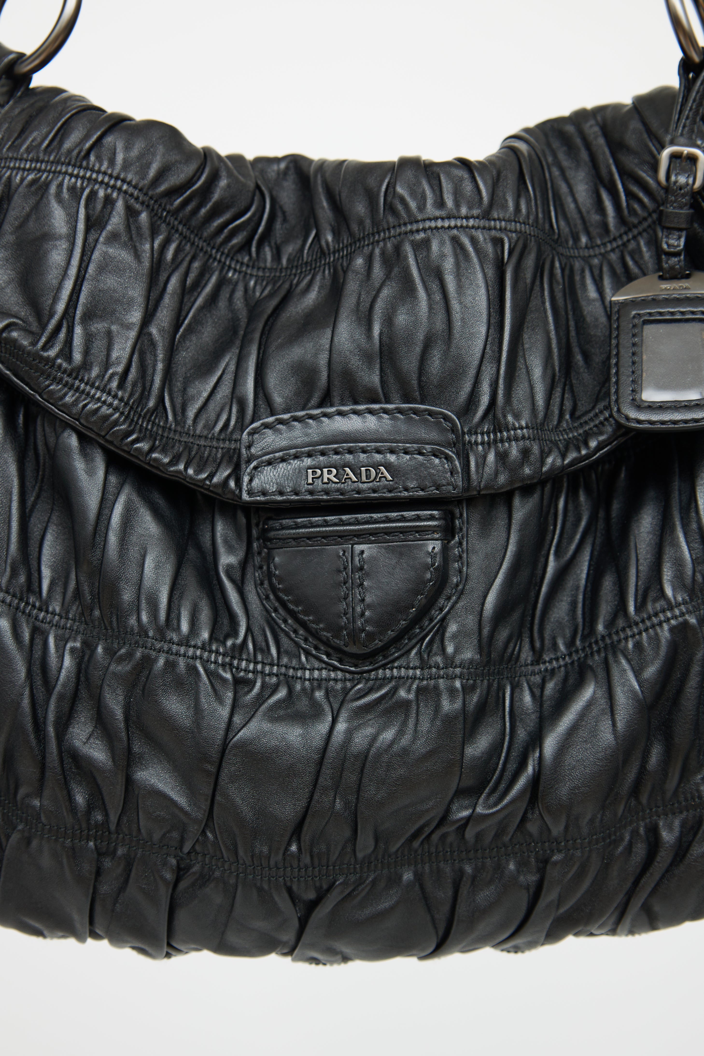 Pre-owned Prada black Gaufre shoulder bag featuring single rolled top handle, gunmetal hardware, ruching throughout, protective feet, snap button closure slip pocket on back, flap with logo text plaque and snap button closure. Logo print canvas lined main compartment, three slip pockets and single zip pocket.