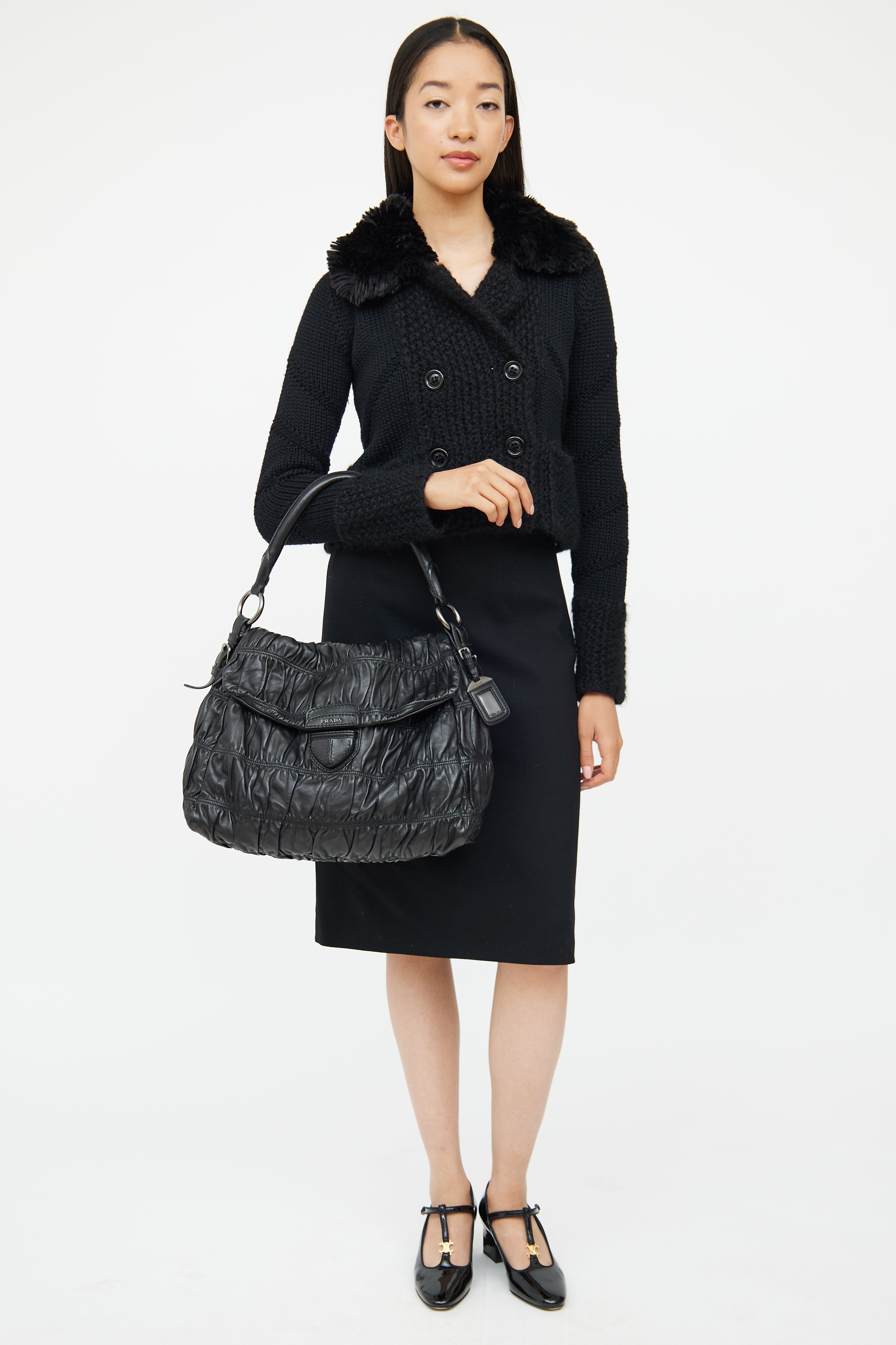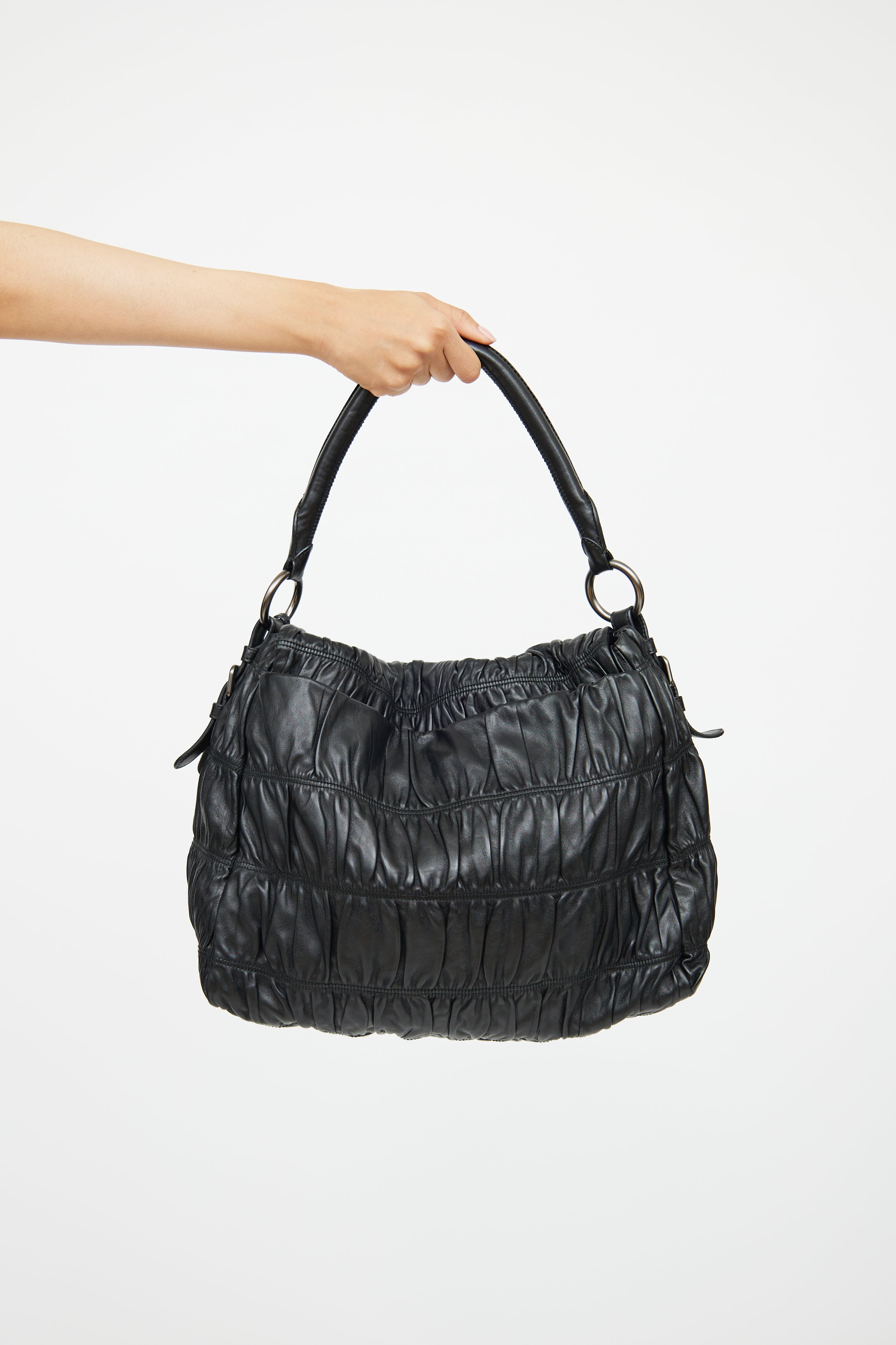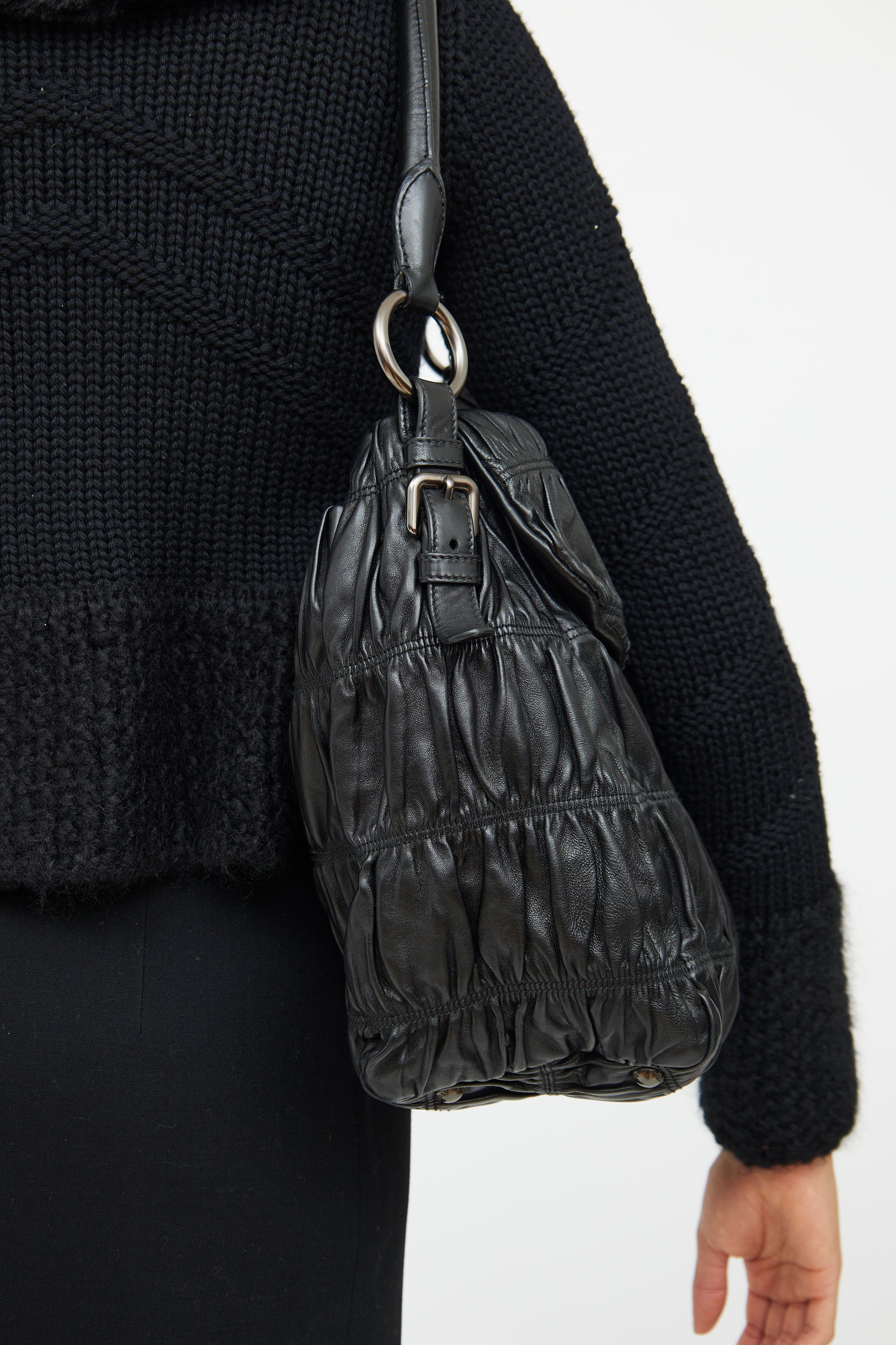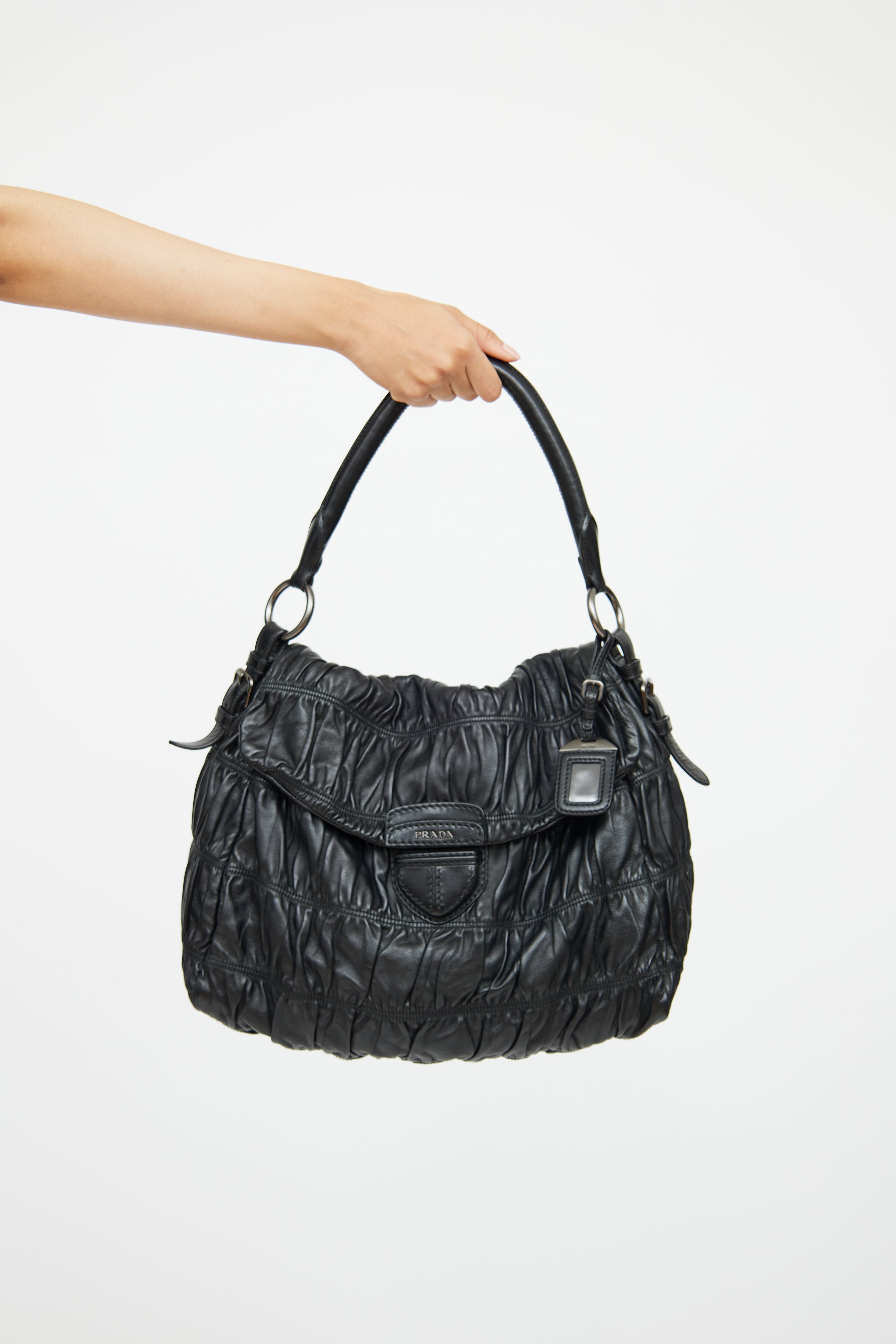 Pre-owned Prada black Gaufre shoulder bag featuring single rolled top handle, gunmetal hardware, ruching throughout, protective feet, snap button closure slip pocket on back, flap with logo text plaque and snap button closure. Logo print canvas lined main compartment, three slip pockets and single zip pocket.