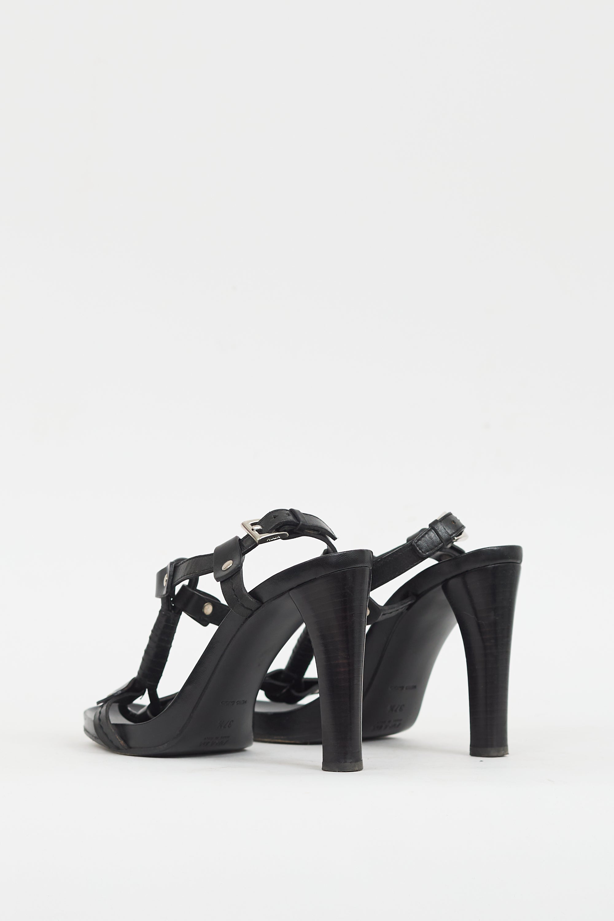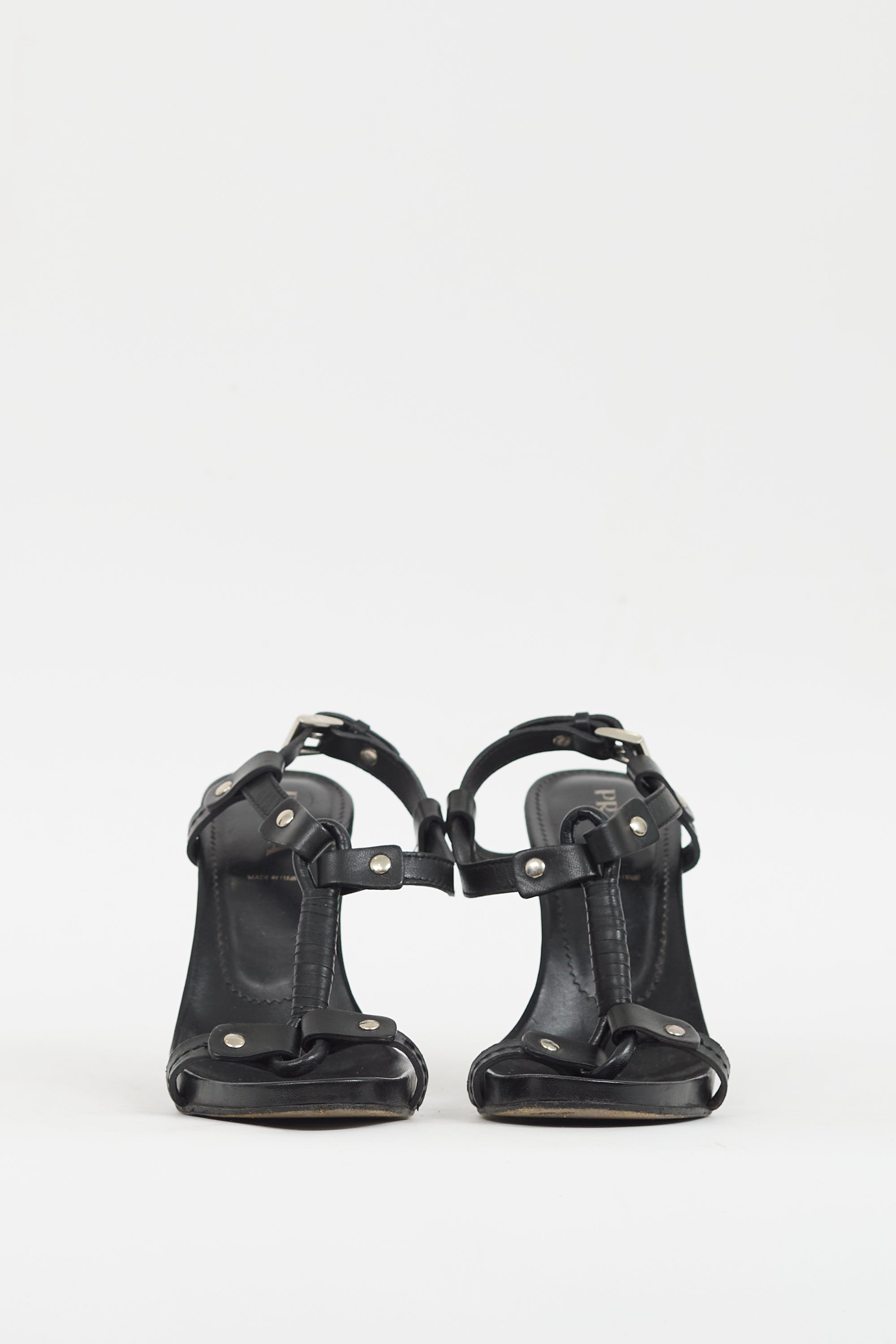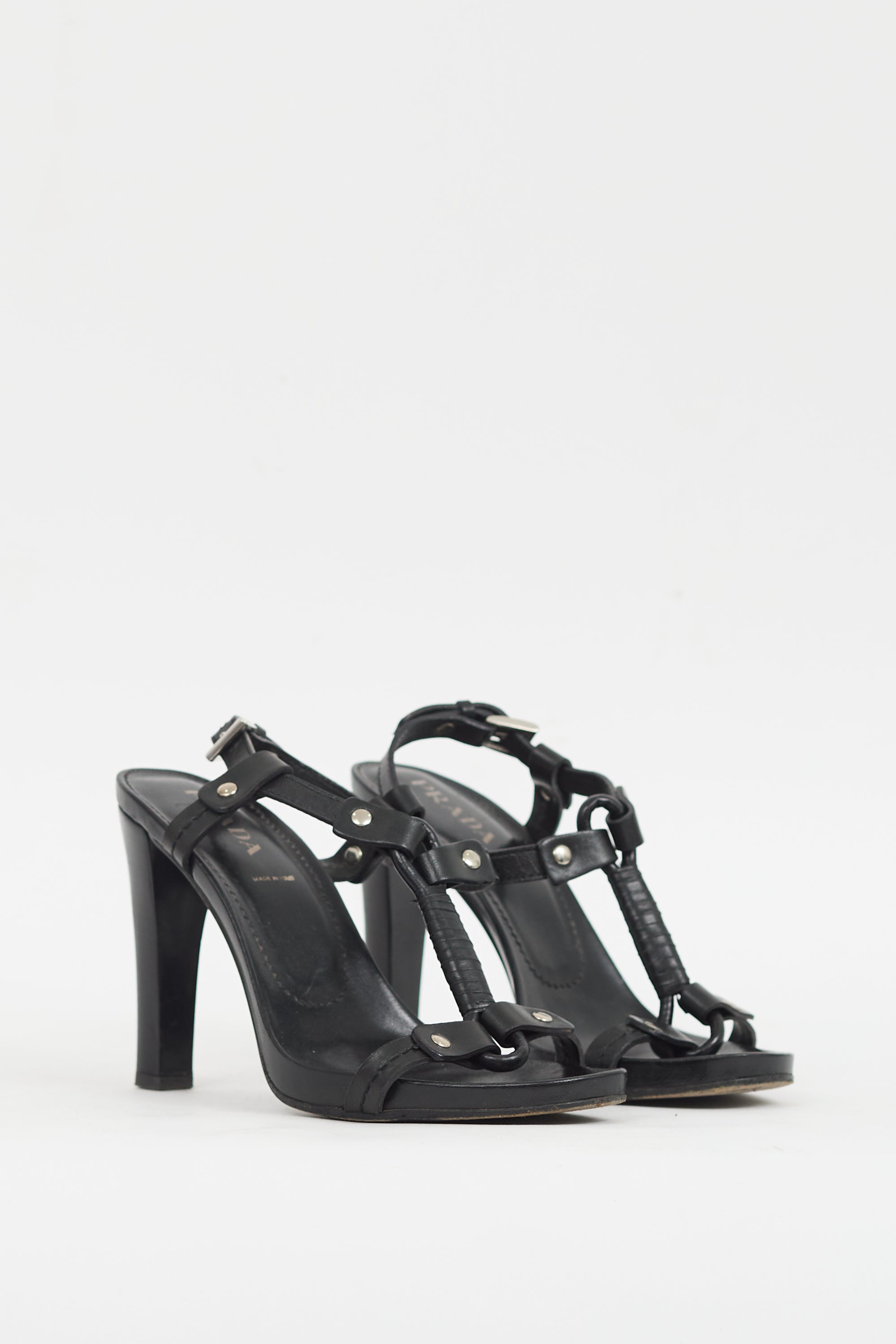 Pre-owned Prada black leather heels featuring an open tapered square toe, tonal stitching, silver tone hardware, wrapped T-strap, stud detail throughout, adjustable ankle strap, and straight wooden heel.
