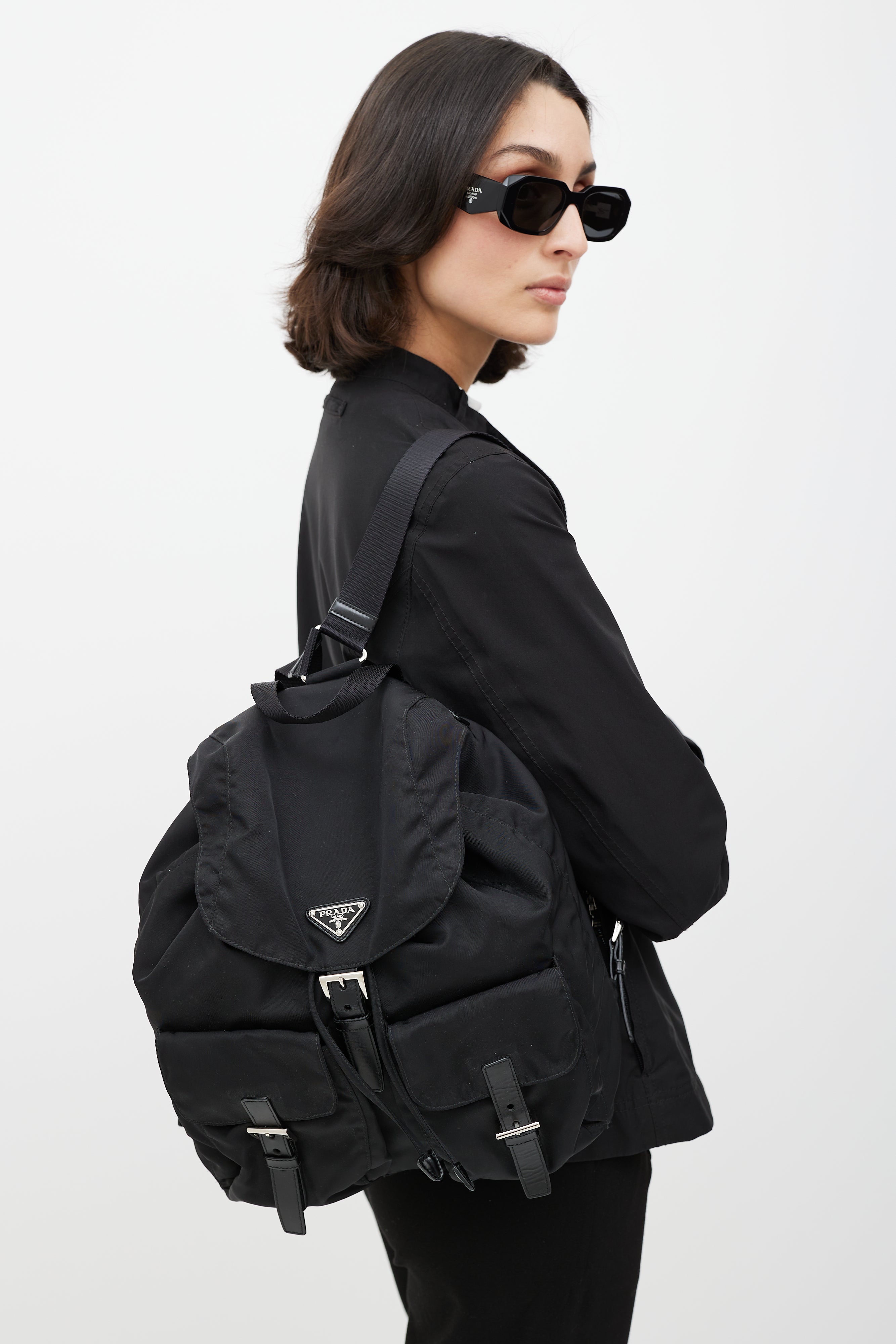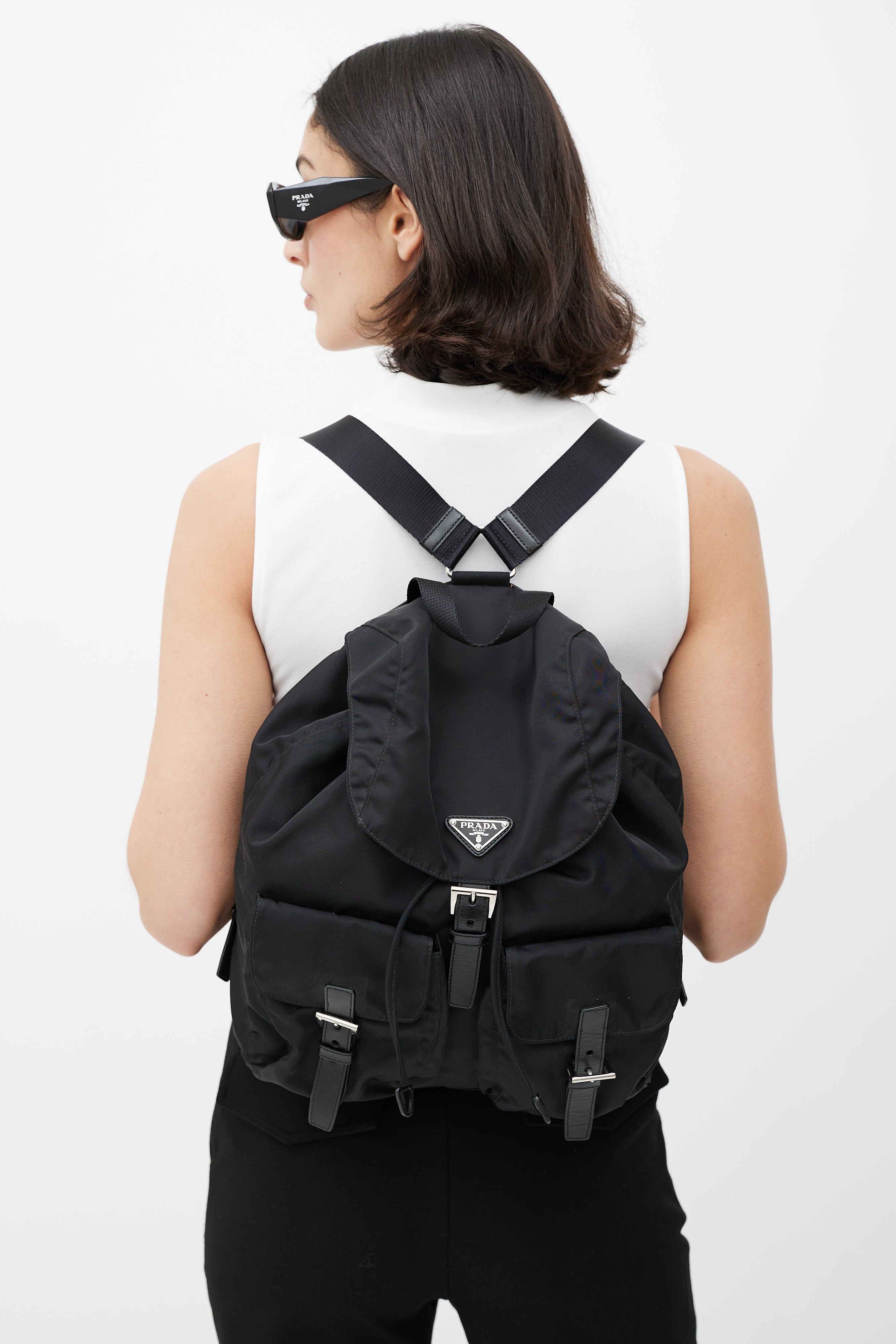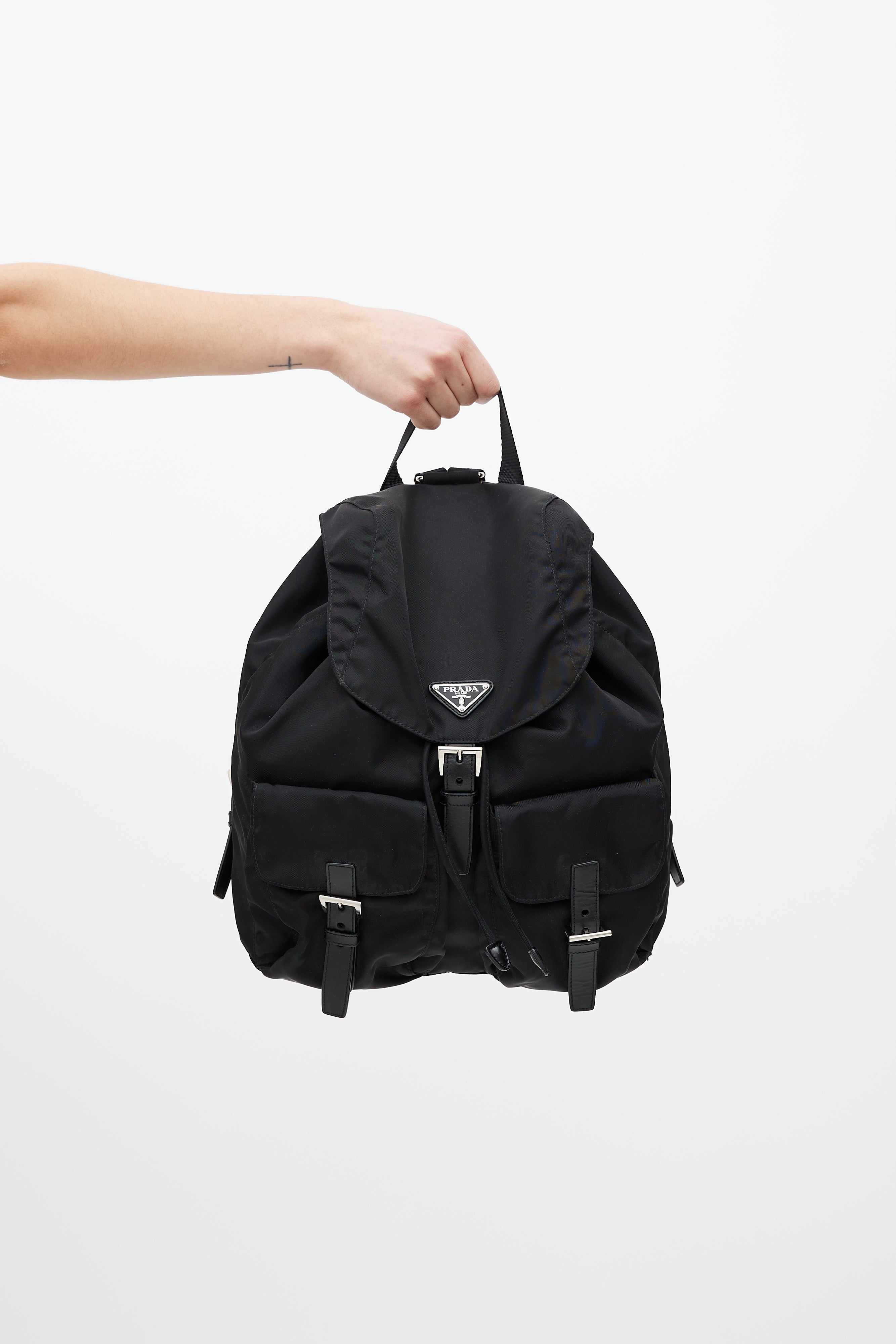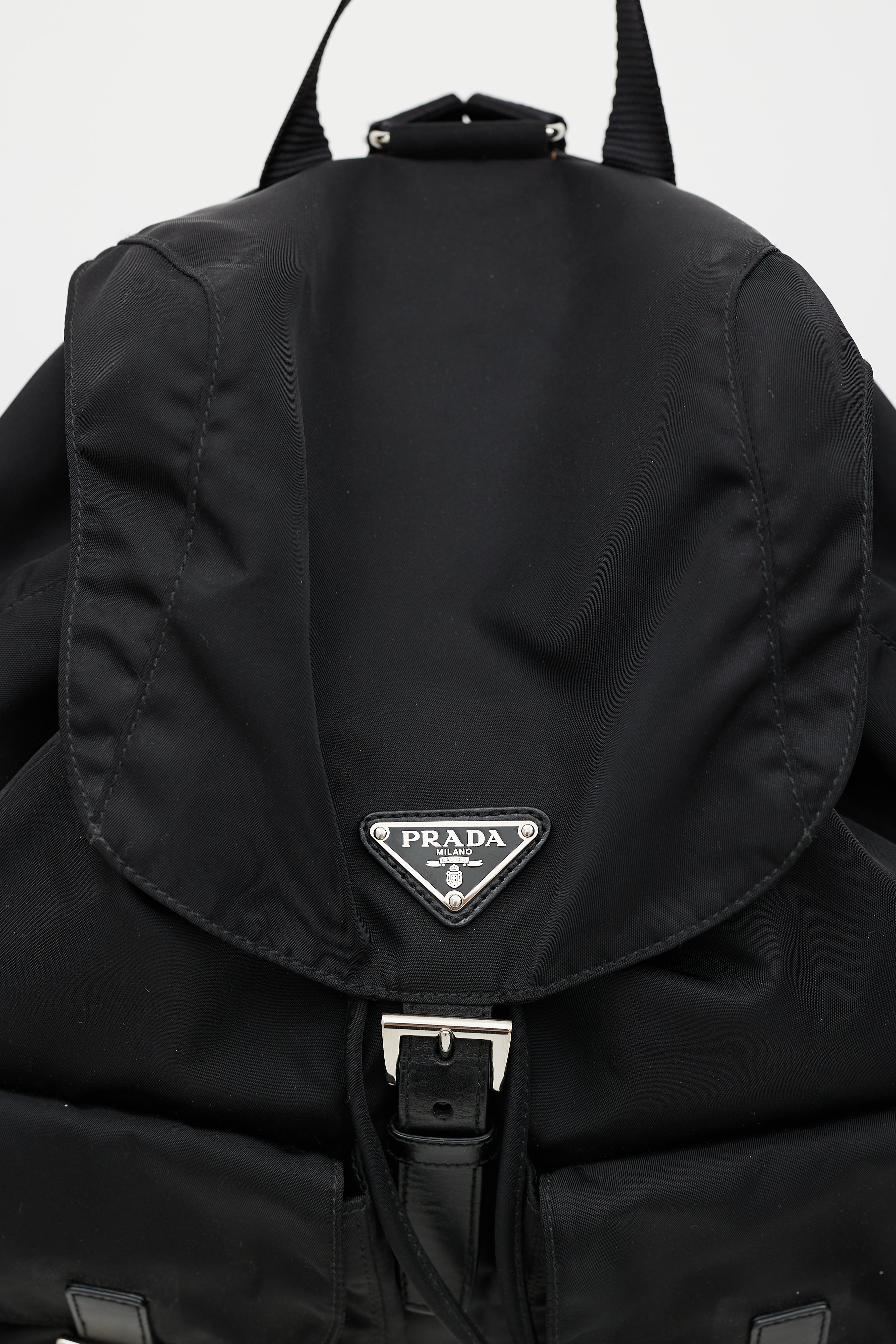 Pre-owned Prada black nylon backpack featuring a top flap with silver tone hardware, two buckle pockets at front, webbed top handle, one main compartment with one zip pocket, adjustable webbed shoulder straps, and adjustable buckle closure.