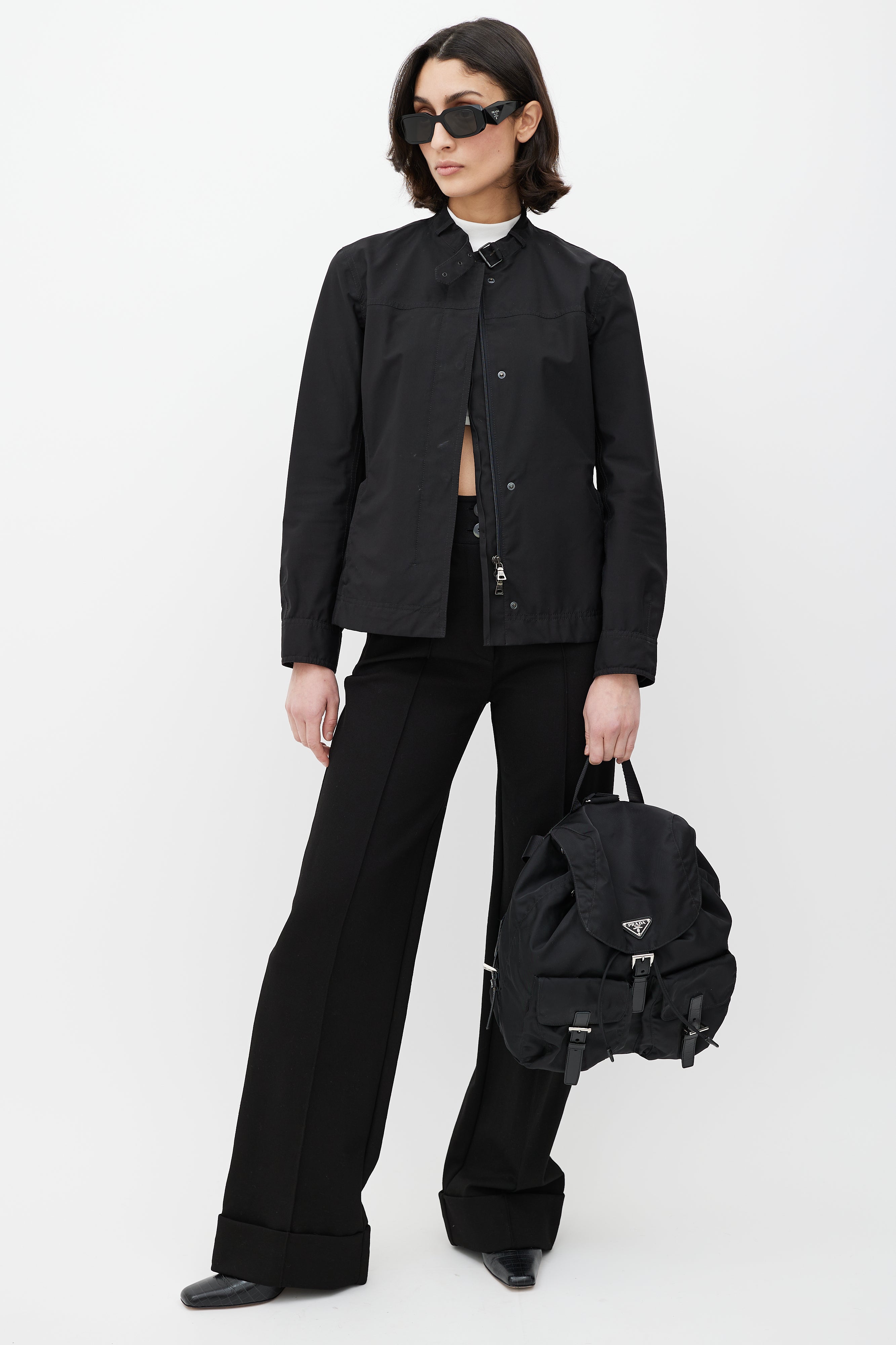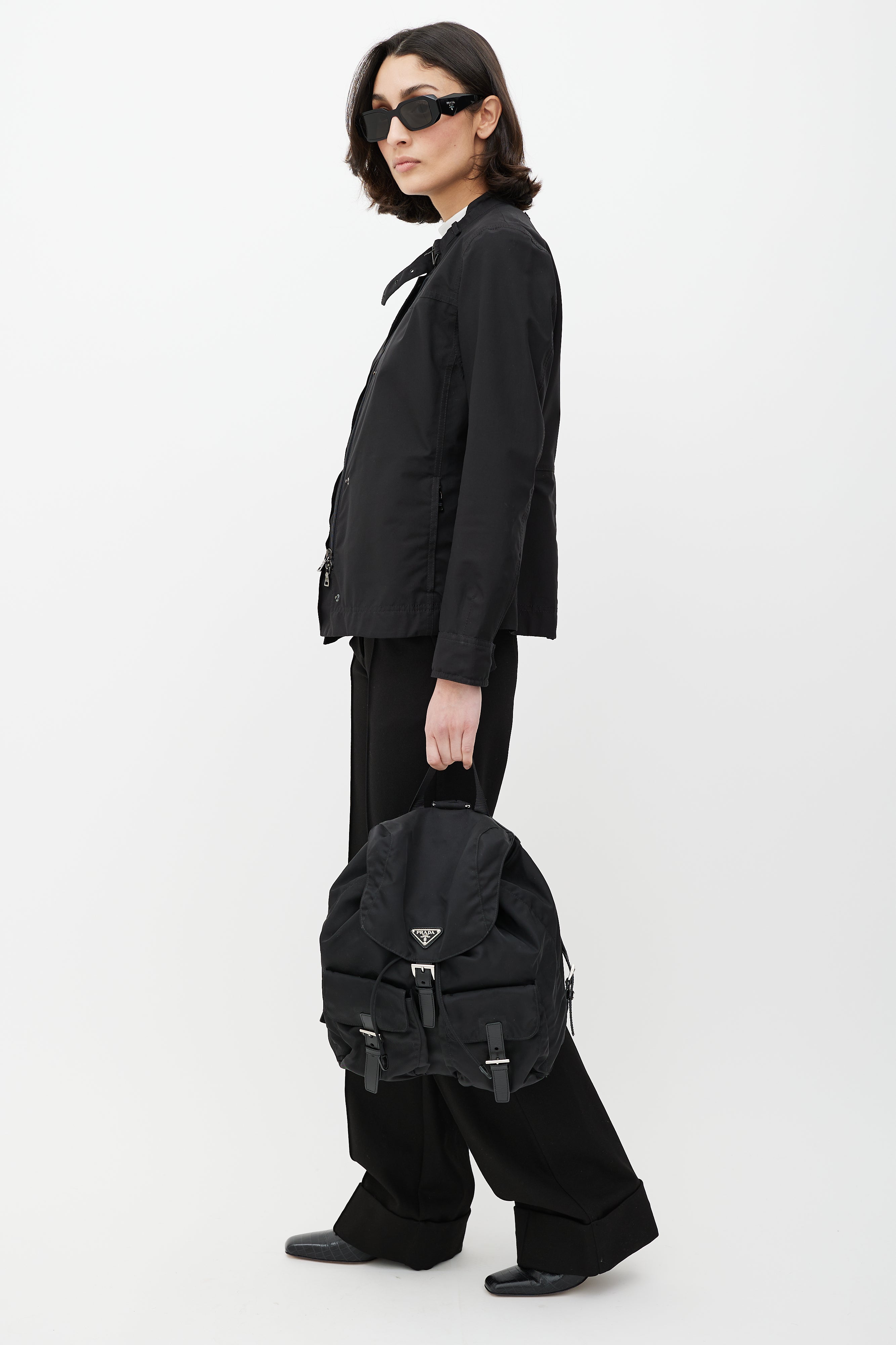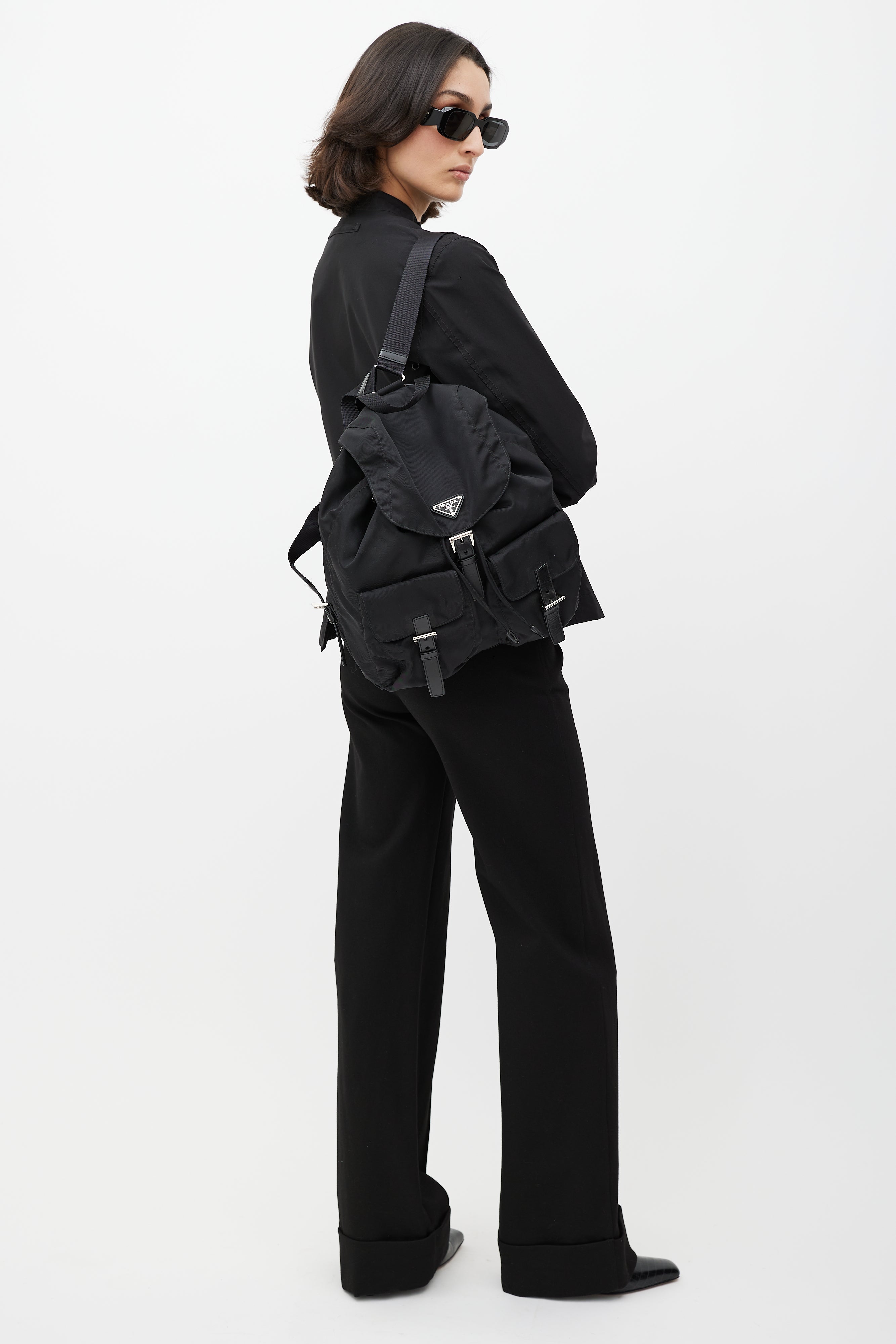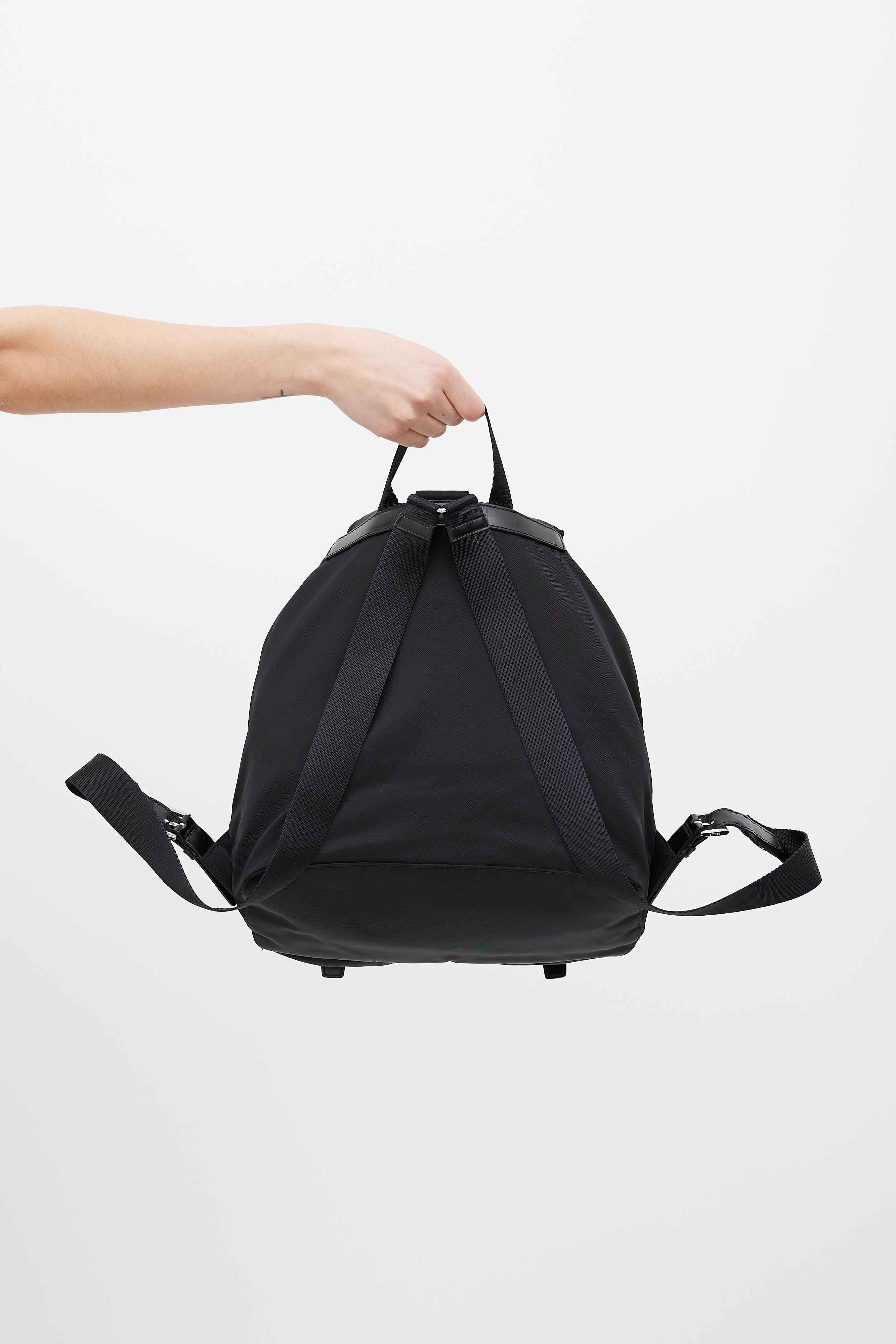Pre-owned Prada black nylon backpack featuring a top flap with silver tone hardware, two buckle pockets at front, webbed top handle, one main compartment with one zip pocket, adjustable webbed shoulder straps, and adjustable buckle closure.