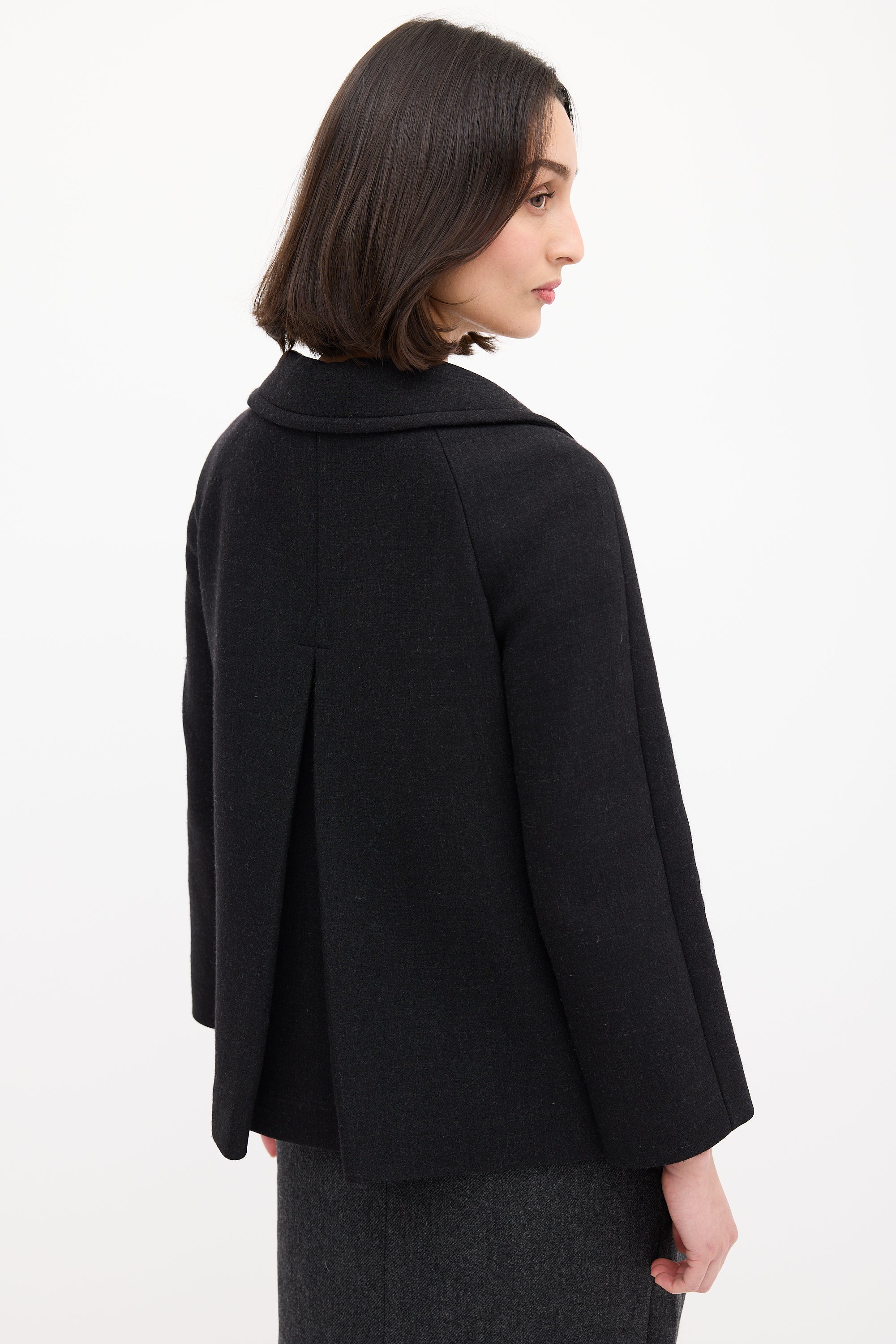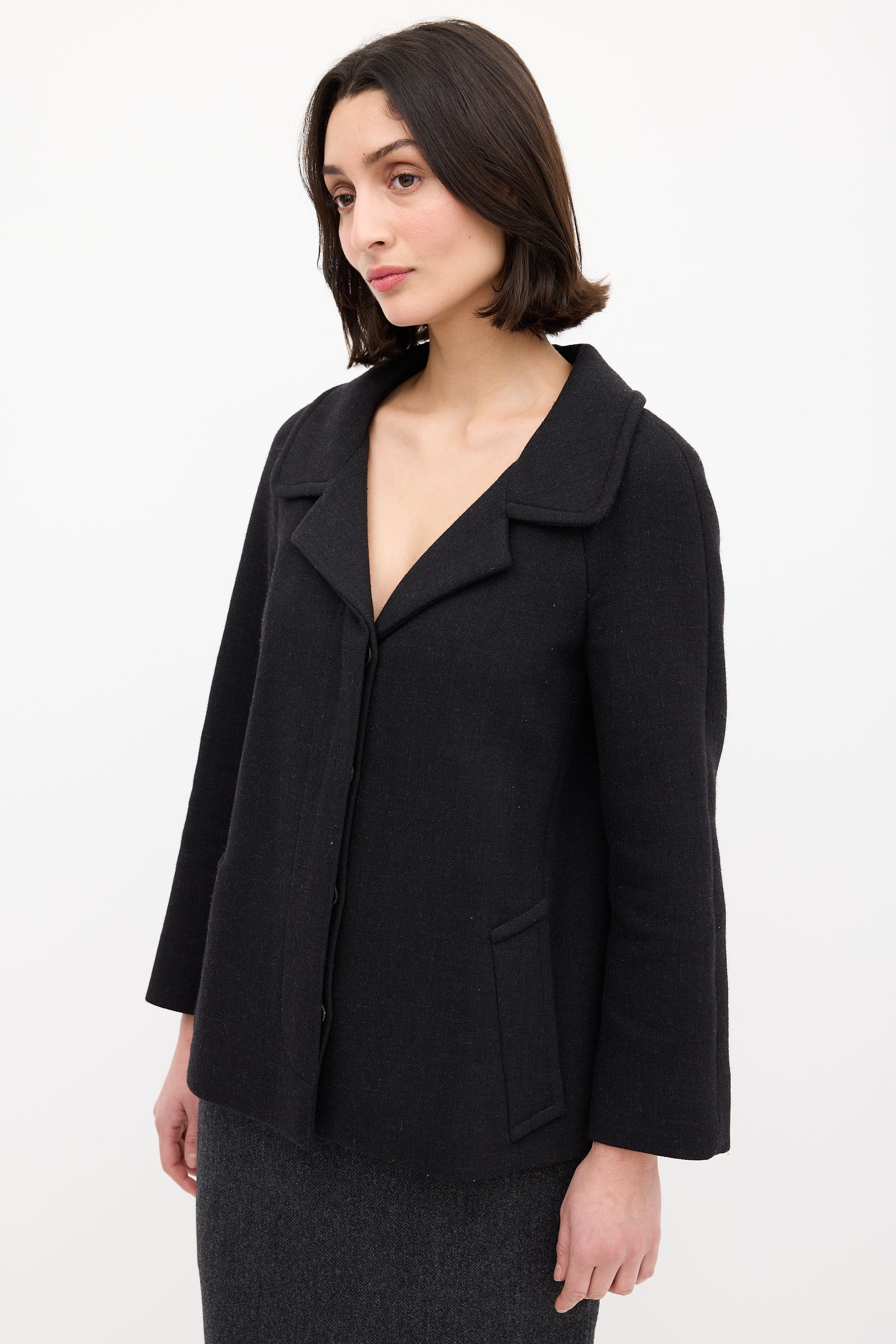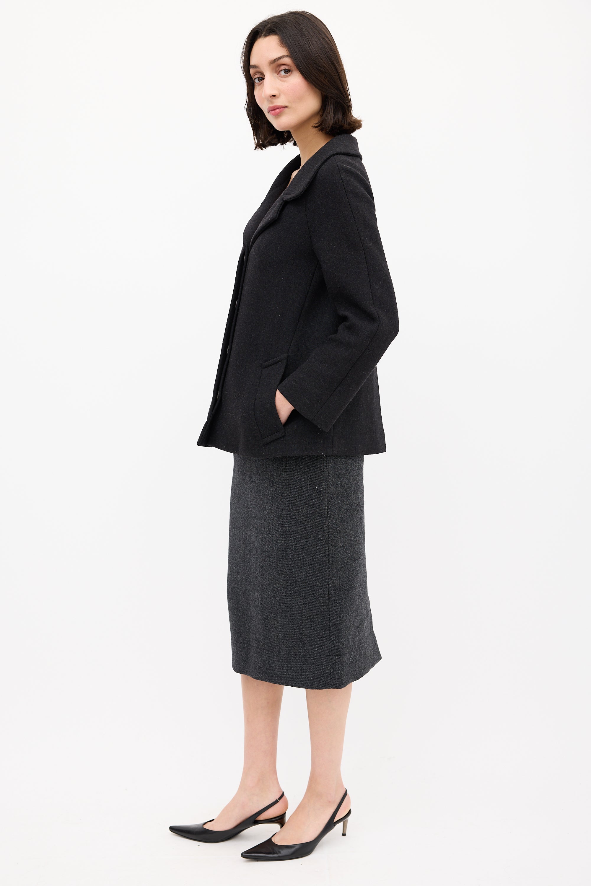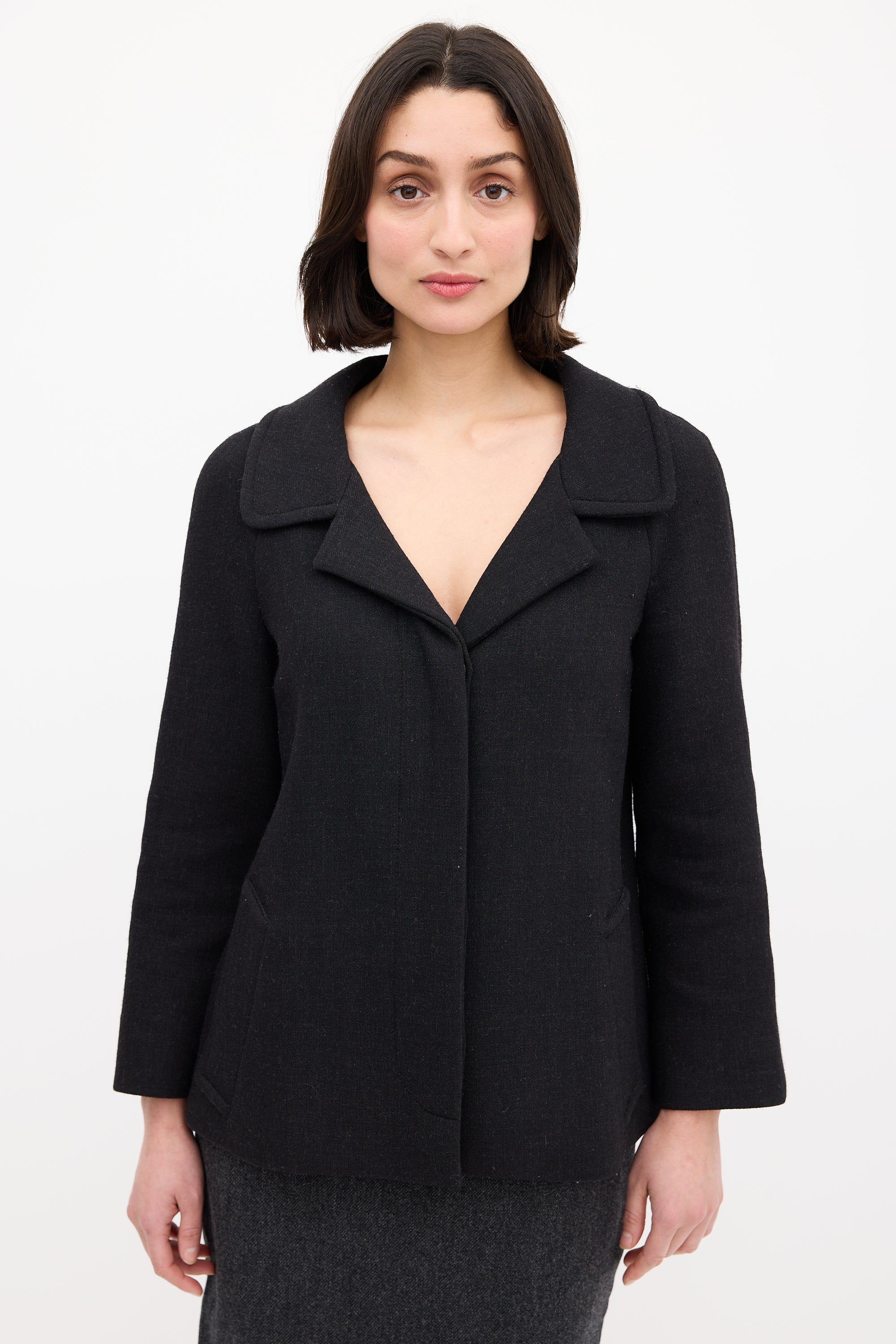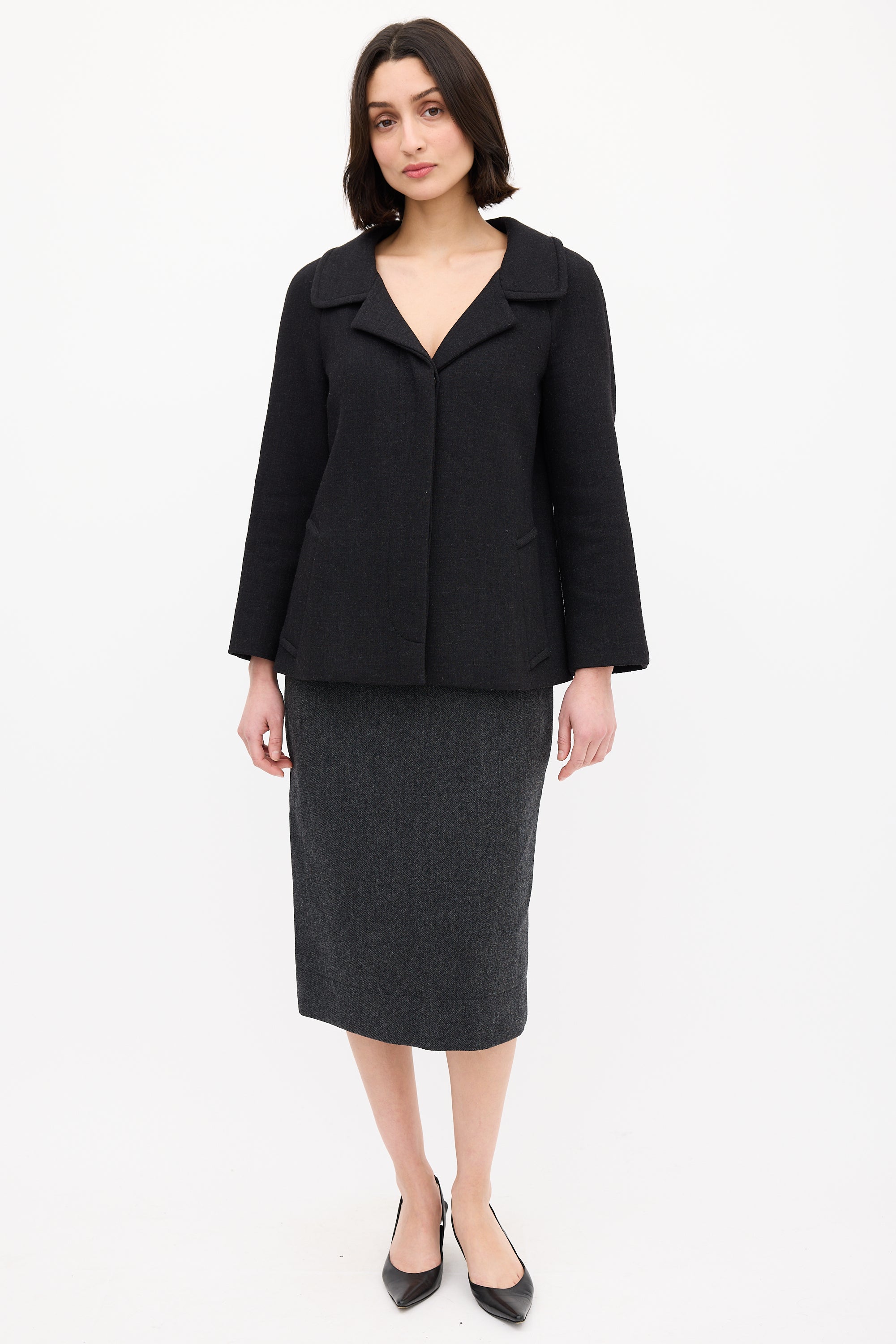 Pre-owned Prada dark grey wool blend jacket featuring a notched collar, concealed button up front closure, two front pockets, and back box pleat. Lined.