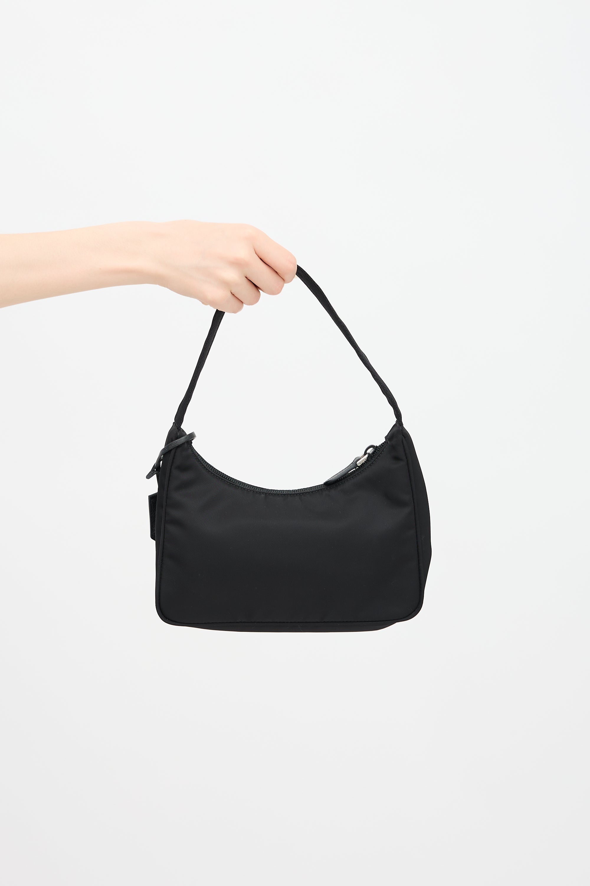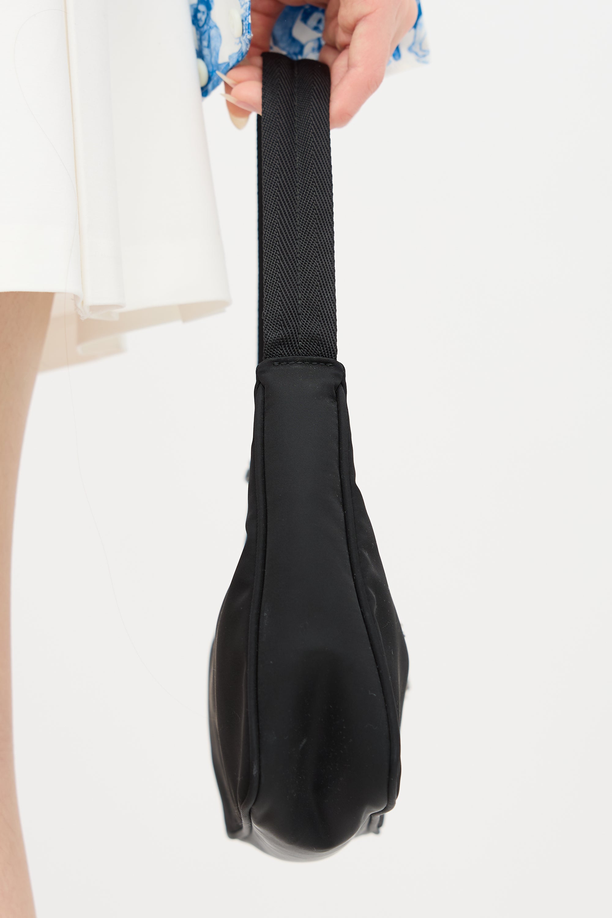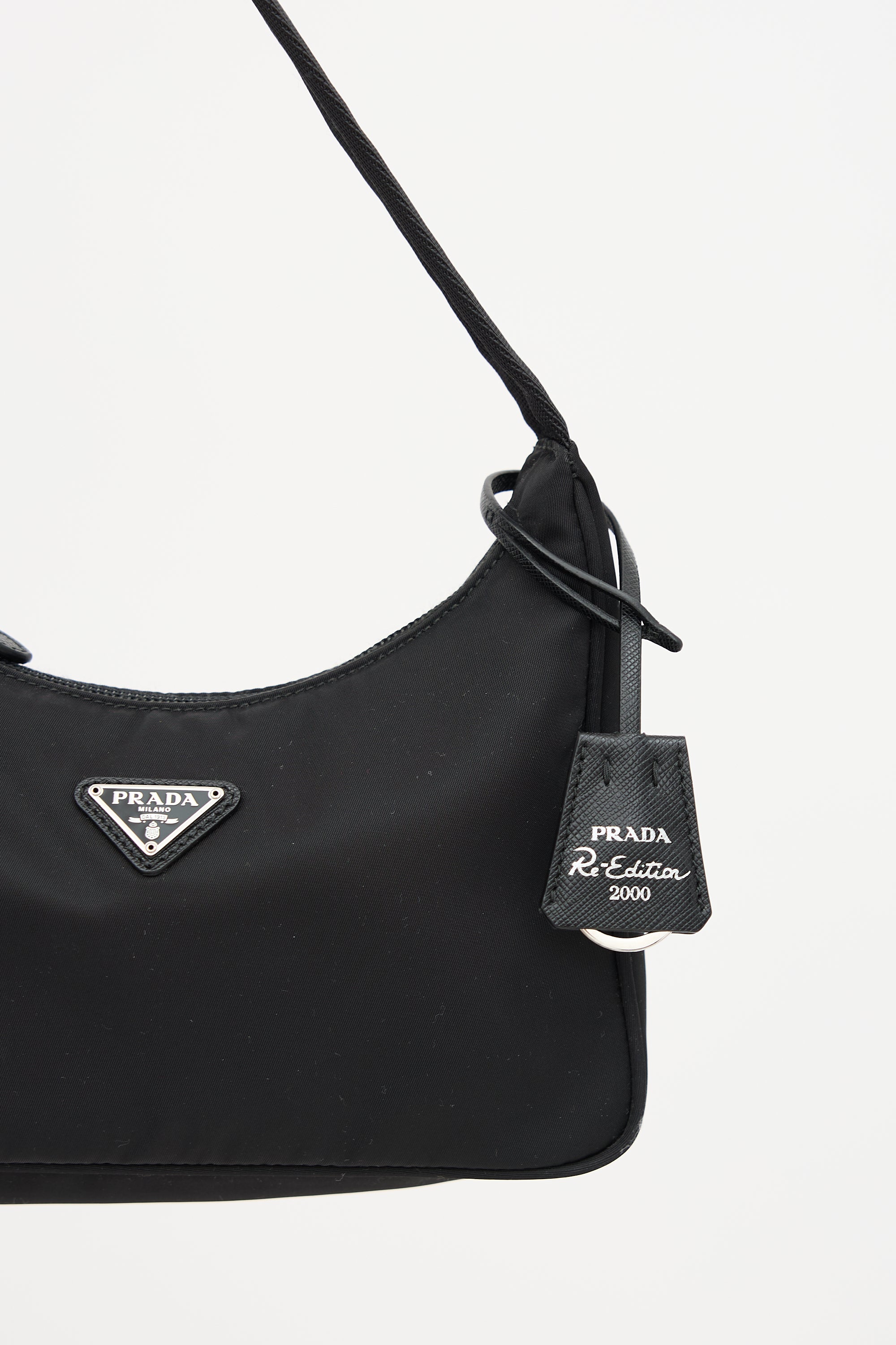 Pre-owned Prada black Re-Nylon Re-Edition 2000 bag featuring webbed shoulder strap, silver tone hardware, black enamel triangle logo plaque at front, key clochette at handle, and top zip closure. Comes with original dust bag. Entrupy certificate included.