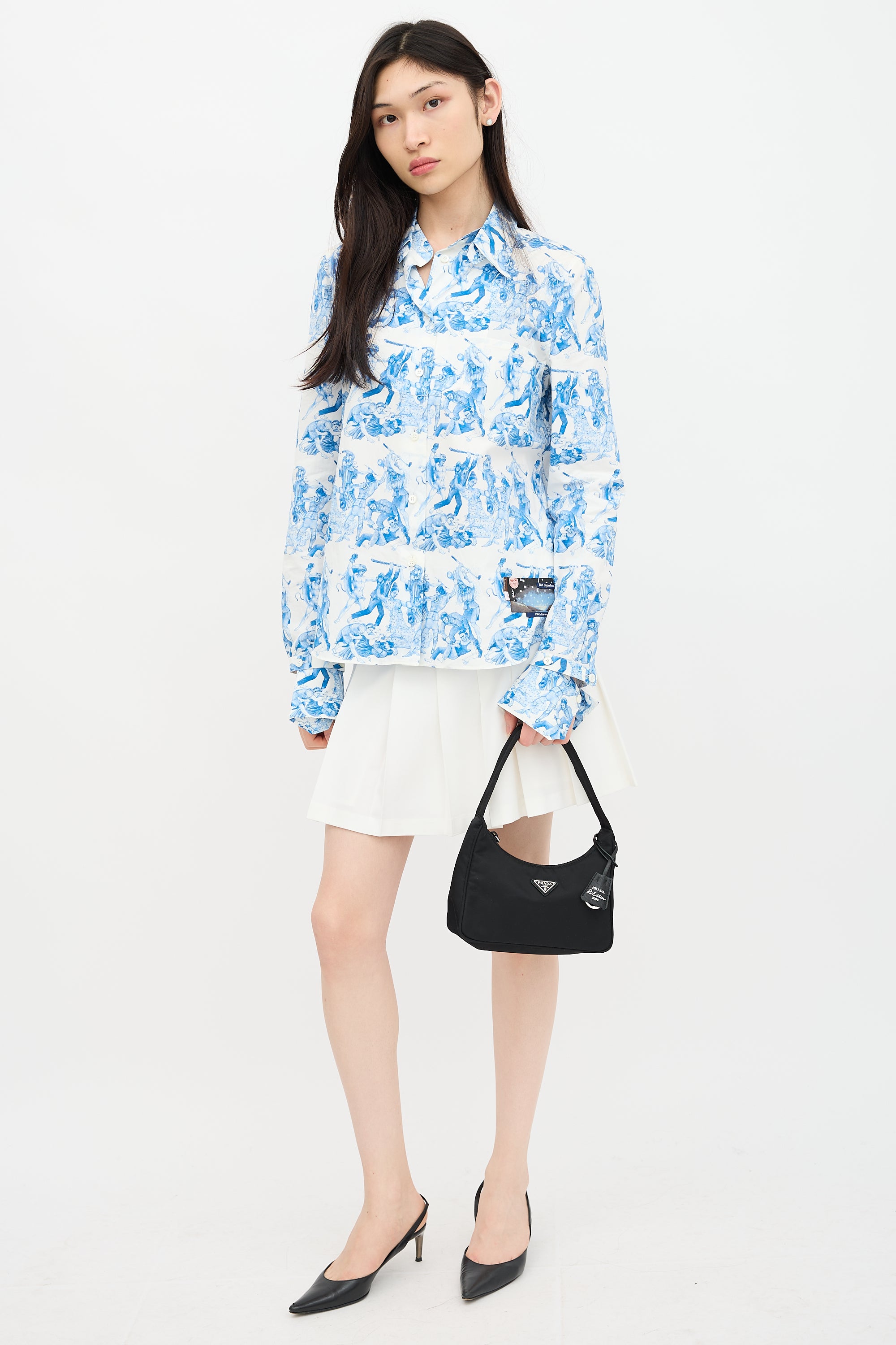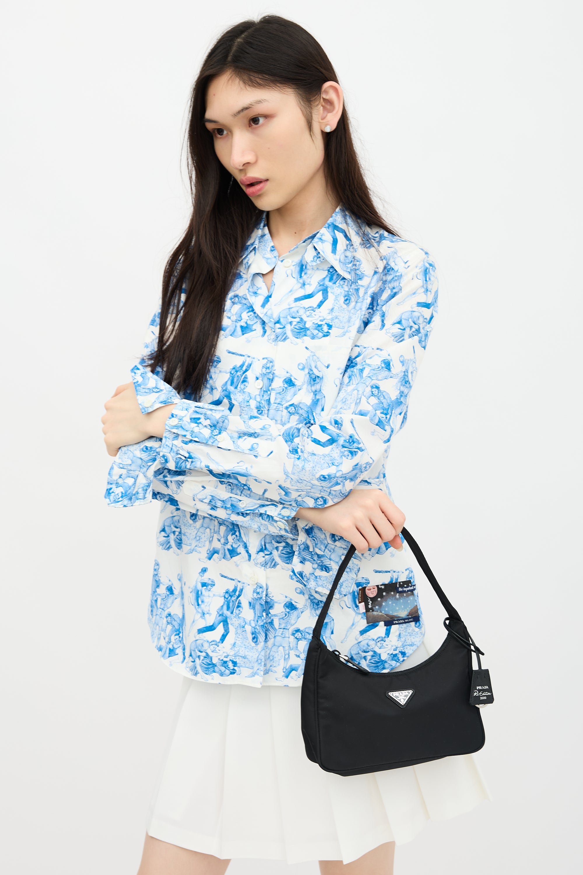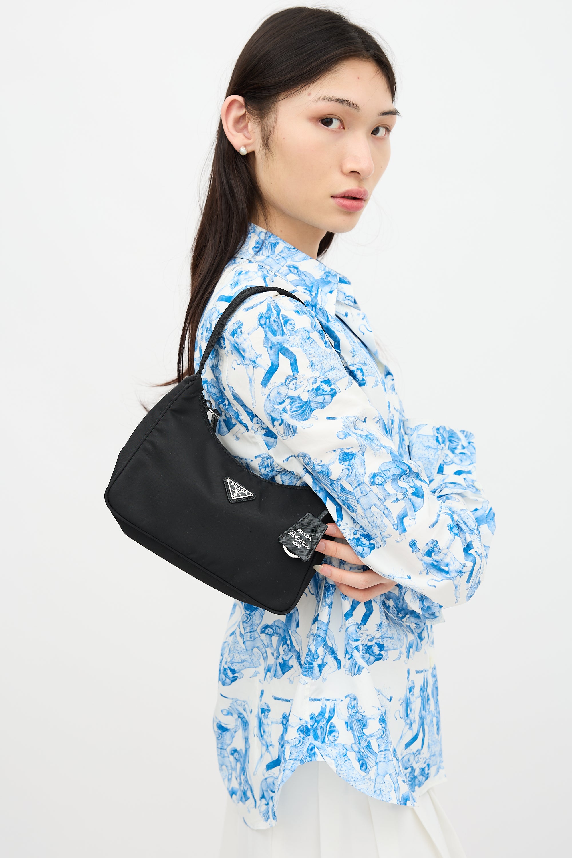 Pre-owned Prada black Re-Nylon Re-Edition 2000 bag featuring webbed shoulder strap, silver tone hardware, black enamel triangle logo plaque at front, key clochette at handle, and top zip closure. Comes with original dust bag. Entrupy certificate included.