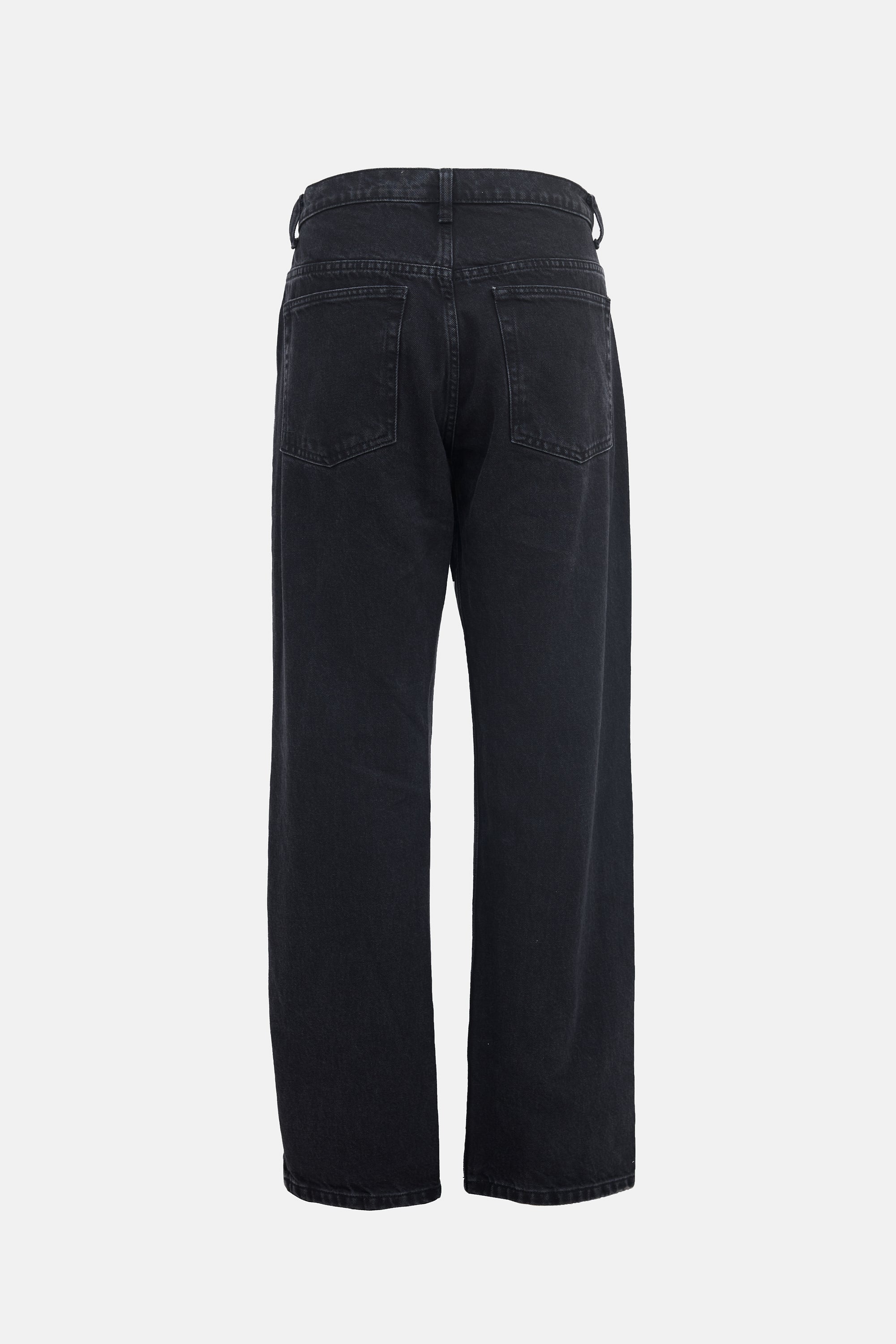 Pre-owned Raey black Boyfriend jeans featuring a button fly, belt loops, five pocket styling, and a wide leg.