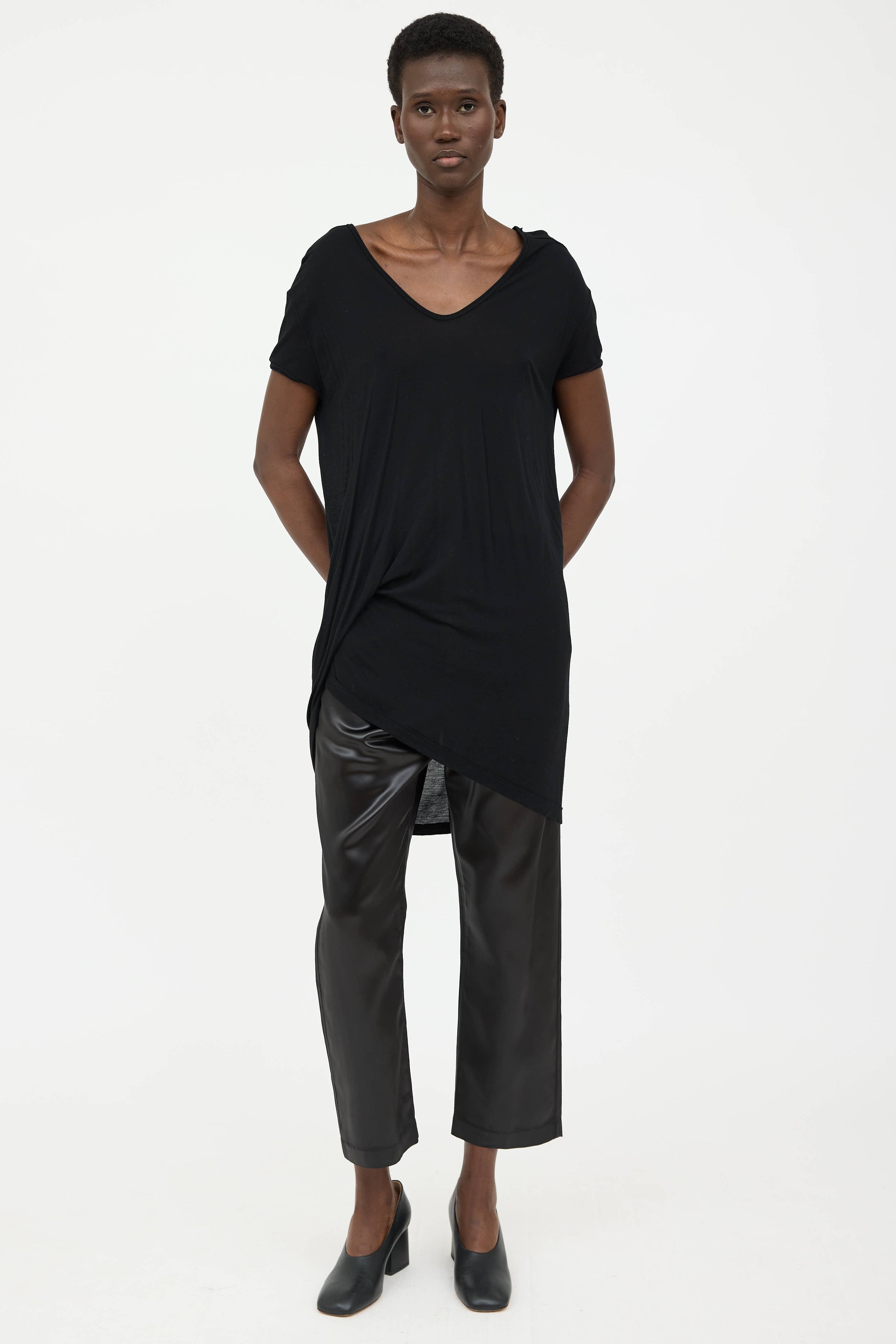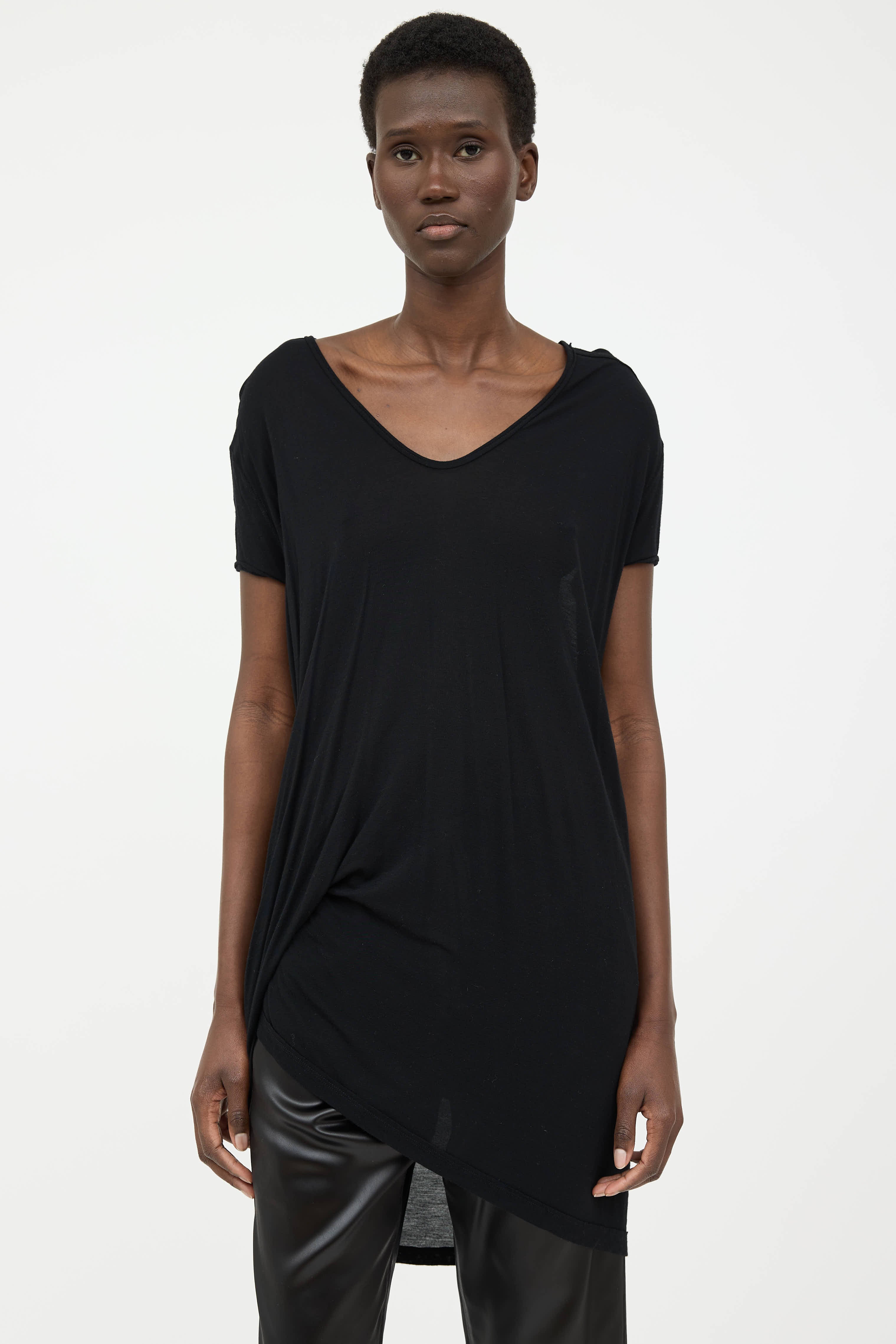 Pre-owned Rick Owens SS17 black top featuring V neckline, short sleeves, gathered detail at right side, and asymmetrical hemline.