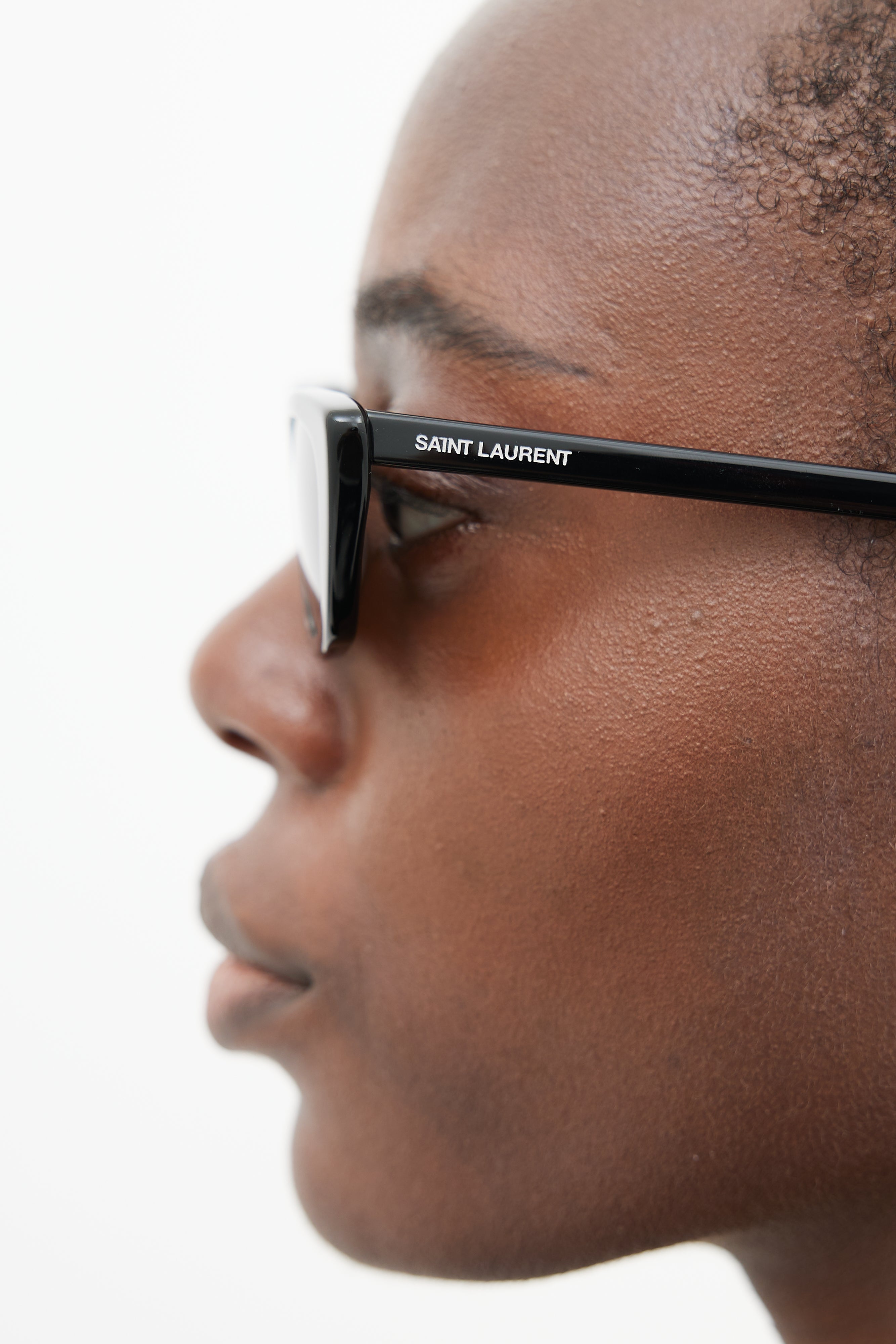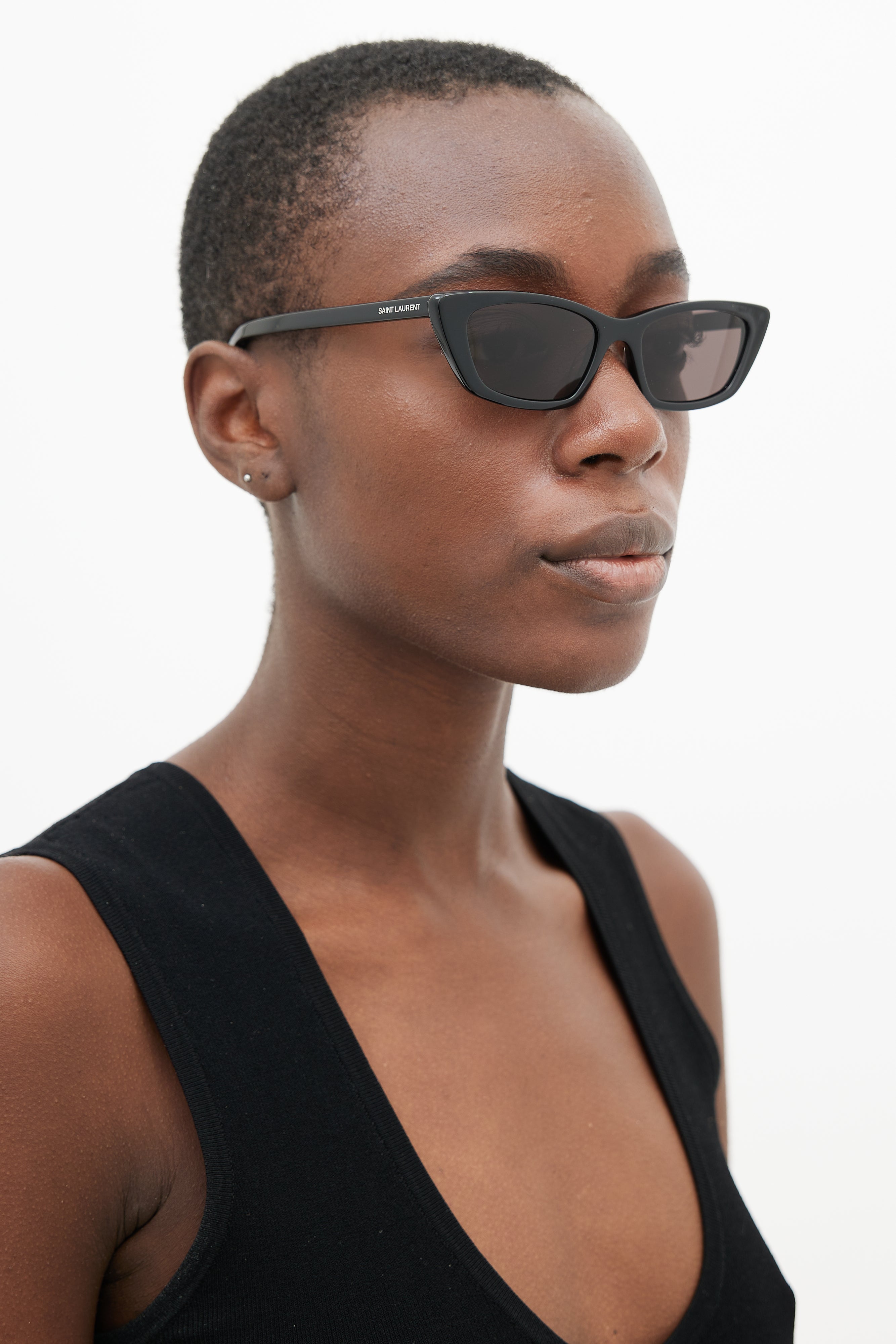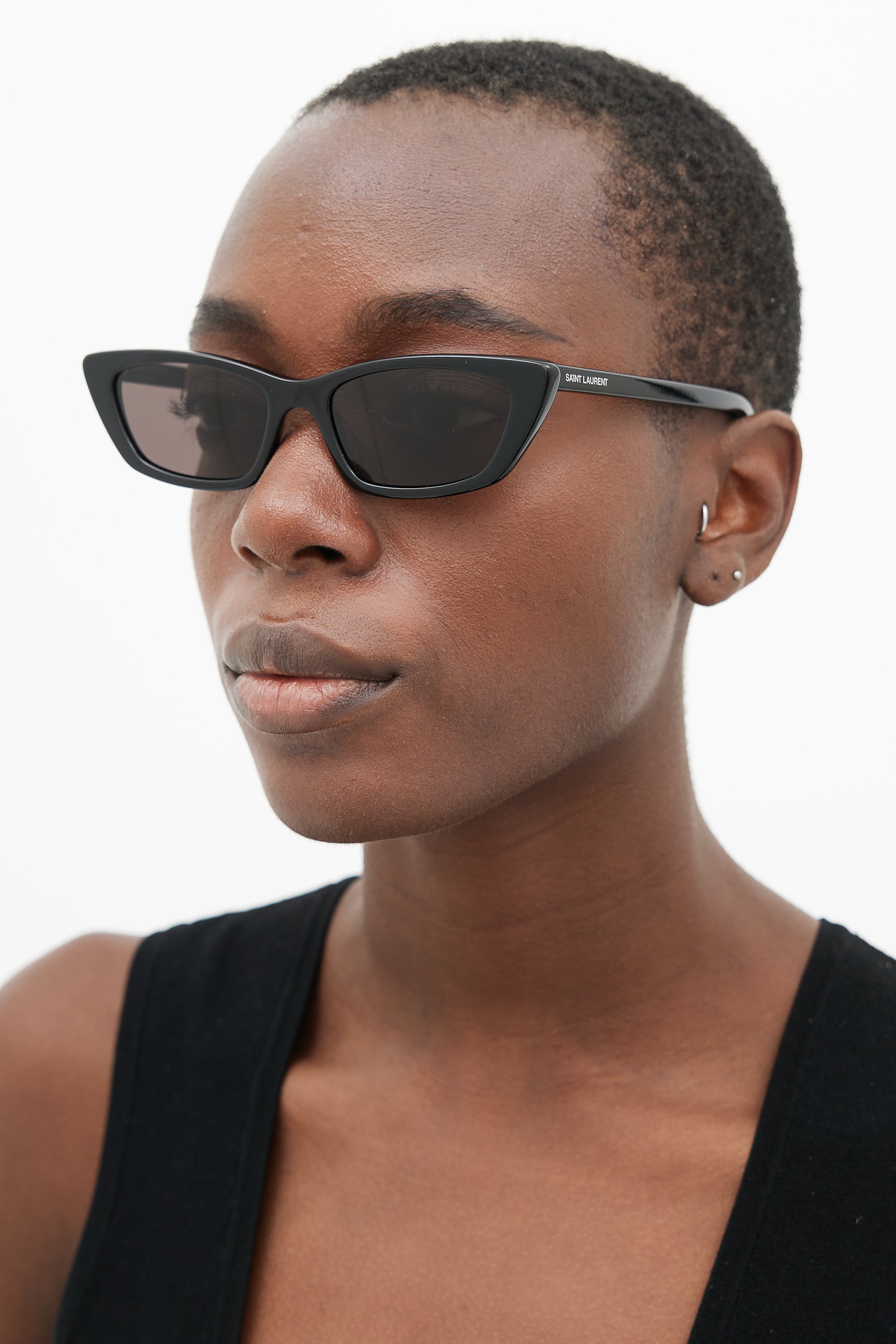 Pre-owned Saint Laurent black SL277 sunglasses featuring small cat eye frame, nose saddle bridge, and embossed logo at temple. Comes with original case.