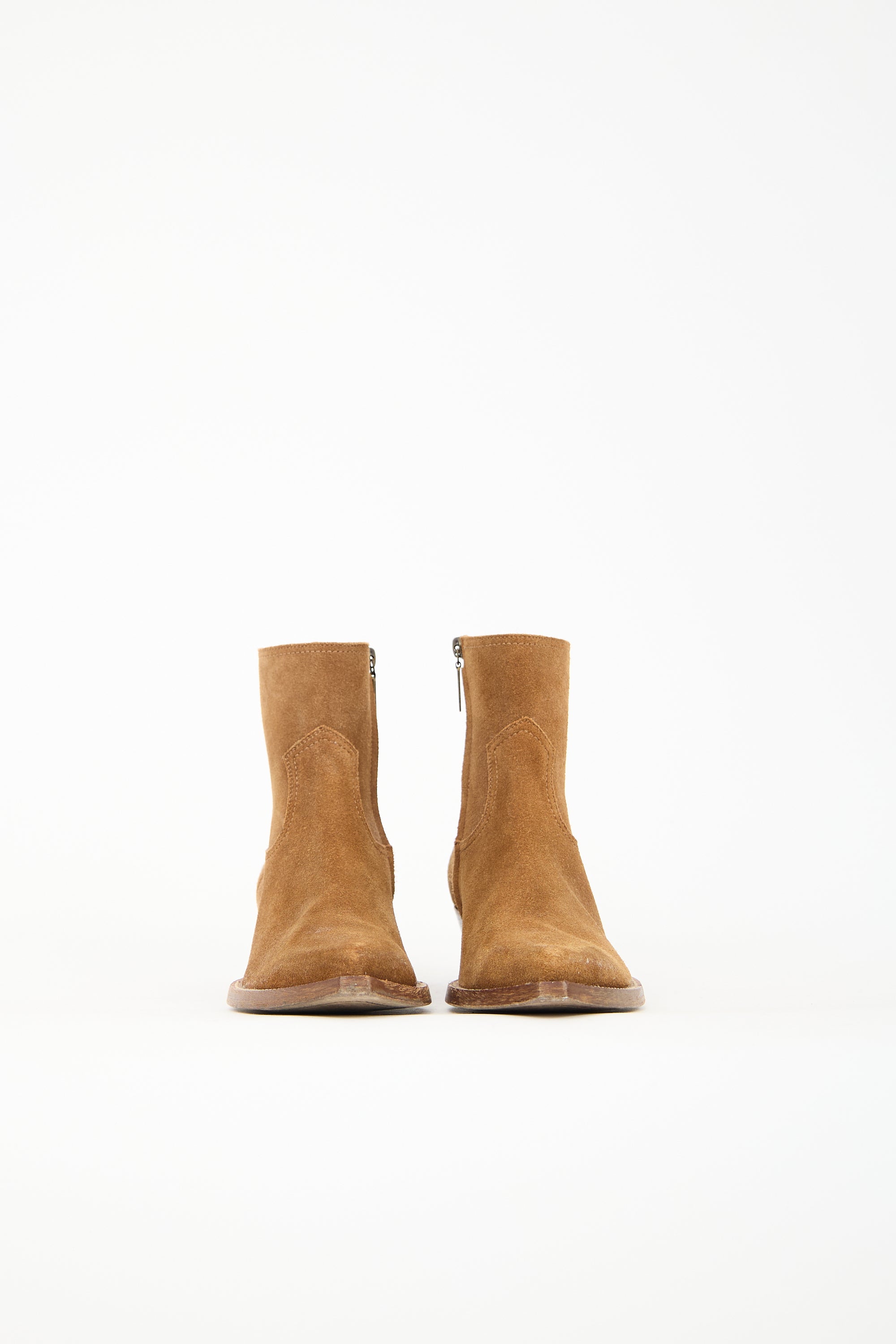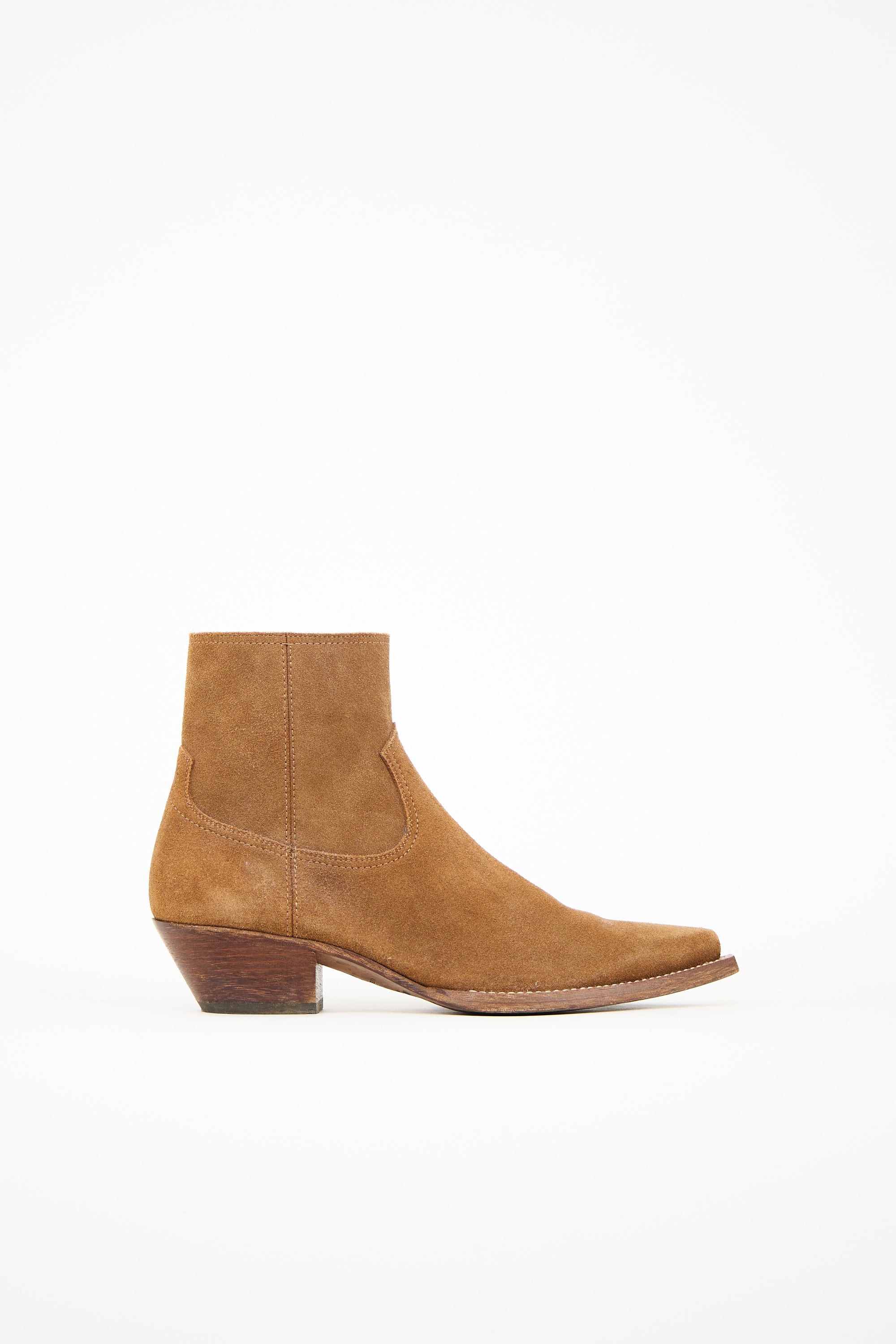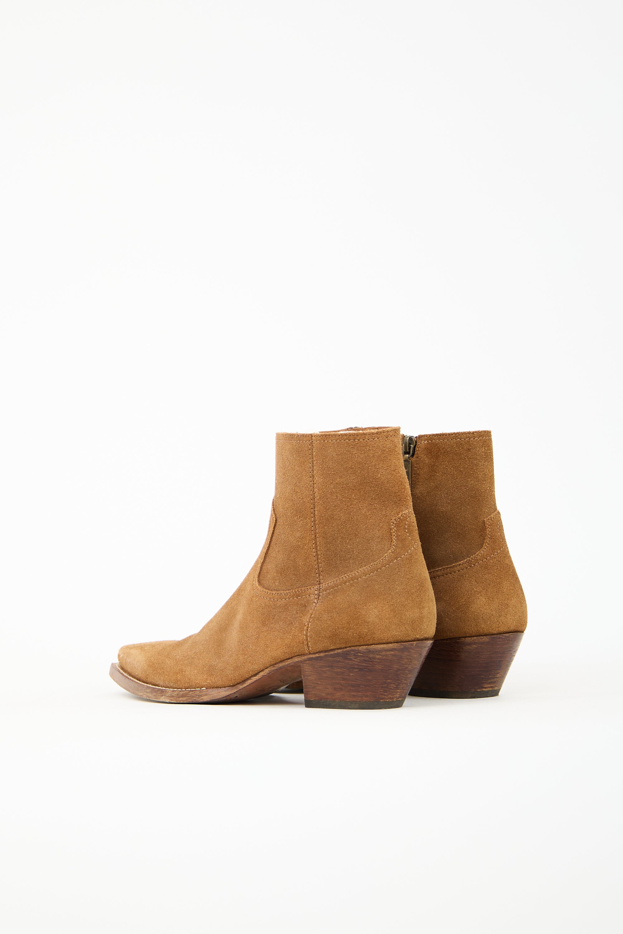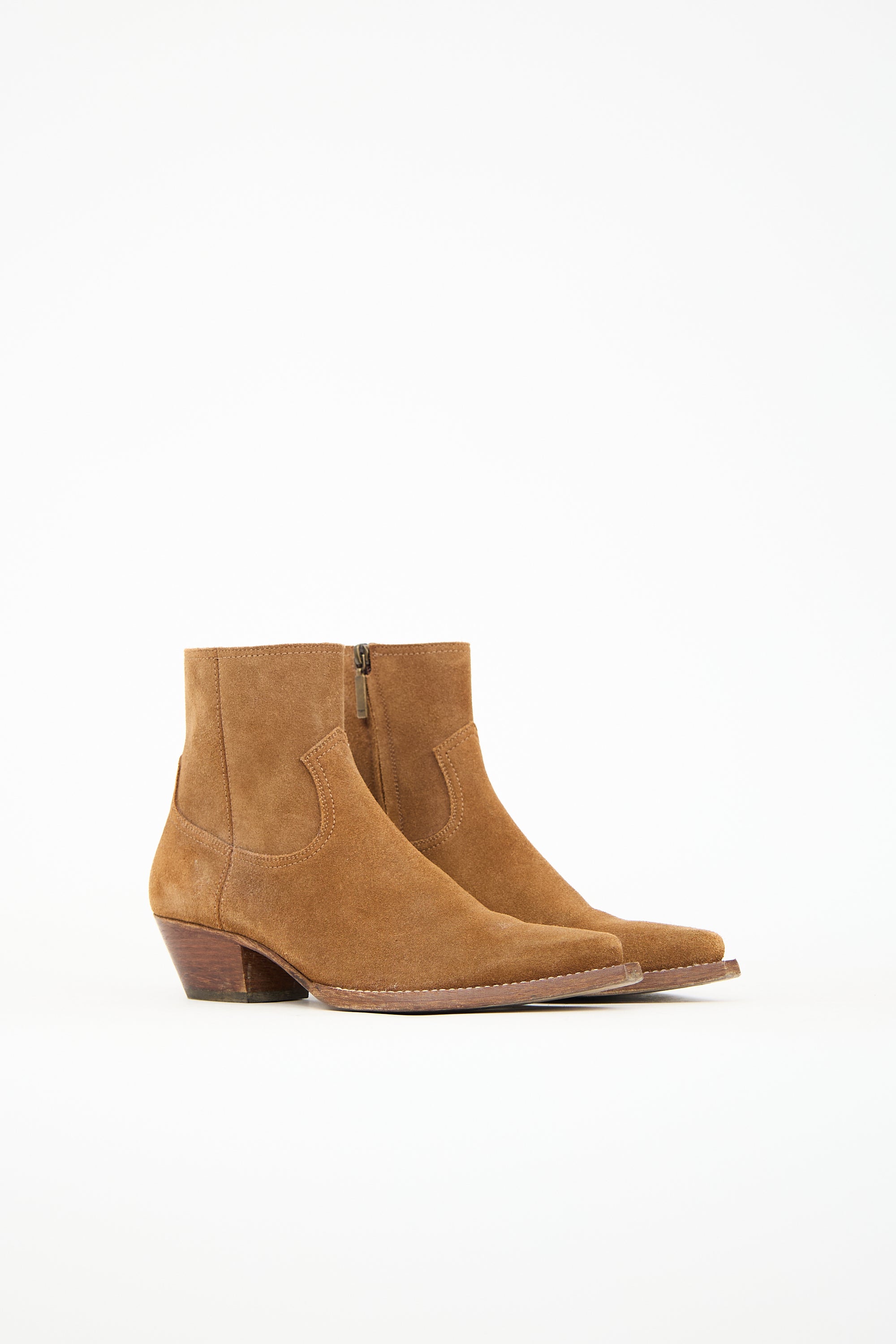 Pre-owned Saint Laurent brown suede Lukas ankle boots featuring a pointed toe, western design, inner zip closure, and a stacked block heel.