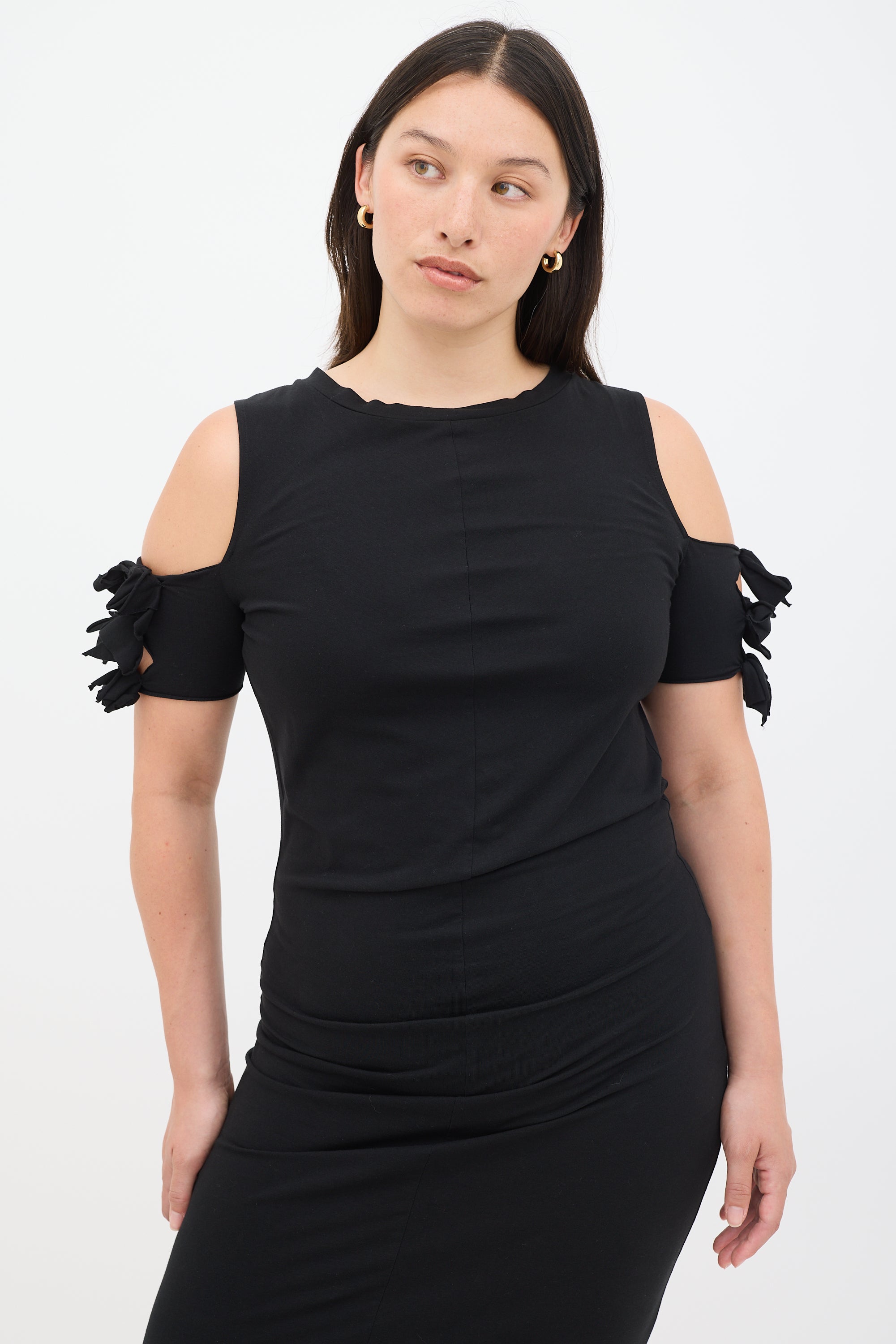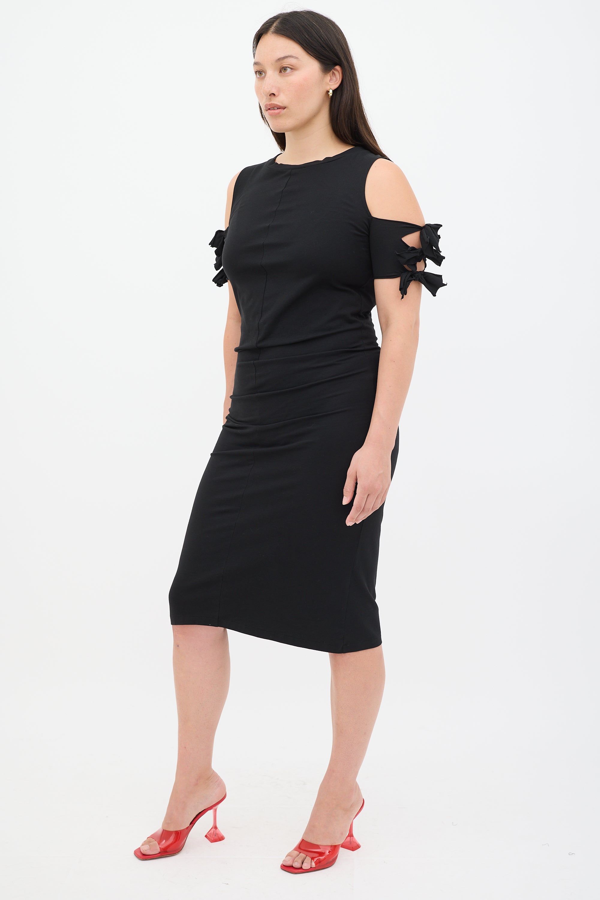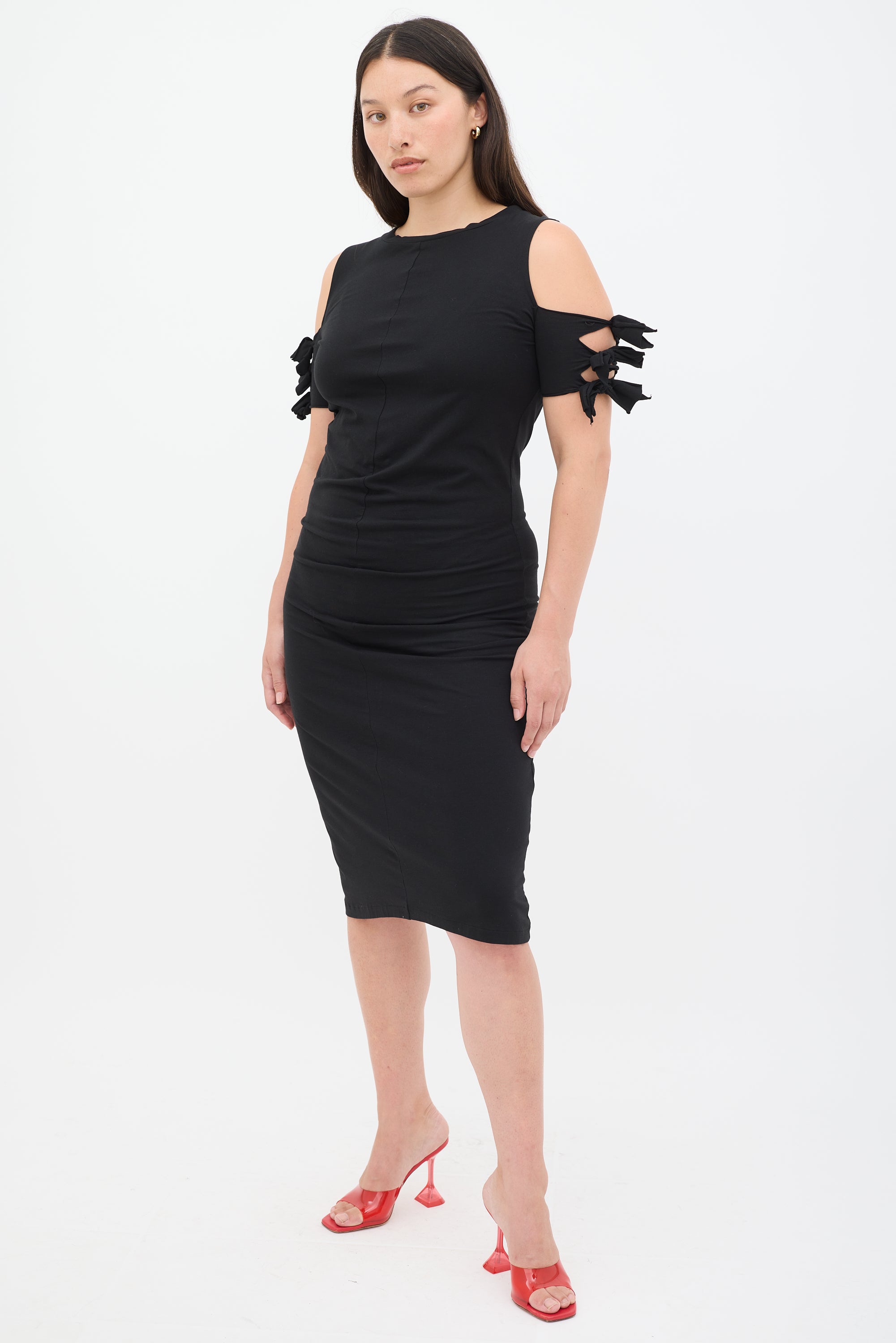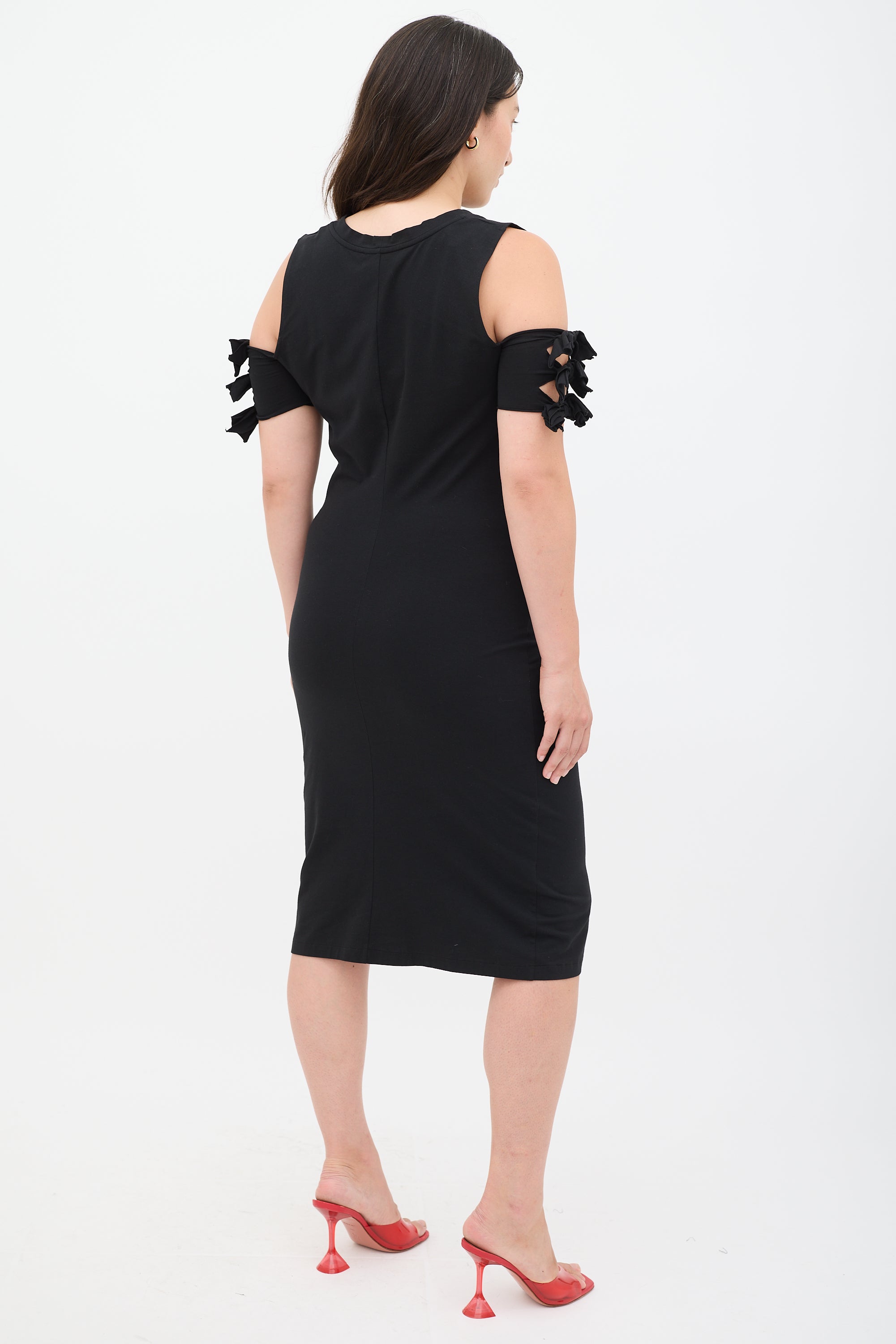 Pre-owned Saint Laurent Spring/Summer 2010 black cotton blend midi dress featuring a round neck, cold shoulder design, and multi tie sleeve detail.