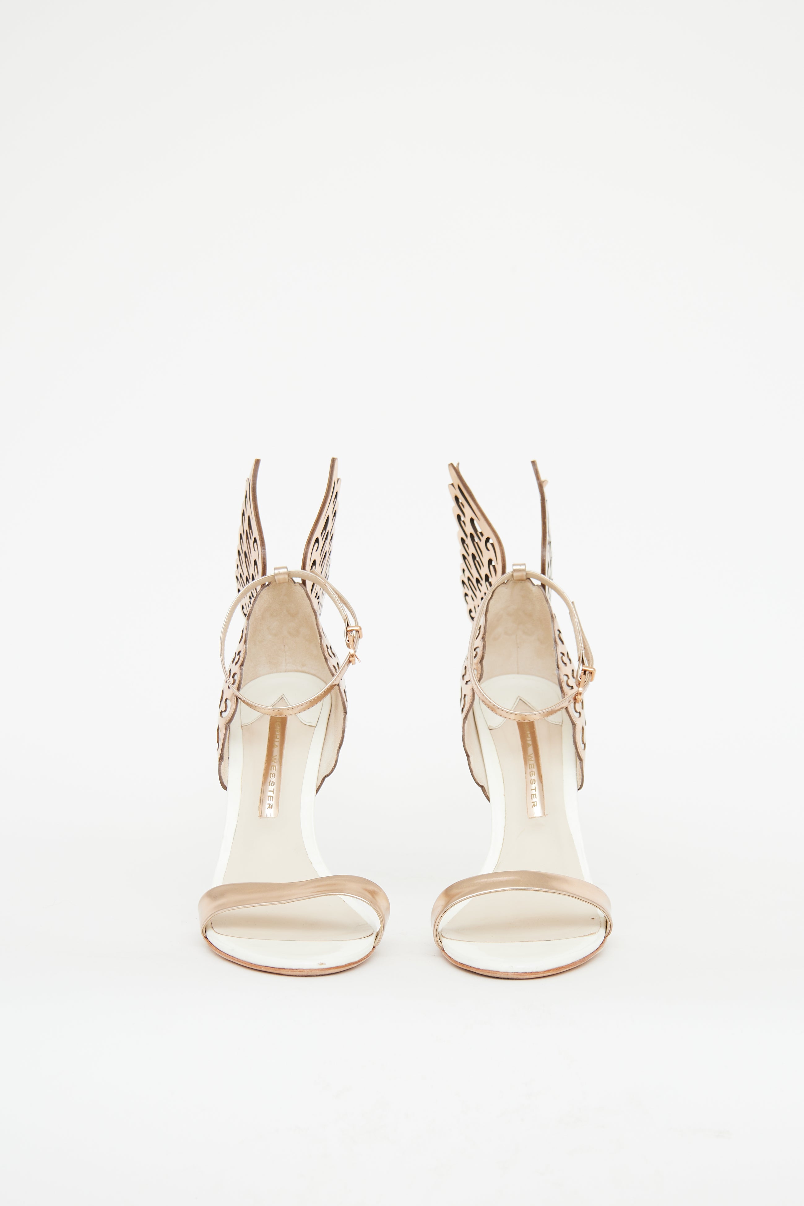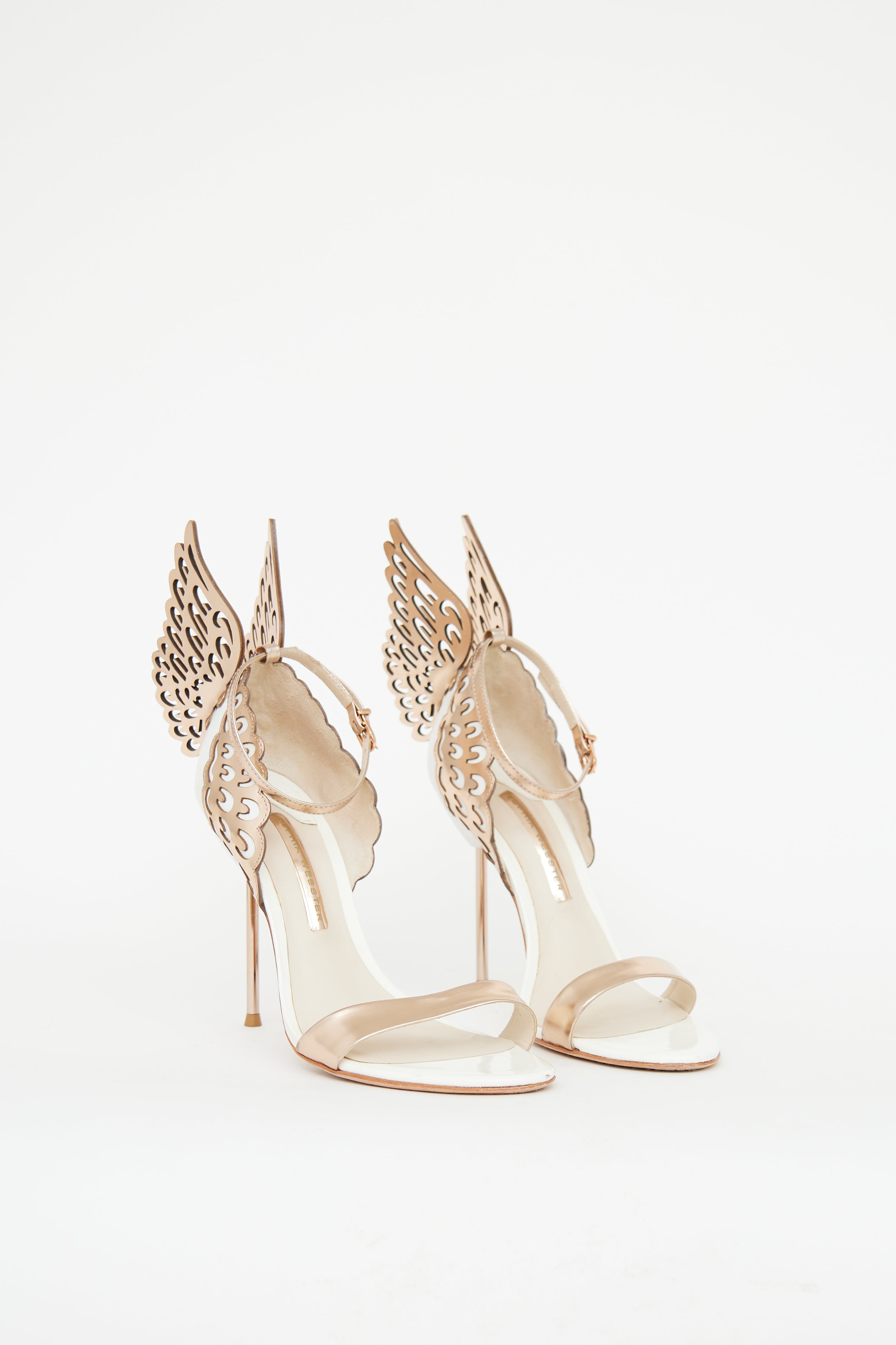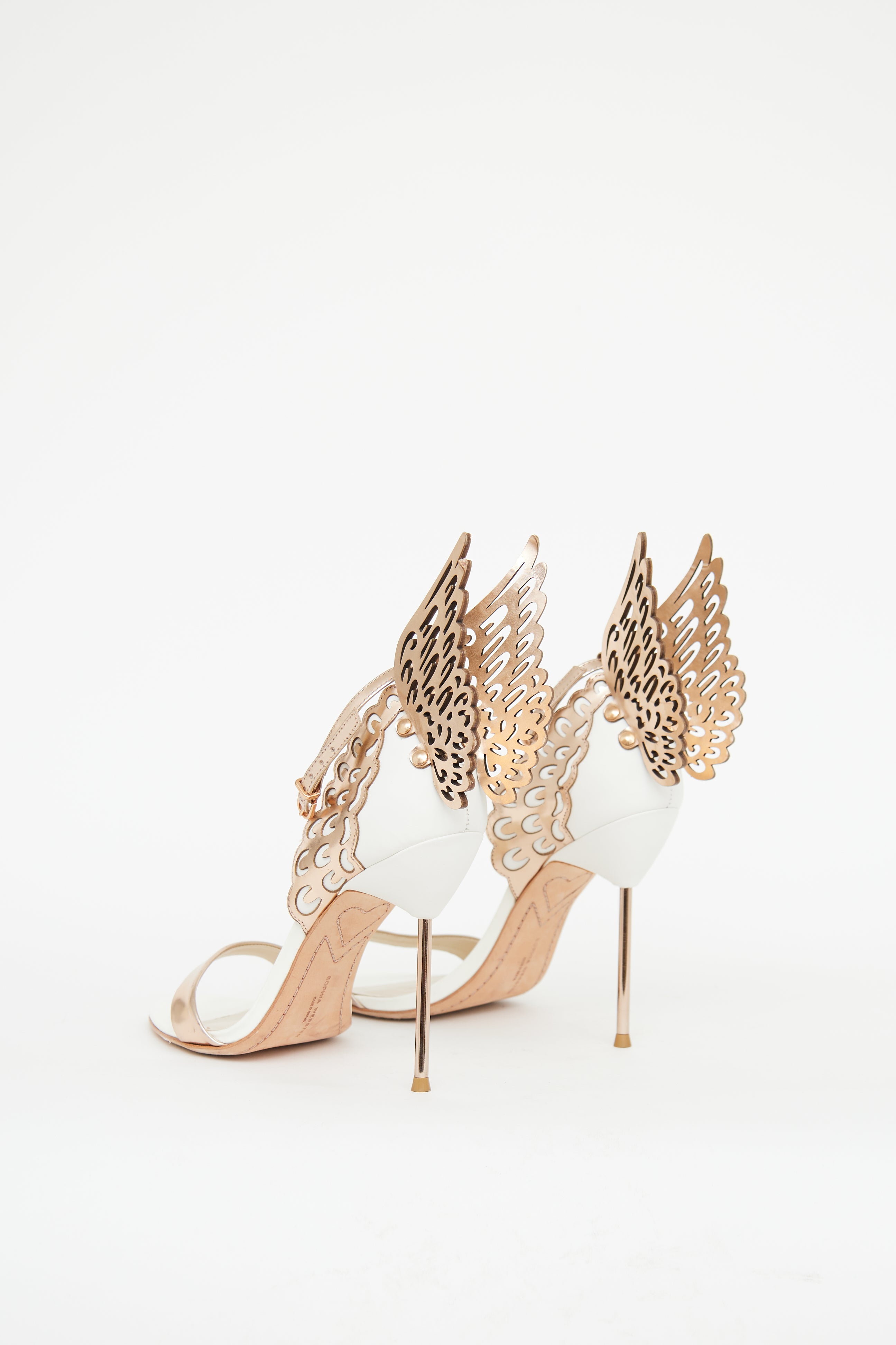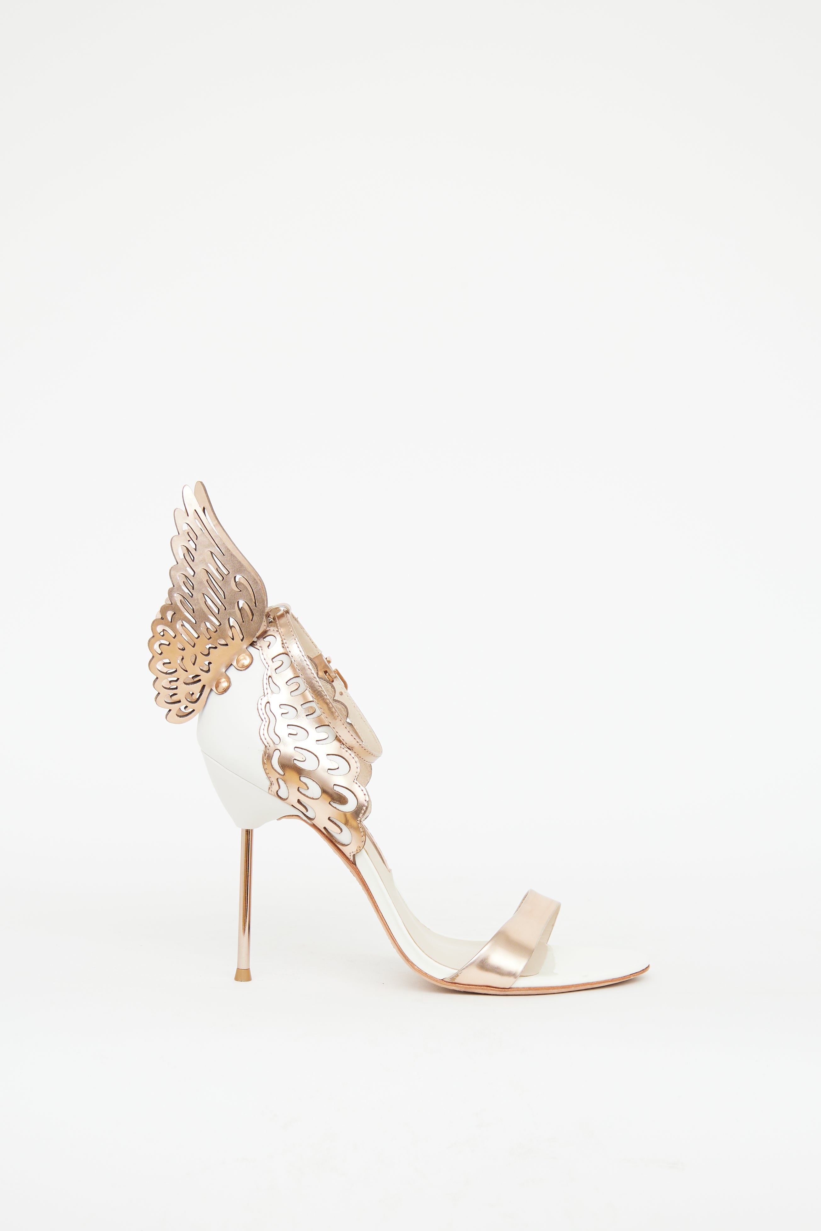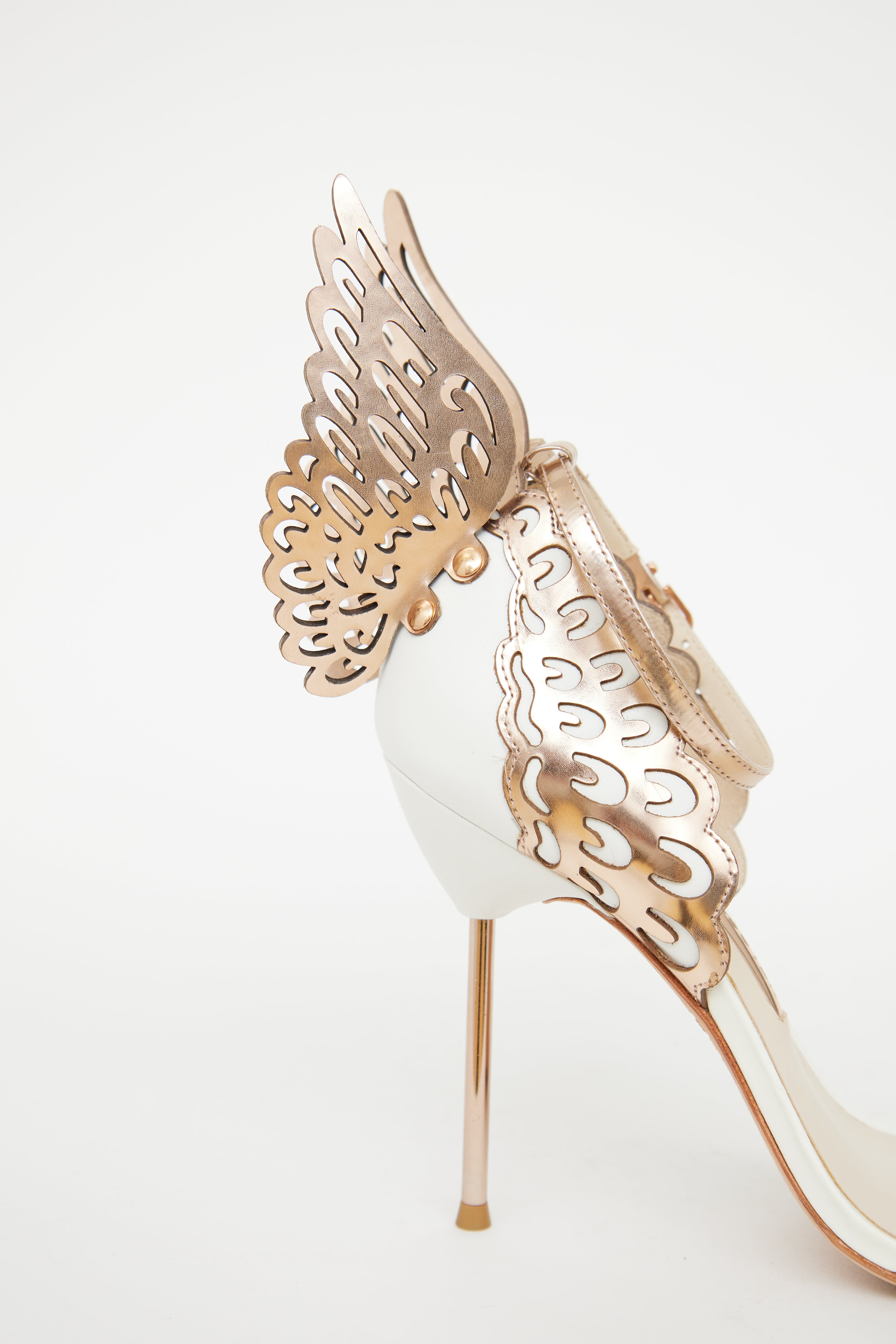 Pre-owned Sophia Webster white and bronze pumps featuring an open toe, strap over vamp, adjustable ankle strap, cut out detail at upper, wing applique extension at counter and covered stiletto heel.